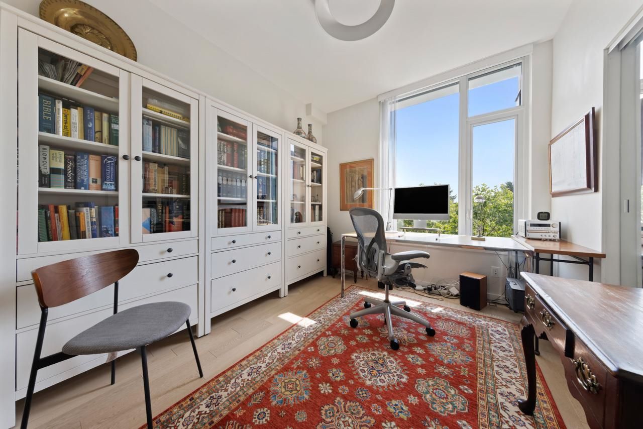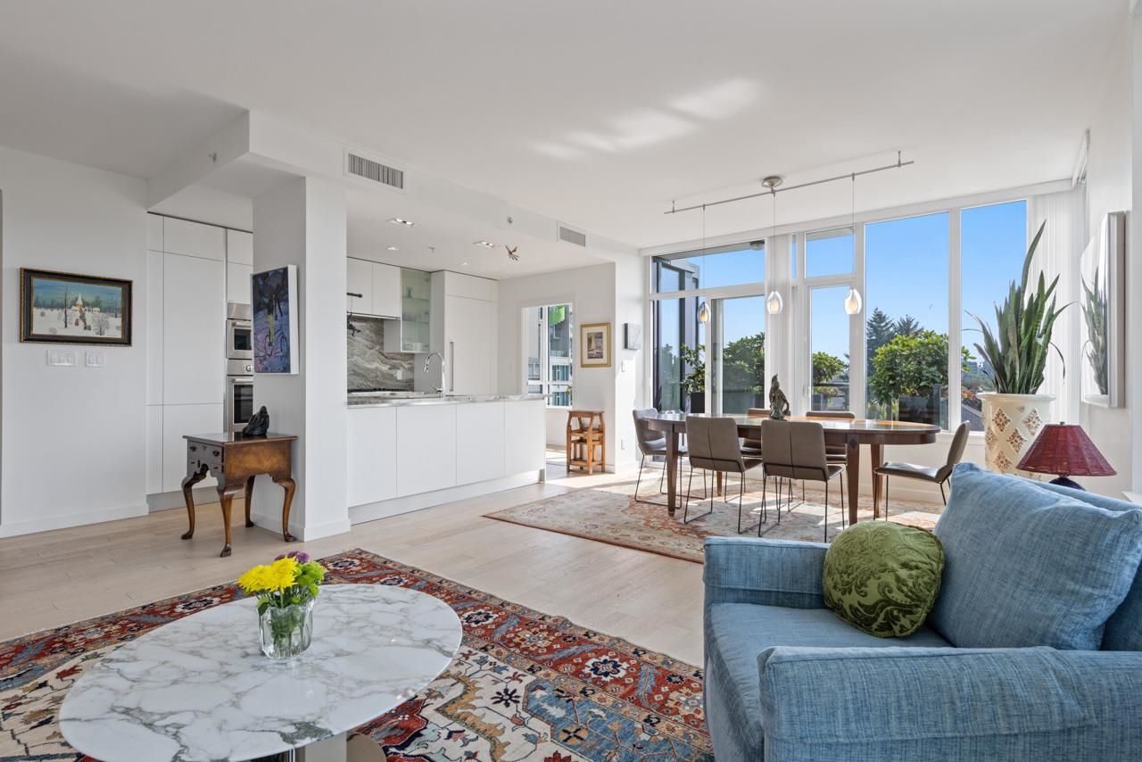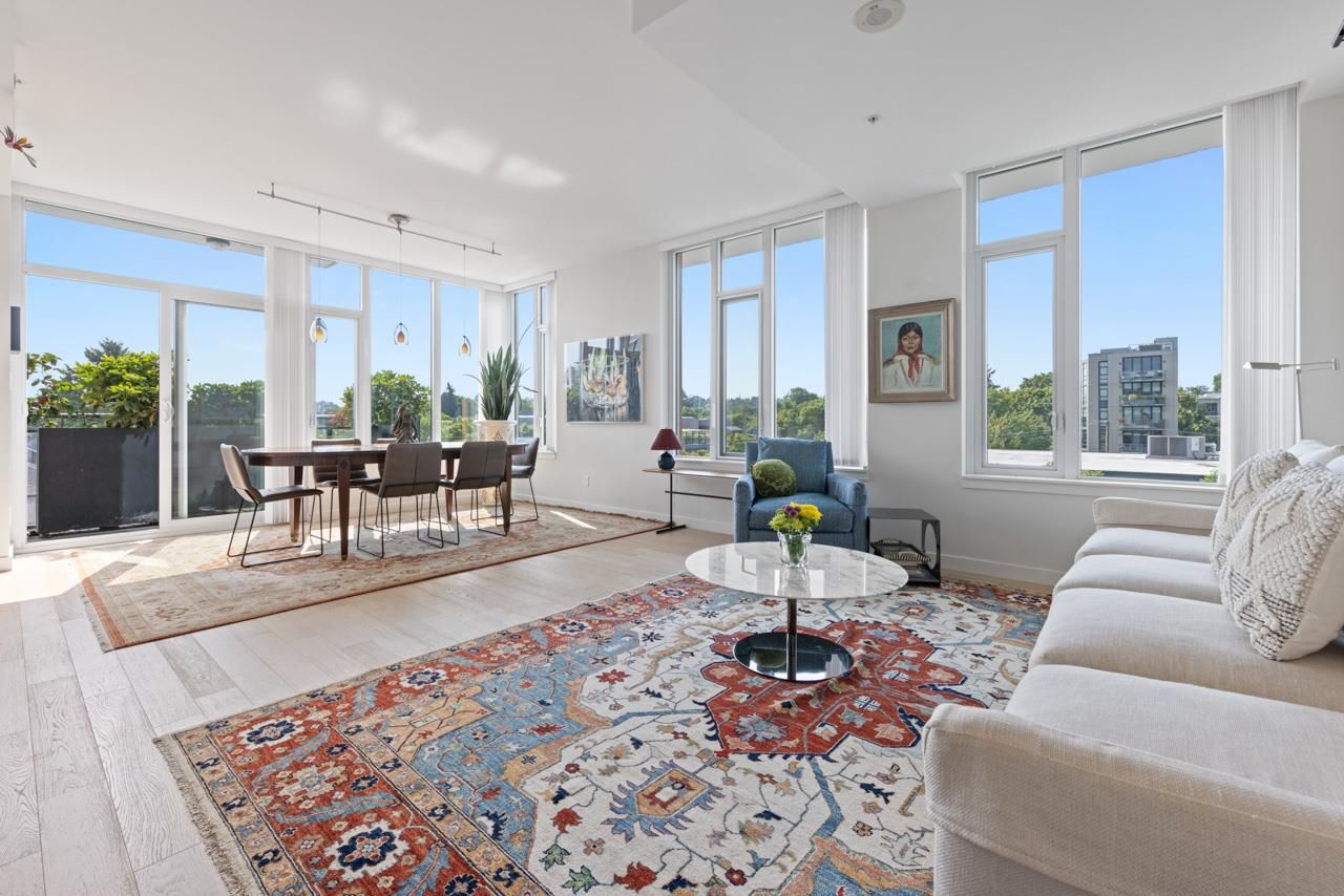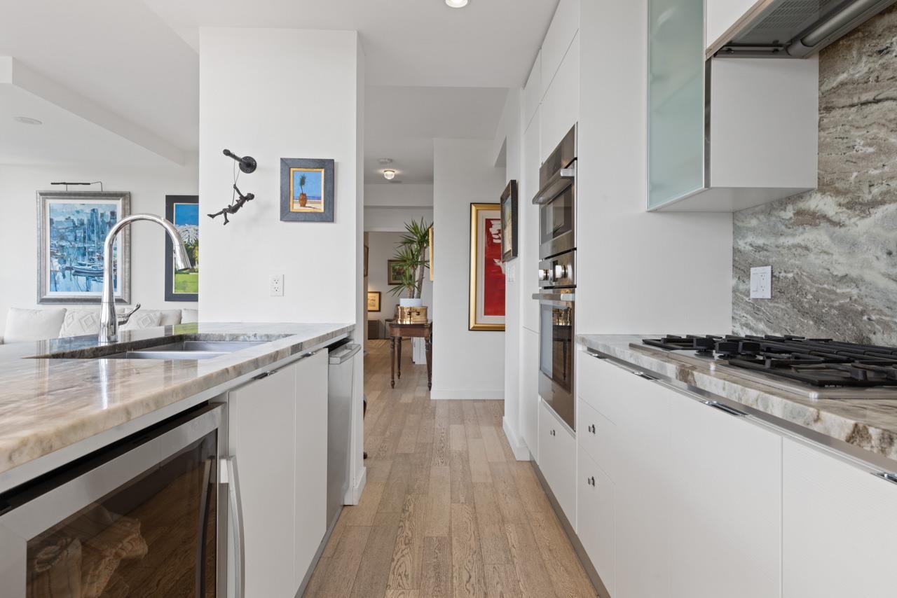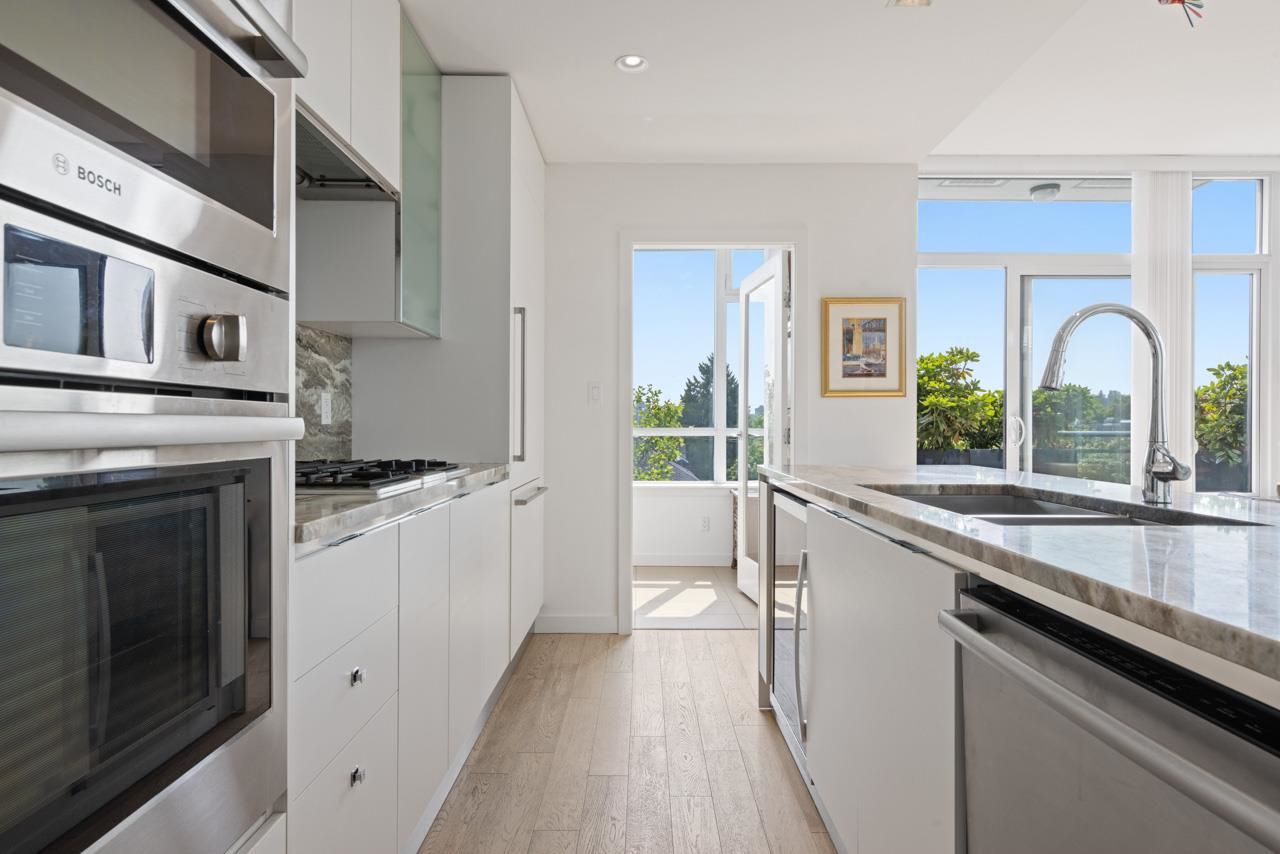 This stunning 3 bedroom corner unit offers an expansive 1615sqft floor plan all on one level. abundant natural light, and a charming treed outlook over a quiet street. The grand living/dining area with overheight ceilings compliments the entertainer’s kitchen, complete with stone counters, gas range, wall oven, integrated fridge, and wine cooler. Spacious primary bedroom with walk-in closet and spa-like 5 piece ensuite. Two generous secondary bedrooms, plus two solarium offices and pantry storage. Air conditioned. Well maintained 6 year old concrete building with gym and party room. 2 parking stalls, 2 storage lockers, and 2 bike stalls. Pets and rentals welcome.