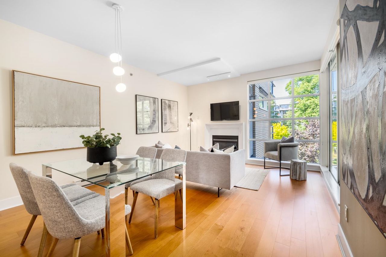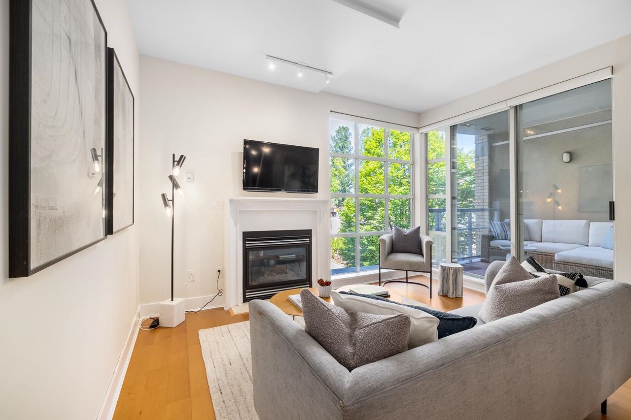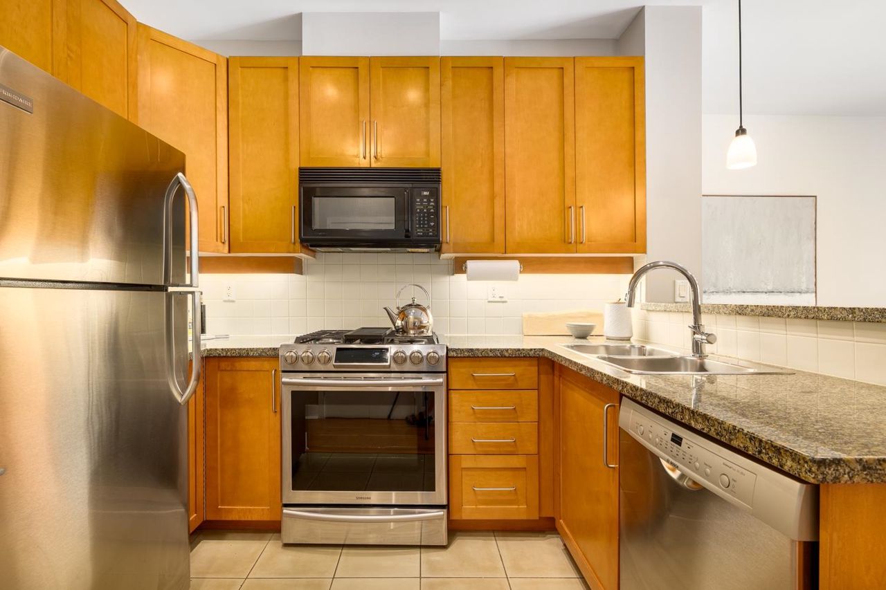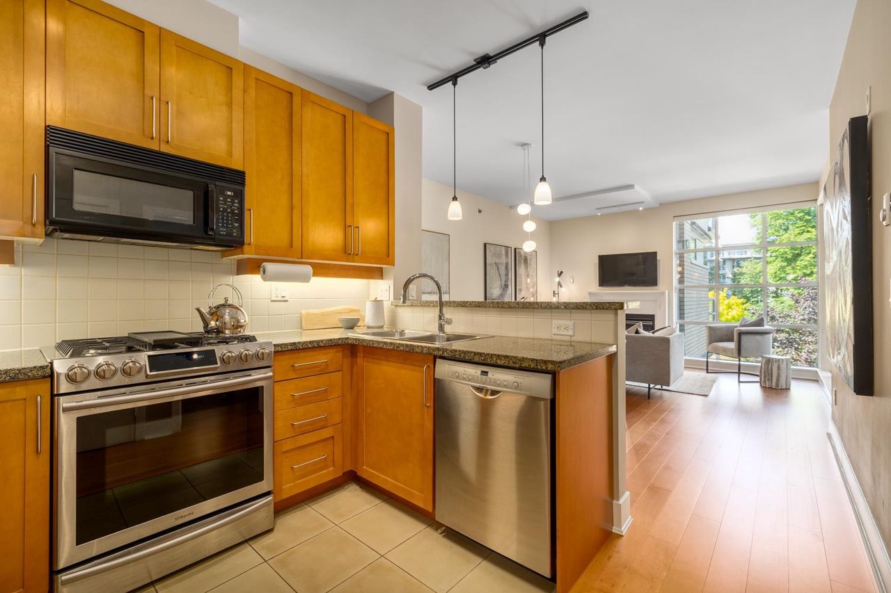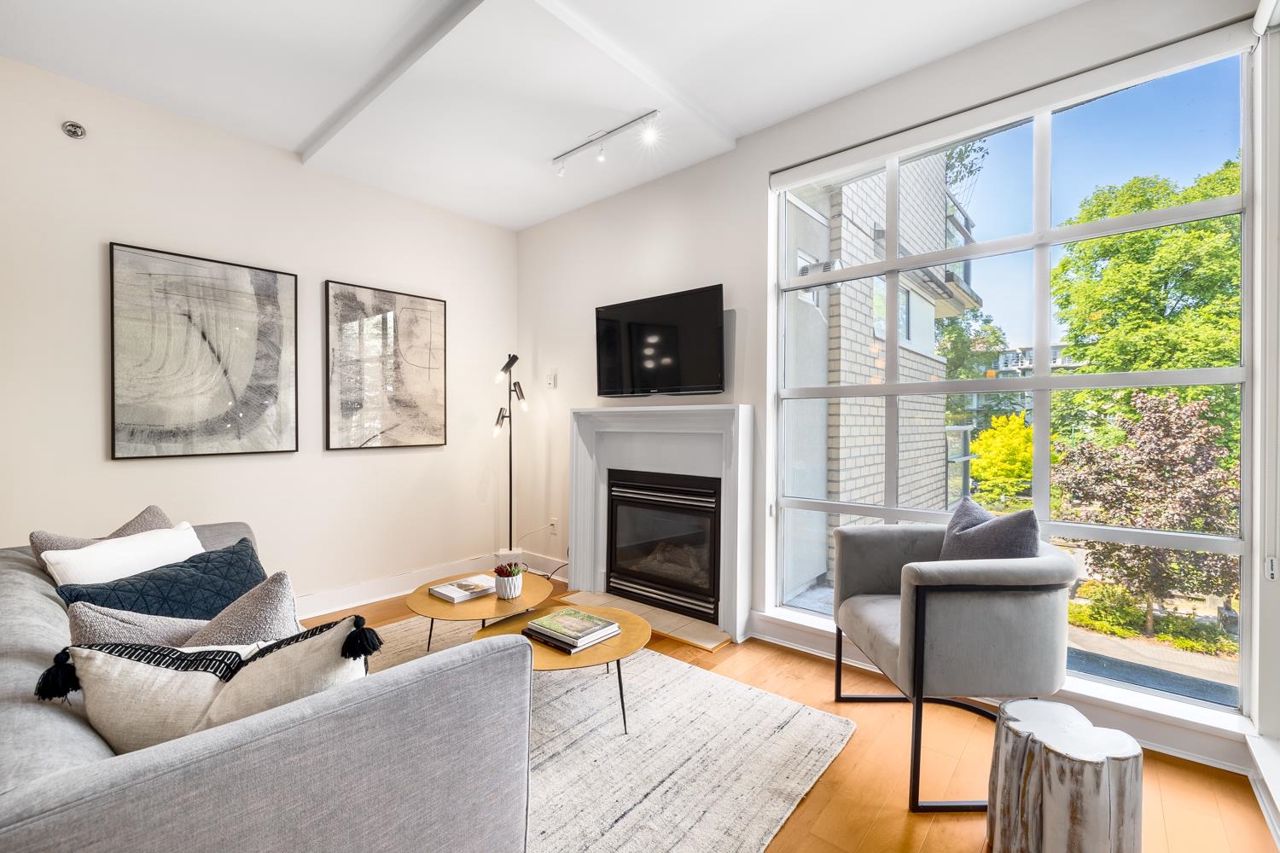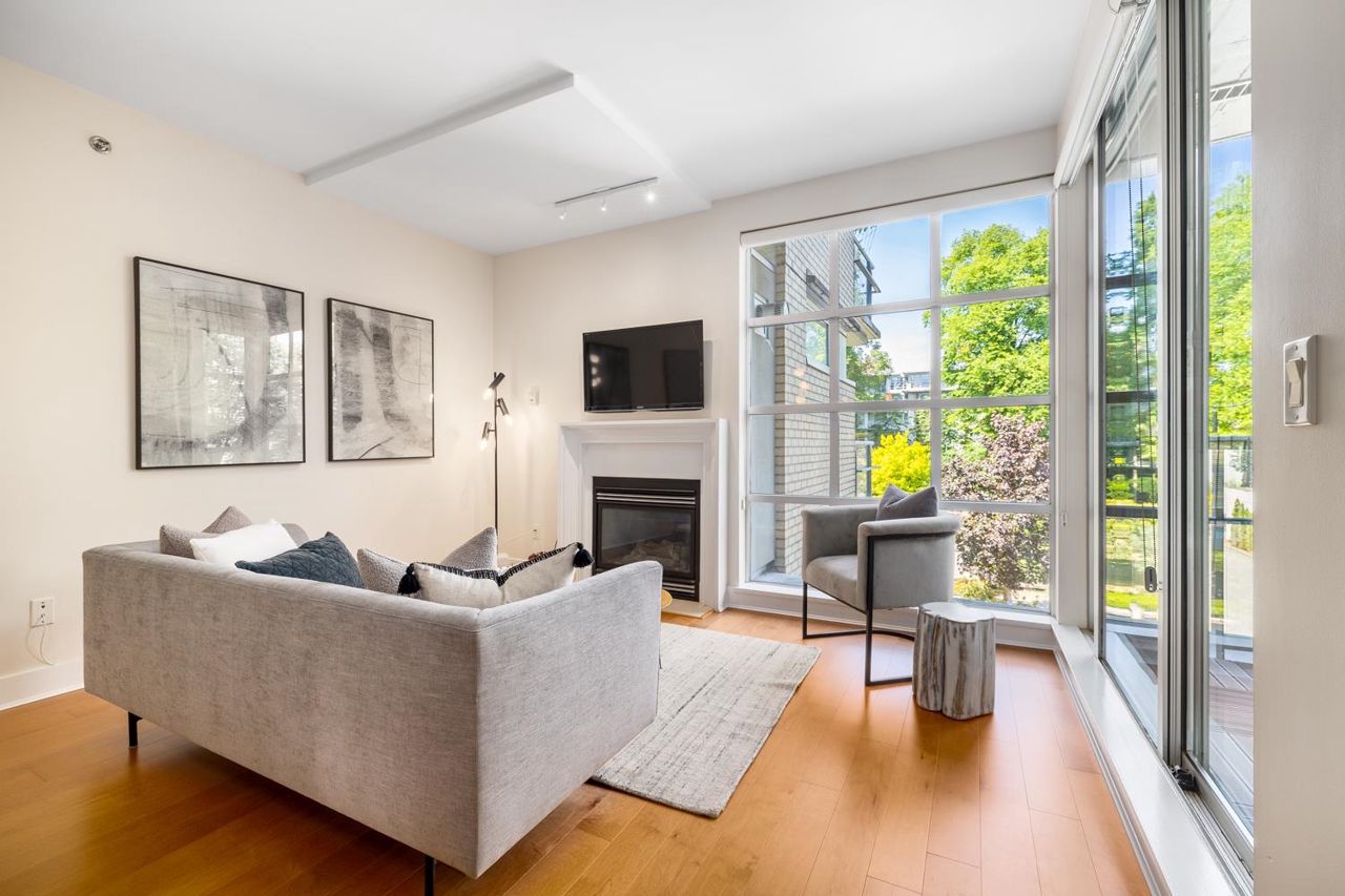Welcome to the NEW YORKER…a concrete mid rise building in the Arbutus Walk neighbourhood. This spacious one bedroom & den of almost 700 SF has it all! New engineered hardwood floors throughout, custom roller shades, gas fireplace & range, front load washer/dryer, high ceilings plus a large covered patio. The chef inspired kitchen has ample cupboard space, maple cabinetry, updated stainless appliances & granite counter tops. The generous sized bedroom is a sanctuary with velvet floor to ceiling drapes, his & her wardrobes, private en-suite bath with a deep soaker tub. The location is second to none with bike paths, gardens & parks all around, public transportation, groceries, fabulous cafes & patisseries. Rentals & pets allowed with secure underground parking & car wash bay.