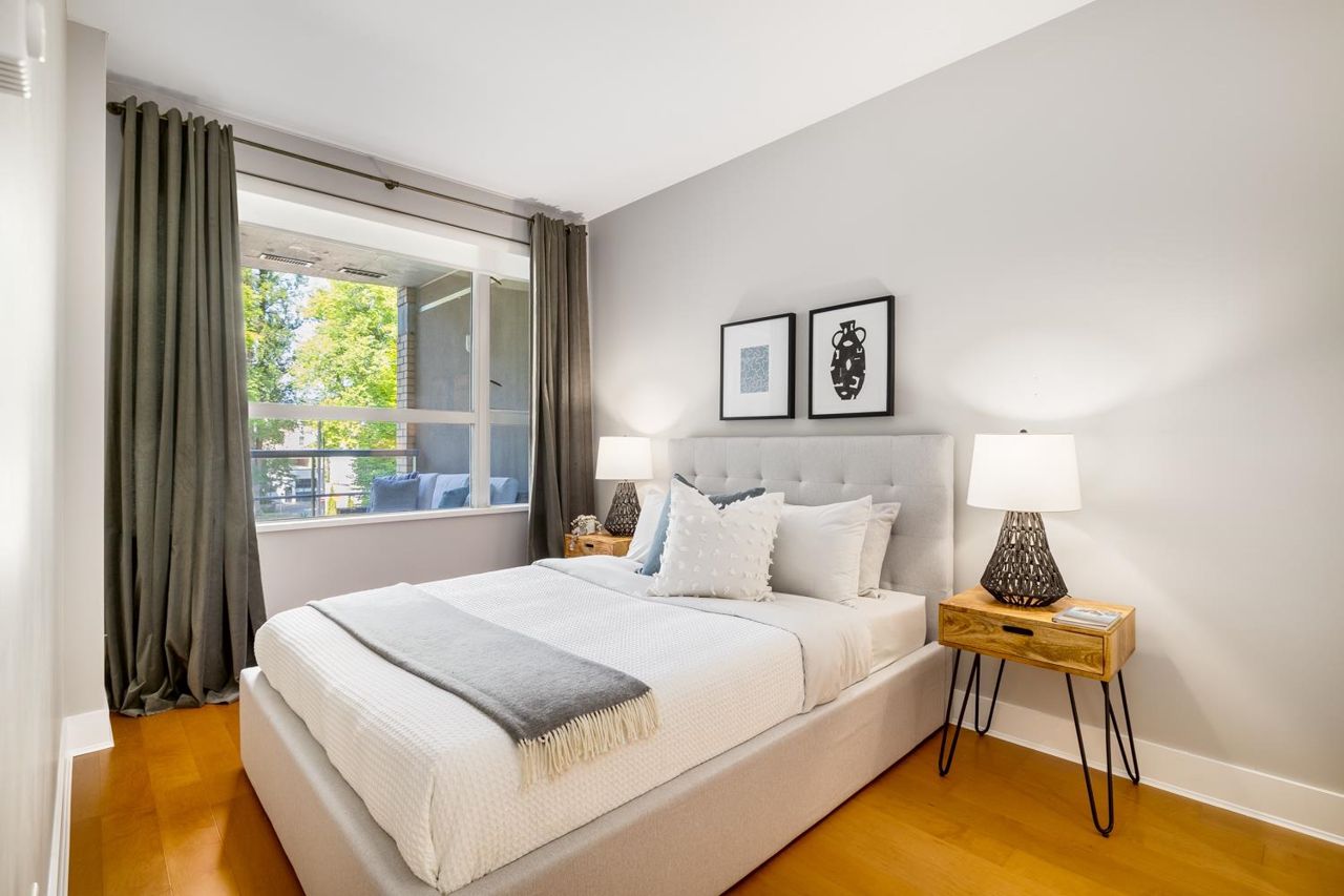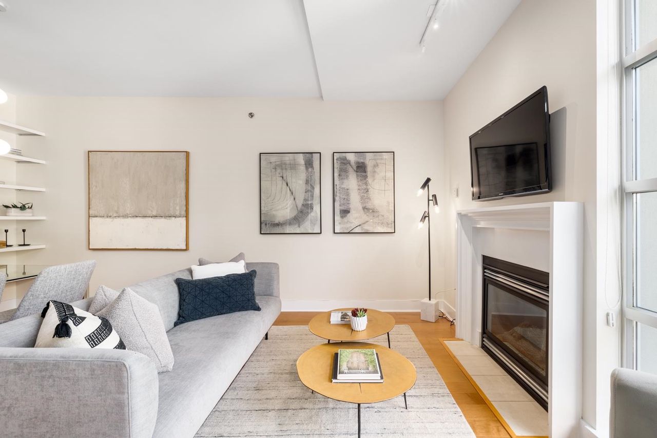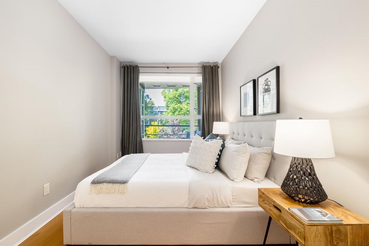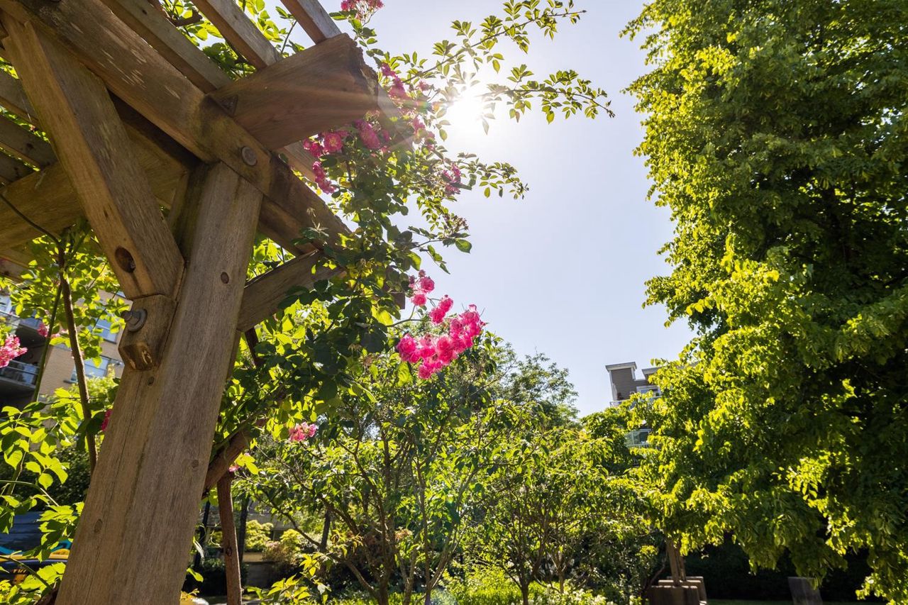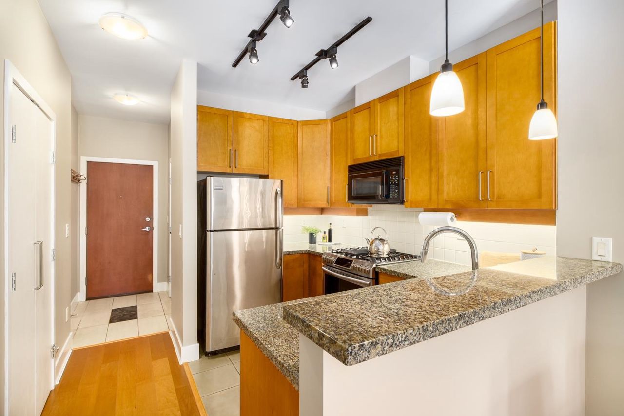 Welcome to the NEW YORKER…a concrete mid rise building in the Arbutus Walk neighbourhood. This spacious one bedroom & den of almost 700 SF has it all! New engineered hardwood floors throughout, custom roller shades, gas fireplace & range, front load washer/dryer, high ceilings plus a large covered patio. The chef inspired kitchen has ample cupboard space, maple cabinetry, updated stainless appliances & granite counter tops. The generous sized bedroom is a sanctuary with velvet floor to ceiling drapes, his & her wardrobes, private en-suite bath with a deep soaker tub. The location is second to none with bike paths, gardens & parks all around, public transportation, groceries, fabulous cafes & patisseries. Rentals & pets allowed with secure underground parking & car wash bay.