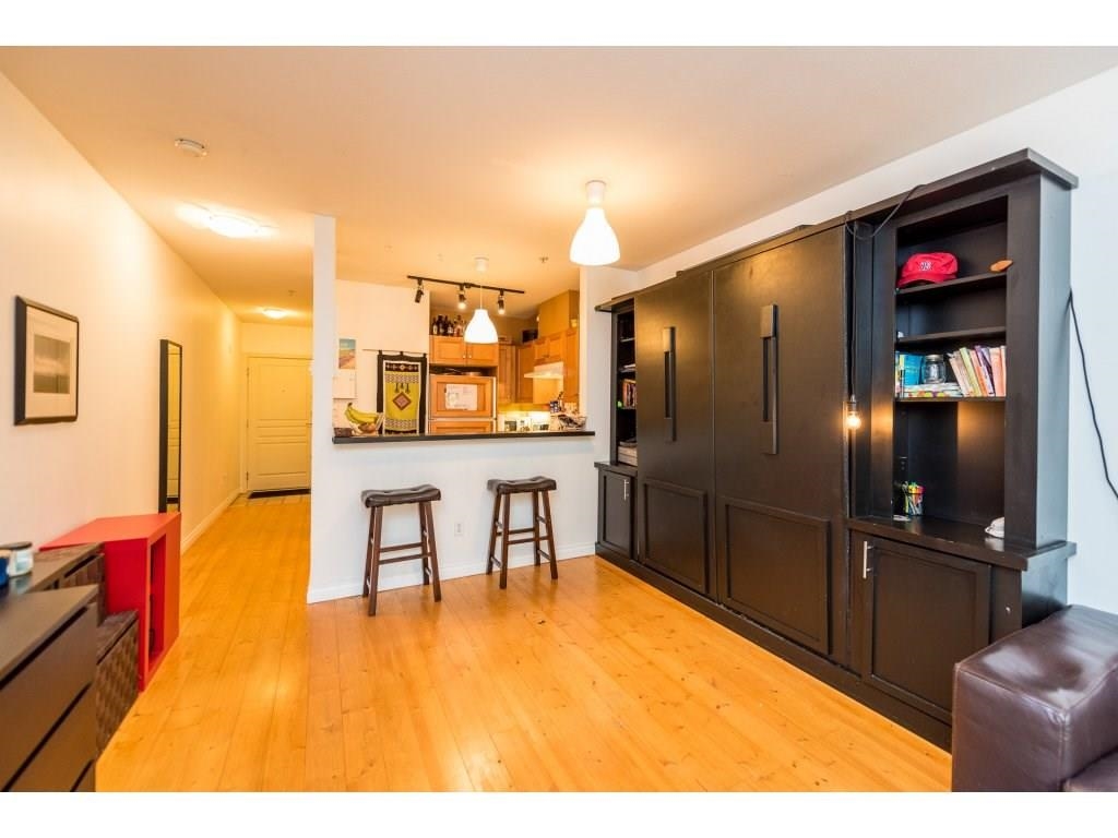 North Facing Studio unit on a quiet side. Like living in a townhouse with bright floor to ceiling windows and your private fenced patio. A very open floor plan with custom upgrades & pine softwood flooring. Furnished with a custom murphy bed. Great for an investor or First Time Buyer! Pets & Rentals welcome!