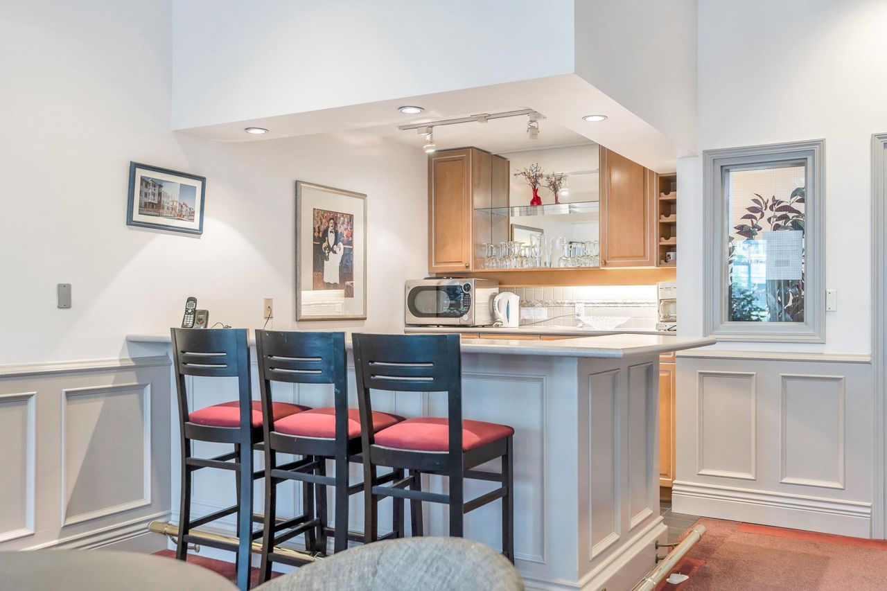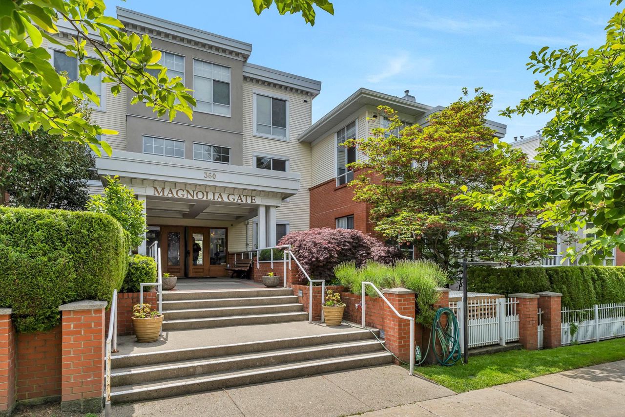 MAGNOLIA GATE! Two bedroom, bright, north facing home with mountain view! Featuring an open concept with new paint, vaulted ceilings, cozy gas fireplace, spacious rooms, large butlers pantry and a 5 piece bathroom with relaxing soaker tub. This unit has an enclosed solarium which makes for an excellent den, up and down blinds and built in Murphy Bed in the second bedroom. Building has new roof and amenities include 2 guest suites, gym, jacuzzi, workshop, pool table, garden with a fountain and the building also contains a live in caretaker. Central location with a short walk to Queen Elizabeth park, shopping, restaurants and transit. 1 pet allowed (dog or cat), 1 underground parking spot and 1 storage locker. Call for your private showing today!