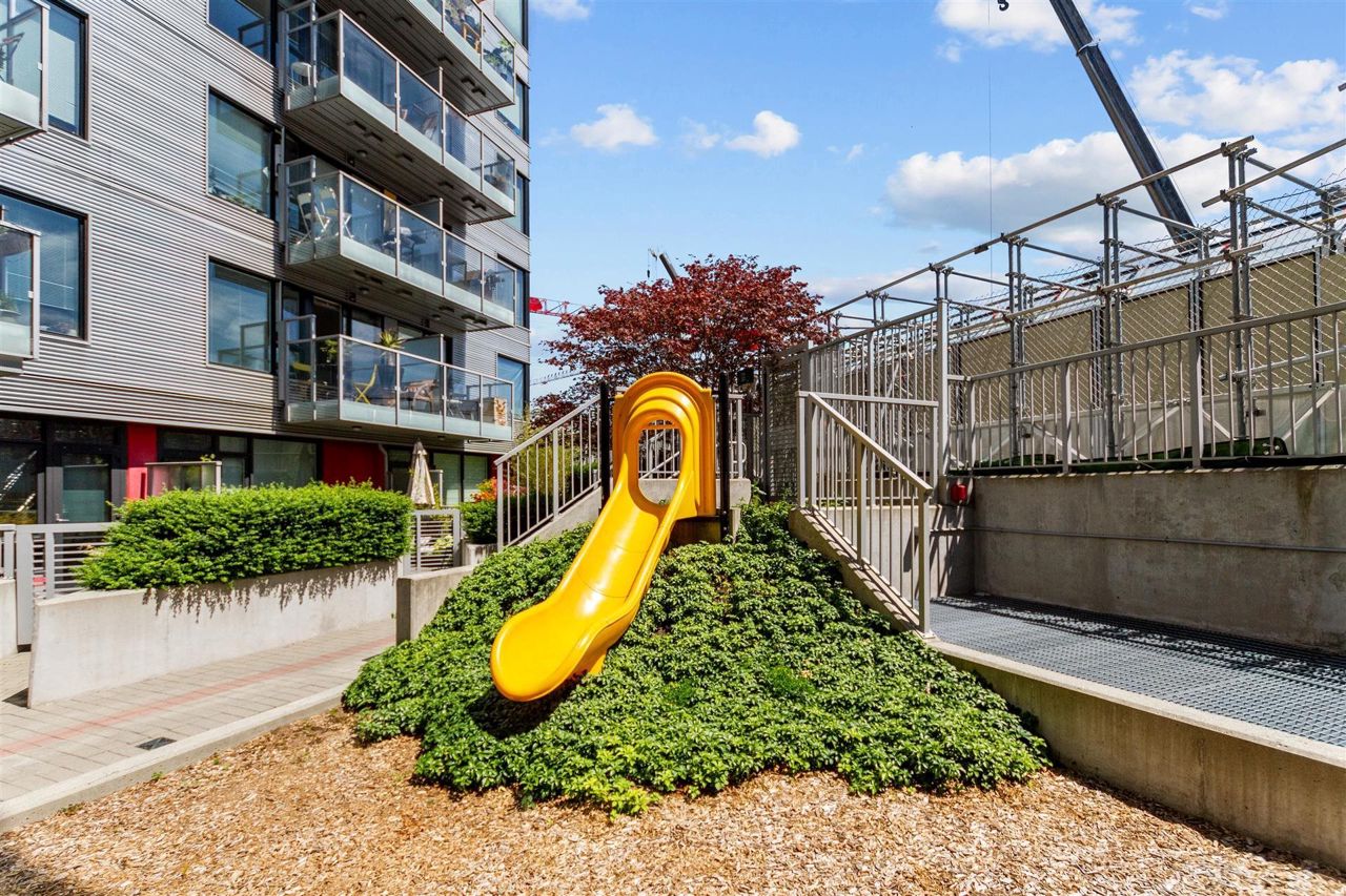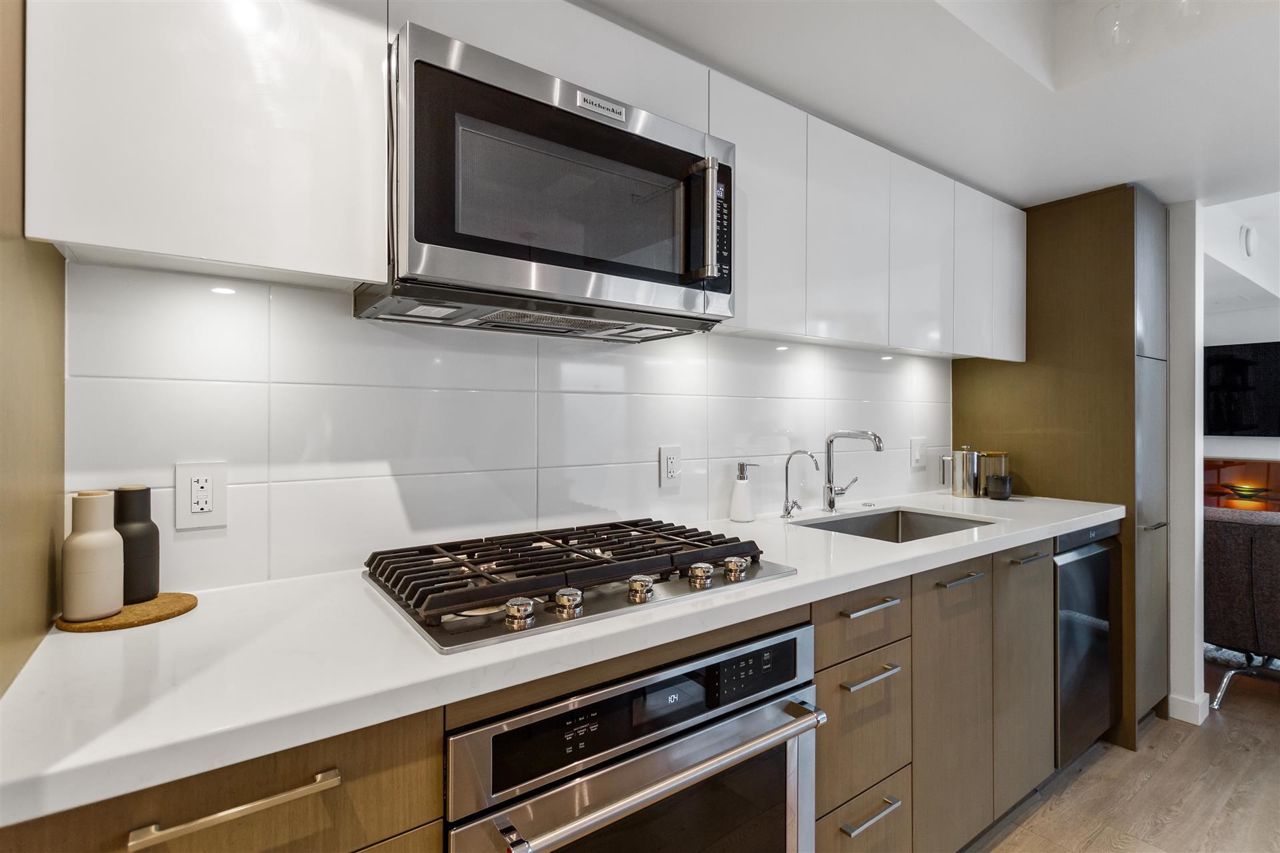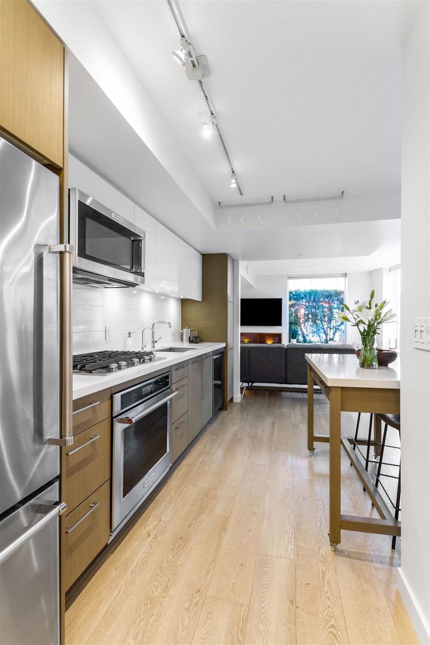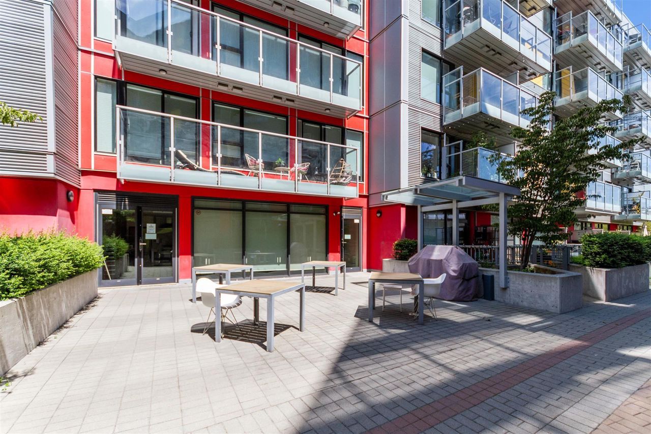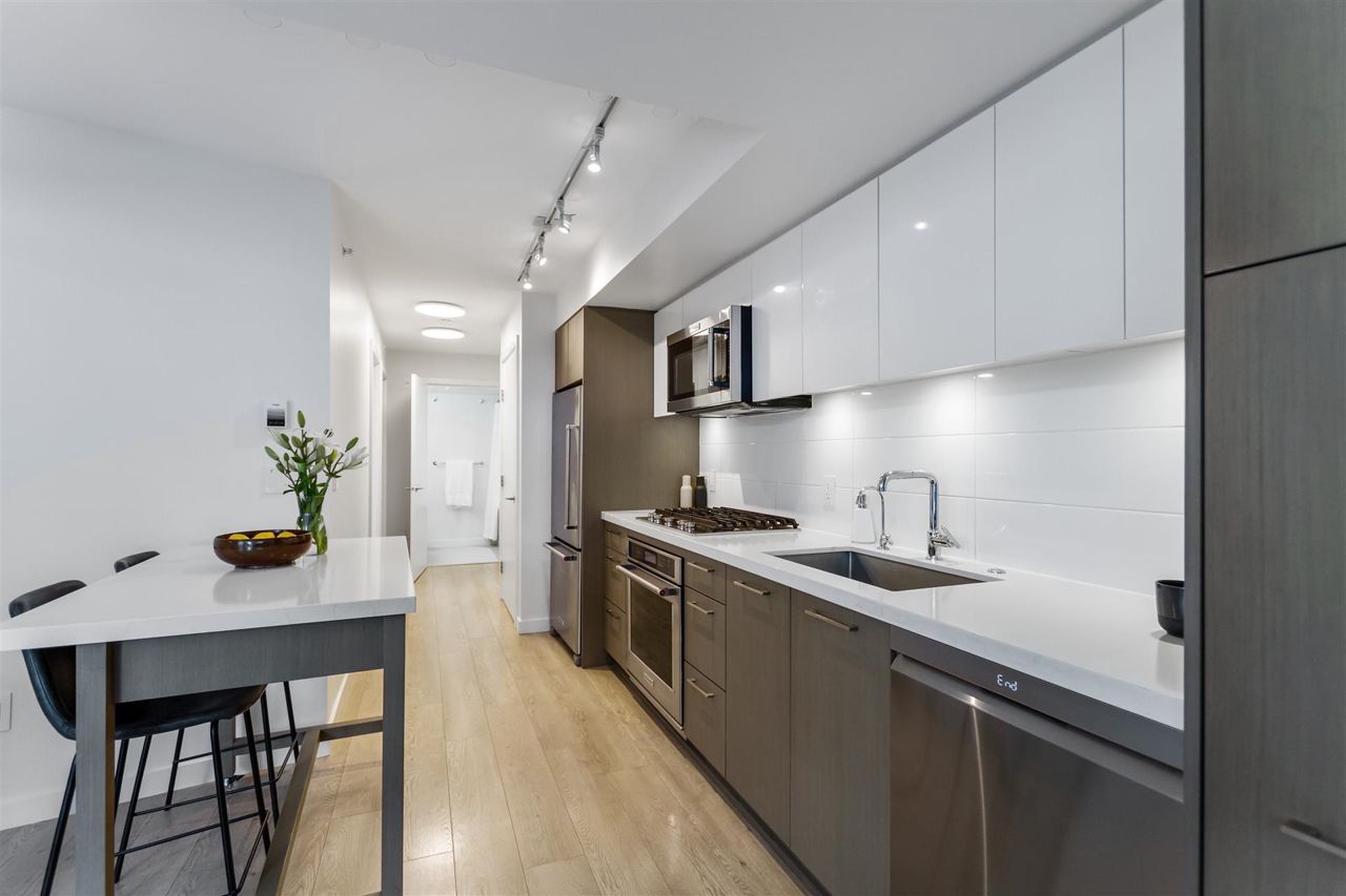 Gorgeous and Ever Popular "Canvas" by Onni. Two bedroom Condo with huge patio! Immaculate and freshly painted-all you have to do is move in!! Open concept living/dining/kitchen with large bright windows and access to the oversized patio great for entertaining! Kitchen features gas cooktop, tons of cabinets, quartz countertops and convenient moveable island! Dining area has been updated with lovely banquette seating with bonus storage. Newer sleek washer/dryer units and dishwasher. Two good sized bedrooms and sparkling bath round out this exceptional home. Great amenities-gym, workshop, outdoor seating areas with bbq, party room, common gardens. Fantastic walking location! close to Emily Carr, skytrain, cafes, and more. Prof. measured by Excelsior at 725 sq. feet-to be confirmed by Buyer.