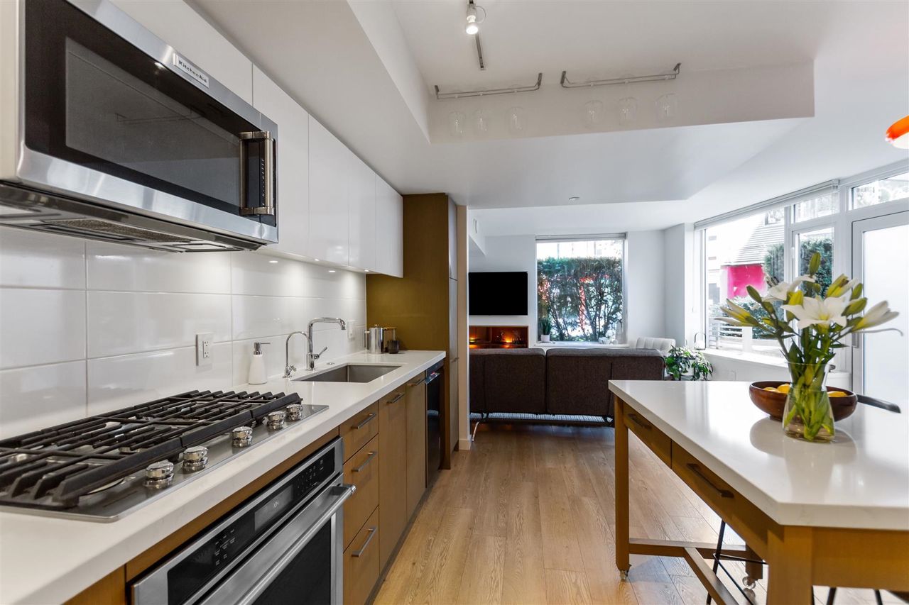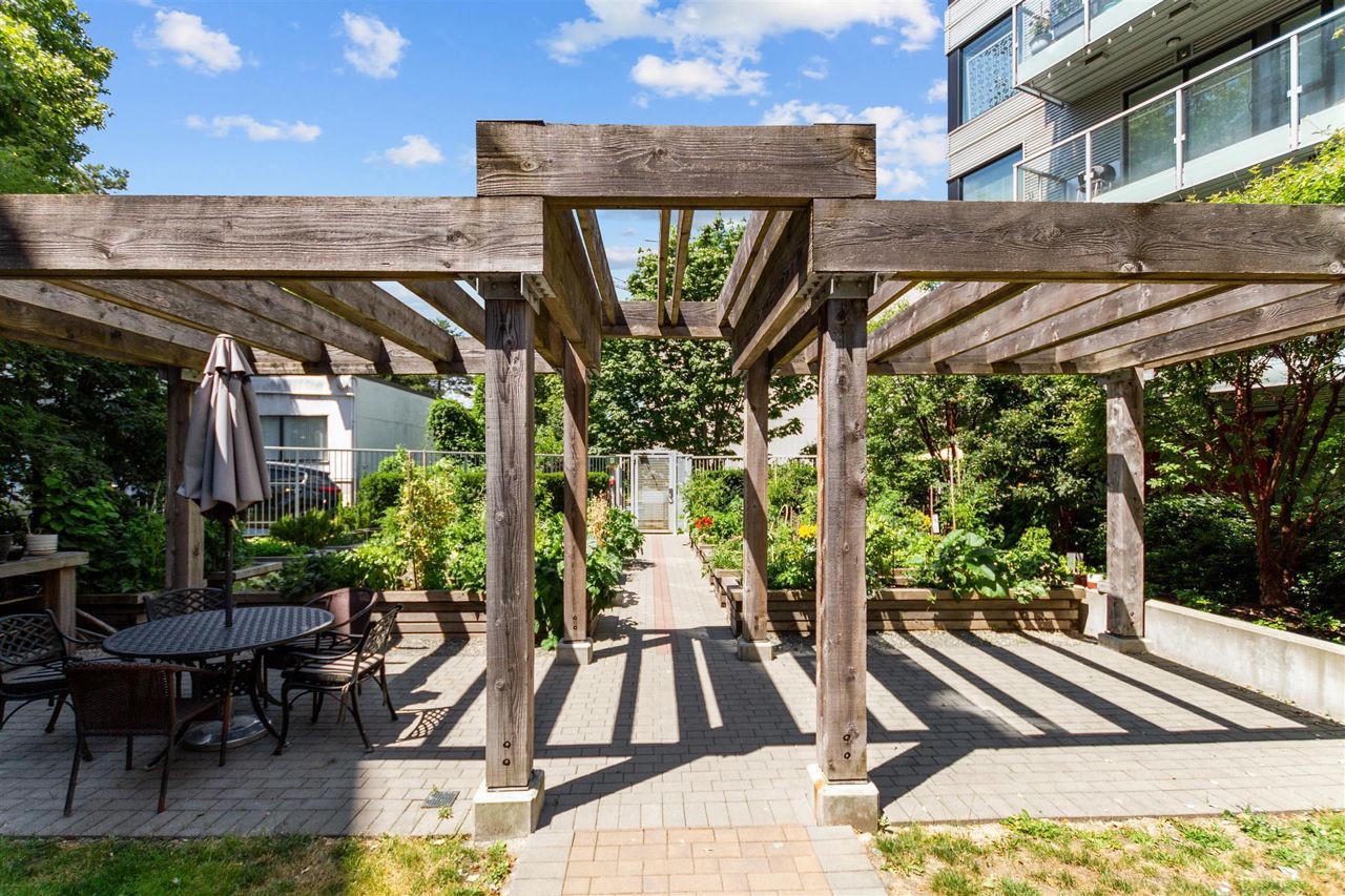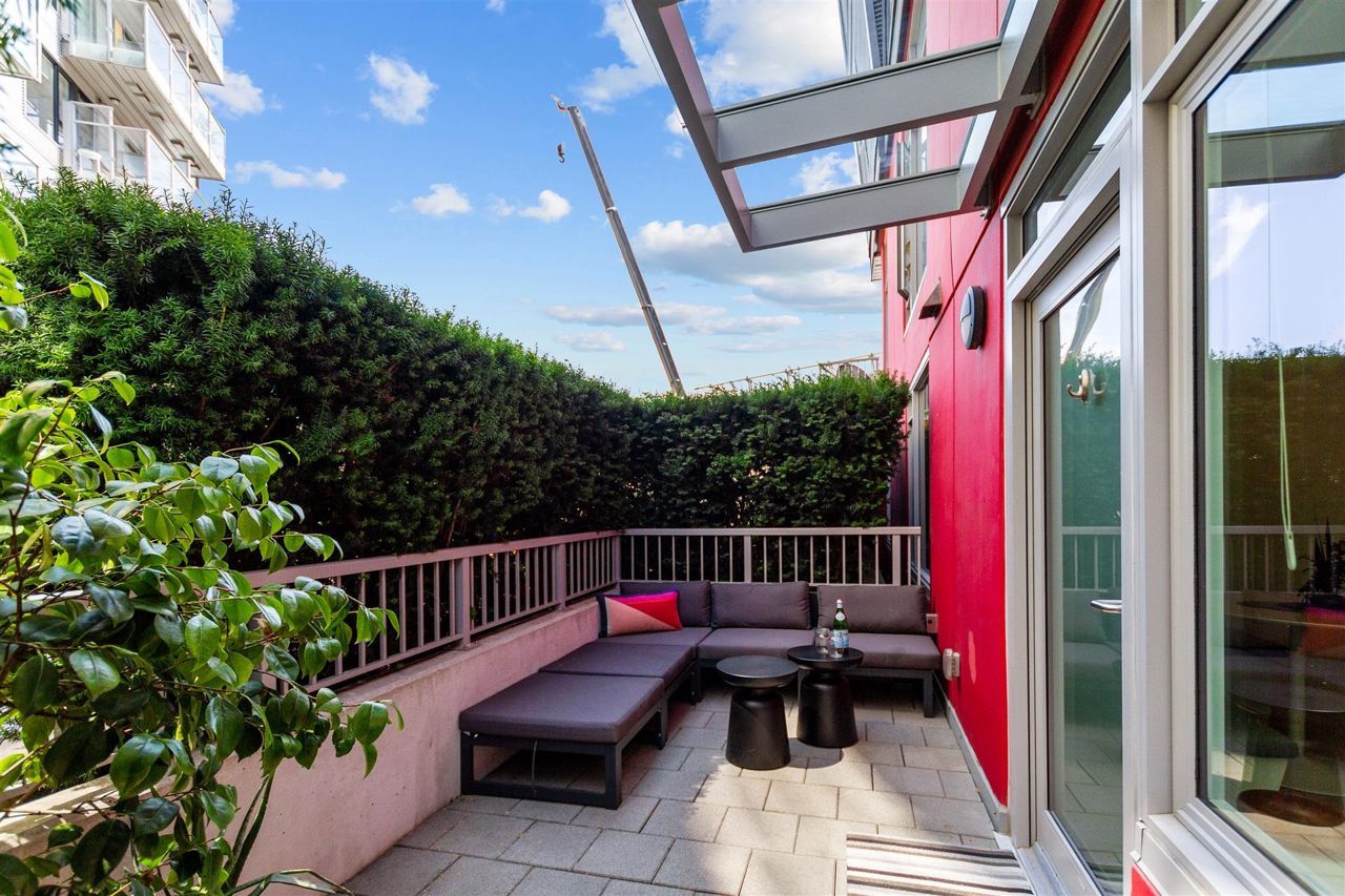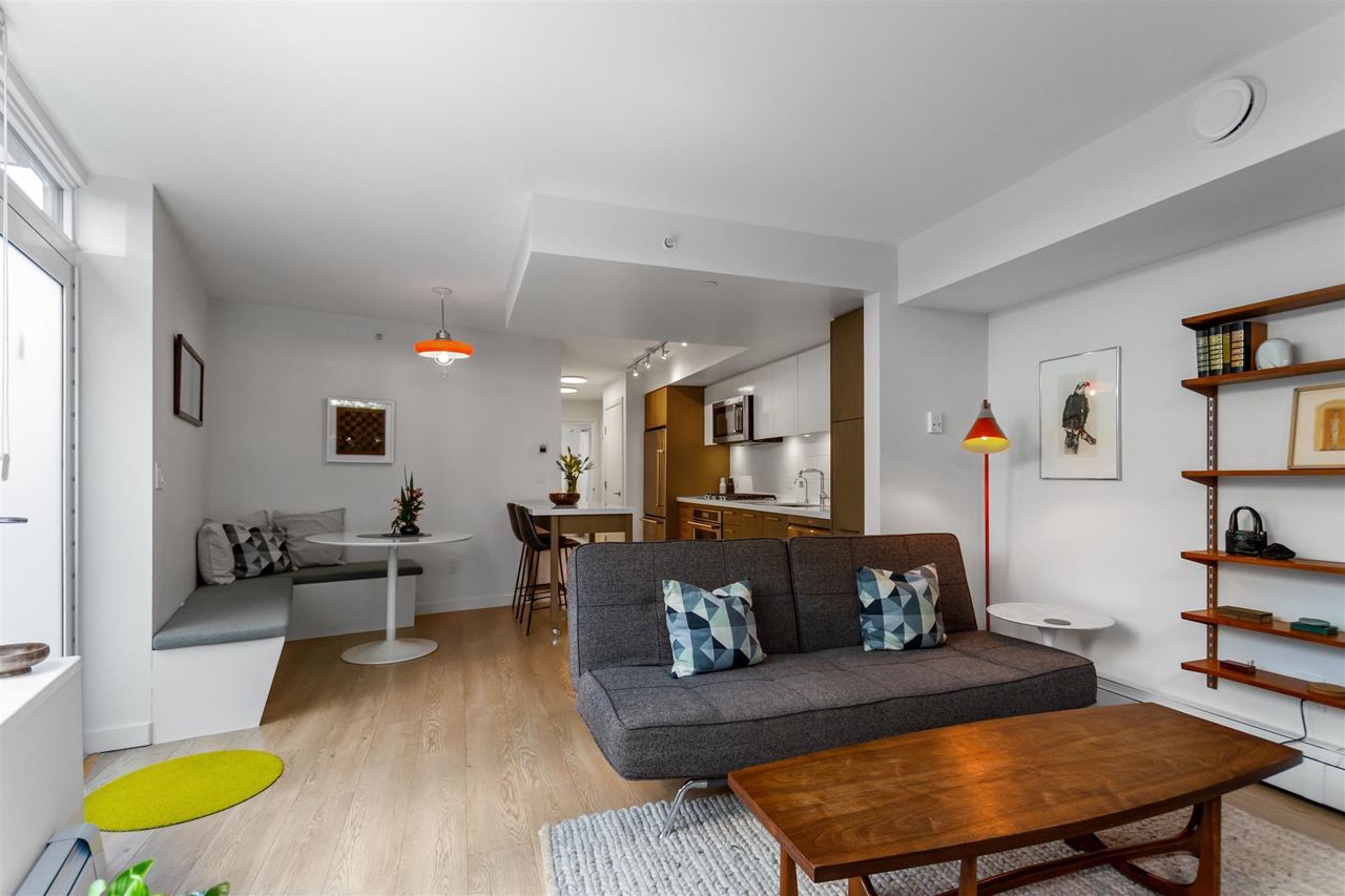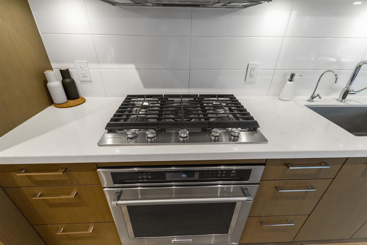 Gorgeous and Ever Popular "Canvas" by Onni. Two bedroom Condo with huge patio! Immaculate and freshly painted-all you have to do is move in!! Open concept living/dining/kitchen with large bright windows and access to the oversized patio great for entertaining! Kitchen features gas cooktop, tons of cabinets, quartz countertops and convenient moveable island! Dining area has been updated with lovely banquette seating with bonus storage. Newer sleek washer/dryer units and dishwasher. Two good sized bedrooms and sparkling bath round out this exceptional home. Great amenities-gym, workshop, outdoor seating areas with bbq, party room, common gardens. Fantastic walking location! close to Emily Carr, skytrain, cafes, and more. Prof. measured by Excelsior at 725 sq. feet-to be confirmed by Buyer.