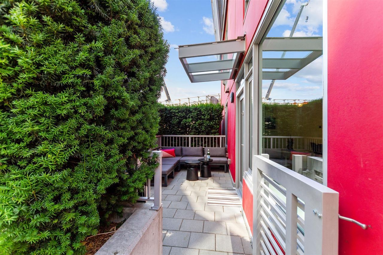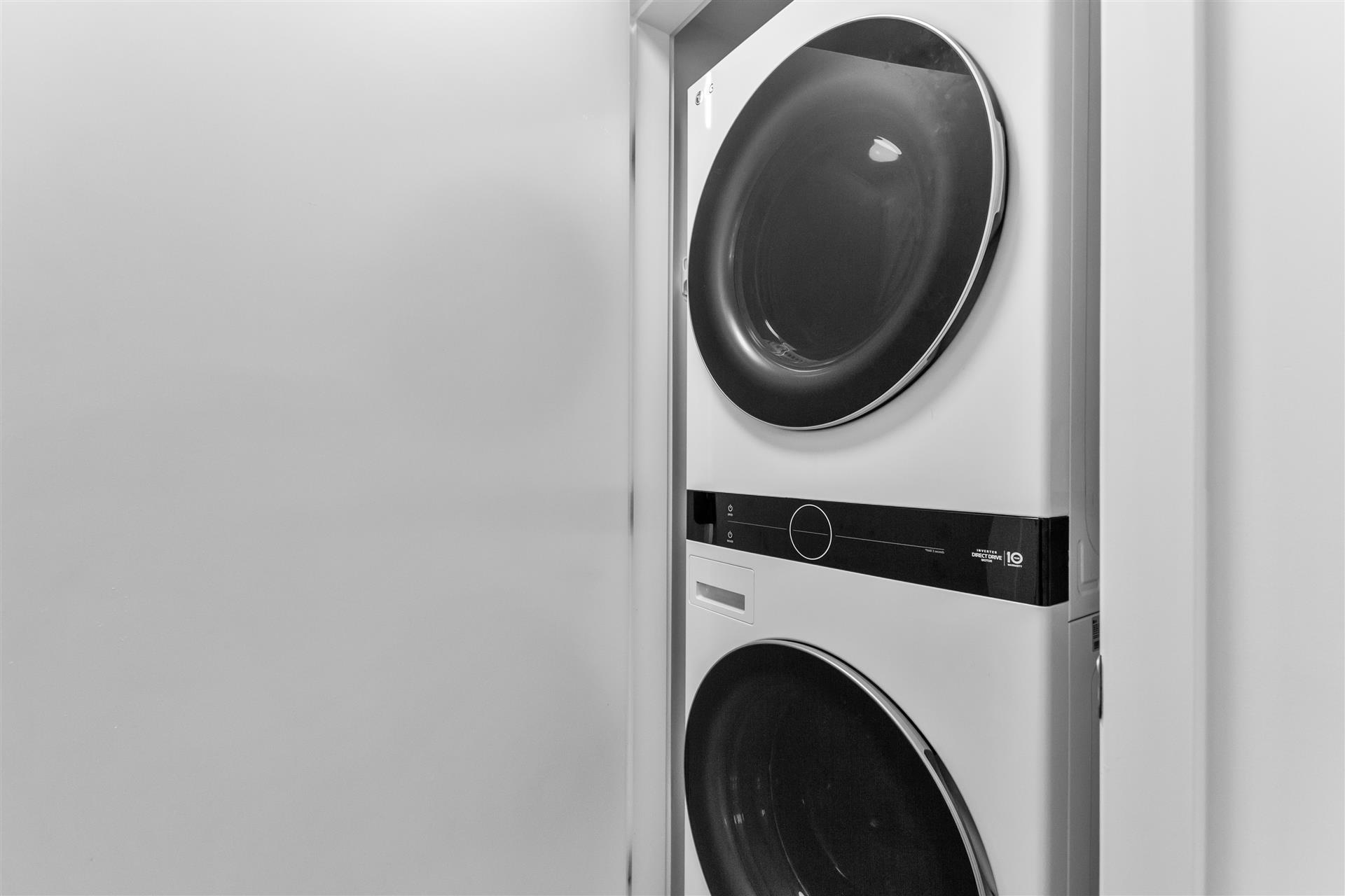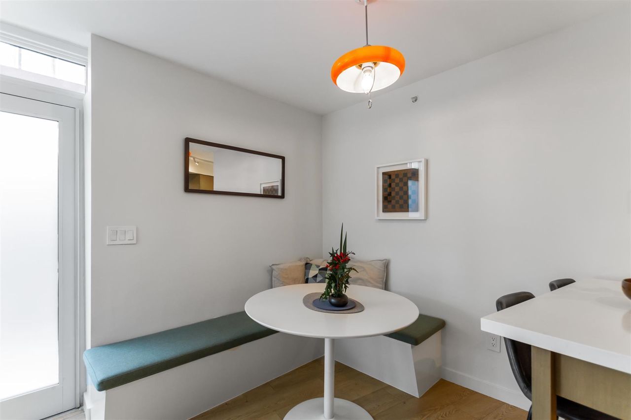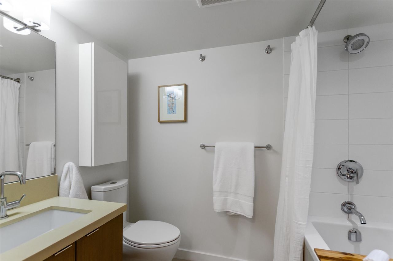 Gorgeous and Ever Popular "Canvas" by Onni. Two bedroom Condo with huge patio! Immaculate and freshly painted-all you have to do is move in!! Open concept living/dining/kitchen with large bright windows and access to the oversized patio great for entertaining! Kitchen features gas cooktop, tons of cabinets, quartz countertops and convenient moveable island! Dining area has been updated with lovely banquette seating with bonus storage. Newer sleek washer/dryer units and dishwasher. Two good sized bedrooms and sparkling bath round out this exceptional home. Great amenities-gym, workshop, outdoor seating areas with bbq, party room, common gardens. Fantastic walking location! close to Emily Carr, skytrain, cafes, and more. Prof. measured by Excelsior at 725 sq. feet-to be confirmed by Buyer.