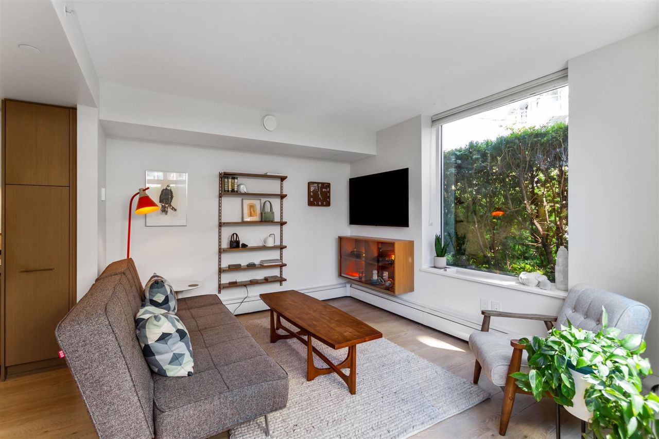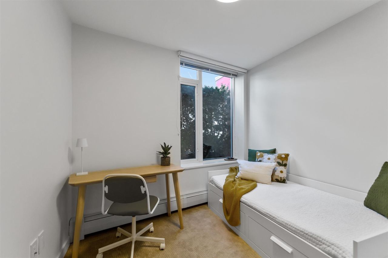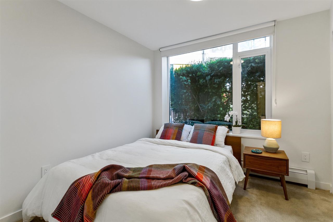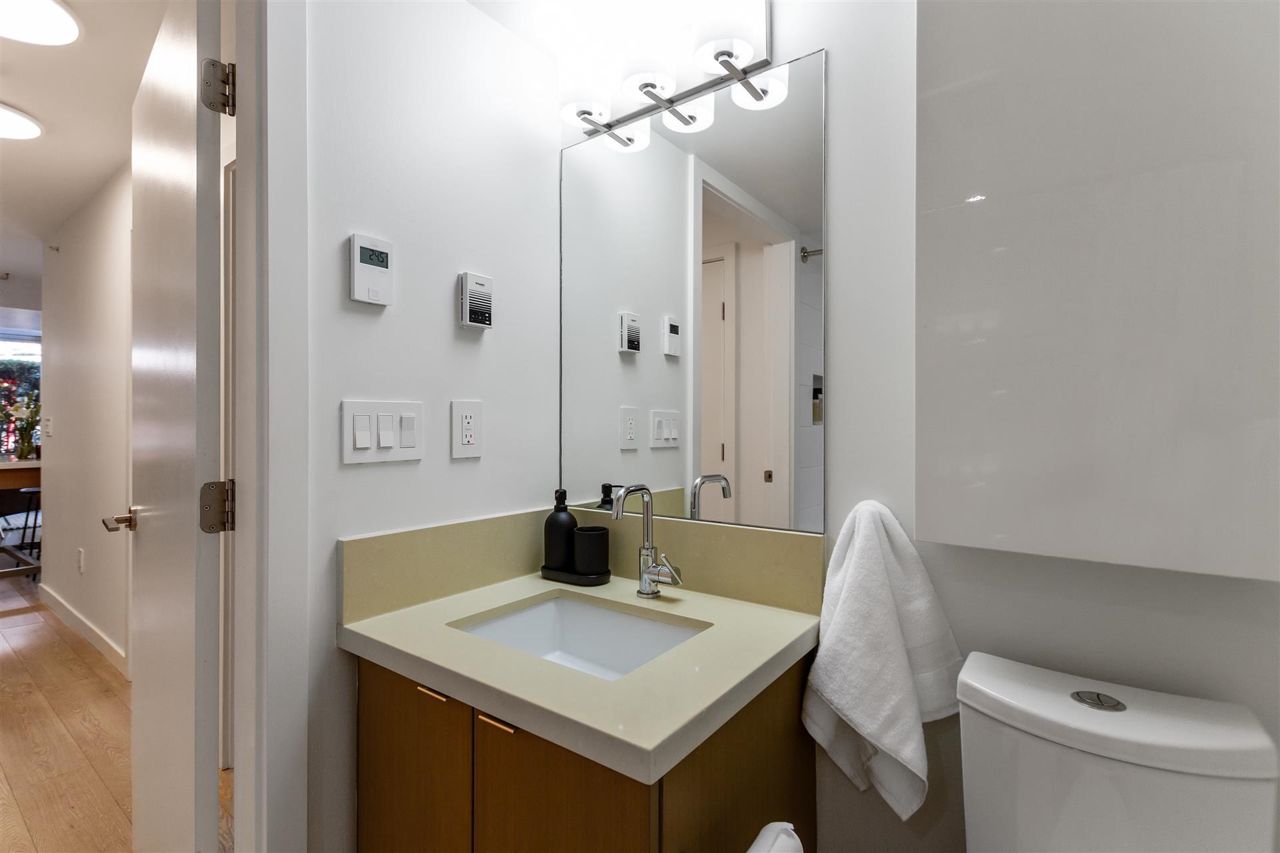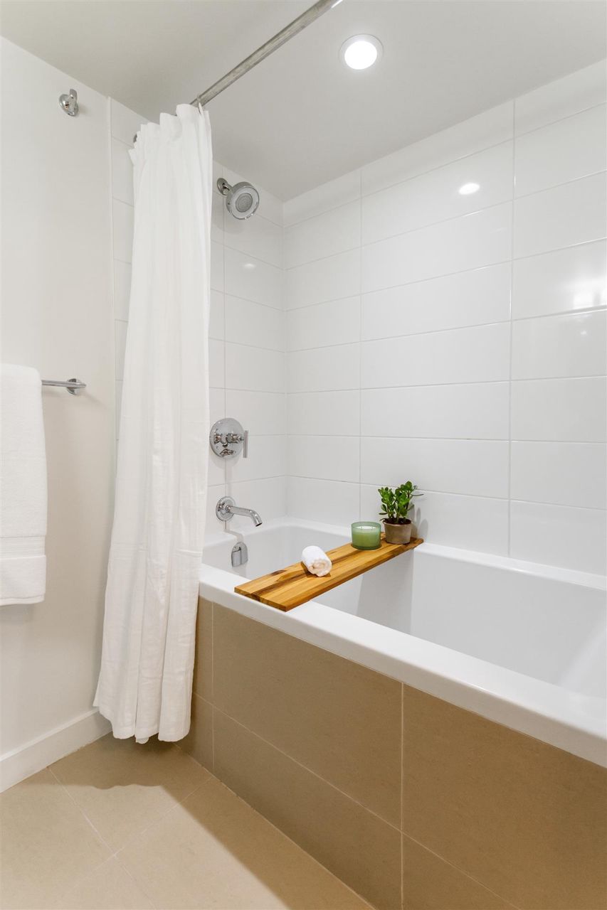 Gorgeous and Ever Popular "Canvas" by Onni. Two bedroom Condo with huge patio! Immaculate and freshly painted-all you have to do is move in!! Open concept living/dining/kitchen with large bright windows and access to the oversized patio great for entertaining! Kitchen features gas cooktop, tons of cabinets, quartz countertops and convenient moveable island! Dining area has been updated with lovely banquette seating with bonus storage. Newer sleek washer/dryer units and dishwasher. Two good sized bedrooms and sparkling bath round out this exceptional home. Great amenities-gym, workshop, outdoor seating areas with bbq, party room, common gardens. Fantastic walking location! close to Emily Carr, skytrain, cafes, and more. Prof. measured by Excelsior at 725 sq. feet-to be confirmed by Buyer.