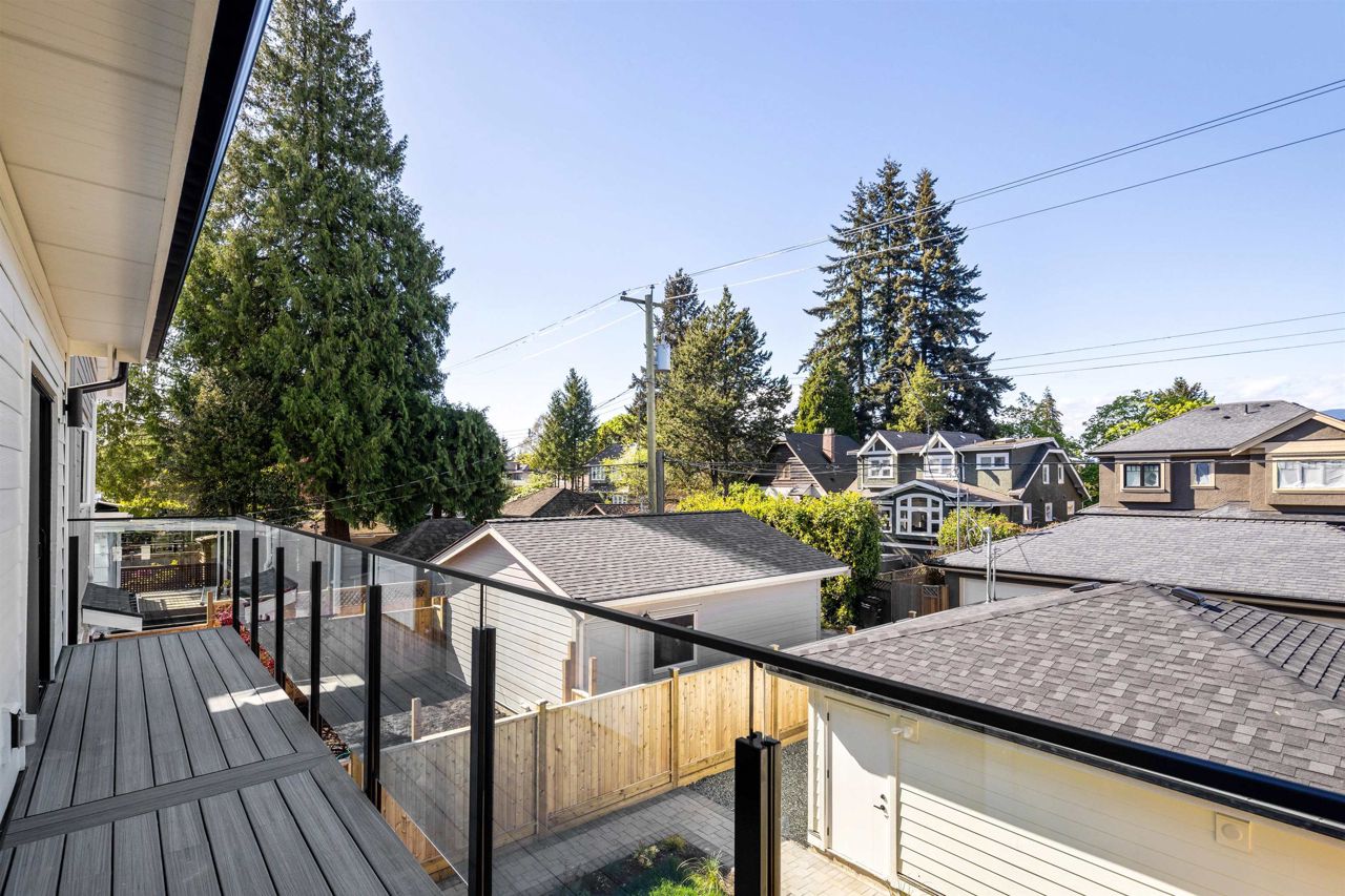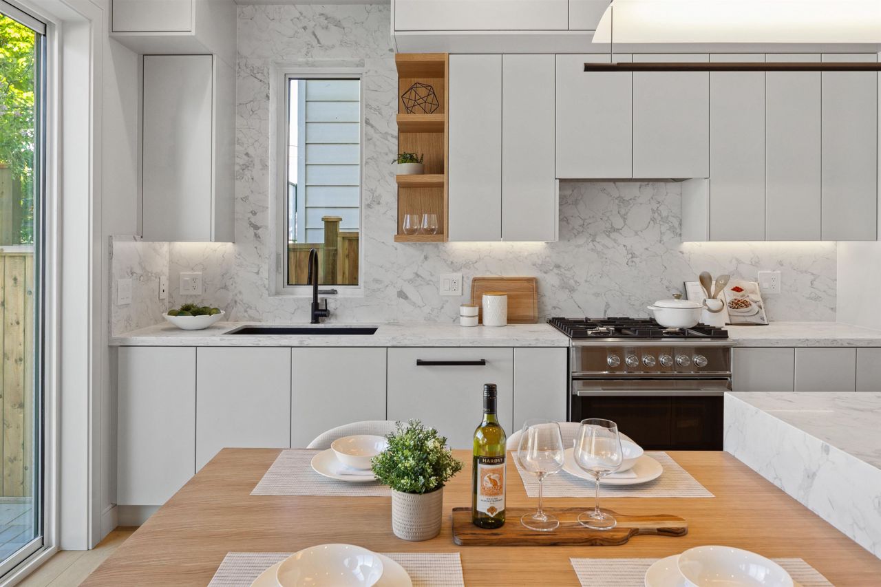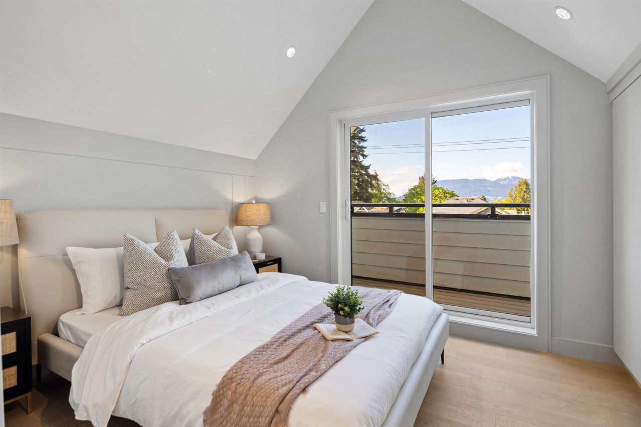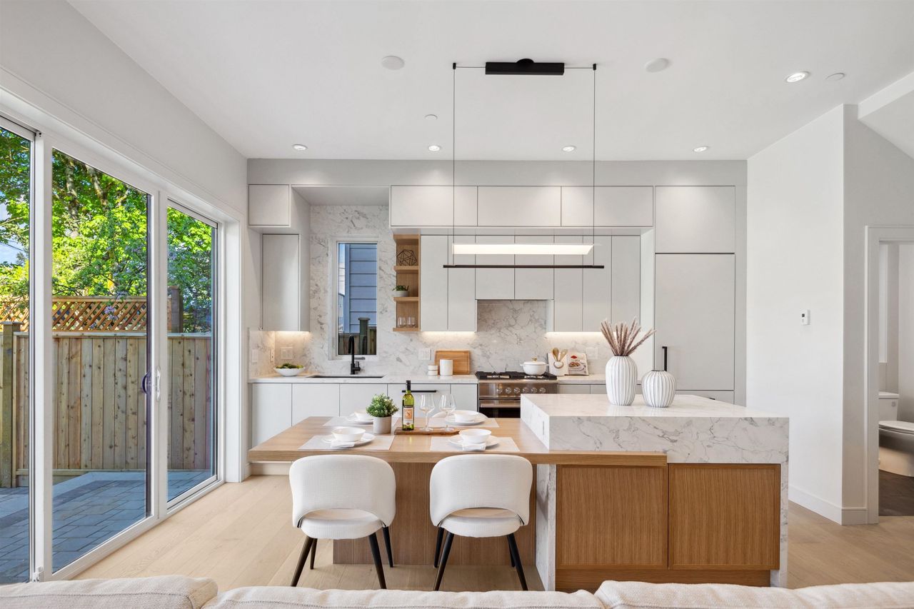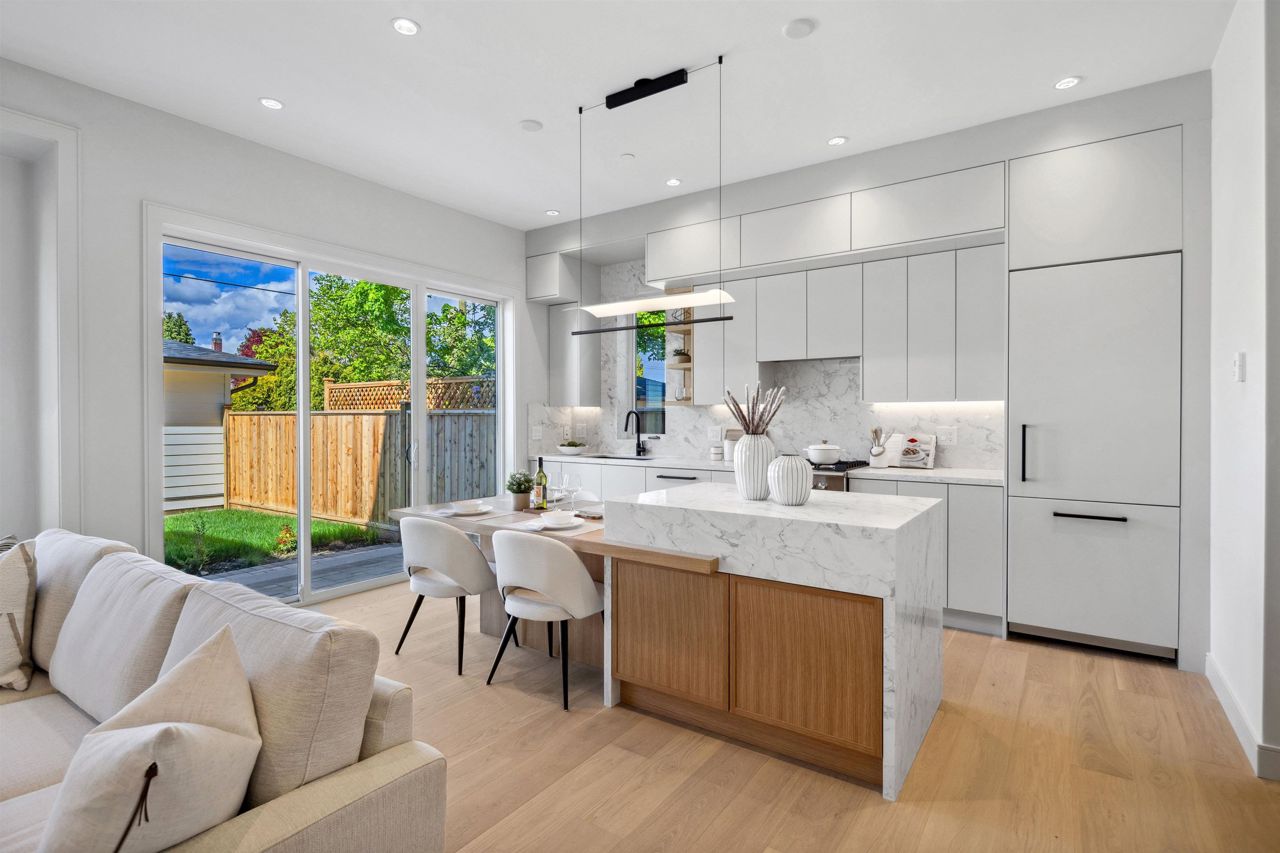 Rear Quiet Unit with Private Backyard and Gorgeous Northshore Mountain View! Rare contemporary 3 bdrms, 2.5 bath Plus Den 1/2 duplex. Situated in the prime Point Grey neighborhood. features an open concept main floor with a sleek modern kitchen offering Fisher& Paykel built-in appliances, gorgeous millwork, and high quality finishings. 10' high ceilings and oversized windows allow for an abundance of light and a view of the surrounding greenery. The efficient floor plan allows for 3 bedrooms, 2 baths and open den on the upper two floors with large built functional cabinets and large patio doors for each bedroom. Bonus: 1 car garage plus 1 open carport space!, 622 s.q . crawl space for storage!OPEN HOUSE Sunday( June 8 ) 2-4 p.m.