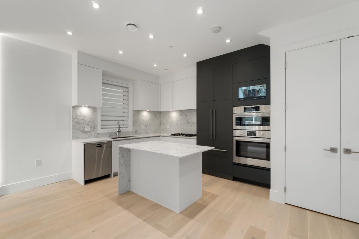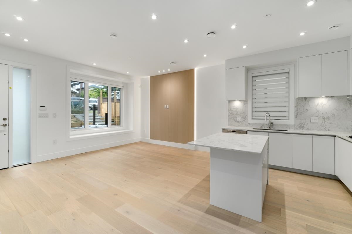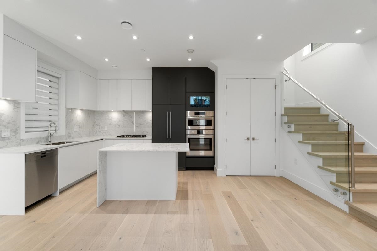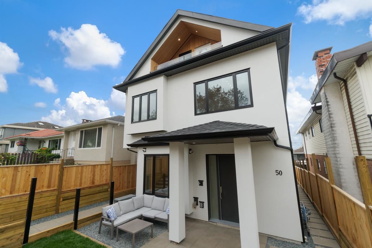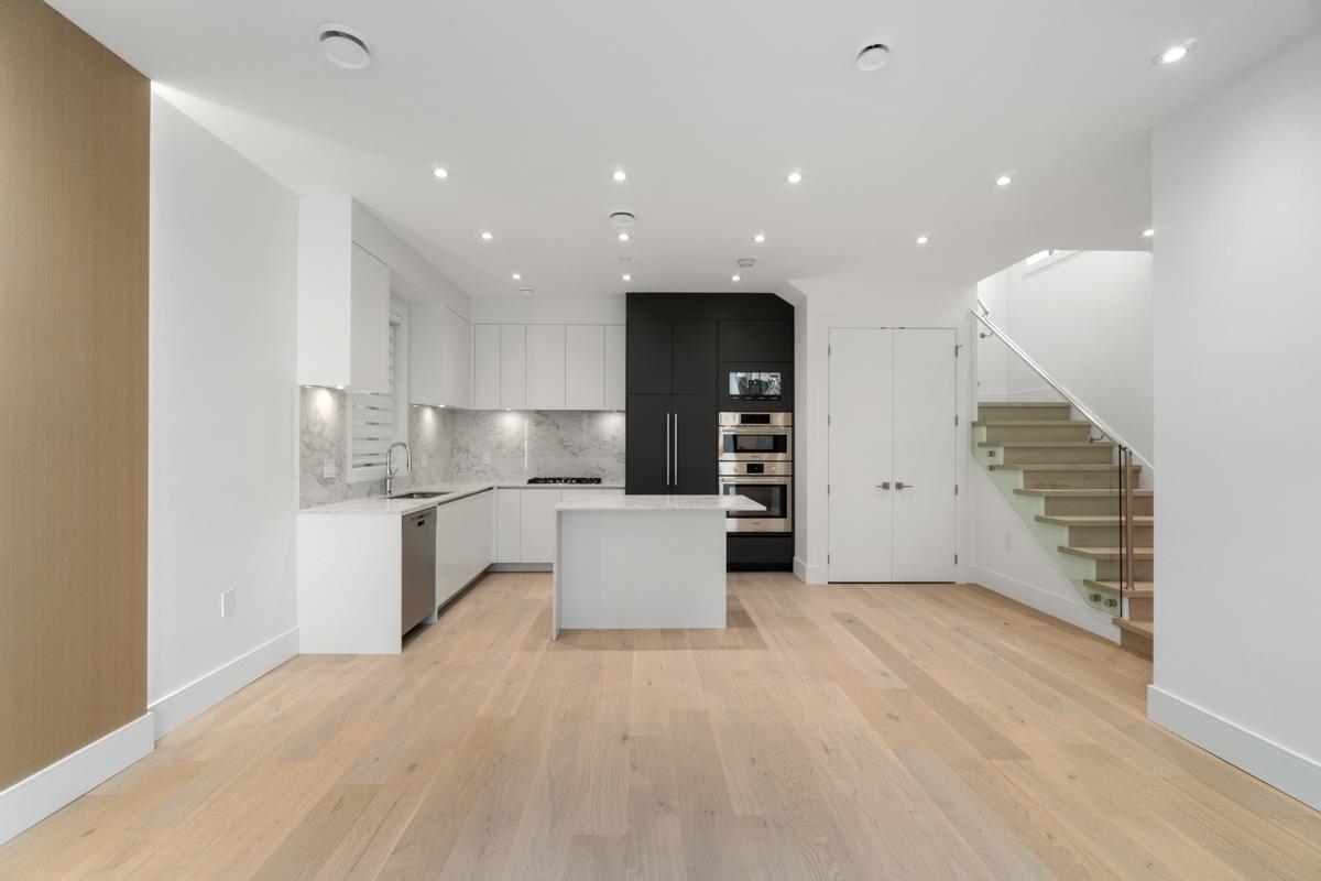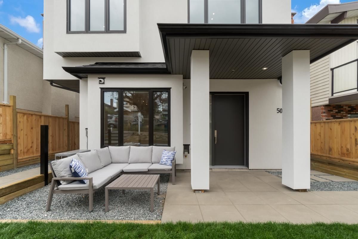 Welcome to the front unit of 50 East 58th Avenue, a stunning brand new contemporary duplex offering luxurious living in a prime location. This exceptional home features 4 bds and 3.5 bath, including 2 primary bedrooms with ensuite, providing ample space and comfort for families of all sizes. Step inside to discover an open concept layout with a south-facing living room and dining room, creating a bright and inviting atmosphere. The gourmet kitchen is a chef's dream, equipped with high-end Bosch stainless steel appliances, sleek countertops, and ample storage space. Throughout all three floors and stairs, you'll find engineered hardwood flooring and a beautiful glass stair railing, adding a touch of elegance to the home. School Catchment Churchill Secondary