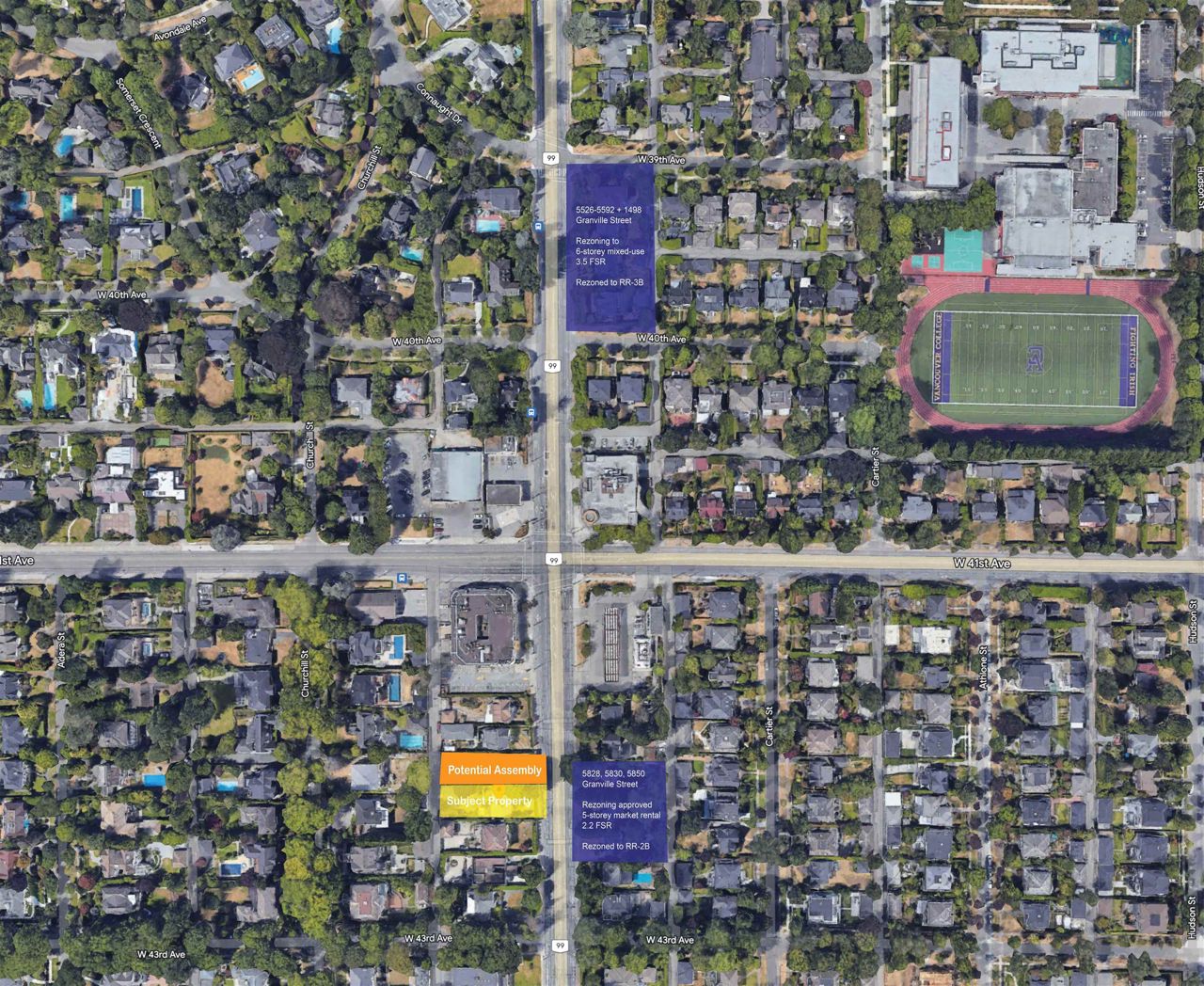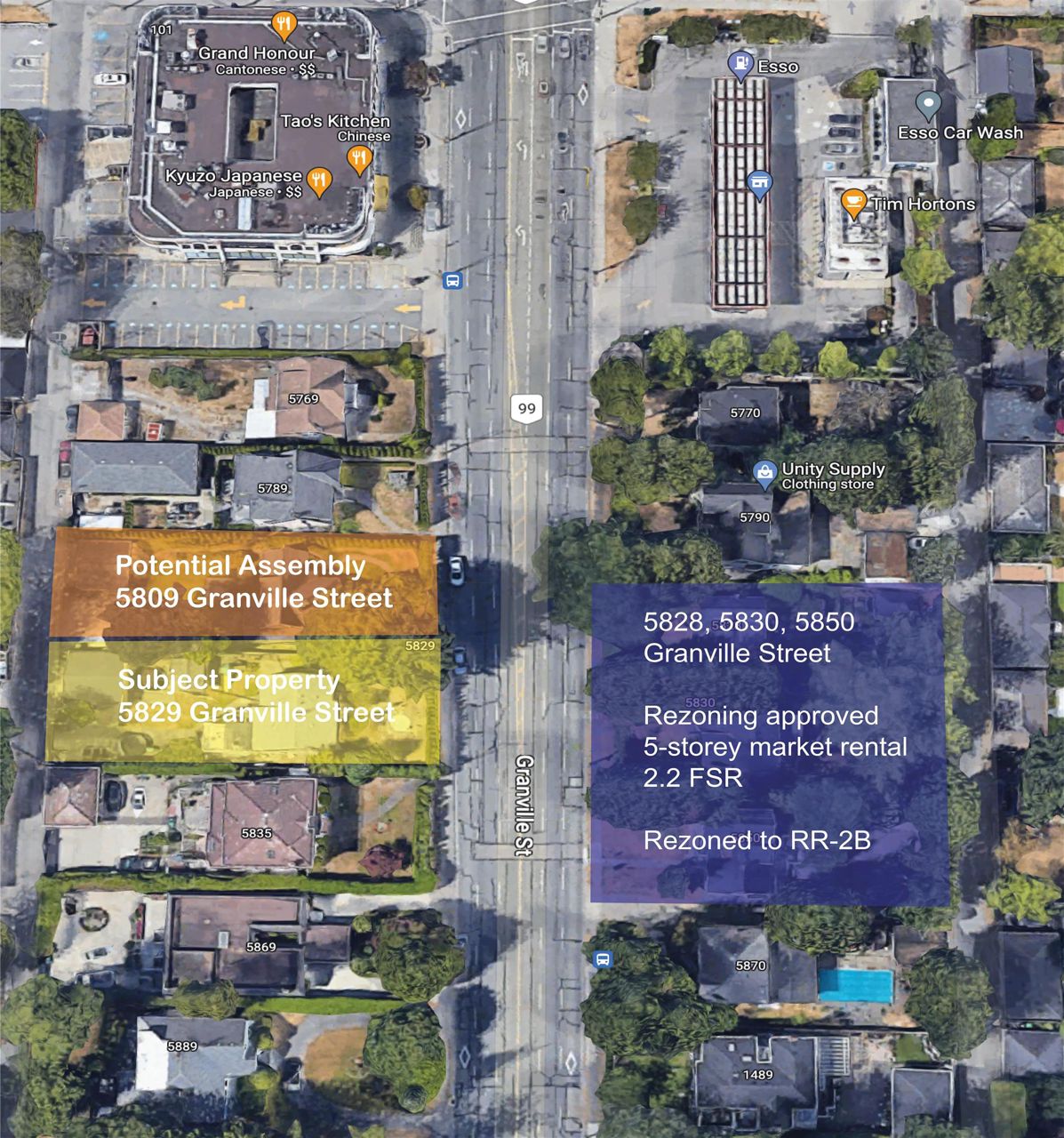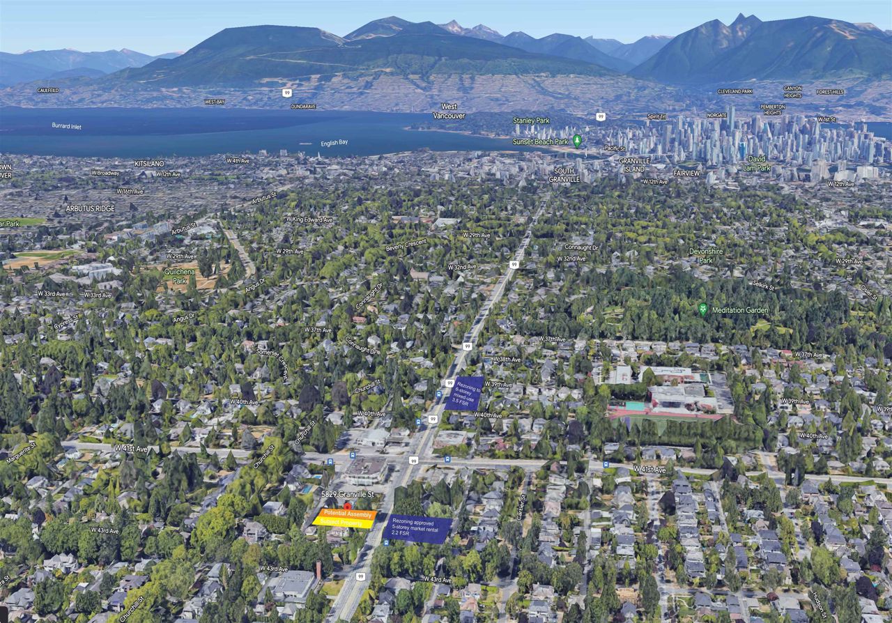 2 LOT LAND ASSEMBLY available. $10,400,000 for 2 lots. 5829 AND 5809 GRANVILLE CAN BE PURCHASED TOGETHER. Total land area of 2 lots: 19,618 square feet. TOTAL DENSITY: 2.2 TO 2.4 FSR DEPENDING ON OPTION CHOSEN BELOW. TOTAL BUILDABLE SF: 43,160 SF TO 47,083 SF. SECURED RENTAL POLICY ALLOWS FOR THE FOLLOWING OPTIONS: (Option 1): 5-Storey apartment building - 100% market rental units, (2.2 FSR). (Option 2): 6-Storey Apartment building - 80% market rental, 20% below market rental, (2.4 FSR). 5809 House has 4 BR, 3BA, Rec room, large flex room/Den. Also, 2 bedroom Suite with separate Entry renting at $2000/ month. House would easily generate $5,500+ a month.