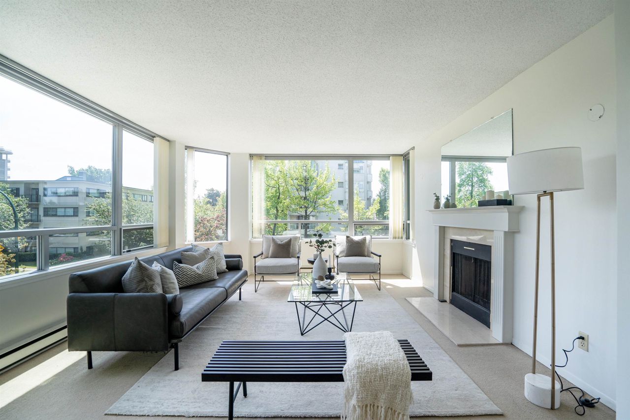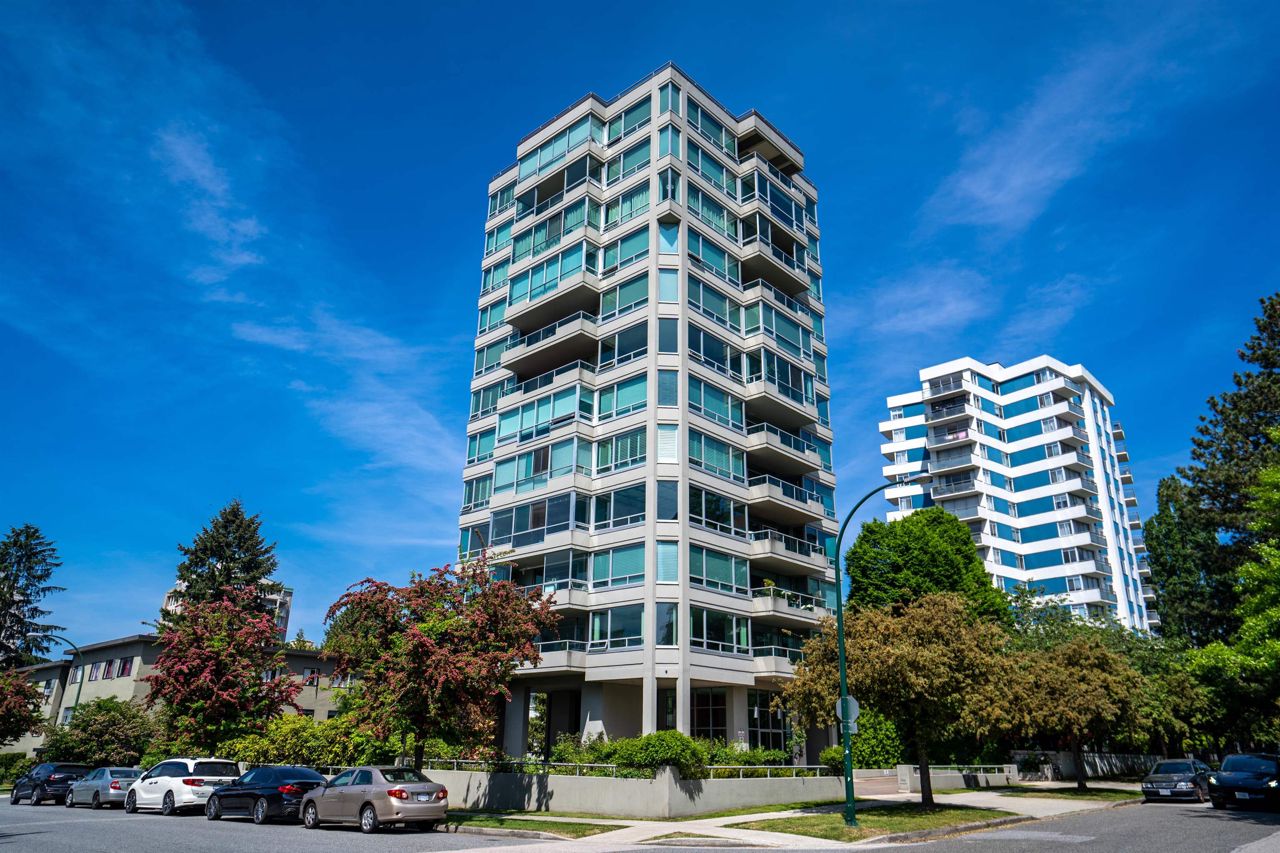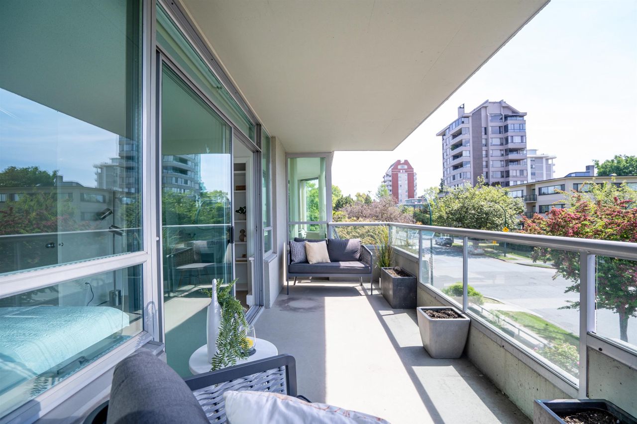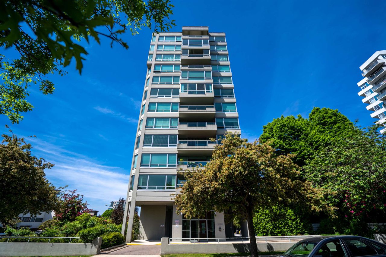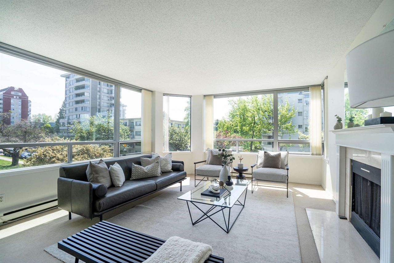 FULL FLOOR SUITE! Ever have an elevator for a front door? This one does! It also has 2 sunny outdoor terraces, picture windows all around, large principal rooms, views from every room and an energy + light that flows beautifully throughout. This suite is on the second level, original in condition and ready for a fresh take! [2 bedrooms + 2 baths | 1554sf | 2 parking | storage | f/p | insuite laundry] The Kerrisdale is a Bing Thom concrete high-rise at the corner of 43rd/Yew with visitor parking, just steps to Kerrisdale Village and the Kerrisdale Community Centre.