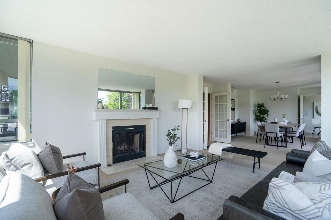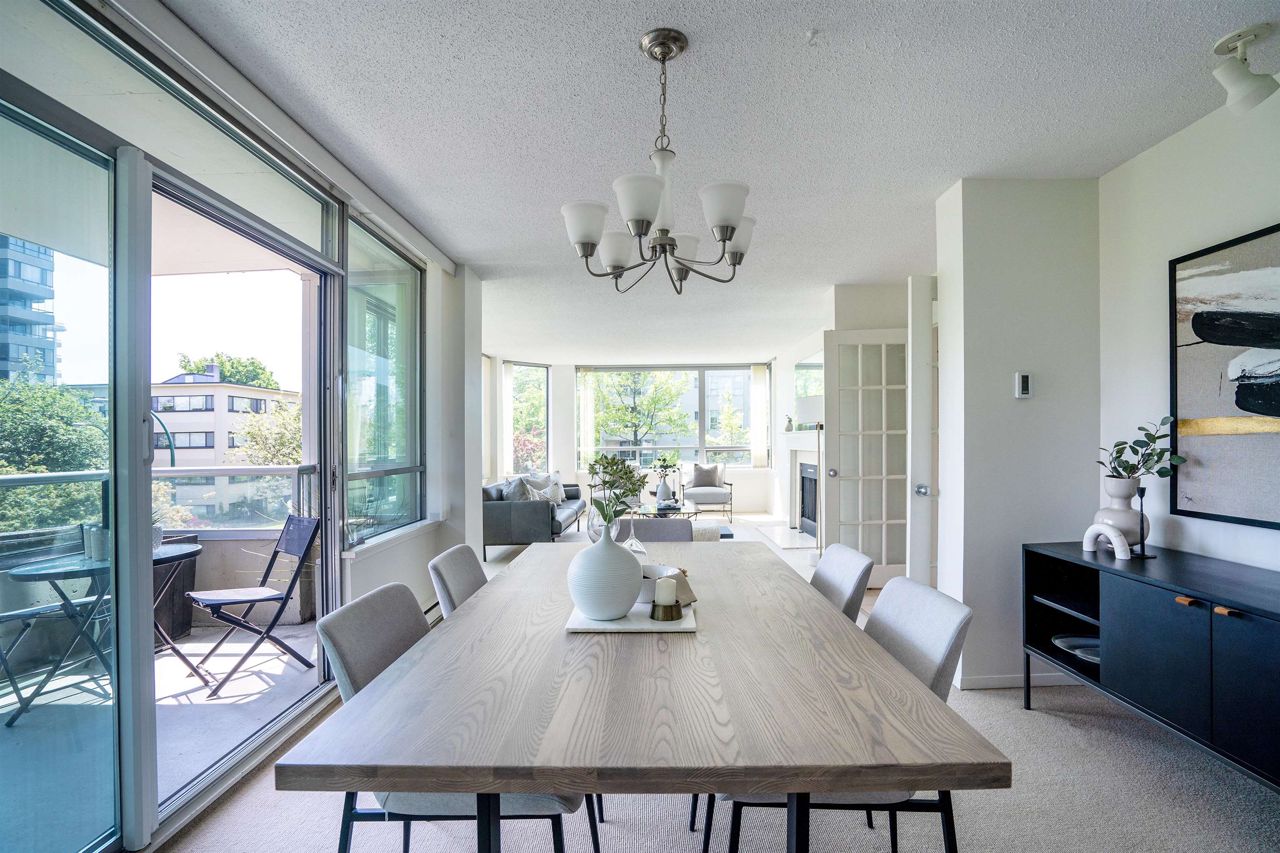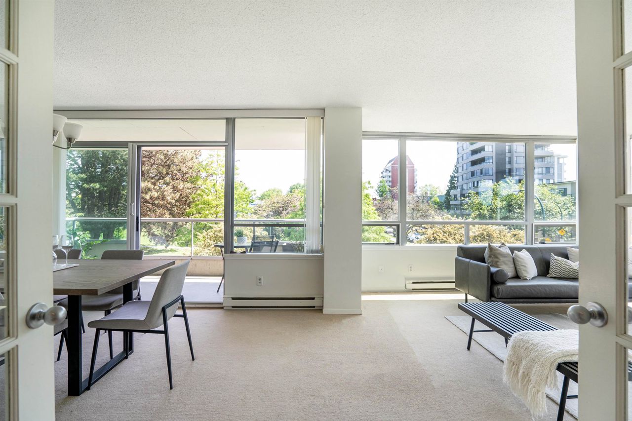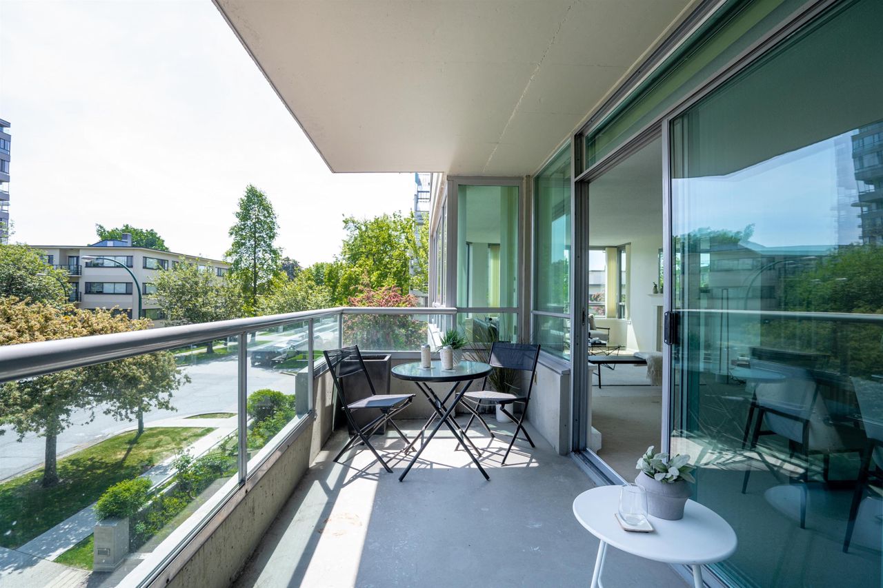 FULL FLOOR SUITE! Ever have an elevator for a front door? This one does! It also has 2 sunny outdoor terraces, picture windows all around, large principal rooms, views from every room and an energy + light that flows beautifully throughout. This suite is on the second level, original in condition and ready for a fresh take! [2 bedrooms + 2 baths | 1554sf | 2 parking | storage | f/p | insuite laundry] The Kerrisdale is a Bing Thom concrete high-rise at the corner of 43rd/Yew with visitor parking, just steps to Kerrisdale Village and the Kerrisdale Community Centre.