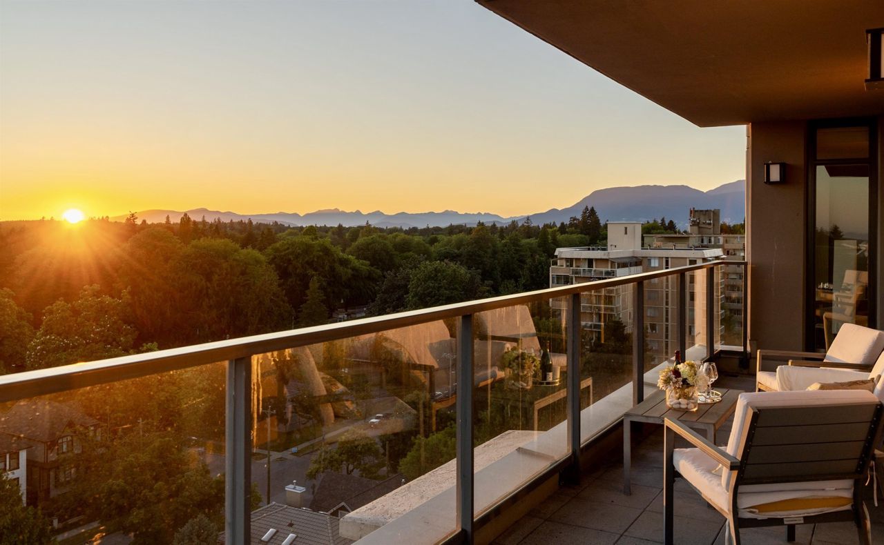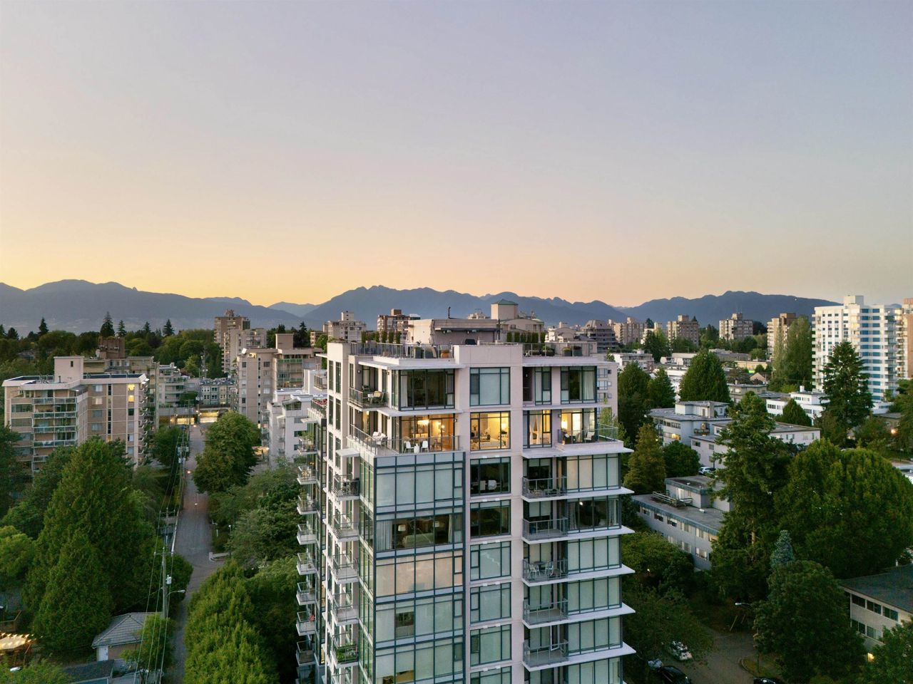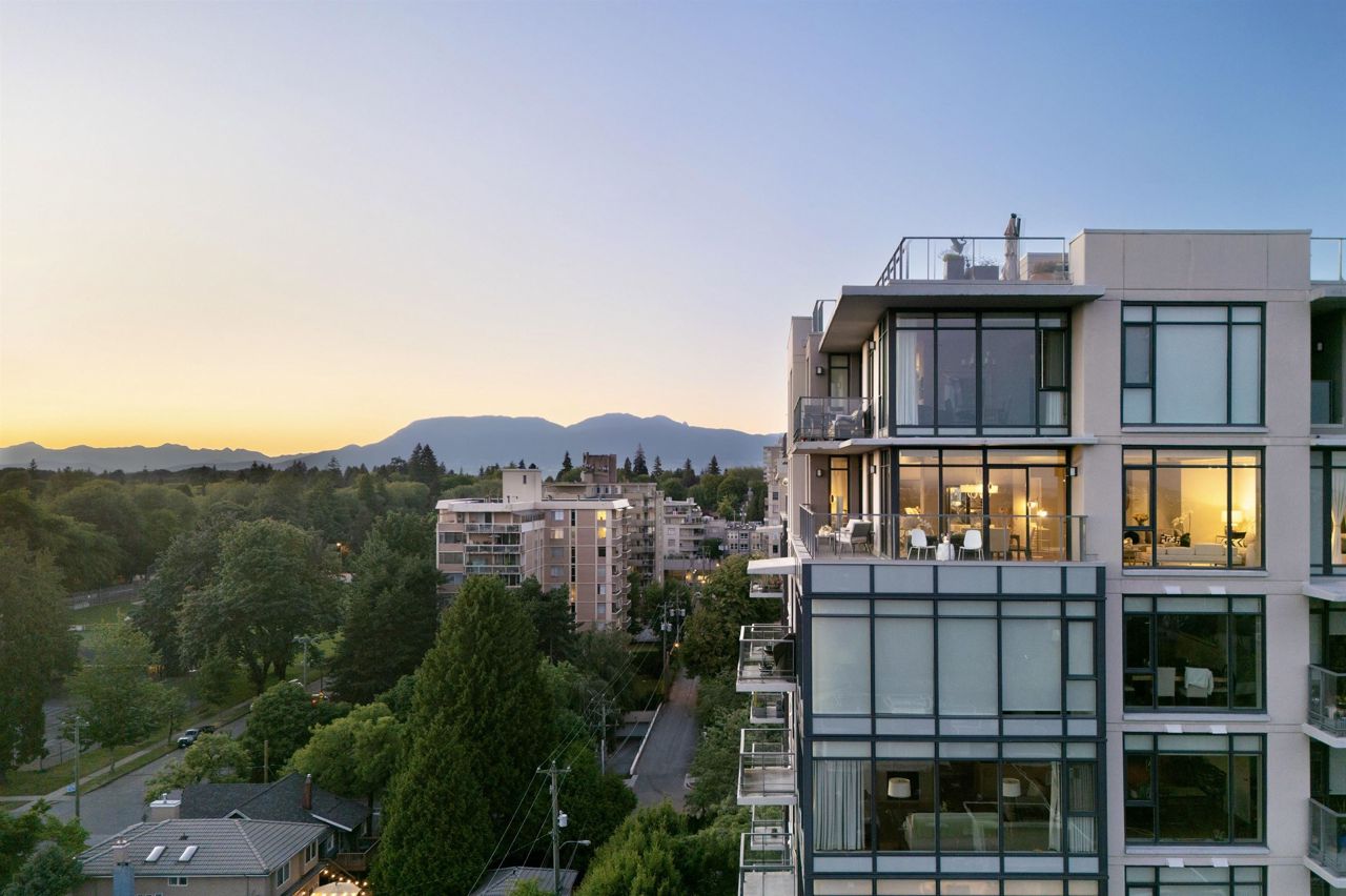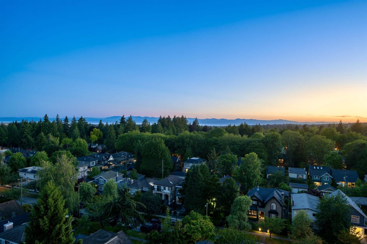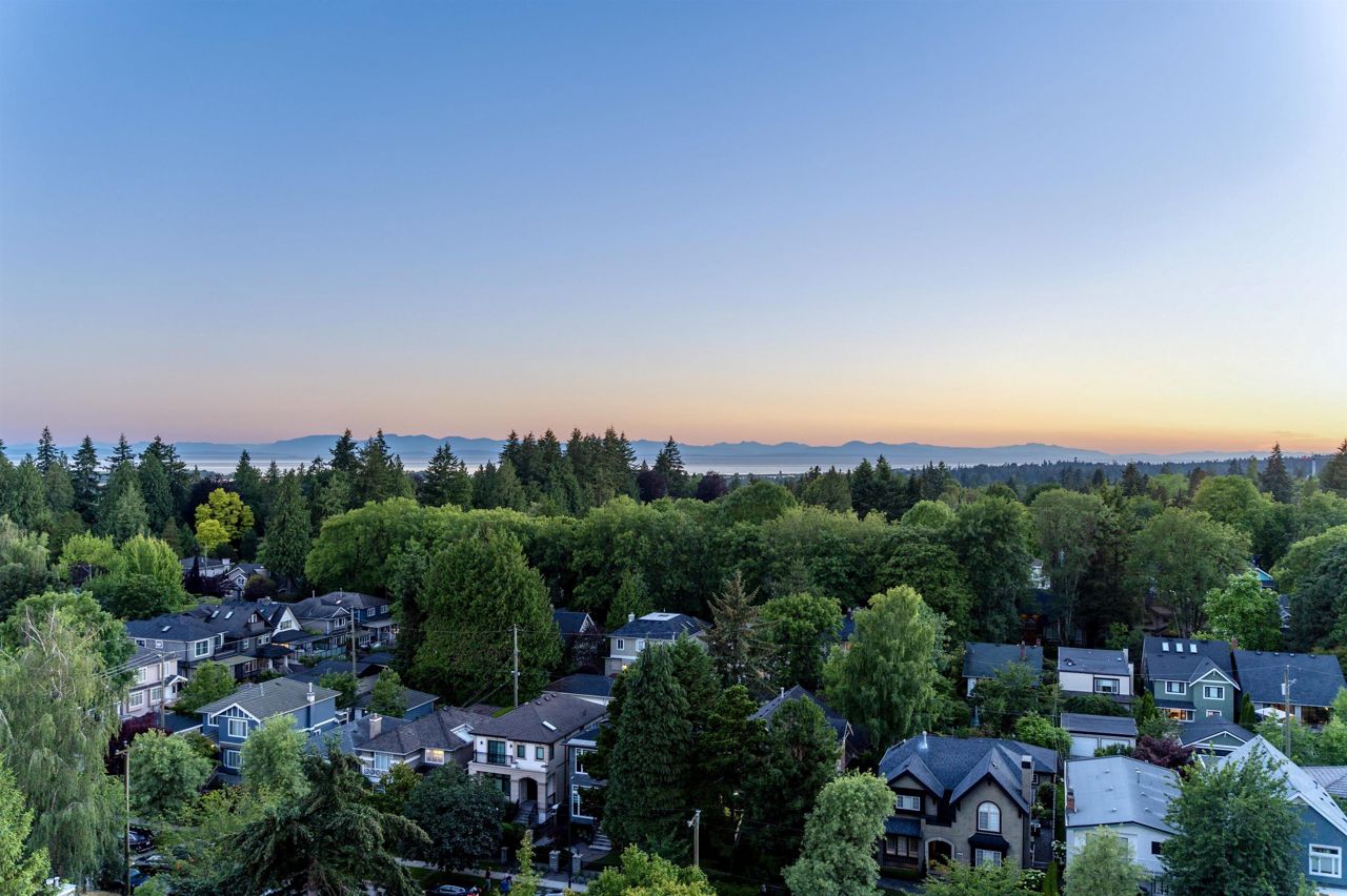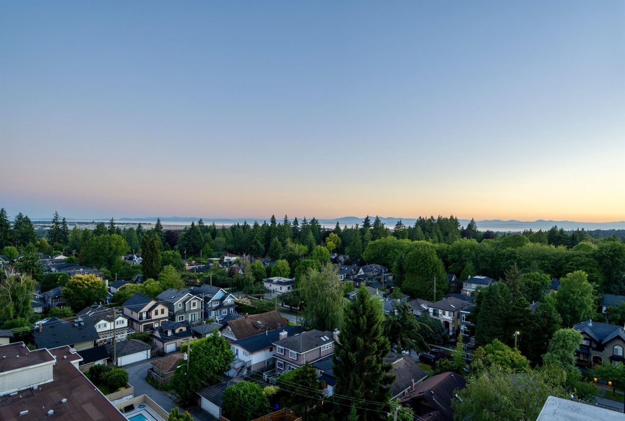 Rarely available, exquisite sub-penthouse at the luxury & exclusive 5955 Balsam, nestled serenely on a quiet, tree-lined street w/ just 41 units in total. This beautiful home is a sanctuary of unparalleled elegance. Wake up to breathtaking views of the endless ocean & majestic mountains, w/ stunning sunsets that transform the sky into a canvas of vibrant hues. 9.5' ceiling, open, airy, abundant natural light. An oversized den perfect for hosting guests or setting up your dream office. Whether you prefer a quiet evening in or entertaining family & friends in the inviting space, every moment here promises comfort & sophistication. Move-in Ready! Bonus: a private, enclosed triple garage &spacious storage locker.
