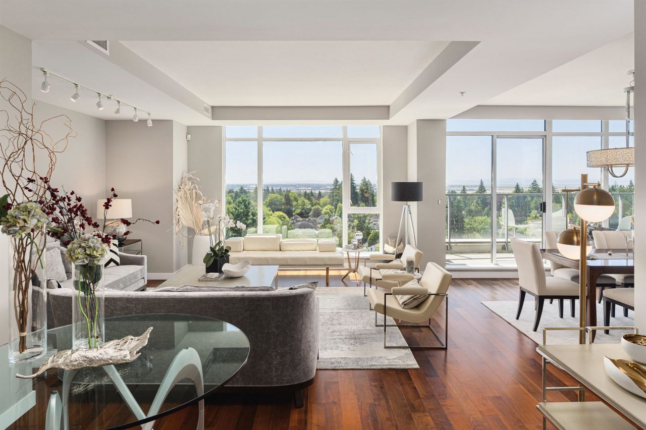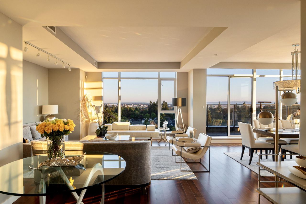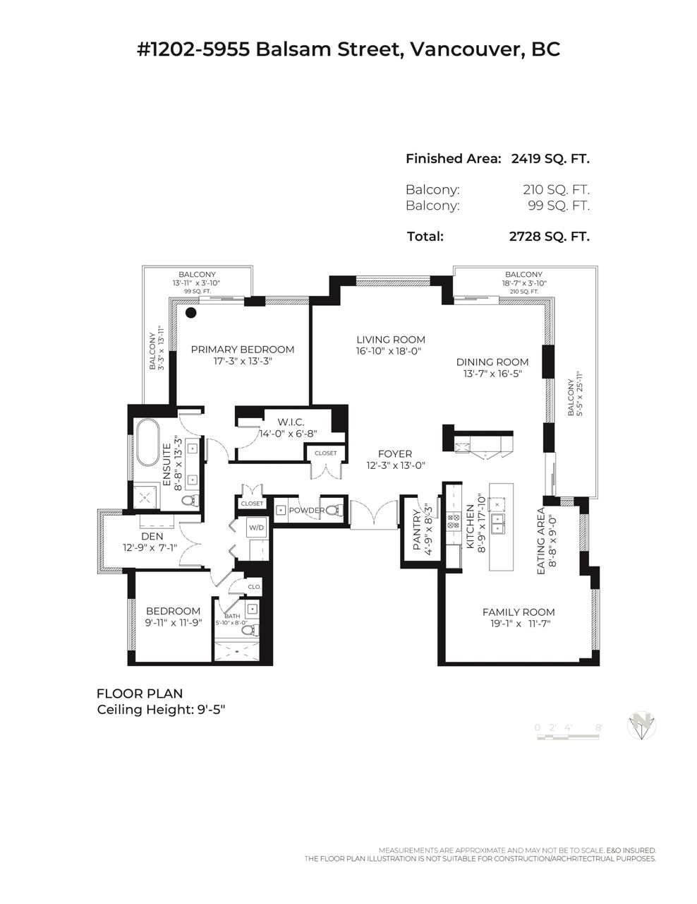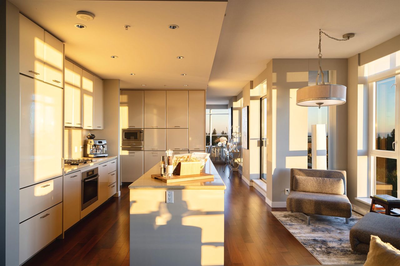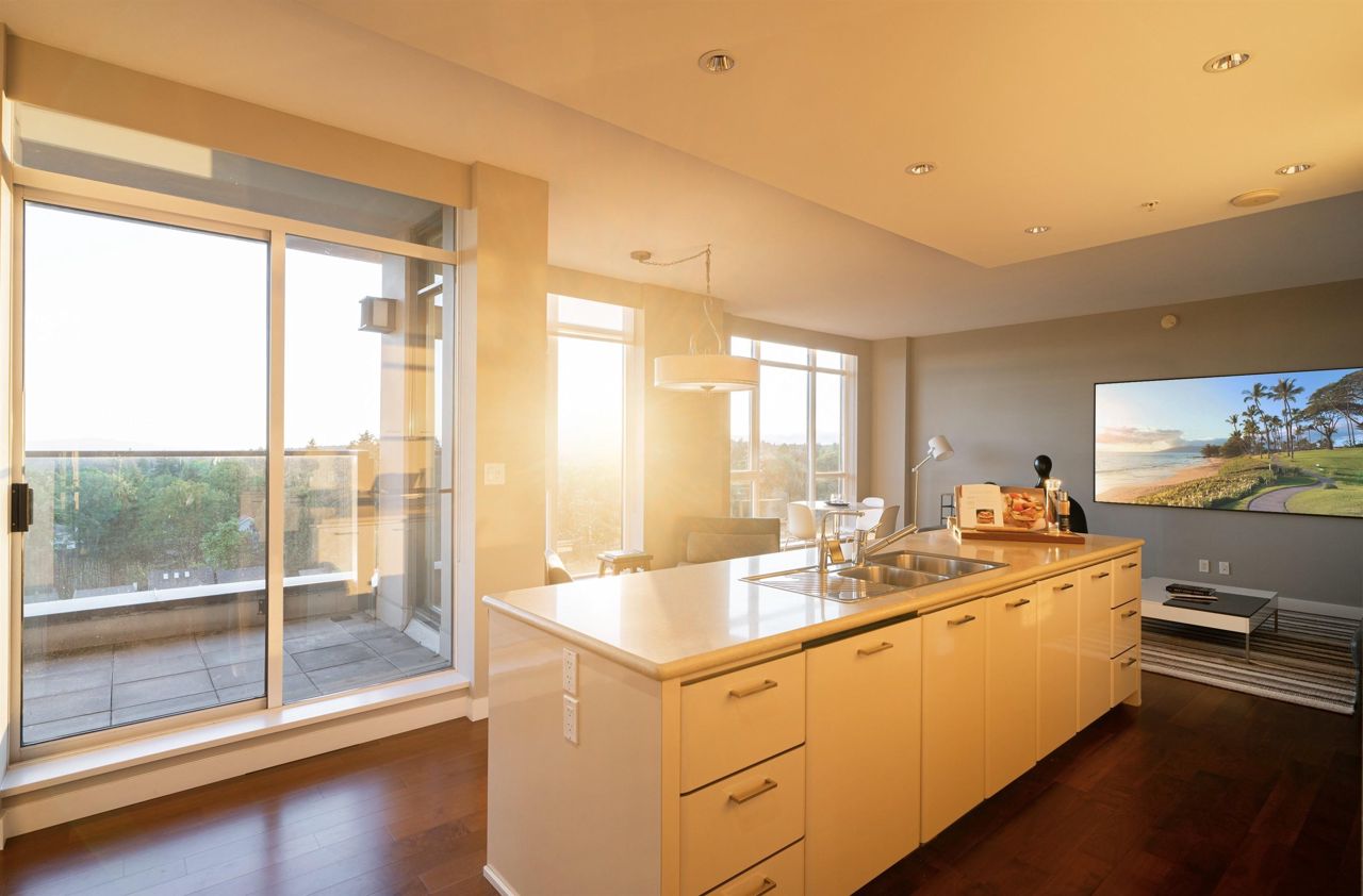 Rarely available, exquisite sub-penthouse at the luxury & exclusive 5955 Balsam, nestled serenely on a quiet, tree-lined street w/ just 41 units in total. This beautiful home is a sanctuary of unparalleled elegance. Wake up to breathtaking views of the endless ocean & majestic mountains, w/ stunning sunsets that transform the sky into a canvas of vibrant hues. 9.5' ceiling, open, airy, abundant natural light. An oversized den perfect for hosting guests or setting up your dream office. Whether you prefer a quiet evening in or entertaining family & friends in the inviting space, every moment here promises comfort & sophistication. Move-in Ready! Bonus: a private, enclosed triple garage &spacious storage locker.