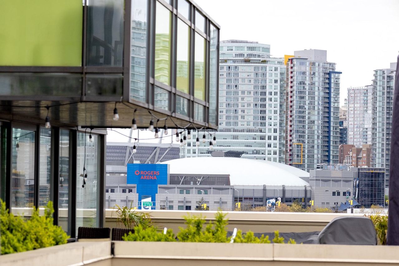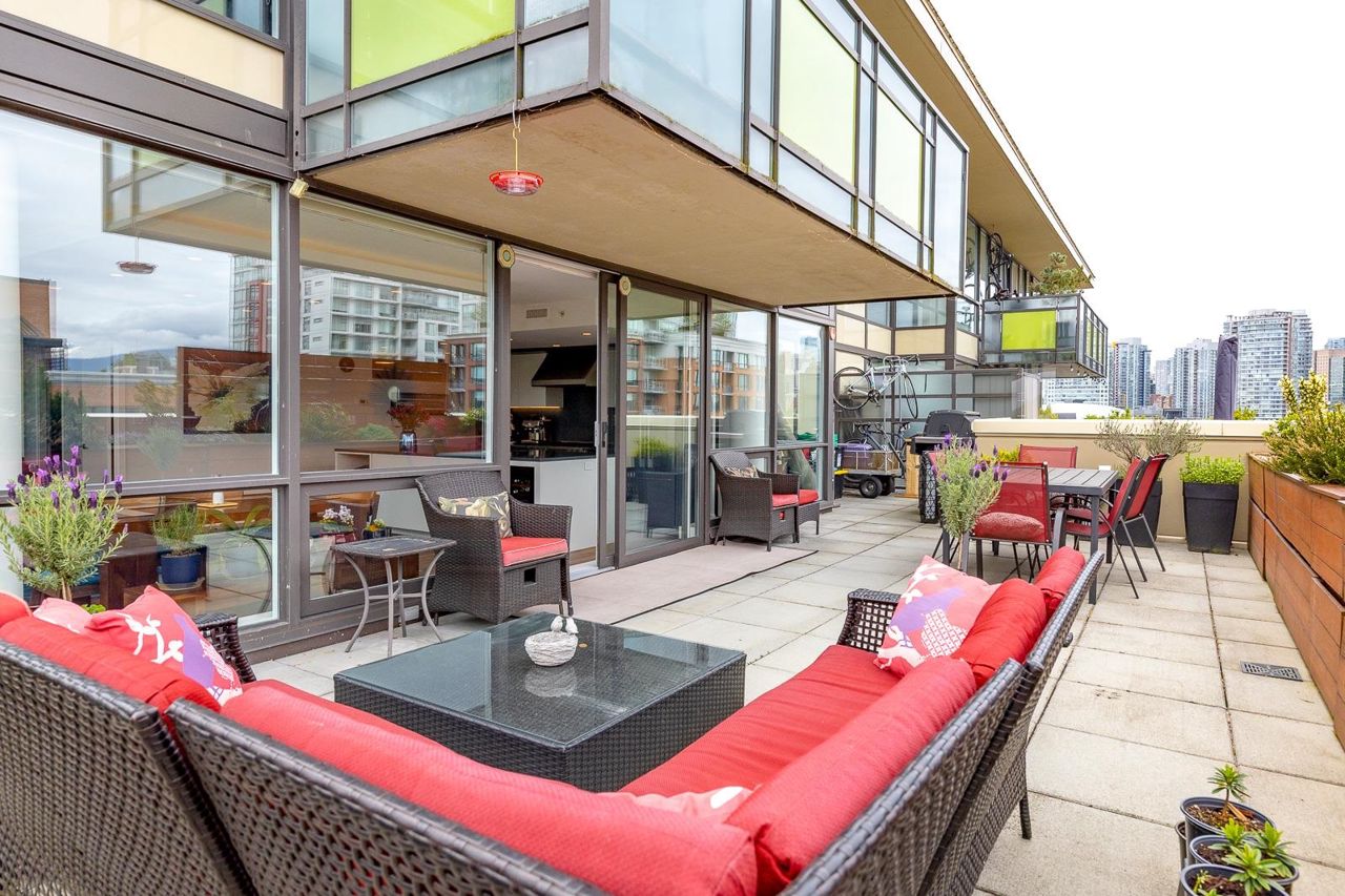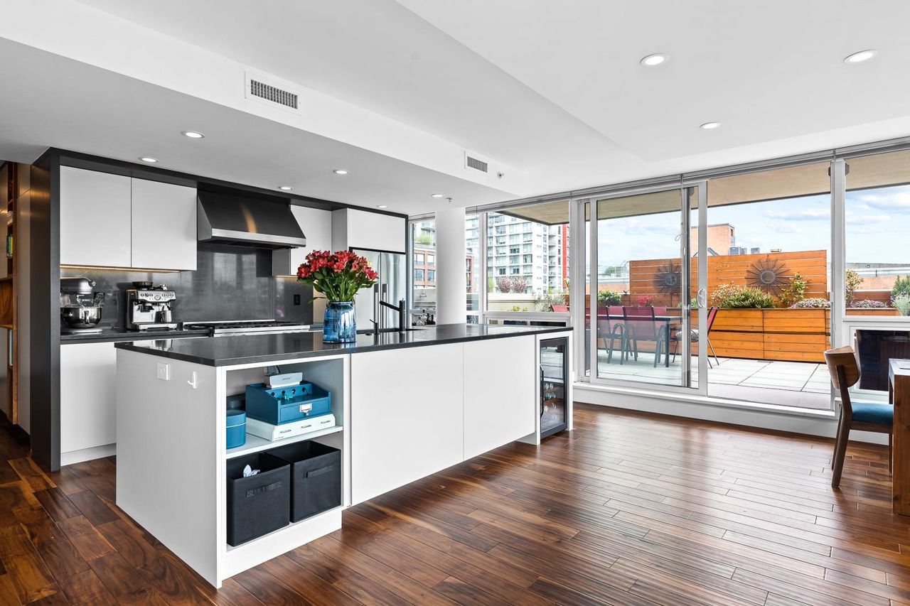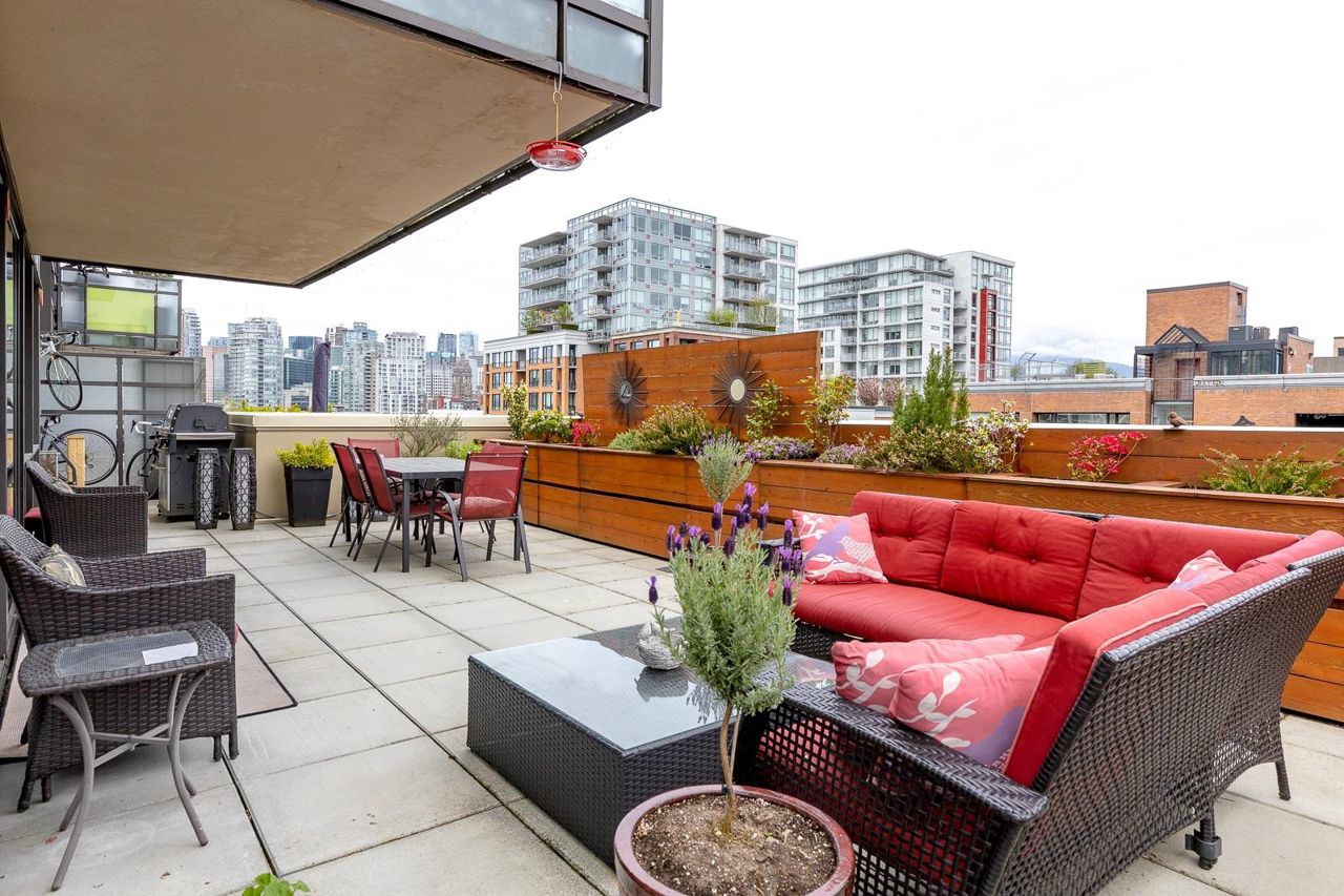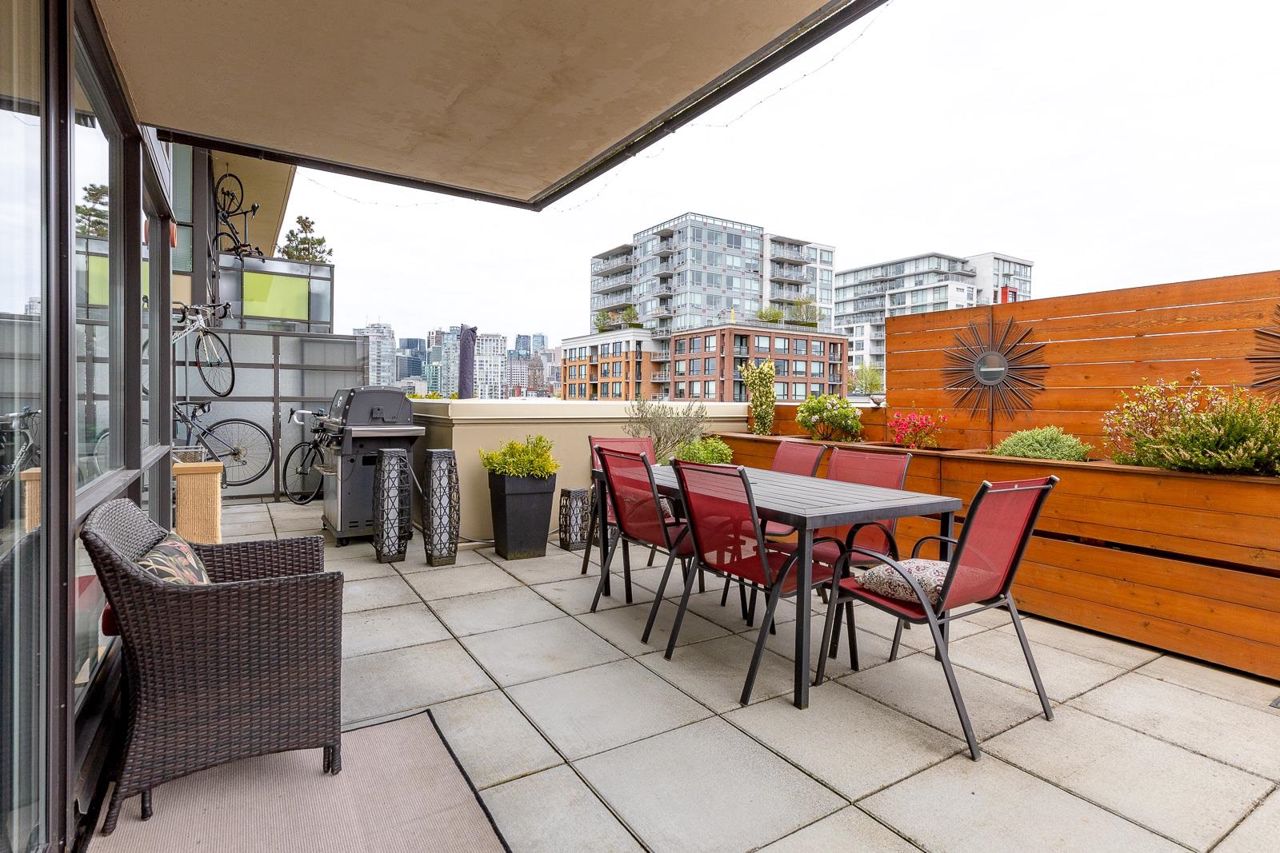 Looking for outdoor space? This extraordinary 905 square foot wrap around Terrace is sure to please. Spacious N.E. corner unit features A/C and many updates: Modern kitchen with quality appliances including Miele 6 burner gas stove and large island with built in cabinets. Drop ceiling with pot lighting, flooring, stylish functional custom cabinets in the hallway. Other features include views of the city and north shore mountains, generous size storage/laundry room with full size washer/dryer, primary bedroom with walk in closet, 2nd bedroom complete with murphy bed, 2 outdoor gas hook ups. Lots of natural light. Minutes to Seawall, Gastown, Olympic Village, Yaletown, Main St. transit and all the trendy restaurants and amenities this location has to offer. Quick possession available.