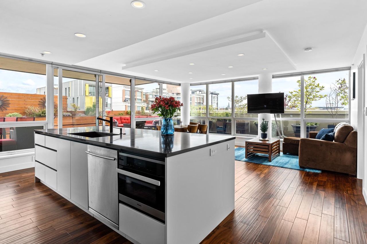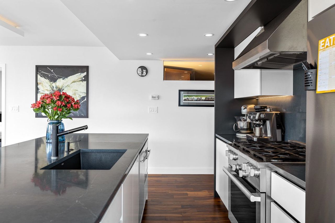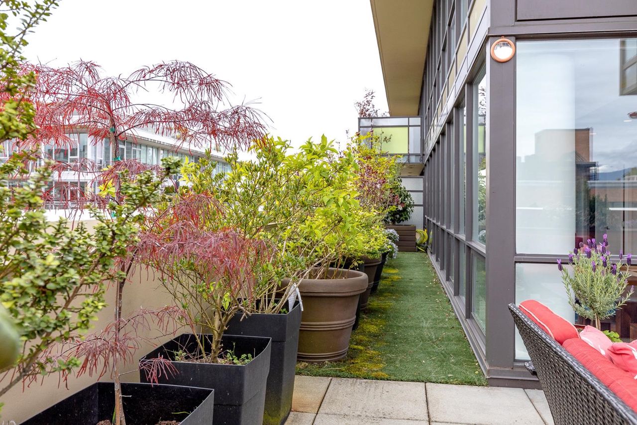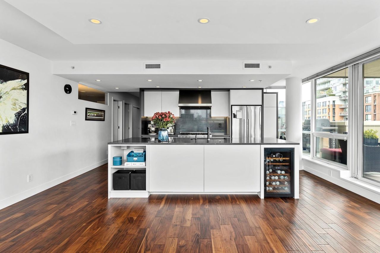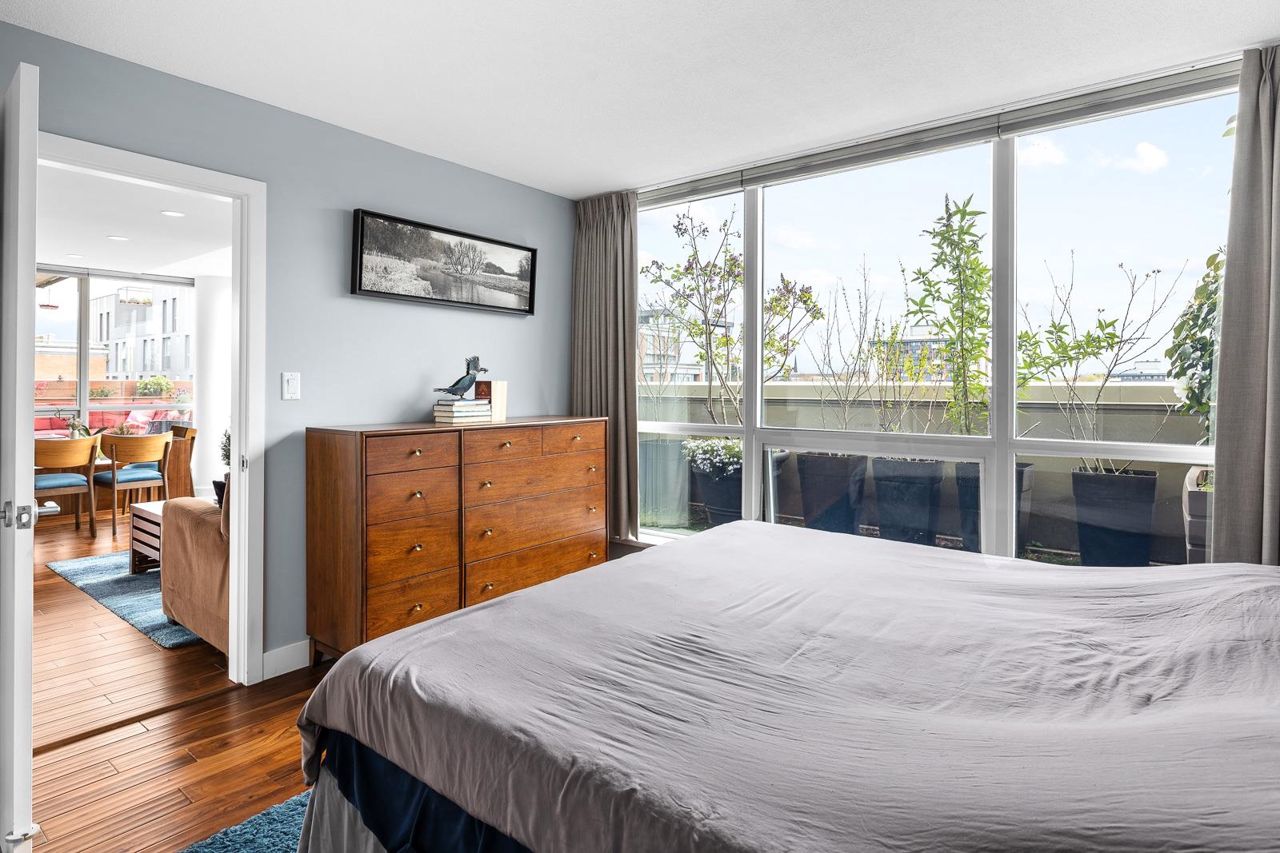 Looking for outdoor space? This extraordinary 905 square foot wrap around Terrace is sure to please. Spacious N.E. corner unit features A/C and many updates: Modern kitchen with quality appliances including Miele 6 burner gas stove and large island with built in cabinets. Drop ceiling with pot lighting, flooring, stylish functional custom cabinets in the hallway. Other features include views of the city and north shore mountains, generous size storage/laundry room with full size washer/dryer, primary bedroom with walk in closet, 2nd bedroom complete with murphy bed, 2 outdoor gas hook ups. Lots of natural light. Minutes to Seawall, Gastown, Olympic Village, Yaletown, Main St. transit and all the trendy restaurants and amenities this location has to offer. Quick possession available.