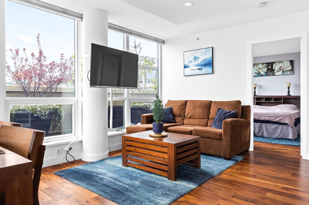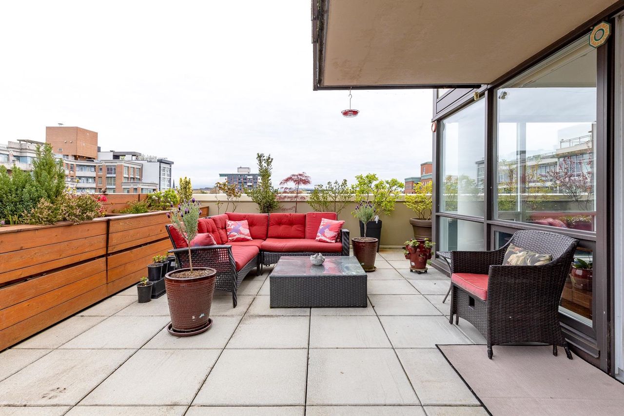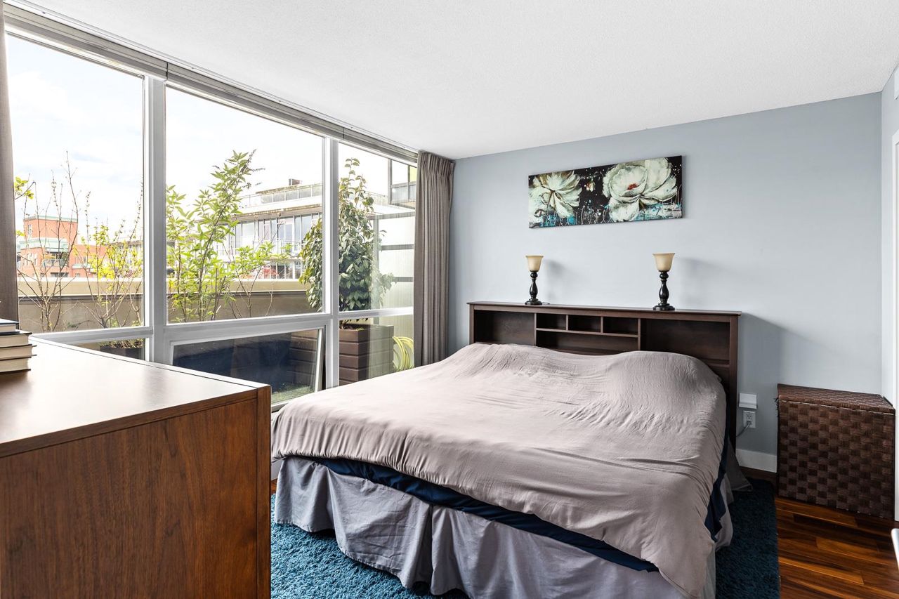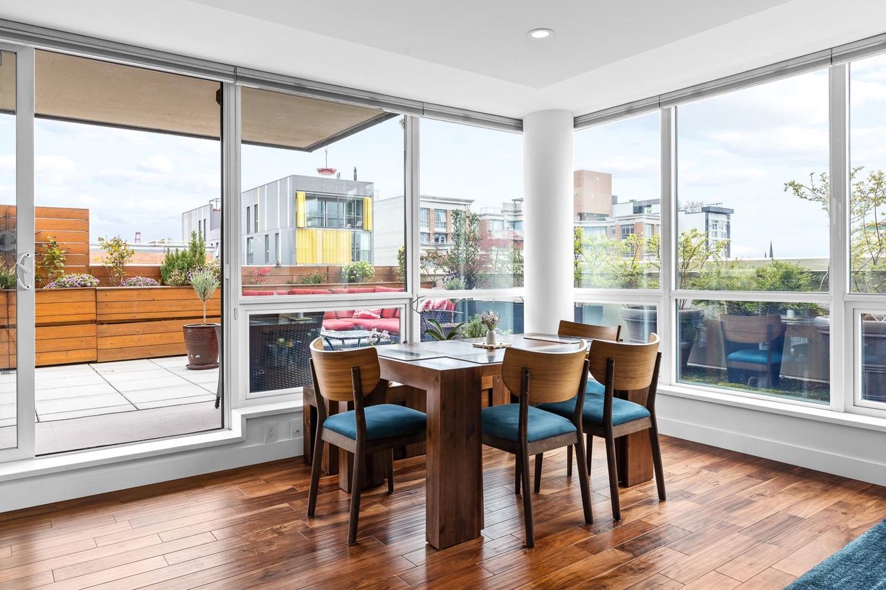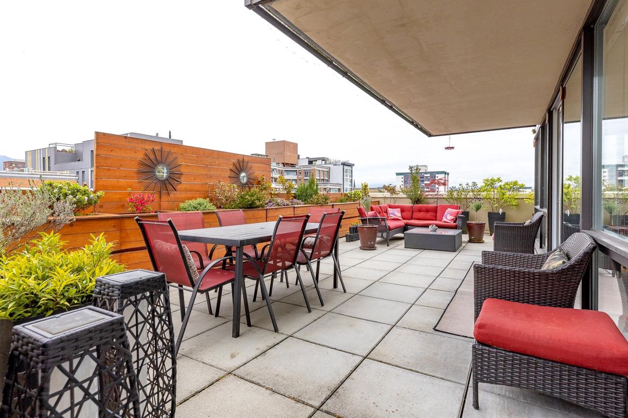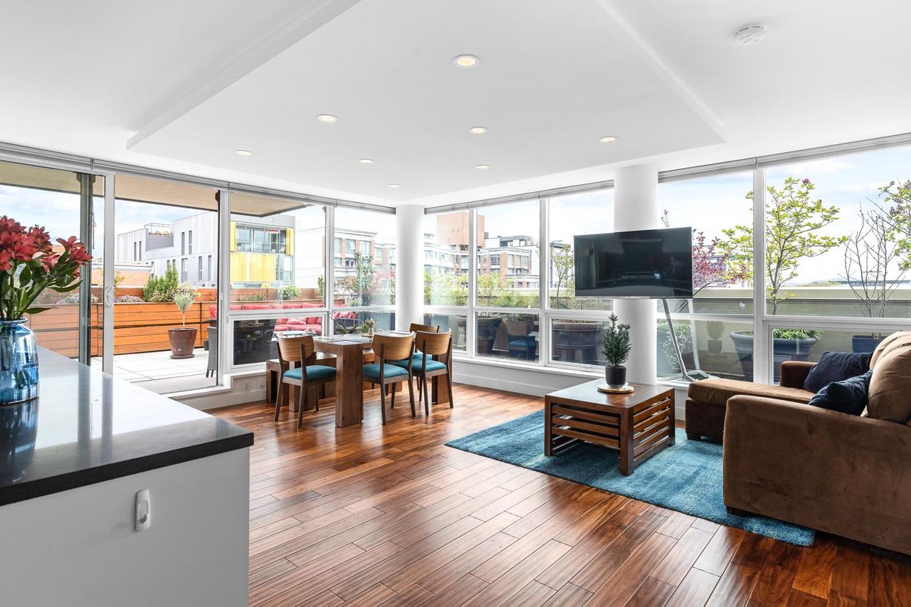 Looking for outdoor space? This extraordinary 905 square foot wrap around Terrace is sure to please. Spacious N.E. corner unit features A/C and many updates: Modern kitchen with quality appliances including Miele 6 burner gas stove and large island with built in cabinets. Drop ceiling with pot lighting, flooring, stylish functional custom cabinets in the hallway. Other features include views of the city and north shore mountains, generous size storage/laundry room with full size washer/dryer, primary bedroom with walk in closet, 2nd bedroom complete with murphy bed, 2 outdoor gas hook ups. Lots of natural light. Minutes to Seawall, Gastown, Olympic Village, Yaletown, Main St. transit and all the trendy restaurants and amenities this location has to offer. Quick possession available.