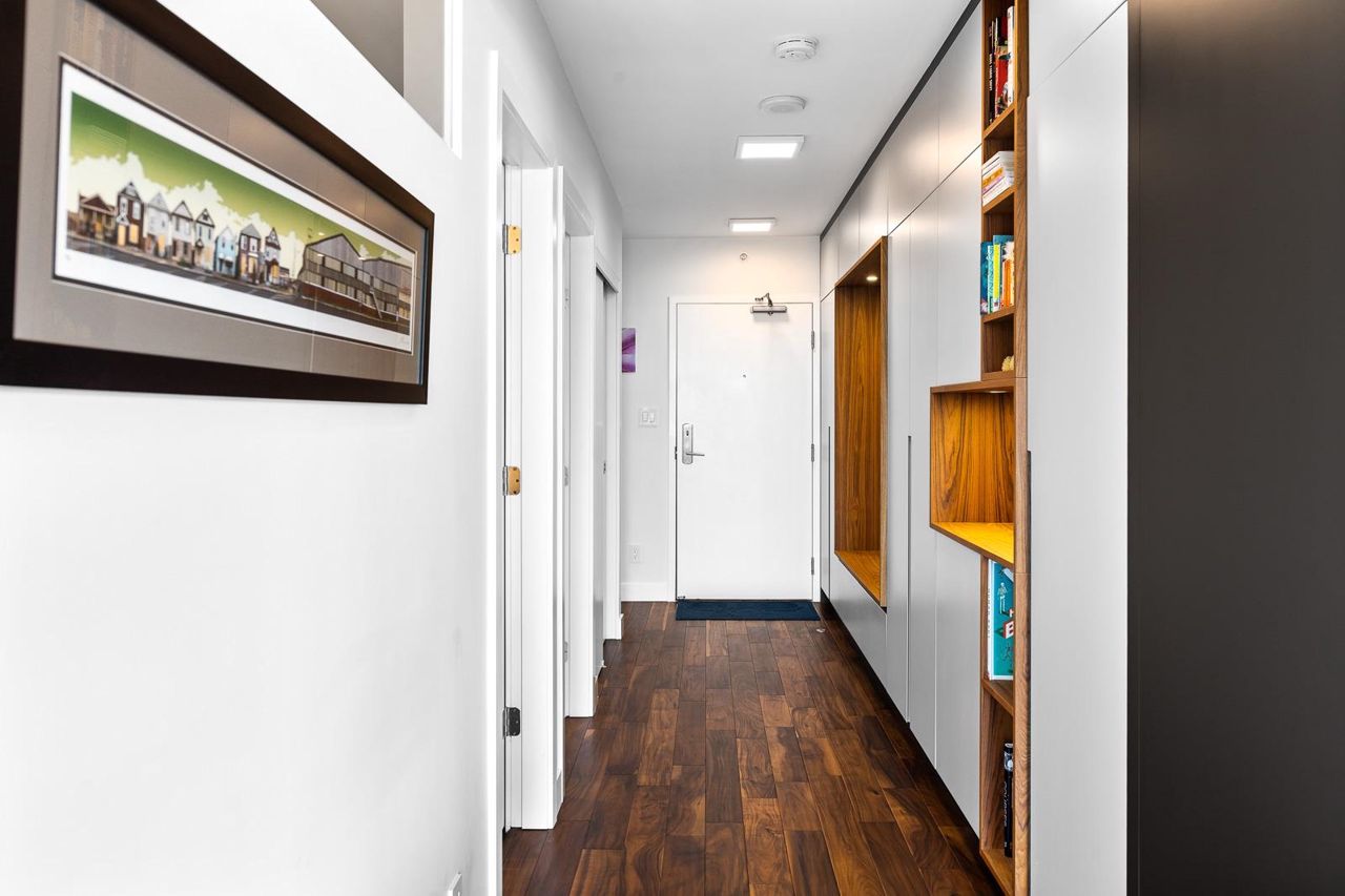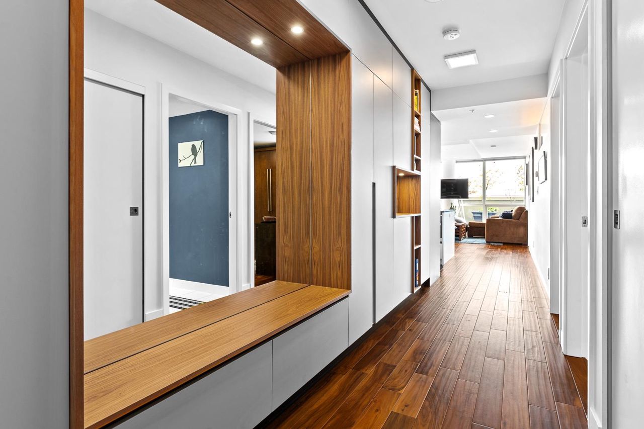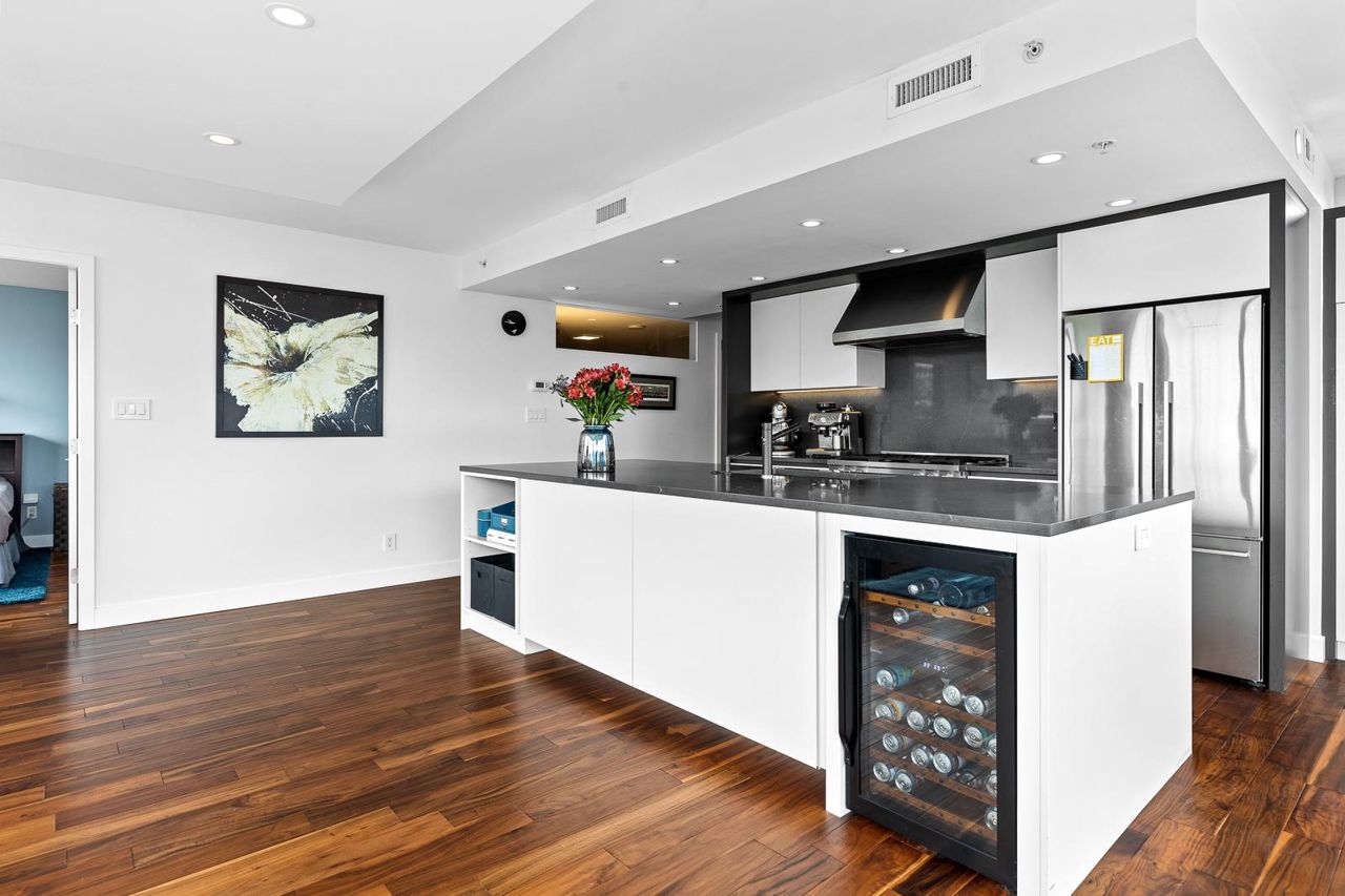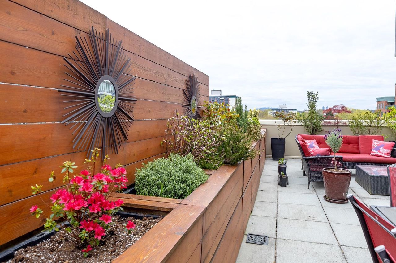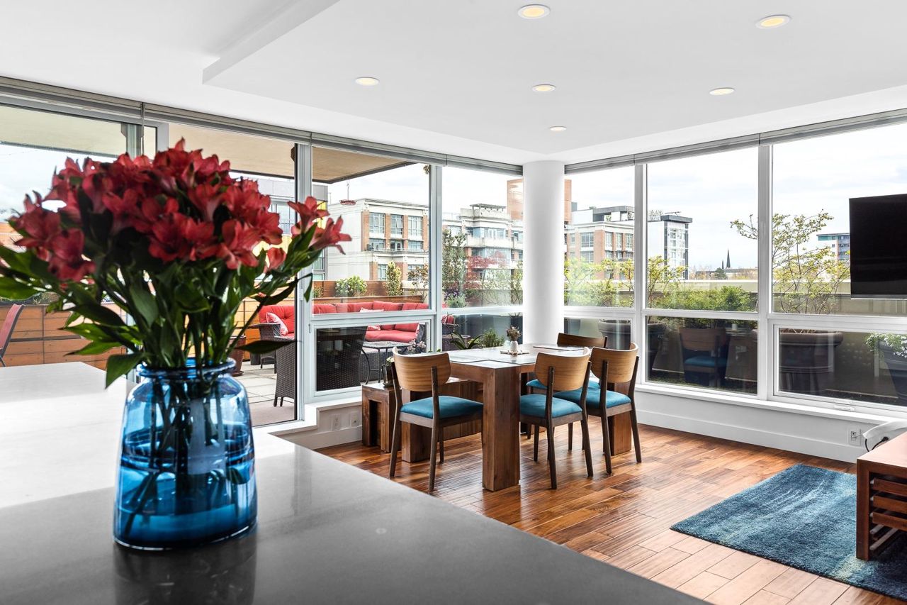 Looking for outdoor space? This extraordinary 905 square foot wrap around Terrace is sure to please. Spacious N.E. corner unit features A/C and many updates: Modern kitchen with quality appliances including Miele 6 burner gas stove and large island with built in cabinets. Drop ceiling with pot lighting, flooring, stylish functional custom cabinets in the hallway. Other features include views of the city and north shore mountains, generous size storage/laundry room with full size washer/dryer, primary bedroom with walk in closet, 2nd bedroom complete with murphy bed, 2 outdoor gas hook ups. Lots of natural light. Minutes to Seawall, Gastown, Olympic Village, Yaletown, Main St. transit and all the trendy restaurants and amenities this location has to offer. Quick possession available.