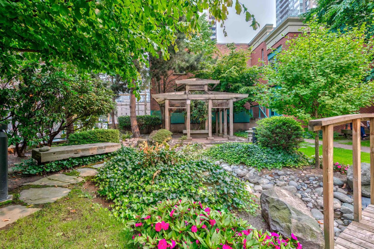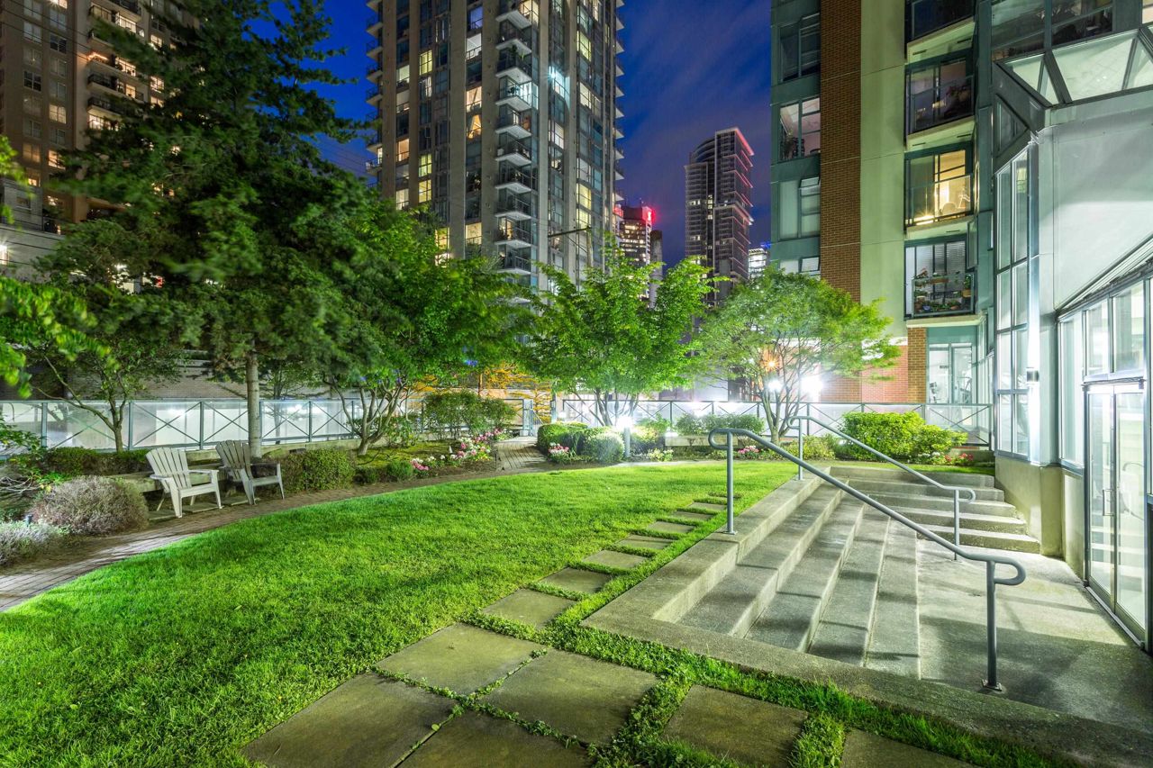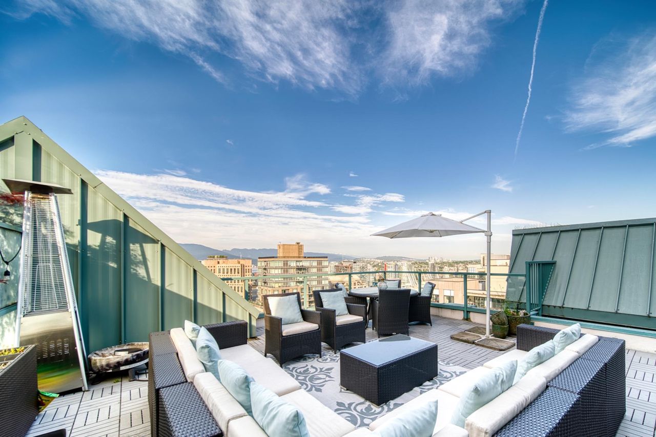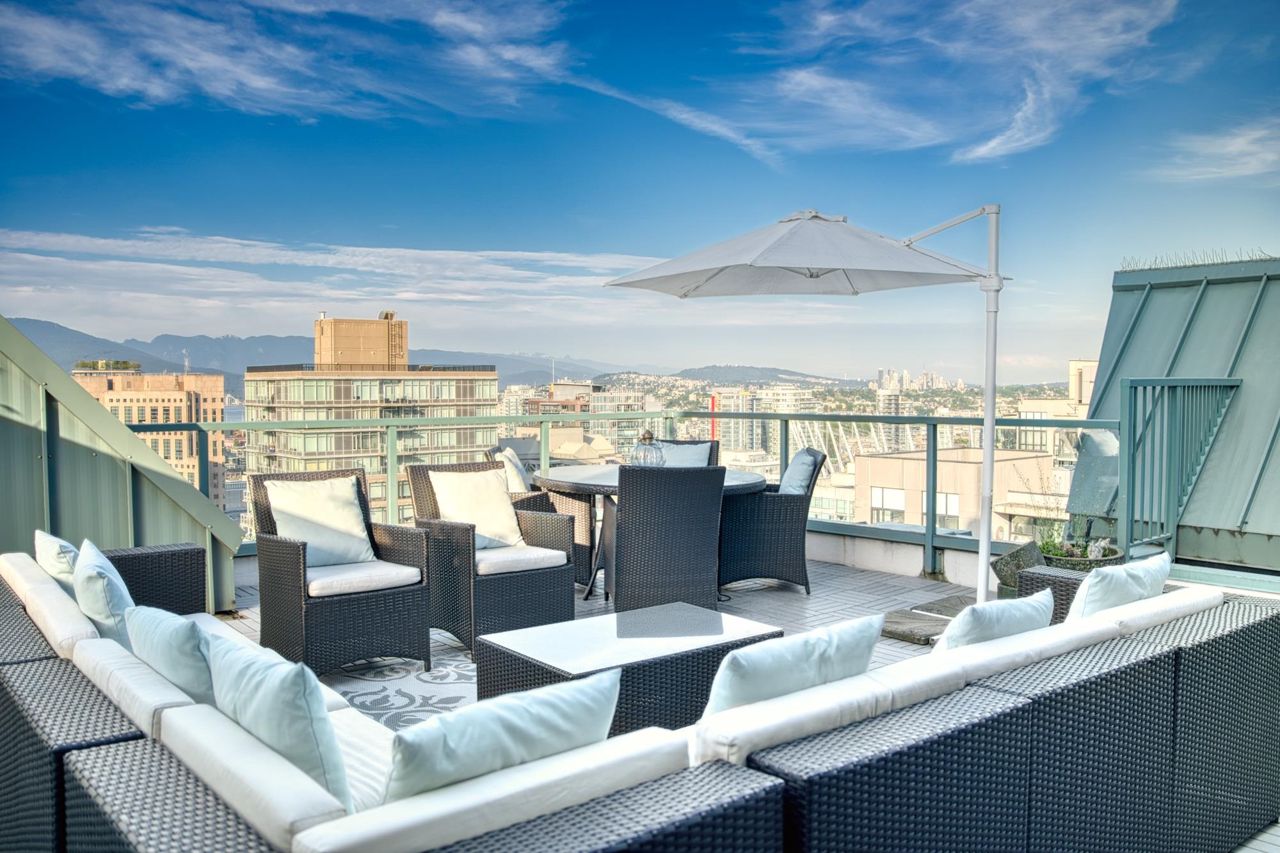 PENTHOUSE at The Pinnacle. This two-bed/bath features new engineered hardwood flooring, stainless appliances, washer/dryer, and new paint, fixtures & blinds throughout. Bright and spacious with vaulted ceilings, lots of storage and large master walk-in closet. Large balcony off the living room, plus your own private rooftop patio (~500 sq ft) with sweeping views of False Creek, the city, and the mountains. The outdoor space is ready to be made your own -- a perfect urban setting for entertaining or to set up an oasis in the city. 24 hour concierge, gym, indoor pool, hot tub, steam room/sauna, Japanese garden, guest suite, library, games room, visitor’s parking and active strata. Pets & rentals welcome. Two parking included.