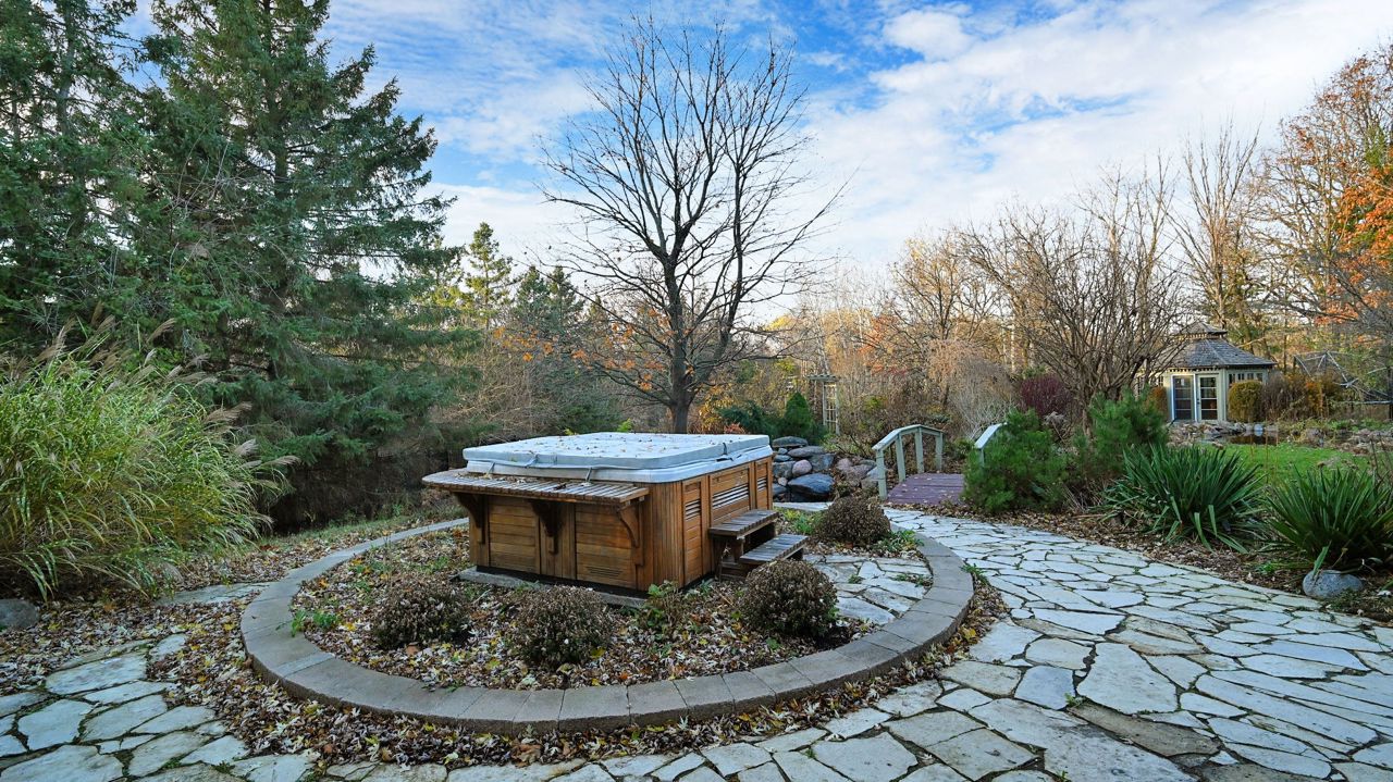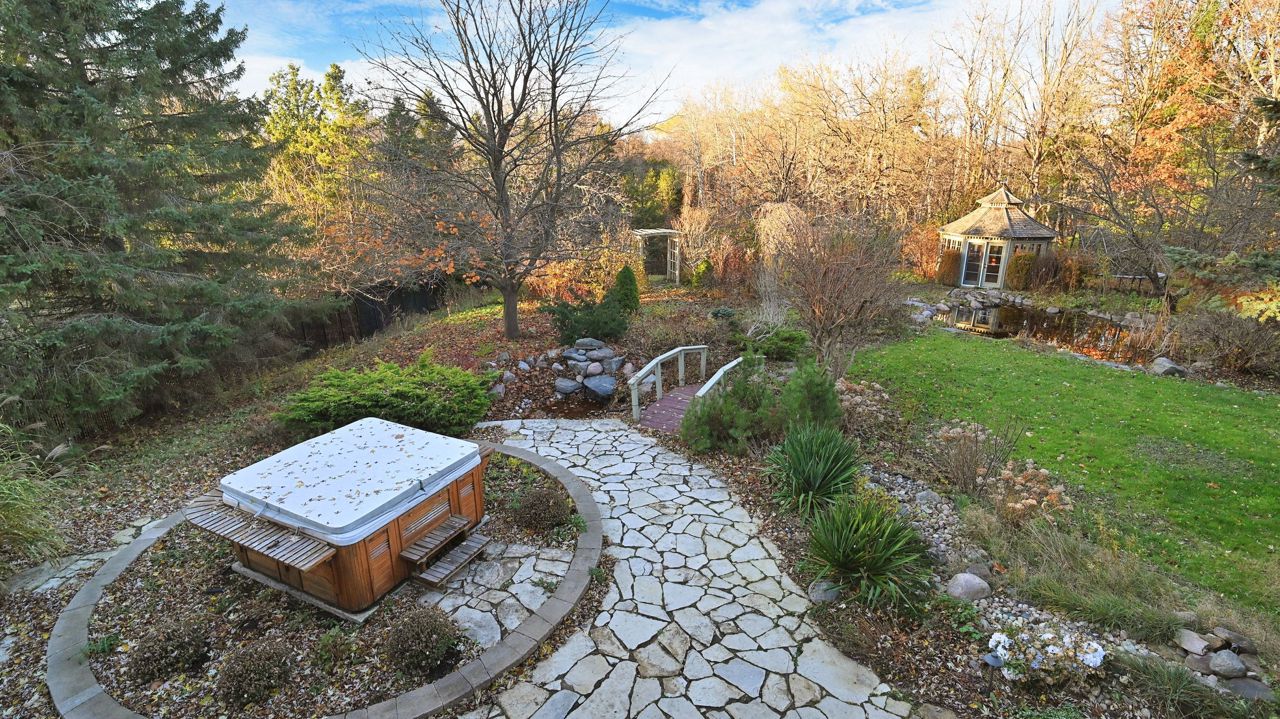 Exterior FeaturesHot Tub,Landscaped,Private Pond,Awnings,Landscape Lighting,Lawn Sprinkler System,Lighting,Patio,Privacy