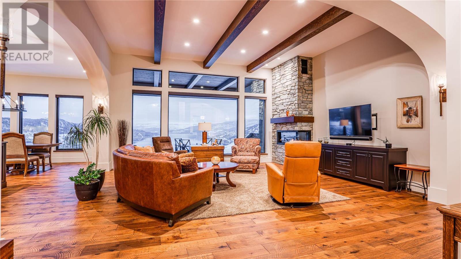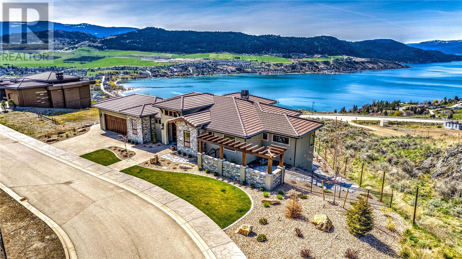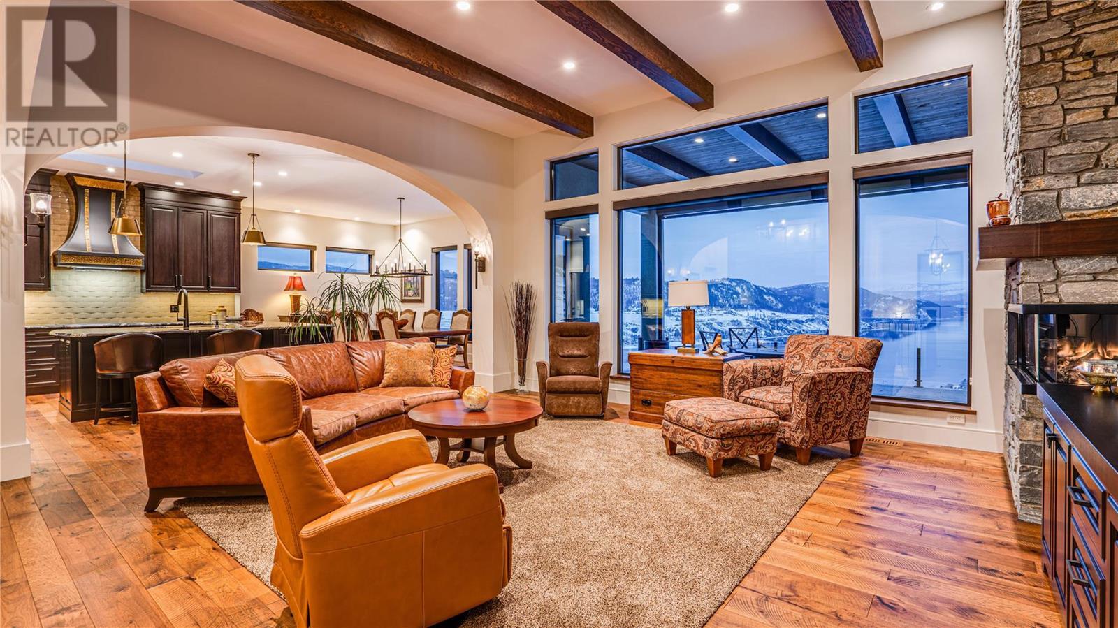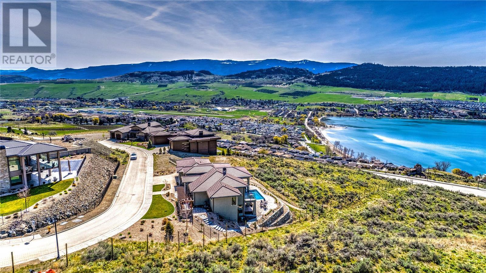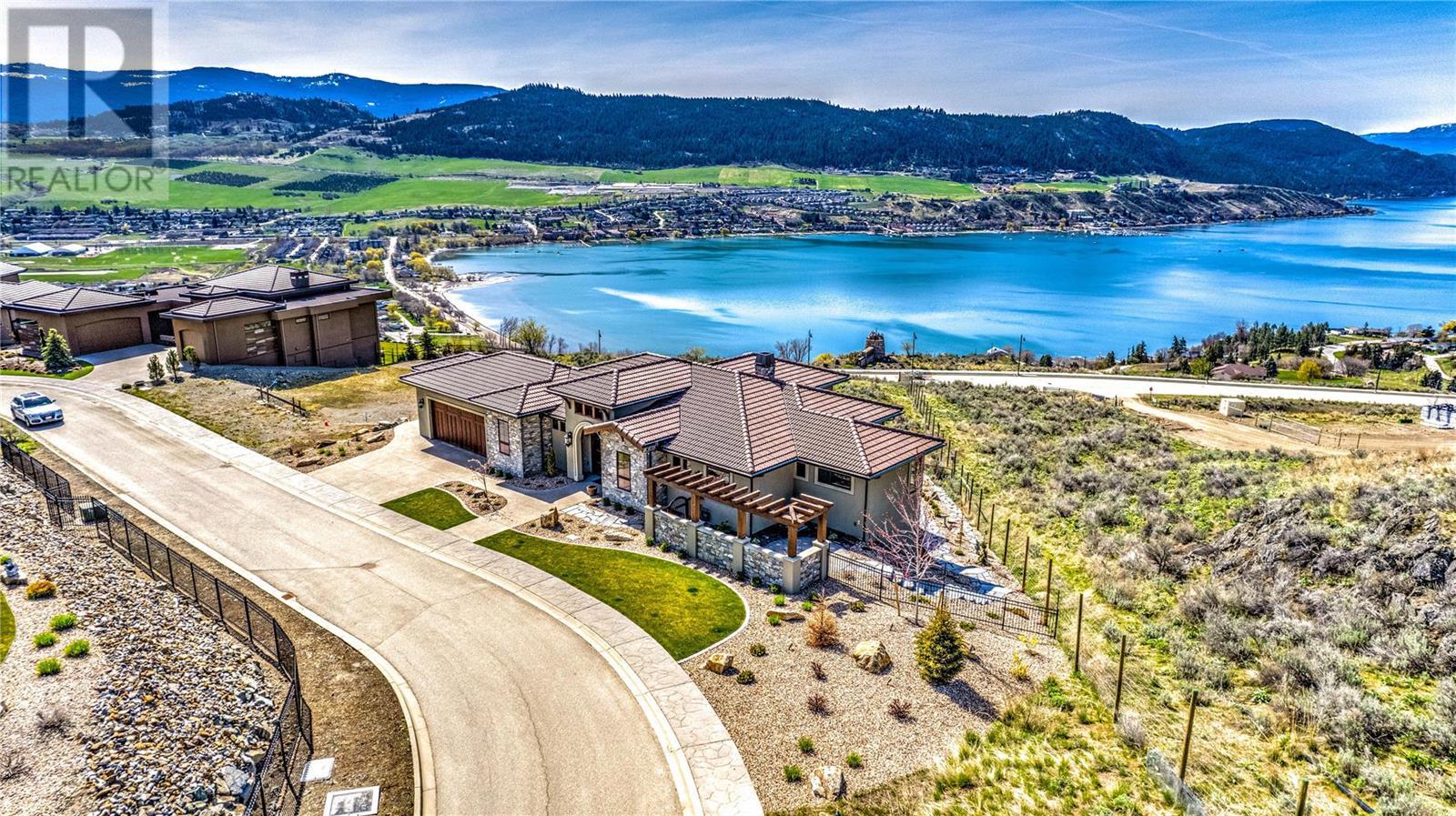 Perched above Okanagan Lake, with breathtaking unobstructed views awaits this spectacular property within a gated community that prioritizes both indoor and outdoor living and entertaining. Inside, a large open-concept layout awaits with exposed beams and natural hickory hardwood flooring. A gourmet kitchen with state-of-the-art appliances with custom made cabinetry stands adjacent to the living area with handsome natural stone-faced gas fireplace. Doors from this area lead directly out to the upper deck, ideal for seamless grill parties and al fresco dining. A main floor master suite comes complete with his and hers walk-in closets and spa-like ensuite bathroom with-in floor heating, soaker tub, walk-in glass shower and under counter motion activated lighting. Further extras on this level, include a two-piece powder room, large laundry room with great storage and a mudroom which doubles as a butler’s pantry. The lower level boasts a massive family room, complete with free standing gas fireplace, wet bar with drawer dishwasher and wine fridge. From this space, access the covered patio with sunken hot tub and impressive inground salt-water pool. Three additional bedrooms on this level combined with a bonus room and full bathroom with sauna to offer space for larger families and guests. Located within The Watermark at The Rise, this fabulous property offers access to incredible amenities for the golf enthusiast. (id:22211)