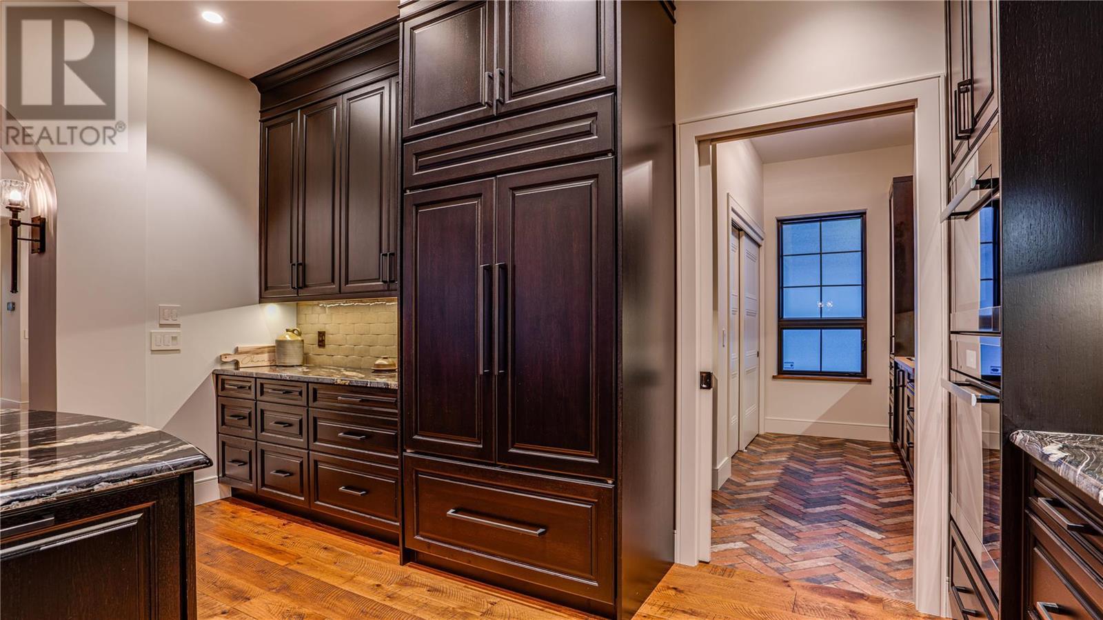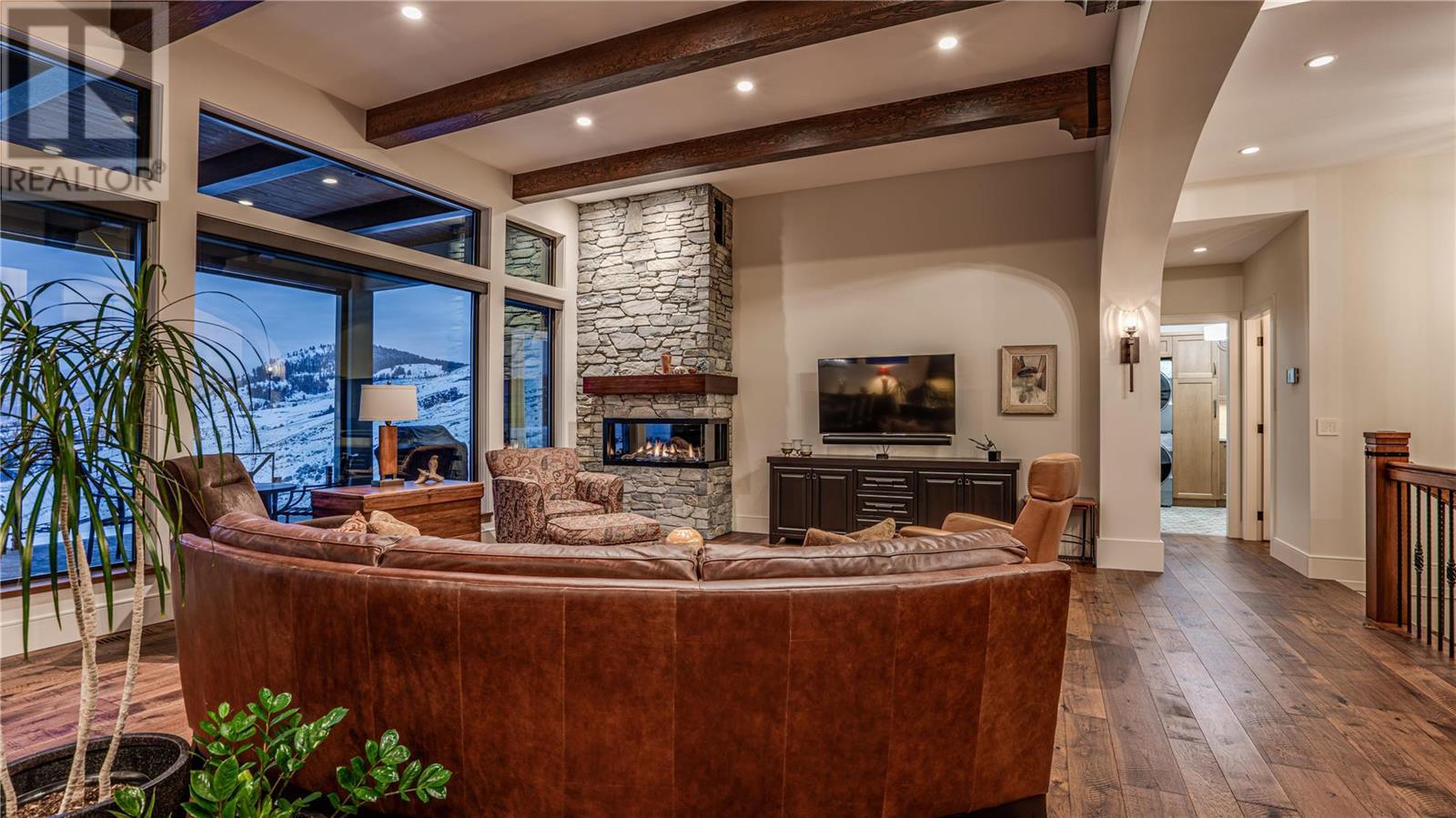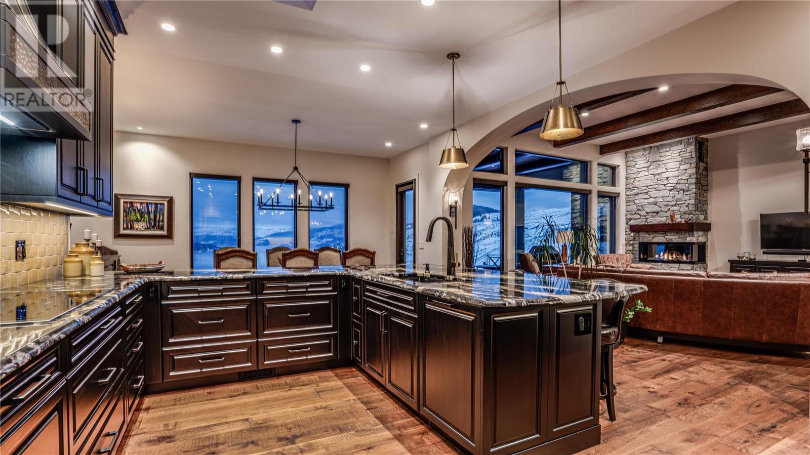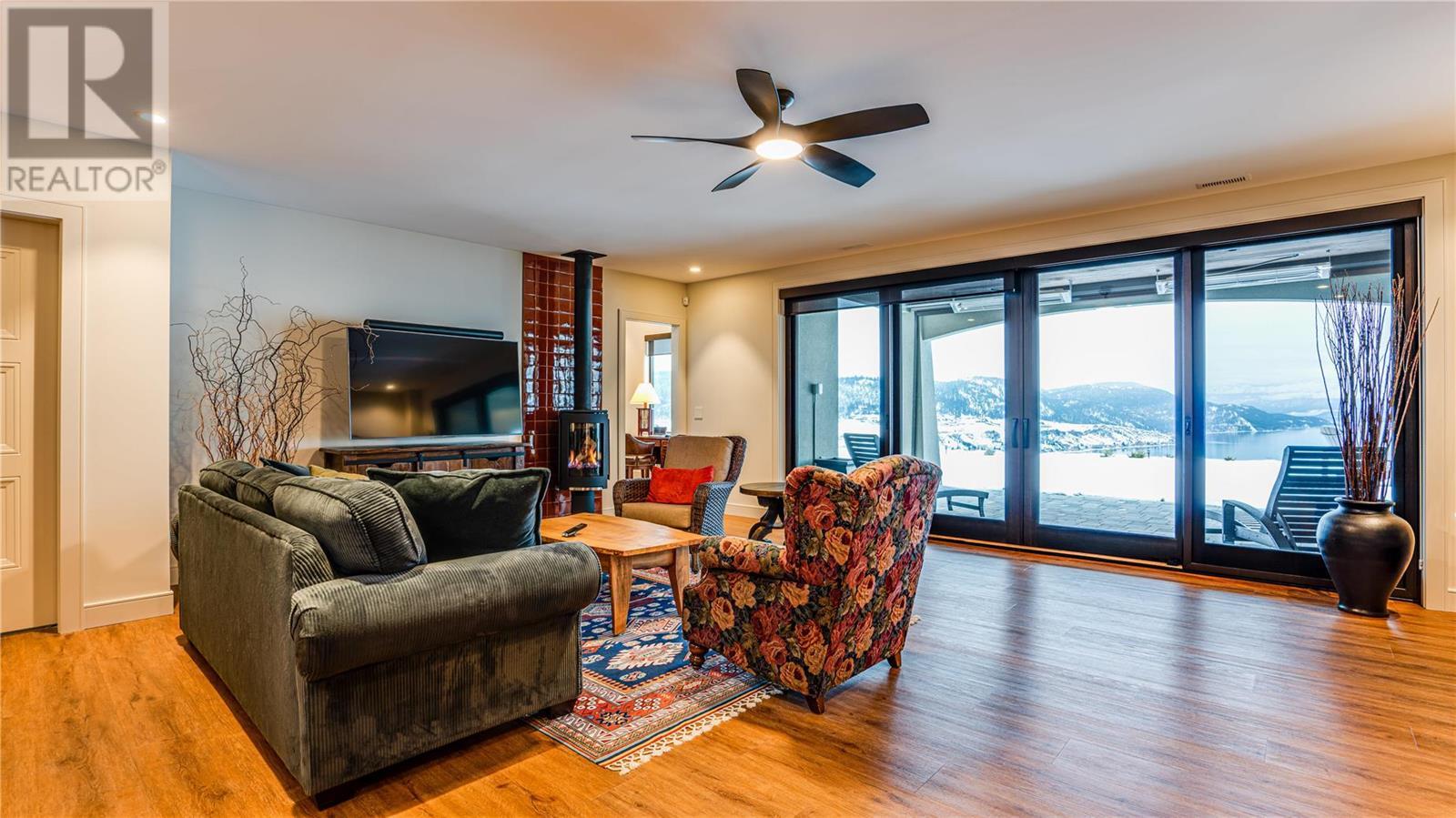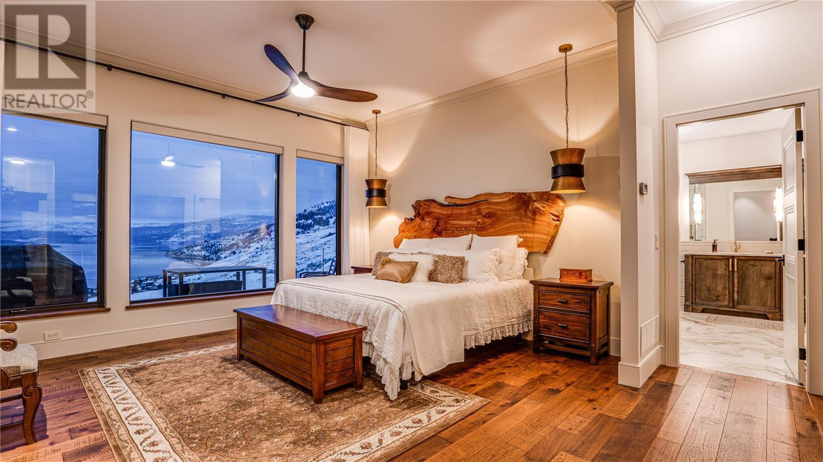 Perched above Okanagan Lake, with breathtaking unobstructed views awaits this spectacular property within a gated community that prioritizes both indoor and outdoor living and entertaining. Inside, a large open-concept layout awaits with exposed beams and natural hickory hardwood flooring. A gourmet kitchen with state-of-the-art appliances with custom made cabinetry stands adjacent to the living area with handsome natural stone-faced gas fireplace. Doors from this area lead directly out to the upper deck, ideal for seamless grill parties and al fresco dining. A main floor master suite comes complete with his and hers walk-in closets and spa-like ensuite bathroom with-in floor heating, soaker tub, walk-in glass shower and under counter motion activated lighting. Further extras on this level, include a two-piece powder room, large laundry room with great storage and a mudroom which doubles as a butler’s pantry. The lower level boasts a massive family room, complete with free standing gas fireplace, wet bar with drawer dishwasher and wine fridge. From this space, access the covered patio with sunken hot tub and impressive inground salt-water pool. Three additional bedrooms on this level combined with a bonus room and full bathroom with sauna to offer space for larger families and guests. Located within The Watermark at The Rise, this fabulous property offers access to incredible amenities for the golf enthusiast. (id:22211)