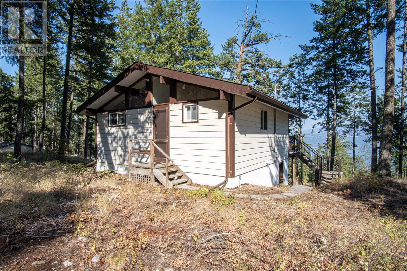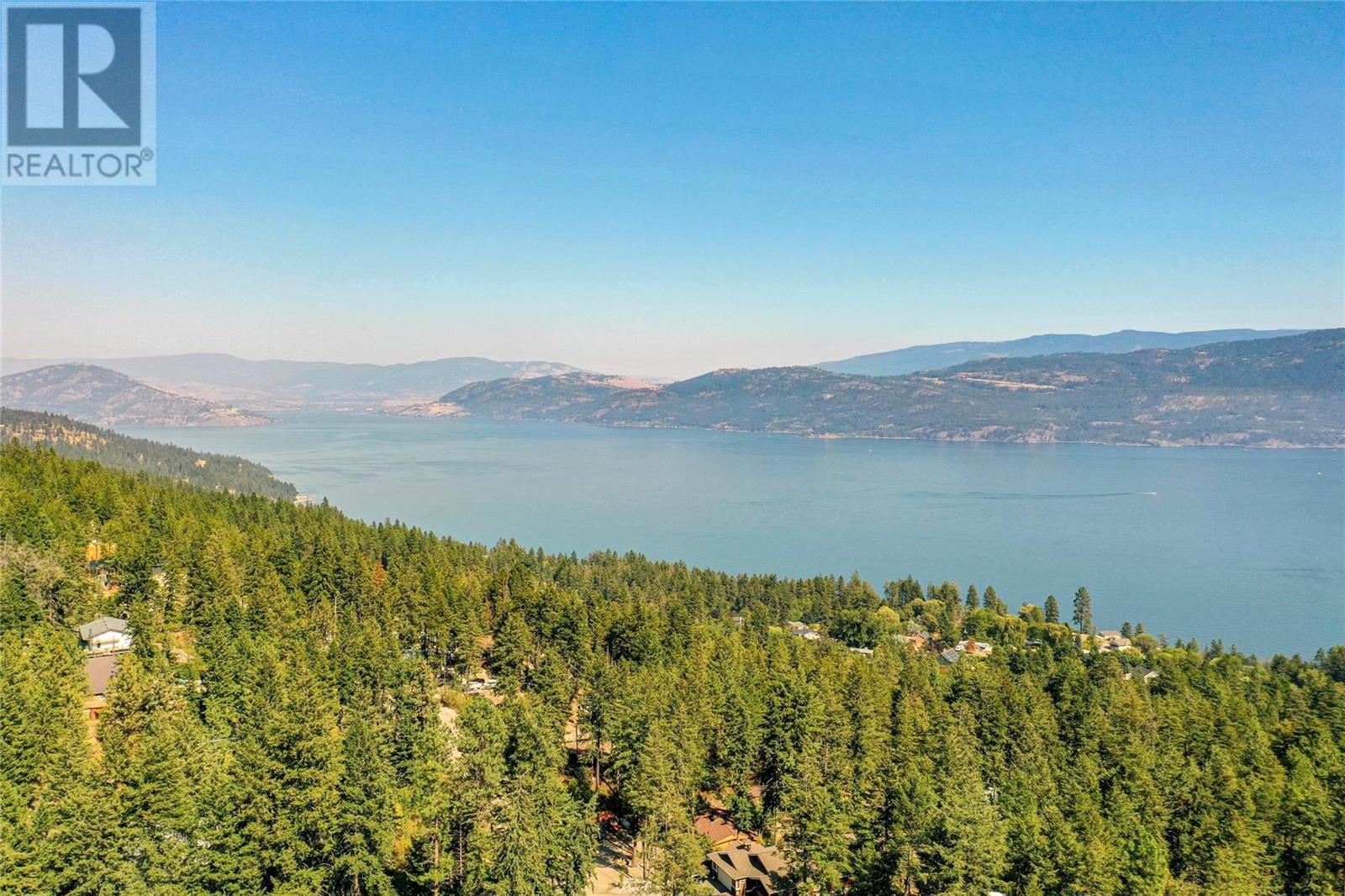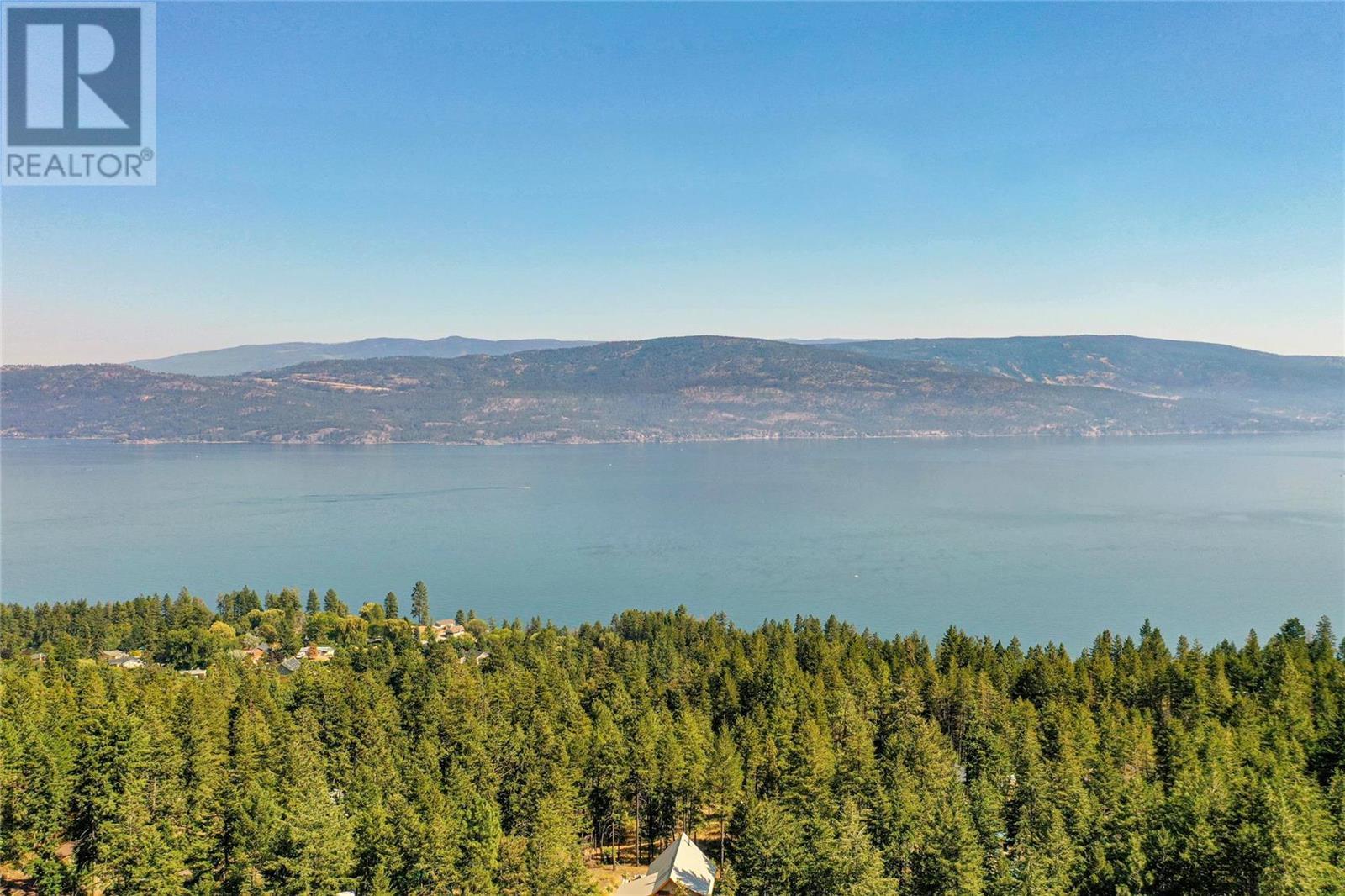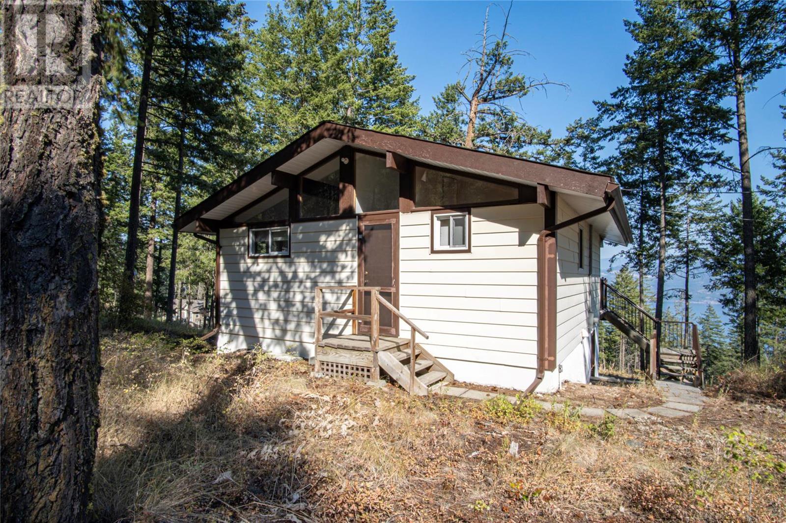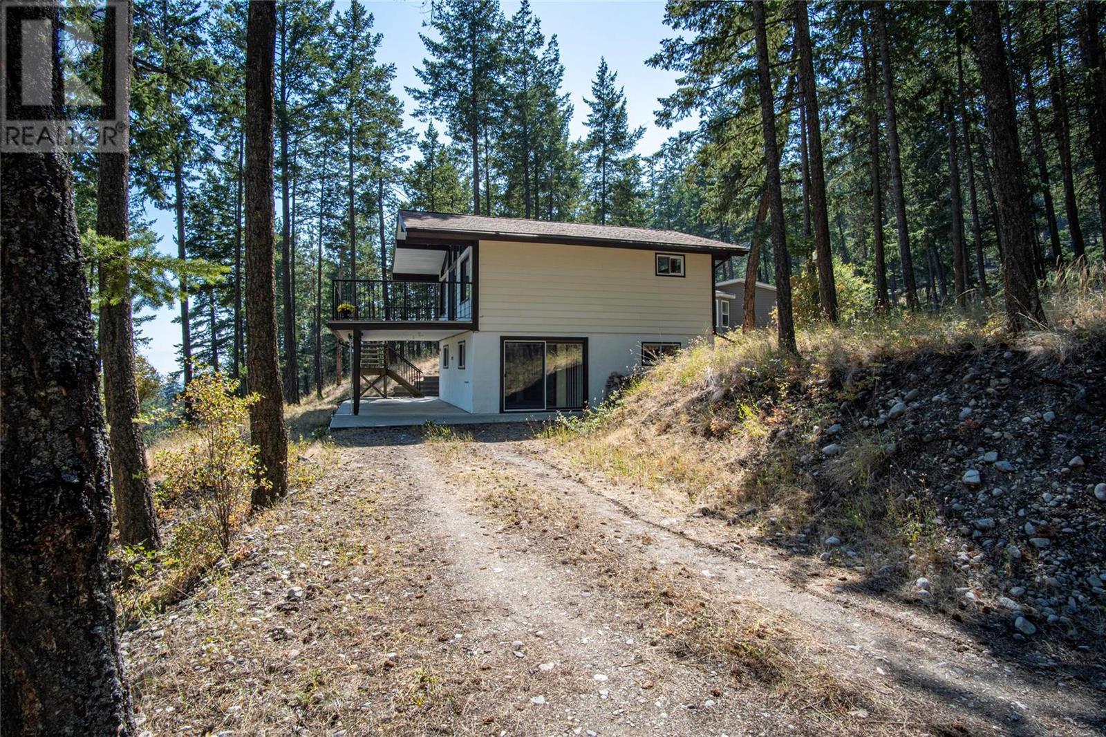 Nestled in a peaceful, park-like setting and surrounded by stately tree growth, this serene retreat boasts floor to vaulted ceiling windows and an open-concept layout that brings the outside in and showcases incredible Lake and Mountain views. Minutes from three separate boat launches, crown land, and numerous trail systems, the property would make an ideal second home for the recreational enthusiast. On the main floor, a light-filled living and dining/kitchen area overlooks Okanagan Lake, with direct access to a large deck for entertaining. A single bedroom on this level shares a full hall bathroom with guests. Below the main floor, the finished walkout basement level contains the second bedroom and full bathroom, as well as a bonus family room. From this level, you can access the covered lower patio with stairs leading up to the main floor deck. Positioned on a level, 0.64-acre lot with a sloping driveway, this home offers just enough space to provide privacy while remaining low-maintenance for a seasonal residence. (id:22211)