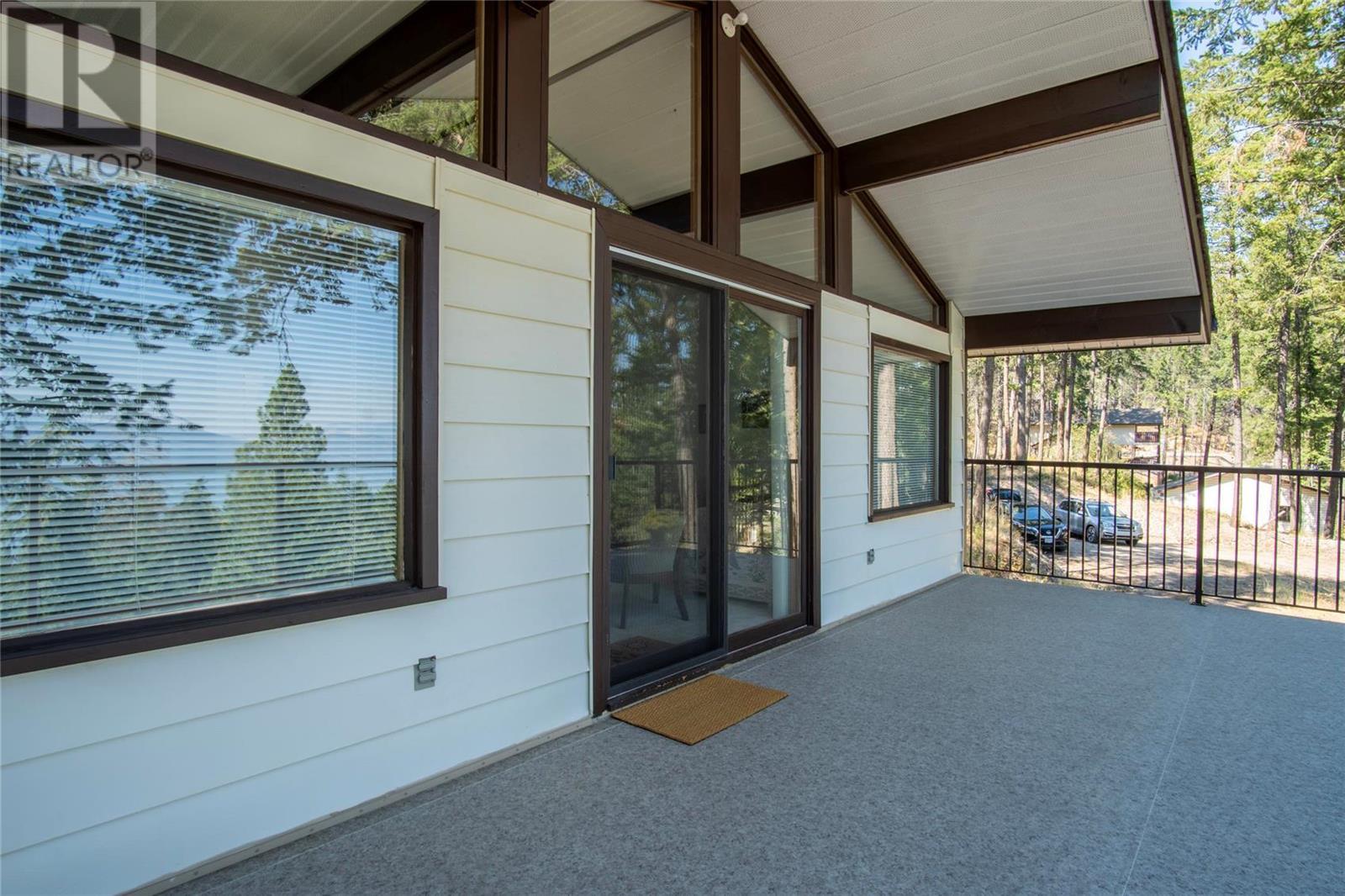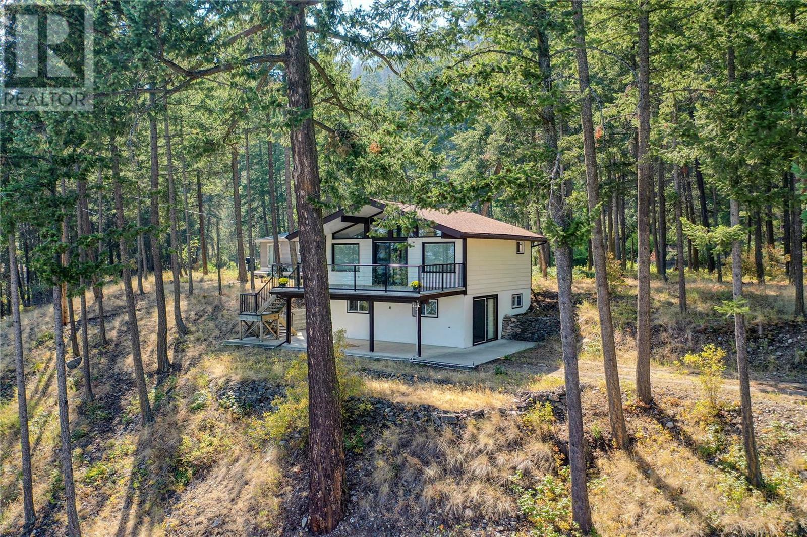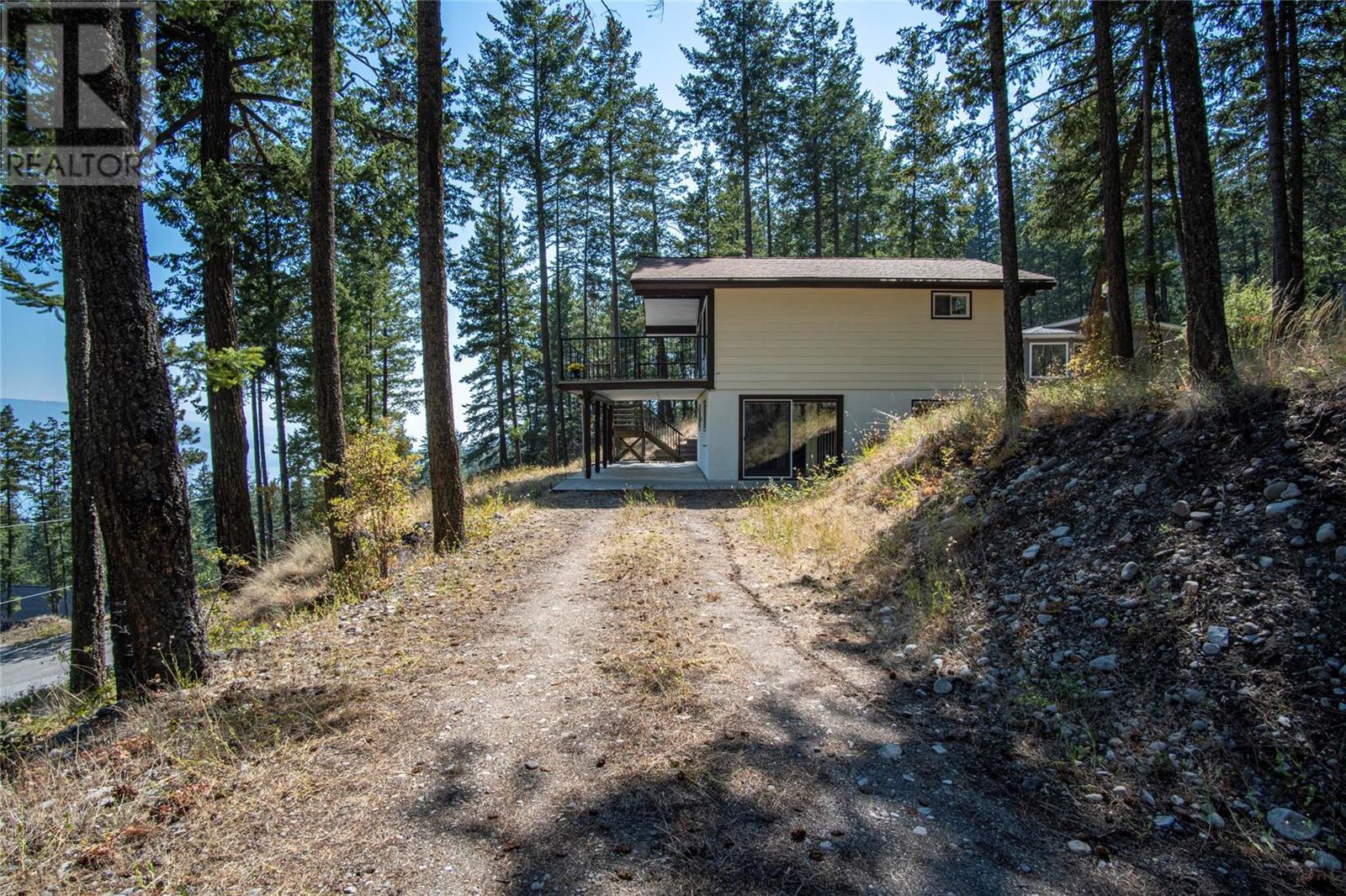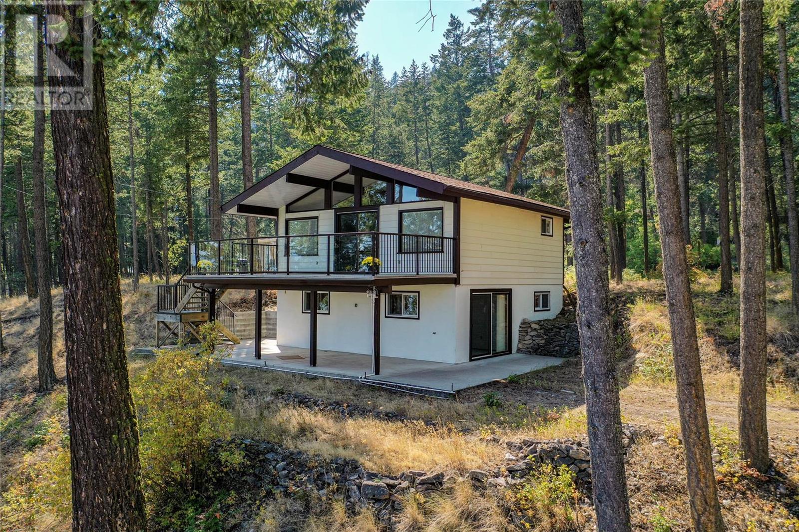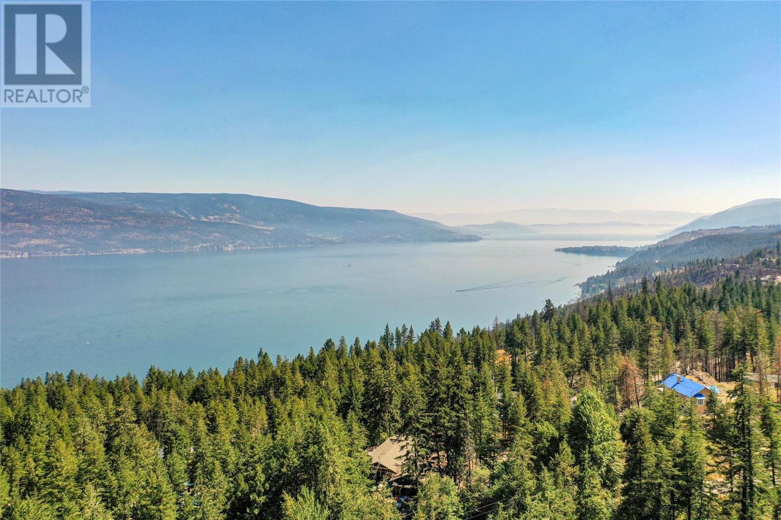Nestled in a peaceful, park-like setting and surrounded by stately tree growth, this serene retreat boasts floor to vaulted ceiling windows and an open-concept layout that brings the outside in and showcases incredible Lake and Mountain views. Minutes from three separate boat launches, crown land, and numerous trail systems, the property would make an ideal second home for the recreational enthusiast. On the main floor, a light-filled living and dining/kitchen area overlooks Okanagan Lake, with direct access to a large deck for entertaining. A single bedroom on this level shares a full hall bathroom with guests. Below the main floor, the finished walkout basement level contains the second bedroom and full bathroom, as well as a bonus family room. From this level, you can access the covered lower patio with stairs leading up to the main floor deck. Positioned on a level, 0.64-acre lot with a sloping driveway, this home offers just enough space to provide privacy while remaining low-maintenance for a seasonal residence. (id:22211)