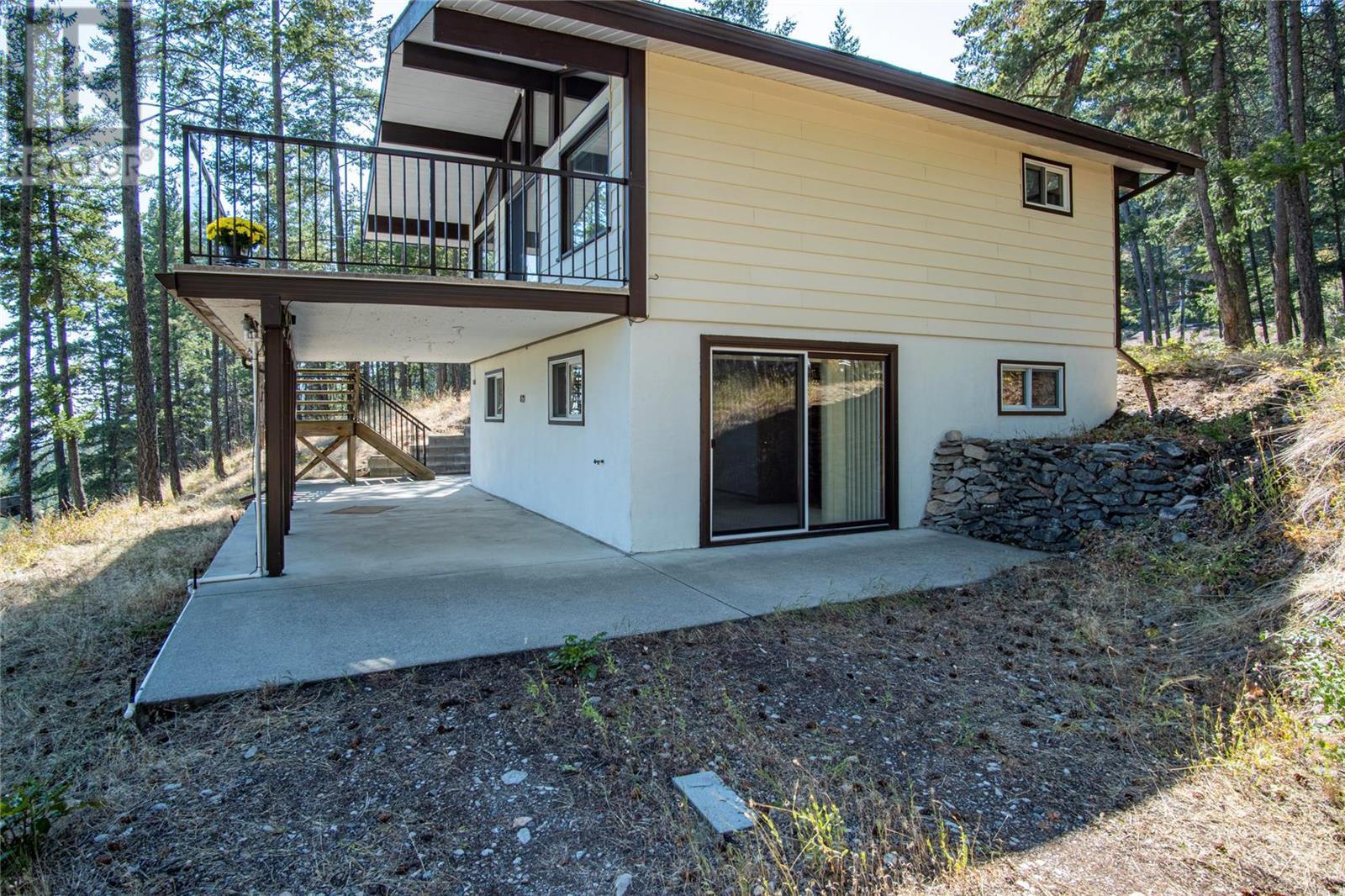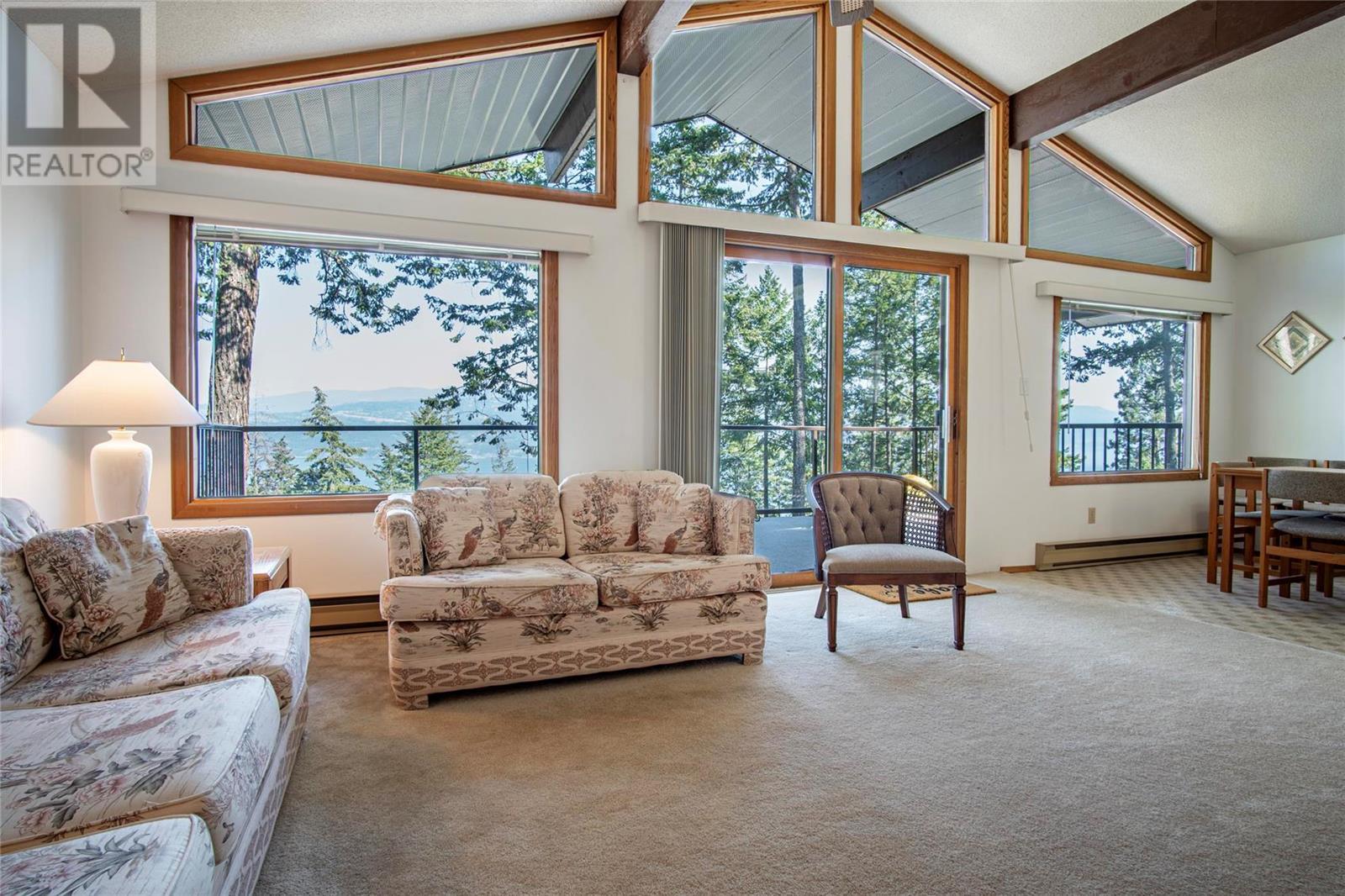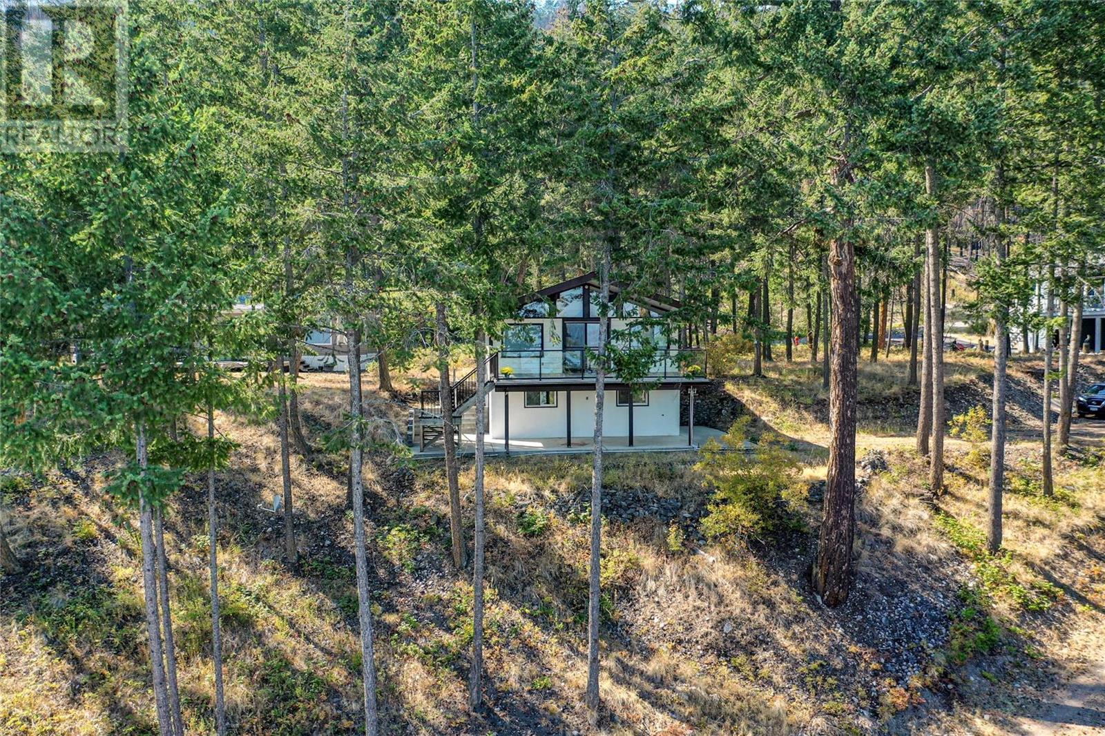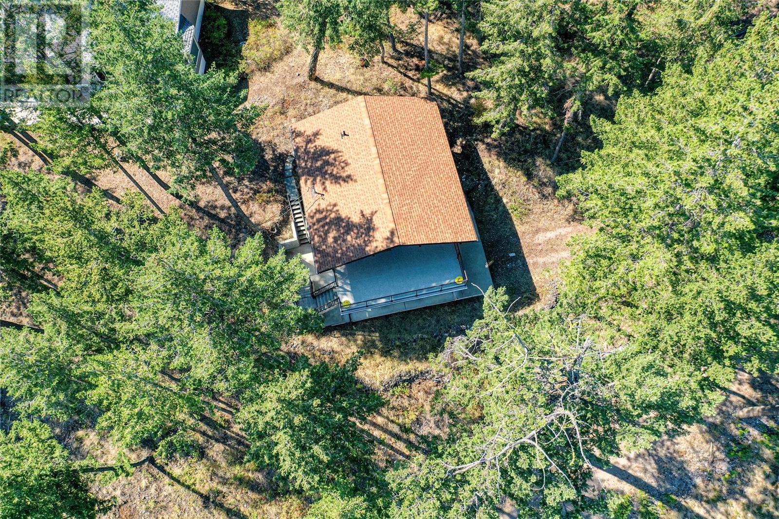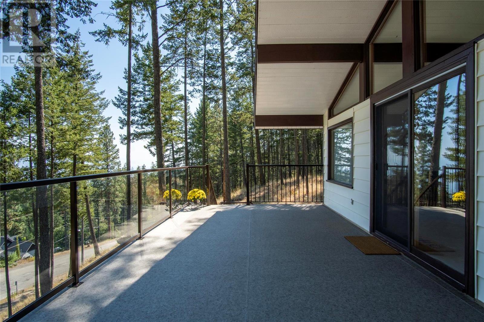 Nestled in a peaceful, park-like setting and surrounded by stately tree growth, this serene retreat boasts floor to vaulted ceiling windows and an open-concept layout that brings the outside in and showcases incredible Lake and Mountain views. Minutes from three separate boat launches, crown land, and numerous trail systems, the property would make an ideal second home for the recreational enthusiast. On the main floor, a light-filled living and dining/kitchen area overlooks Okanagan Lake, with direct access to a large deck for entertaining. A single bedroom on this level shares a full hall bathroom with guests. Below the main floor, the finished walkout basement level contains the second bedroom and full bathroom, as well as a bonus family room. From this level, you can access the covered lower patio with stairs leading up to the main floor deck. Positioned on a level, 0.64-acre lot with a sloping driveway, this home offers just enough space to provide privacy while remaining low-maintenance for a seasonal residence. (id:22211)