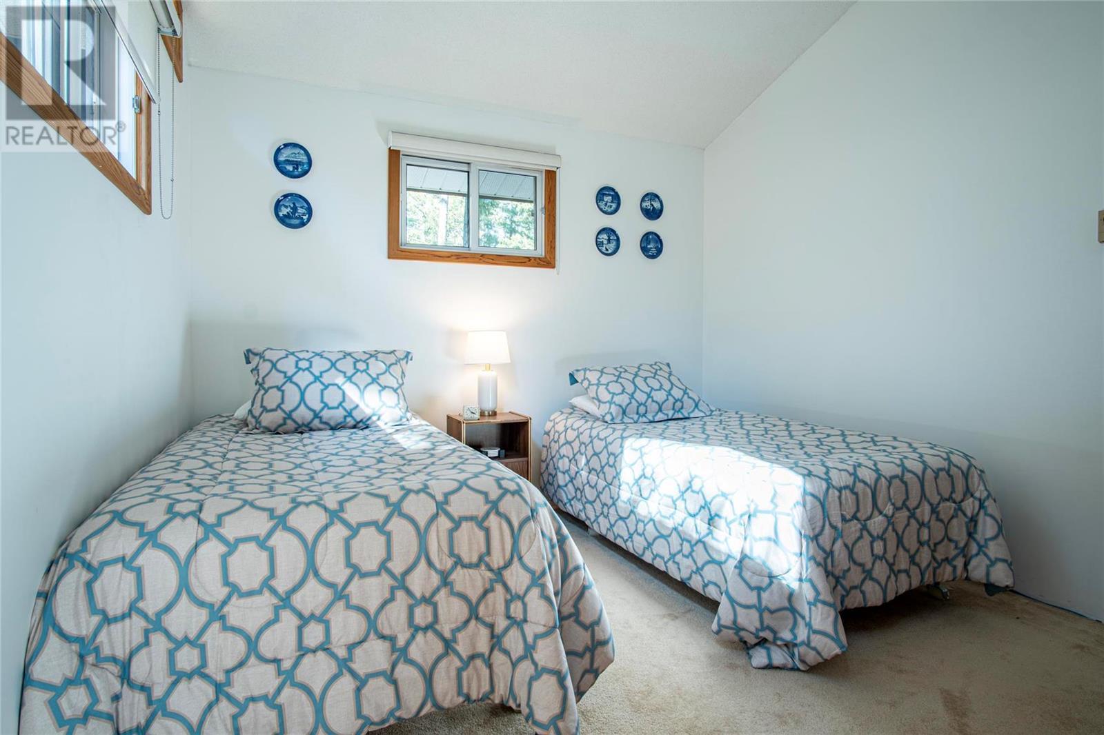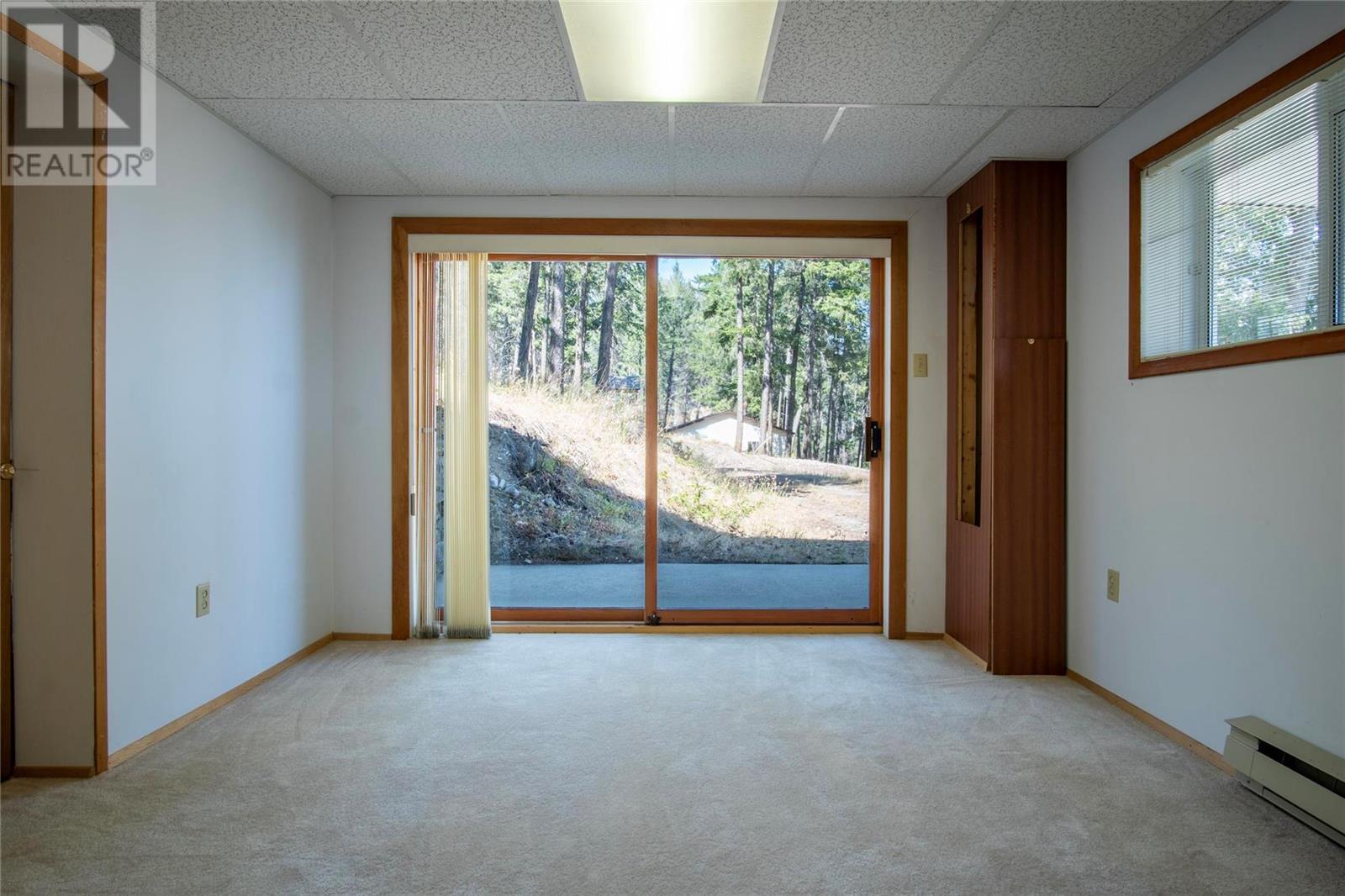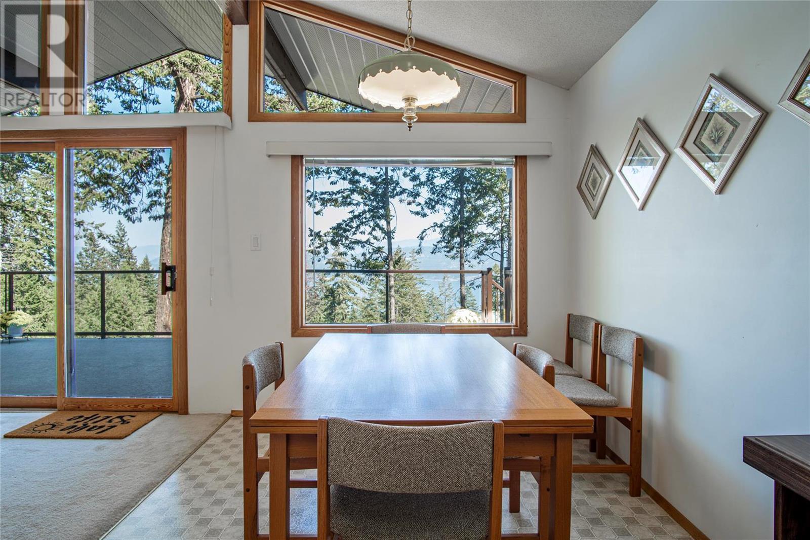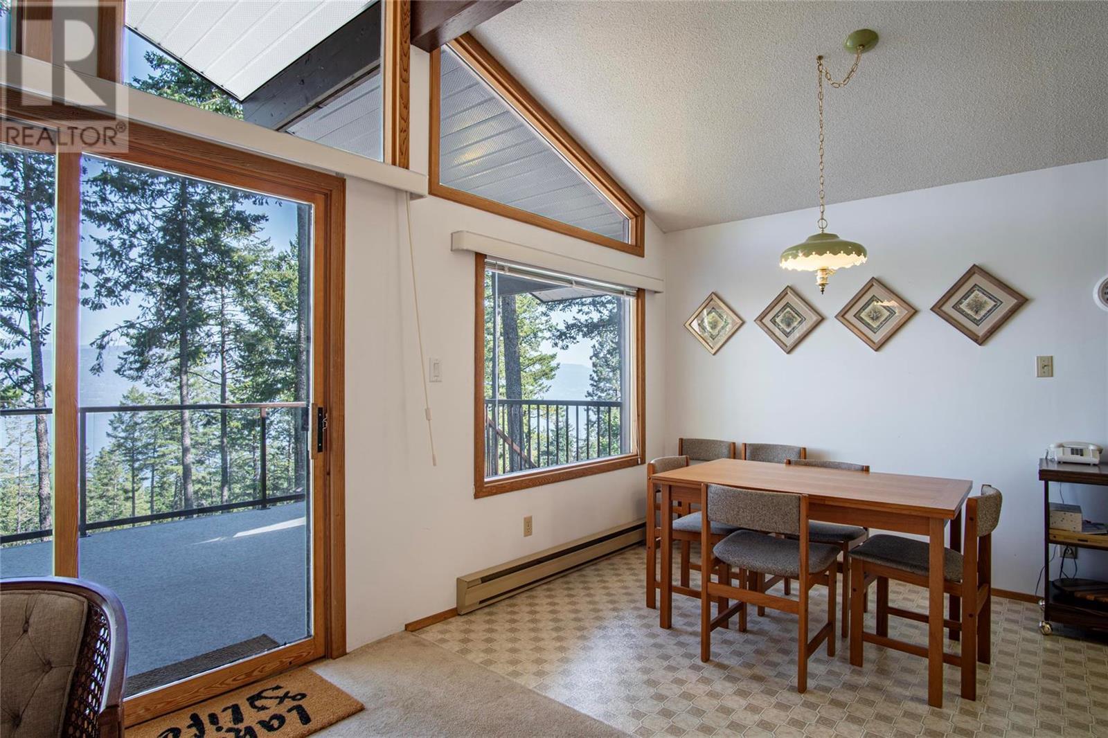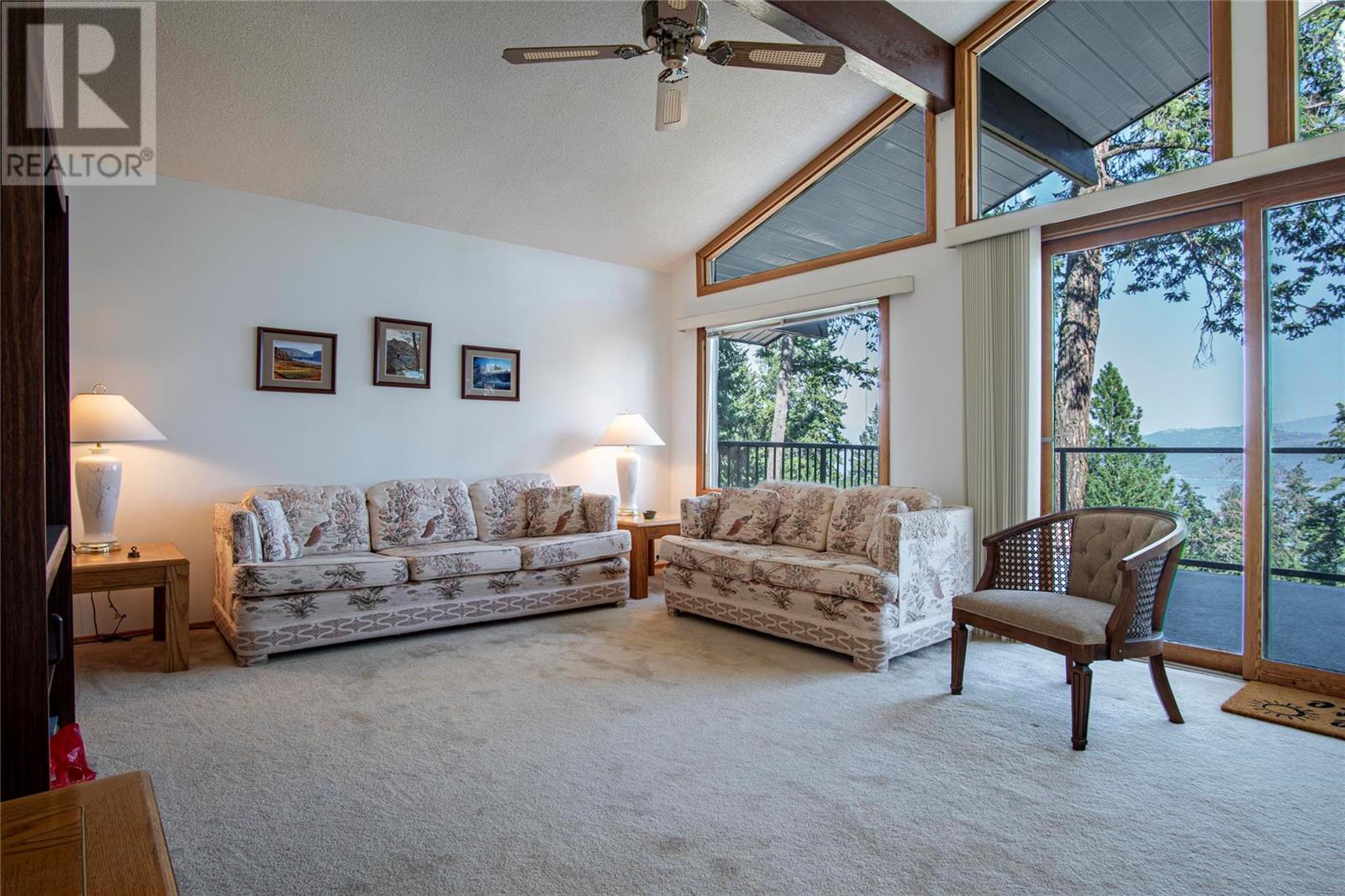 Nestled in a peaceful, park-like setting and surrounded by stately tree growth, this serene retreat boasts floor to vaulted ceiling windows and an open-concept layout that brings the outside in and showcases incredible Lake and Mountain views. Minutes from three separate boat launches, crown land, and numerous trail systems, the property would make an ideal second home for the recreational enthusiast. On the main floor, a light-filled living and dining/kitchen area overlooks Okanagan Lake, with direct access to a large deck for entertaining. A single bedroom on this level shares a full hall bathroom with guests. Below the main floor, the finished walkout basement level contains the second bedroom and full bathroom, as well as a bonus family room. From this level, you can access the covered lower patio with stairs leading up to the main floor deck. Positioned on a level, 0.64-acre lot with a sloping driveway, this home offers just enough space to provide privacy while remaining low-maintenance for a seasonal residence. (id:22211)