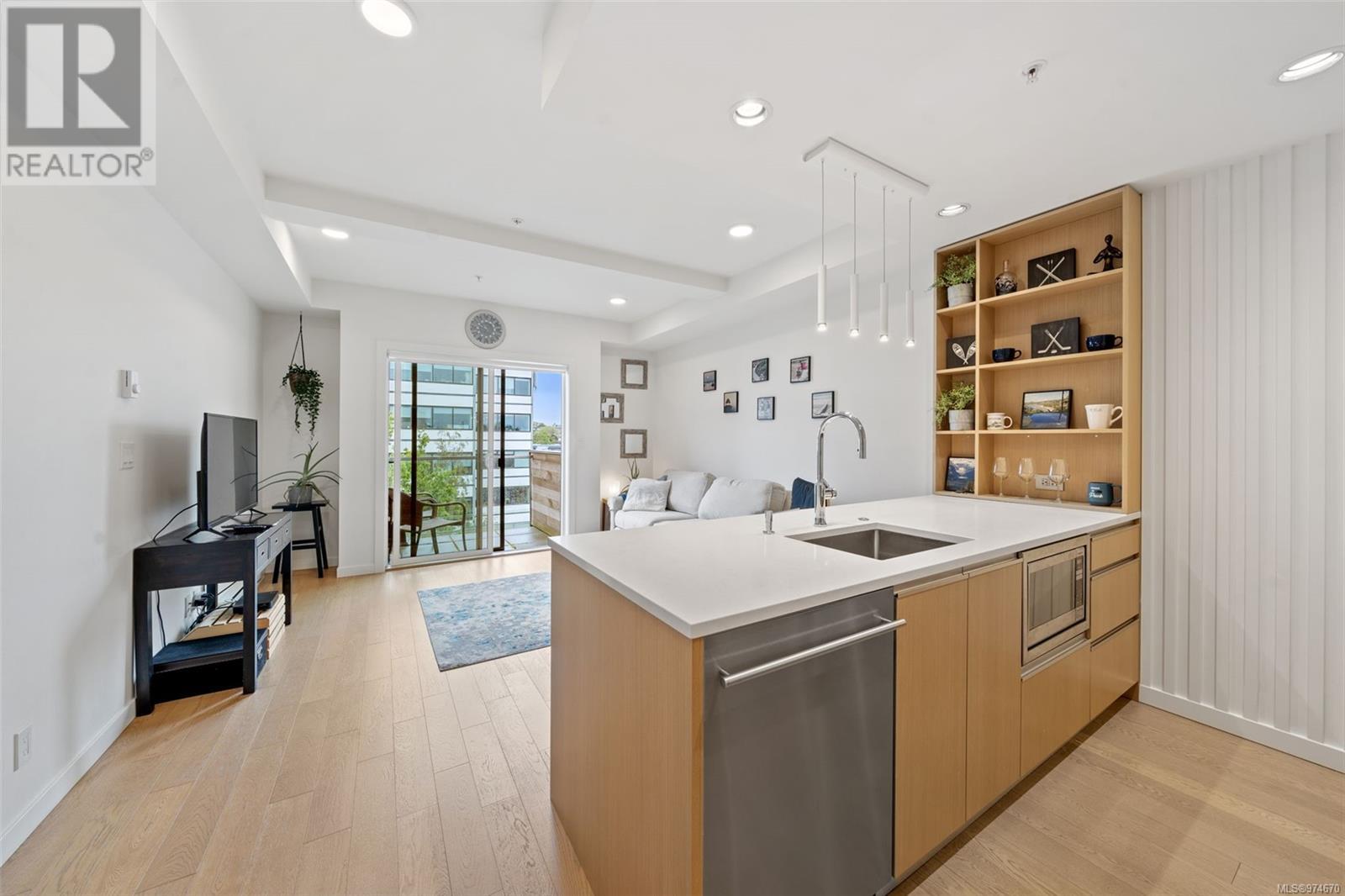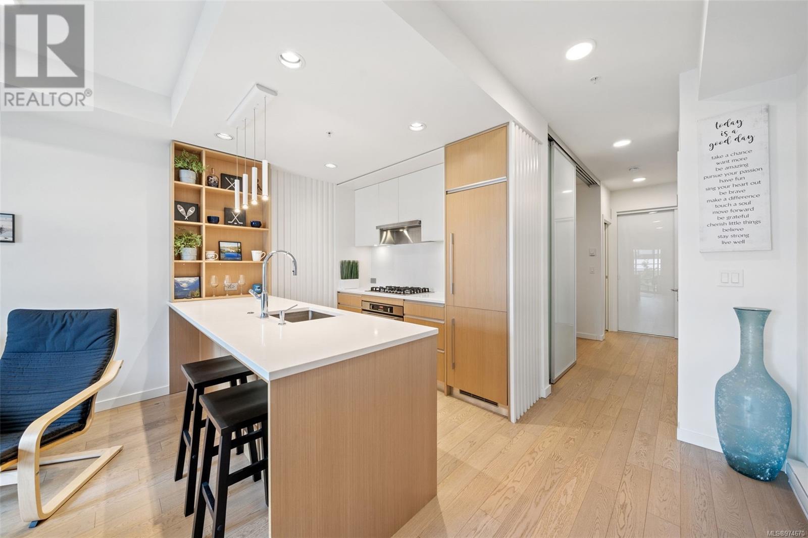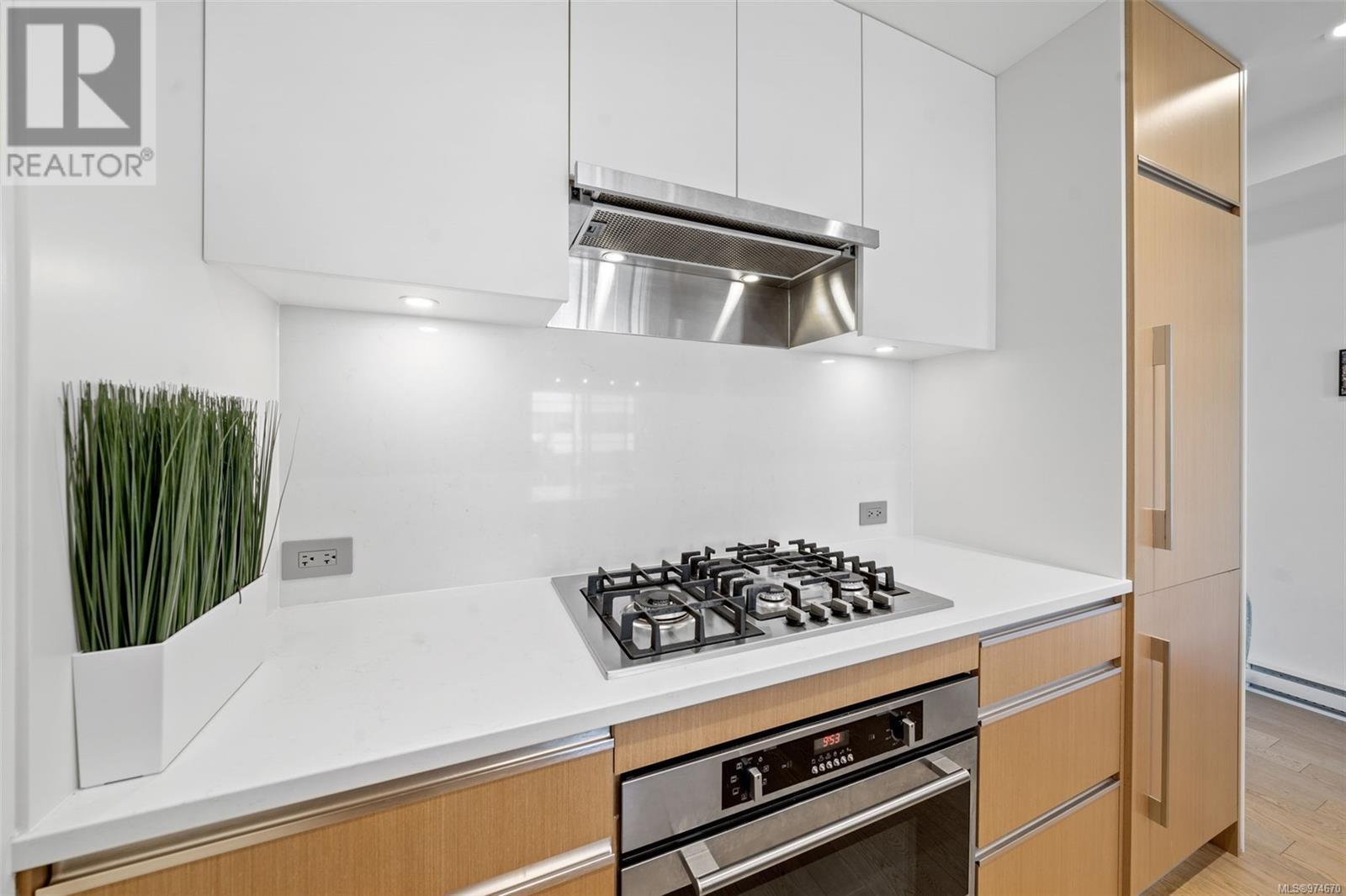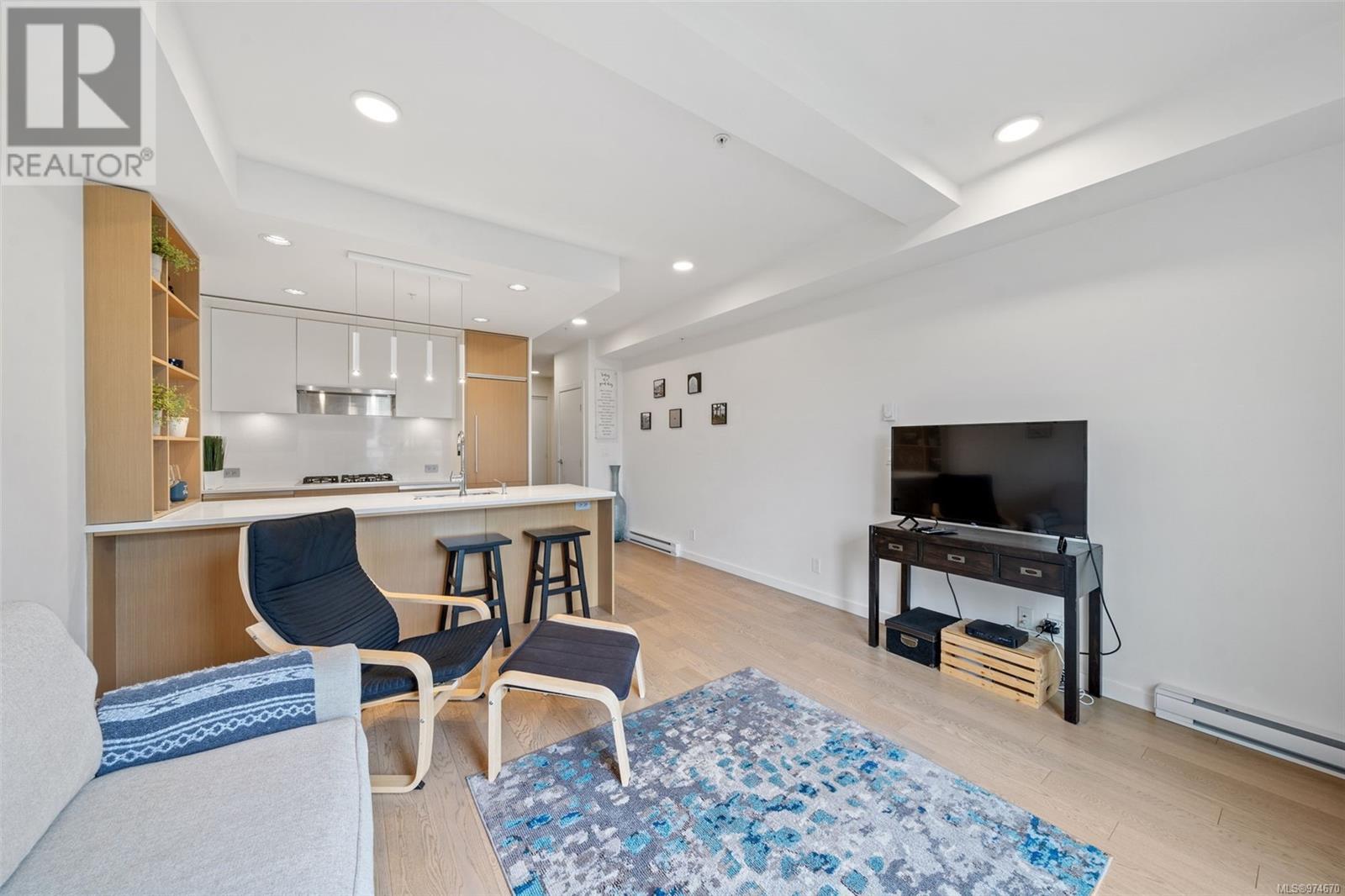 Welcome to the Black and White, a boutique collection of residences by award-winning Abstract Development. Located on the edge of Cook Street Village this contemporary one-bedroom apartment harmonizes modern and timeless design elements and the location provides convenient access to all that downtown Victoria has to offer. This stylish living space spans 537 sq.ft. showcases high-end integrated appliances including a gas range, quartz countertops, hardwood flooring, in-suite laundry, storage, and PARKING. The luxurious spa-like bathroom features a rain shower and heated floors, adding a touch of opulence. Step outside onto the delightful two-person patio, ideal for savoring a morning coffee or enjoying a relaxing evening breeze. This professionally managed building includes a community patio with a fire pit and BBQ, bike storage, a dog wash room, & EV charging. (id:22211)