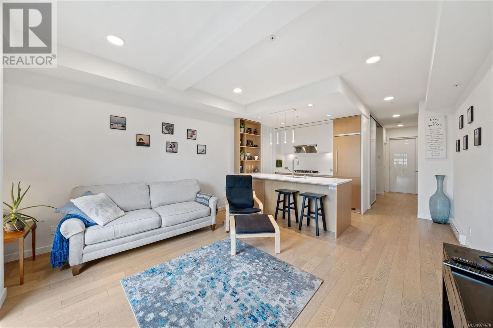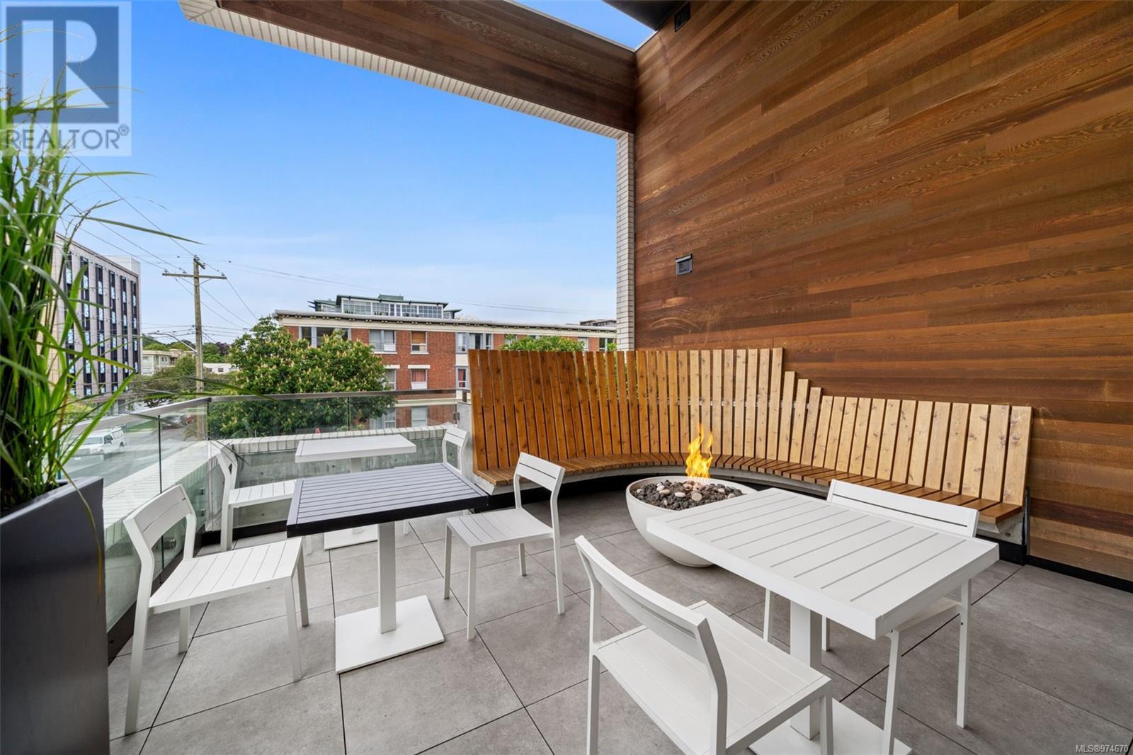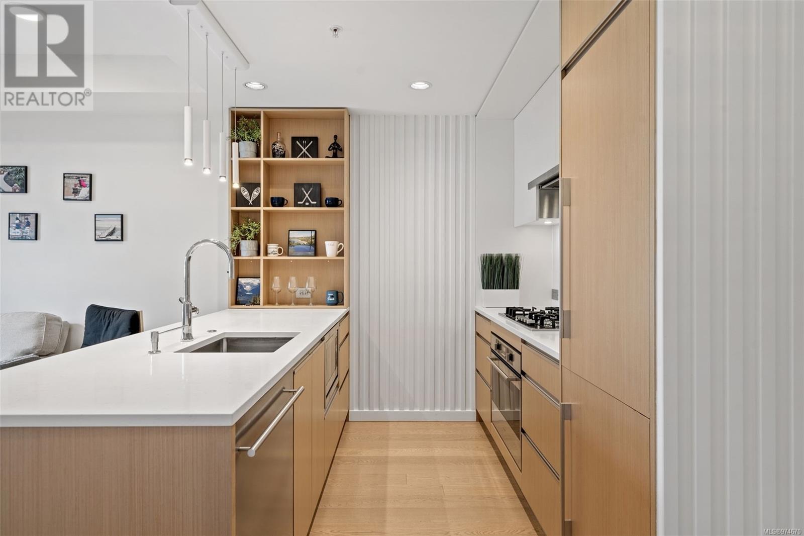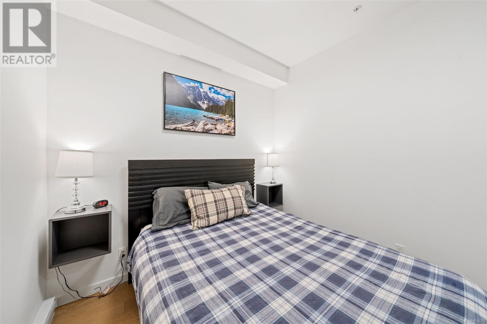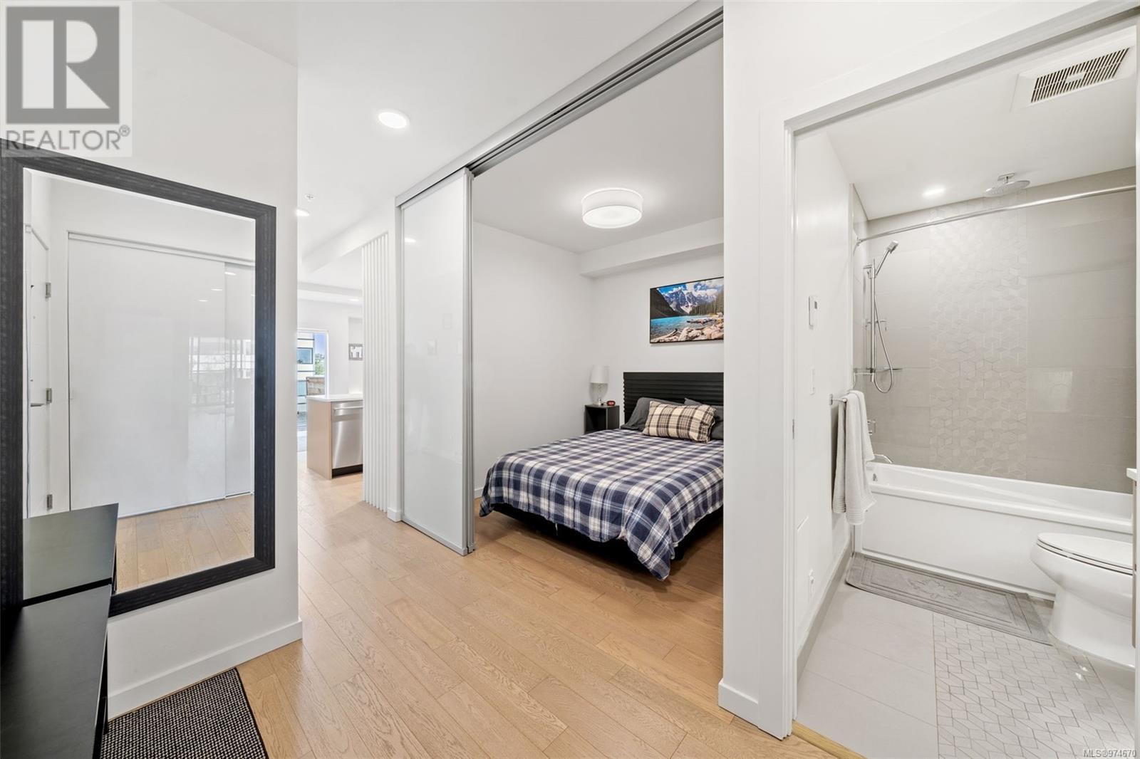Welcome to the Black and White, a boutique collection of residences by award-winning Abstract Development. Located on the edge of Cook Street Village this contemporary one-bedroom apartment harmonizes modern and timeless design elements and the location provides convenient access to all that downtown Victoria has to offer. This stylish living space spans 537 sq.ft. showcases high-end integrated appliances including a gas range, quartz countertops, hardwood flooring, in-suite laundry, storage, and PARKING. The luxurious spa-like bathroom features a rain shower and heated floors, adding a touch of opulence. Step outside onto the delightful two-person patio, ideal for savoring a morning coffee or enjoying a relaxing evening breeze. This professionally managed building includes a community patio with a fire pit and BBQ, bike storage, a dog wash room, & EV charging. (id:22211)