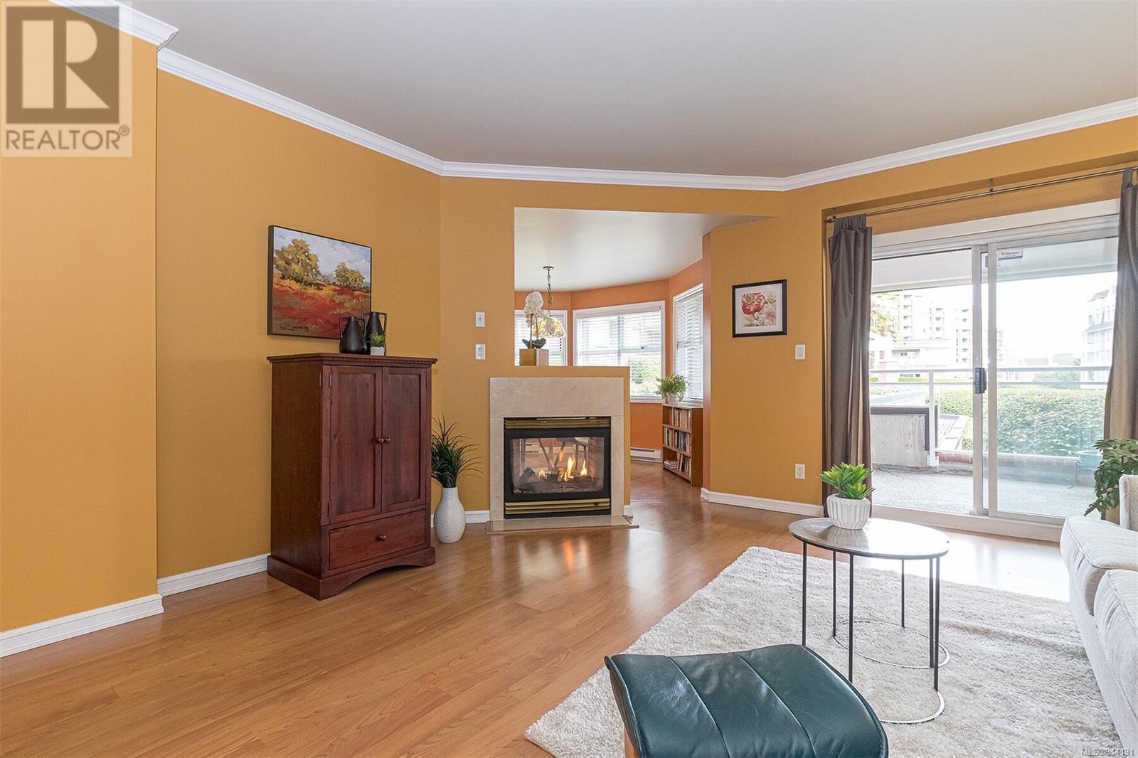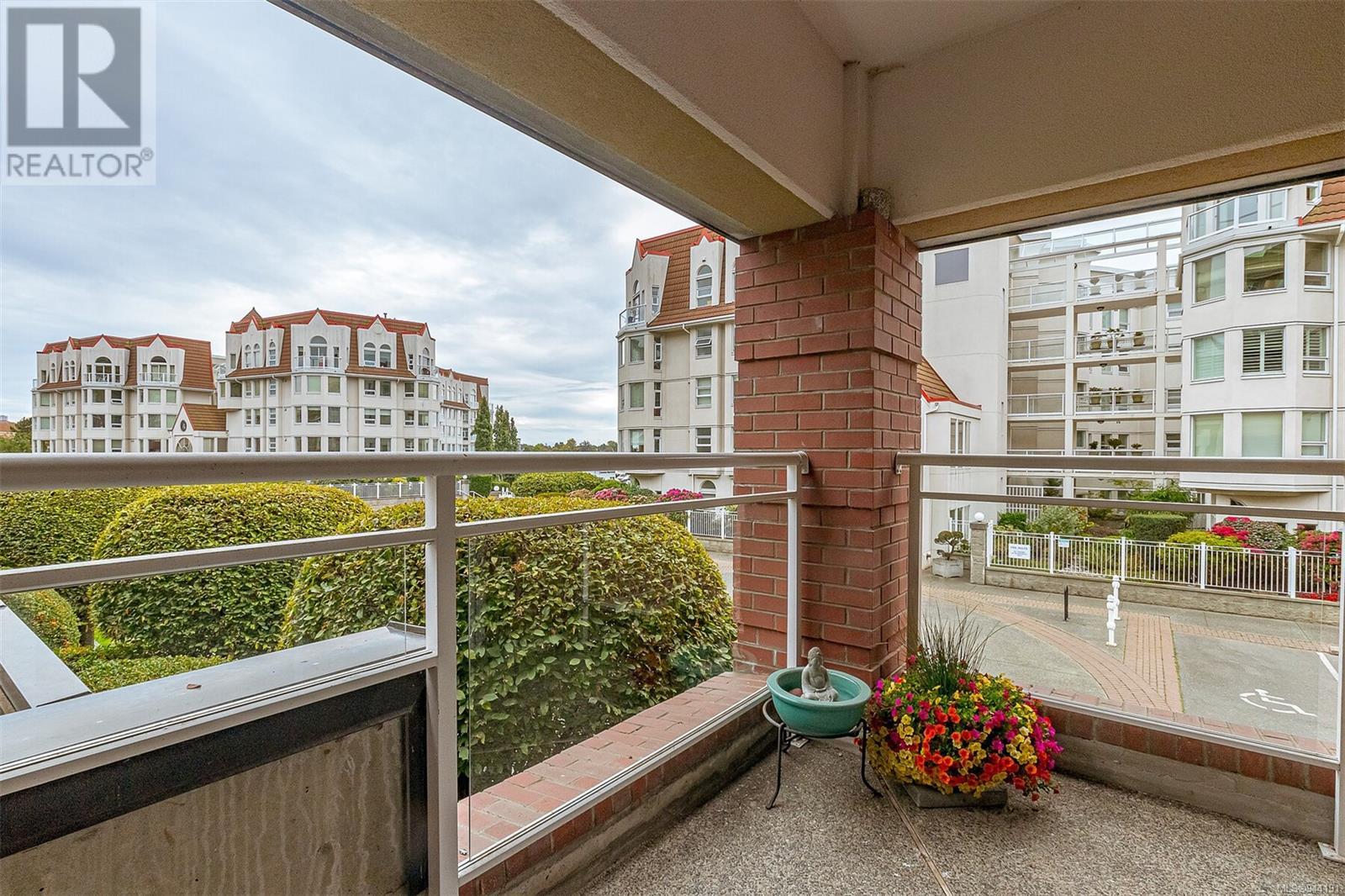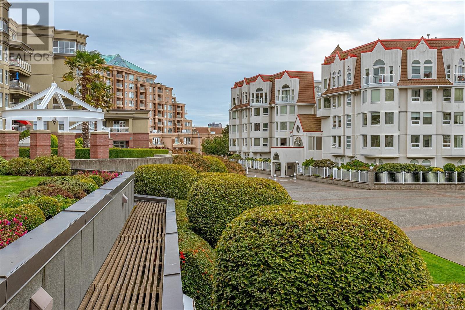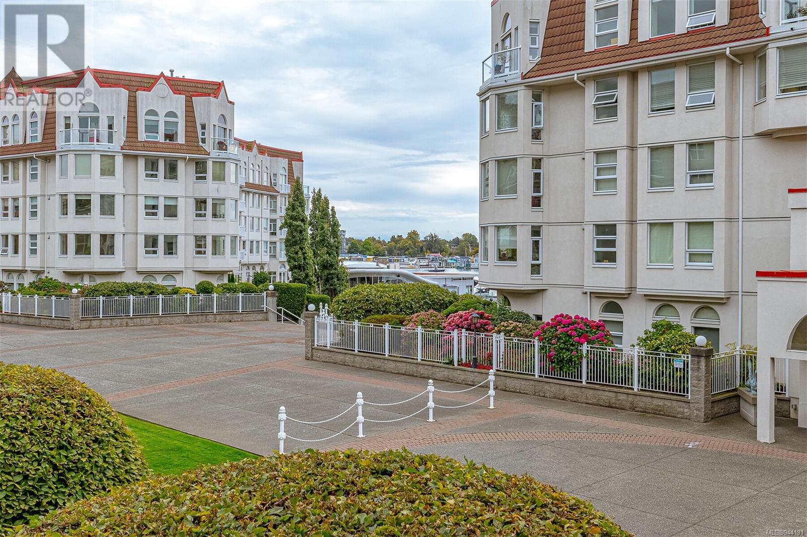 Just steps from the vibrant Songhees walkway! Bright and spacious, this 2 bdrm, 2 bath home faces south east overlooking the inner courtyard. Perfect for those looking to downsize from a home, with over 1450 square ft. Kitchen with plenty of cabinets, granite countertops, large pantry, insuite laundry, and eating area. Open concept living/dining room with double sided gas fireplace. Overheight ceilings with crown moldings. Slider leads to patio to enjoy the afternoon sun. Large primary suite with walk in closet and ensuite with soaker tub and separate shower. Well laid out floor plan with bedrooms nicely separated. This well maintained and managed concrete and steel building offers plenty of amenities – gym, bike and kayak storage, meeting room and car wash area. Underground parking and storage included. Pets welcome. Fabulous location to walk or bike or dine at nearby restaurants or a few minutes downtown. (id:22211)