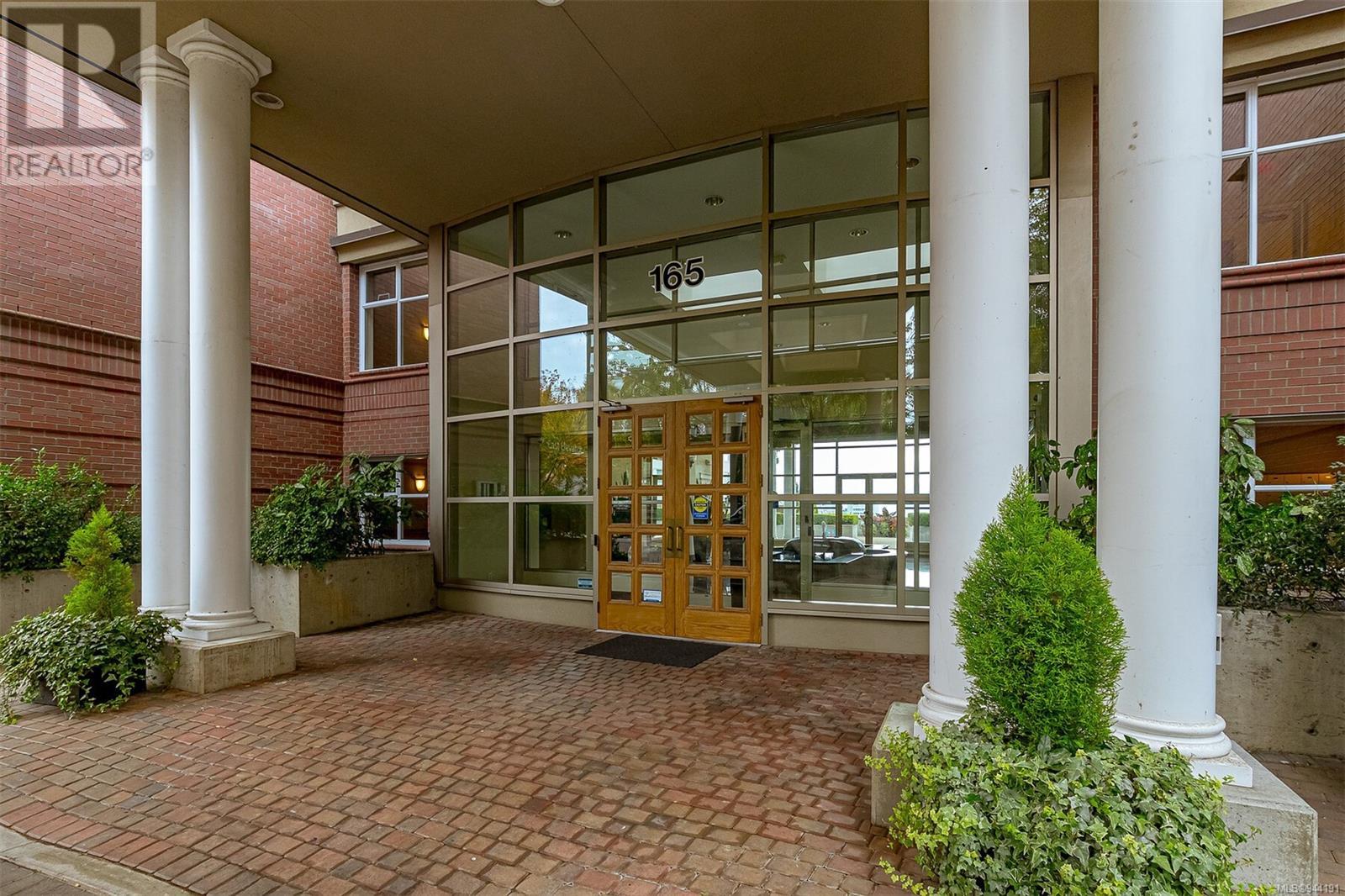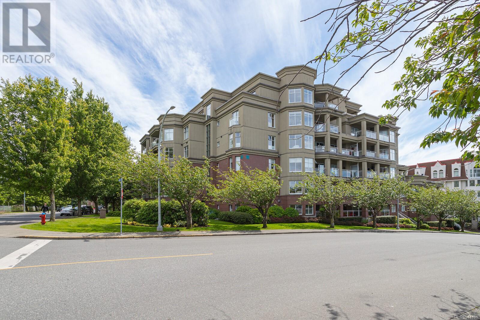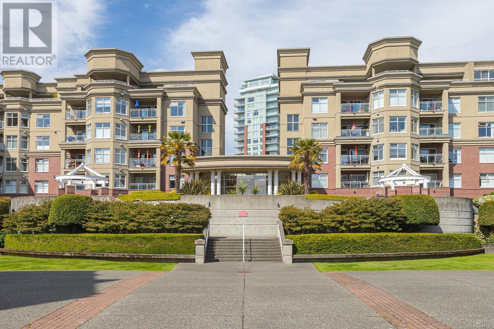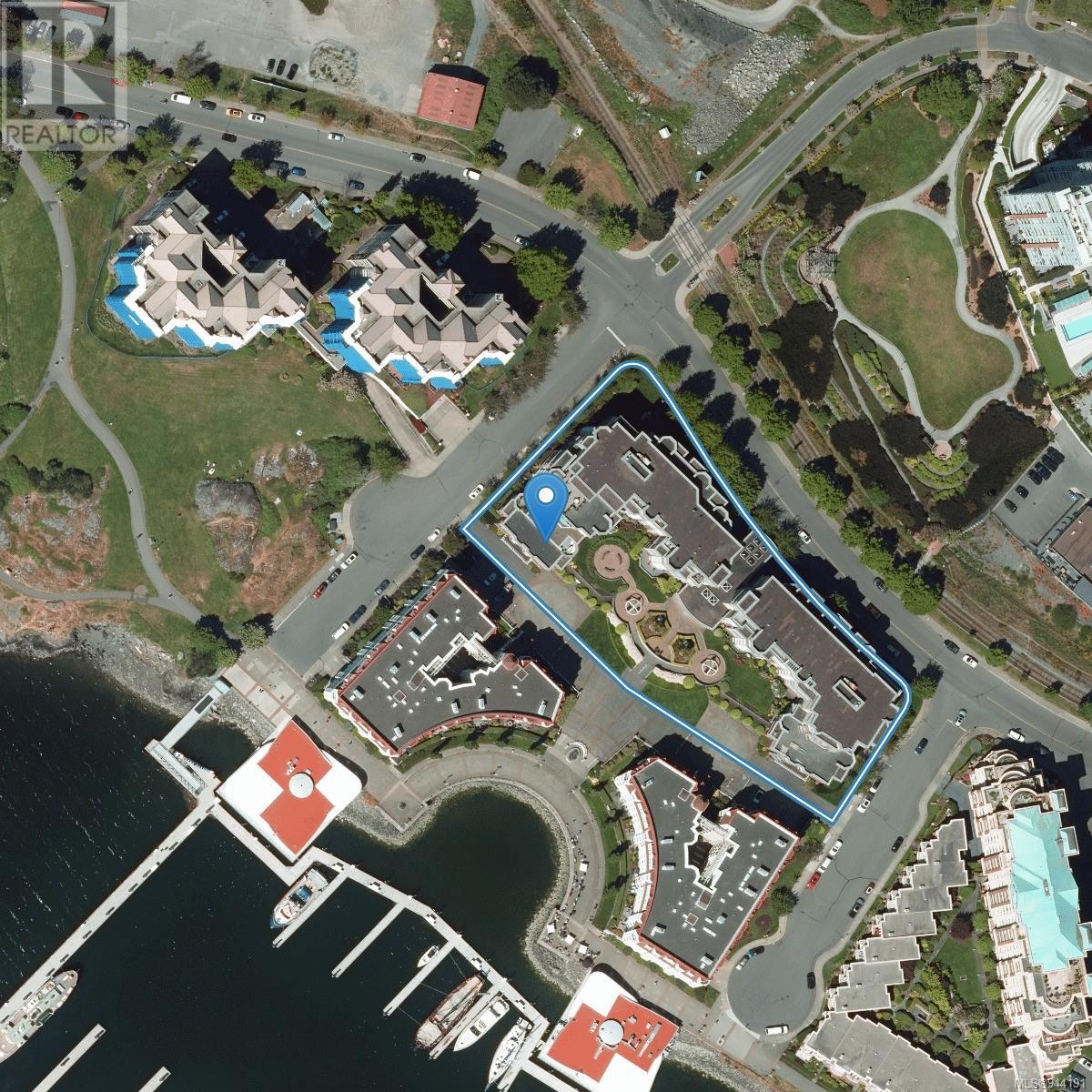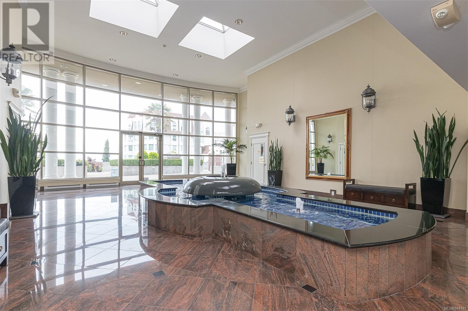 Just steps from the vibrant Songhees walkway! Bright and spacious, this 2 bdrm, 2 bath home faces south east overlooking the inner courtyard. Perfect for those looking to downsize from a home, with over 1450 square ft. Kitchen with plenty of cabinets, granite countertops, large pantry, insuite laundry, and eating area. Open concept living/dining room with double sided gas fireplace. Overheight ceilings with crown moldings. Slider leads to patio to enjoy the afternoon sun. Large primary suite with walk in closet and ensuite with soaker tub and separate shower. Well laid out floor plan with bedrooms nicely separated. This well maintained and managed concrete and steel building offers plenty of amenities – gym, bike and kayak storage, meeting room and car wash area. Underground parking and storage included. Pets welcome. Fabulous location to walk or bike or dine at nearby restaurants or a few minutes downtown. (id:22211)