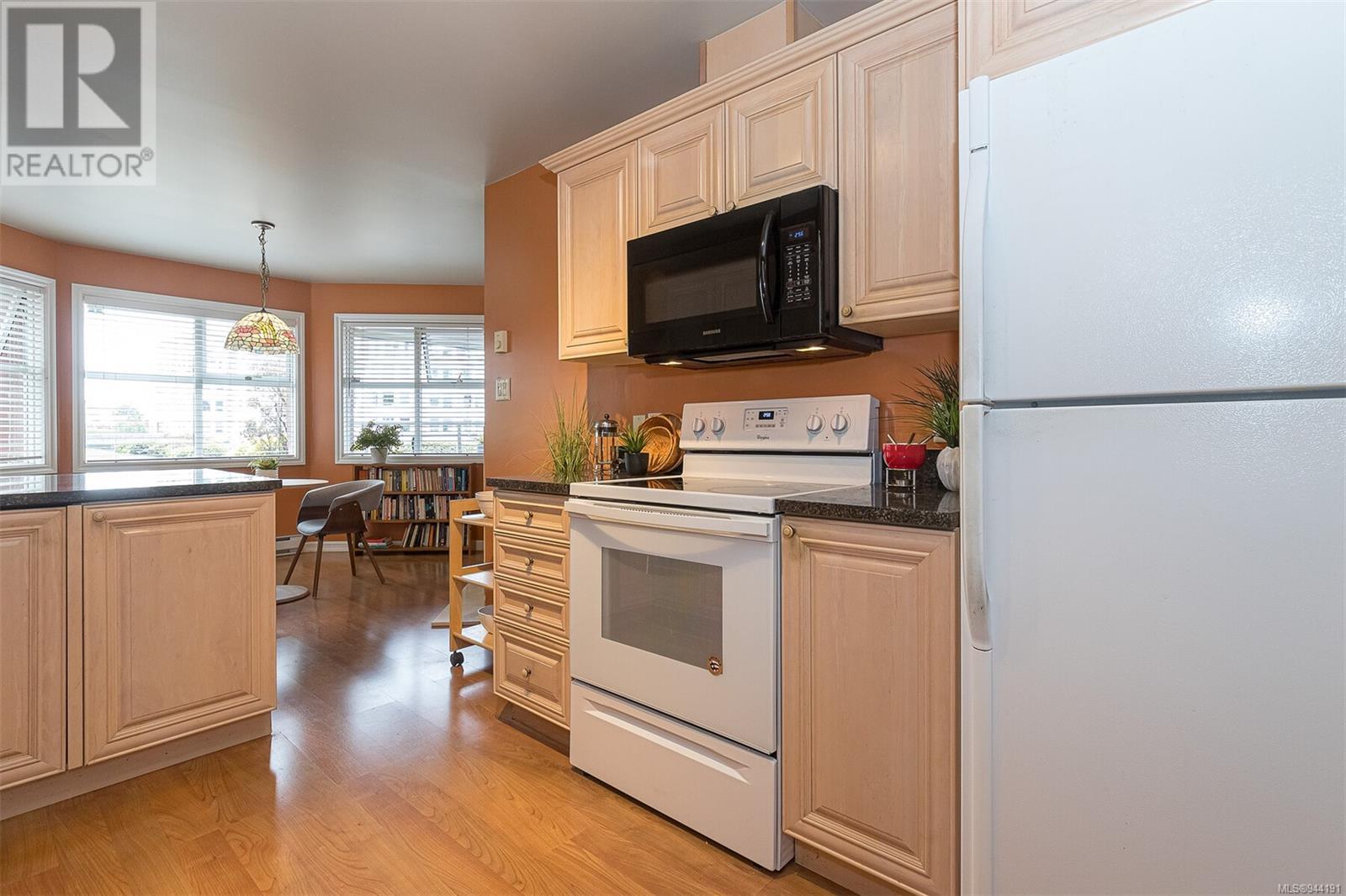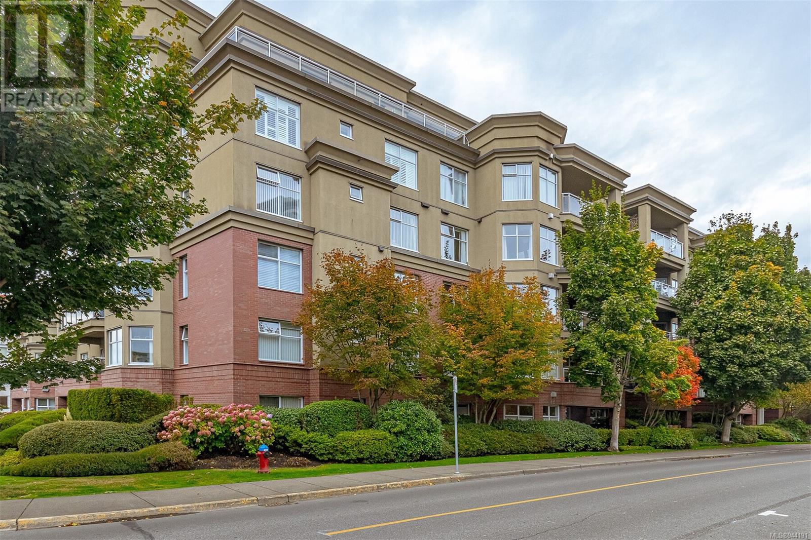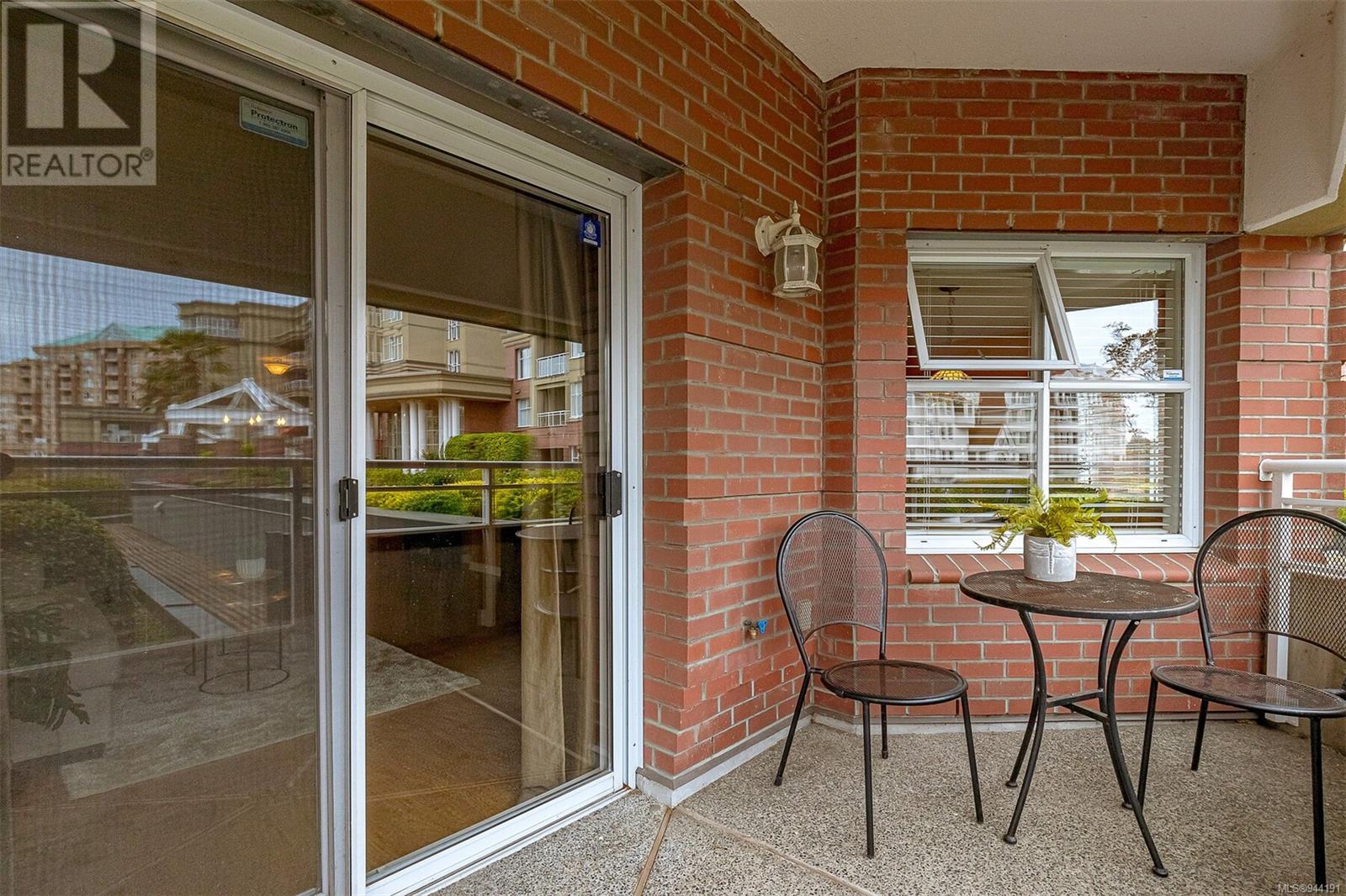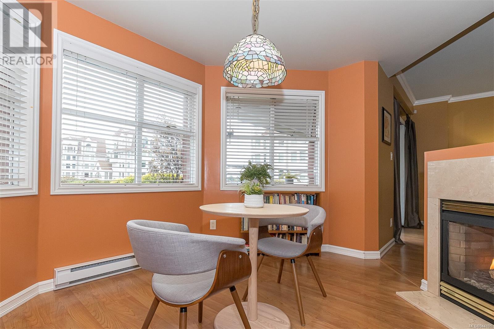 Just steps from the vibrant Songhees walkway! Bright and spacious, this 2 bdrm, 2 bath home faces south east overlooking the inner courtyard. Perfect for those looking to downsize from a home, with over 1450 square ft. Kitchen with plenty of cabinets, granite countertops, large pantry, insuite laundry, and eating area. Open concept living/dining room with double sided gas fireplace. Overheight ceilings with crown moldings. Slider leads to patio to enjoy the afternoon sun. Large primary suite with walk in closet and ensuite with soaker tub and separate shower. Well laid out floor plan with bedrooms nicely separated. This well maintained and managed concrete and steel building offers plenty of amenities – gym, bike and kayak storage, meeting room and car wash area. Underground parking and storage included. Pets welcome. Fabulous location to walk or bike or dine at nearby restaurants or a few minutes downtown. (id:22211)