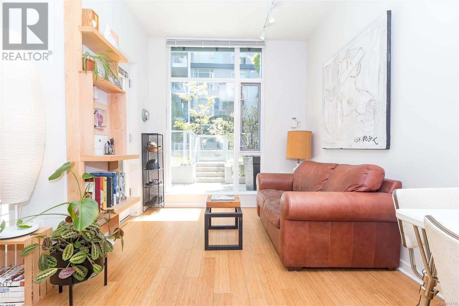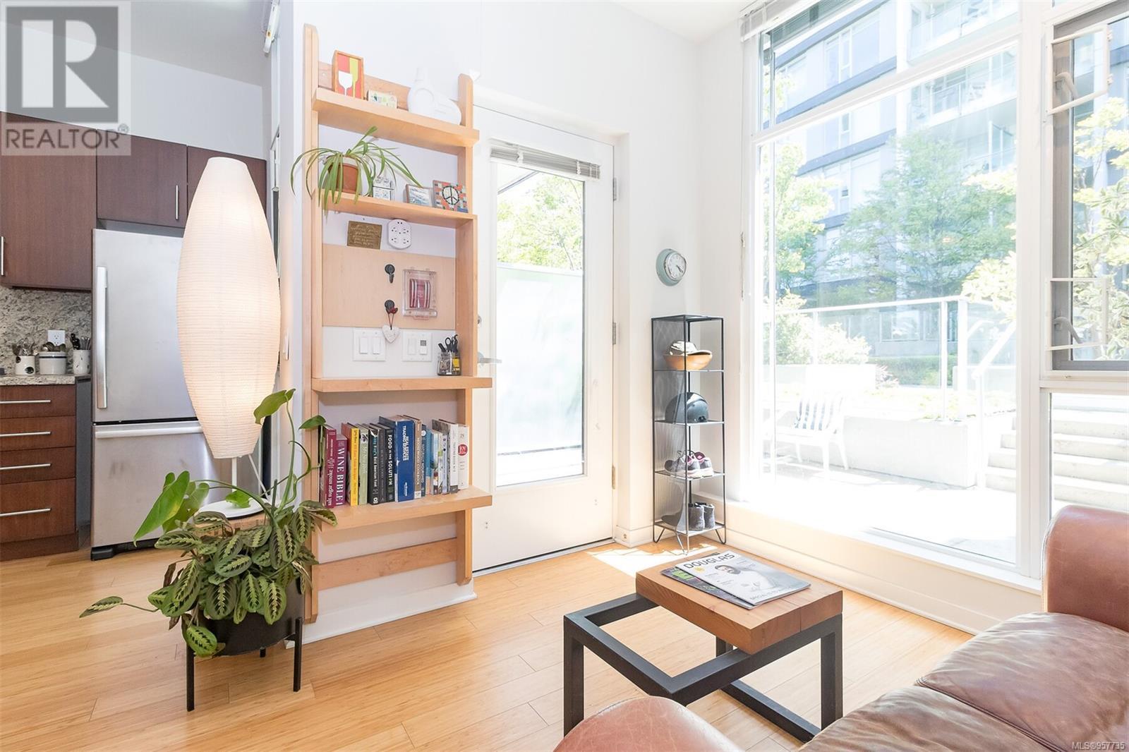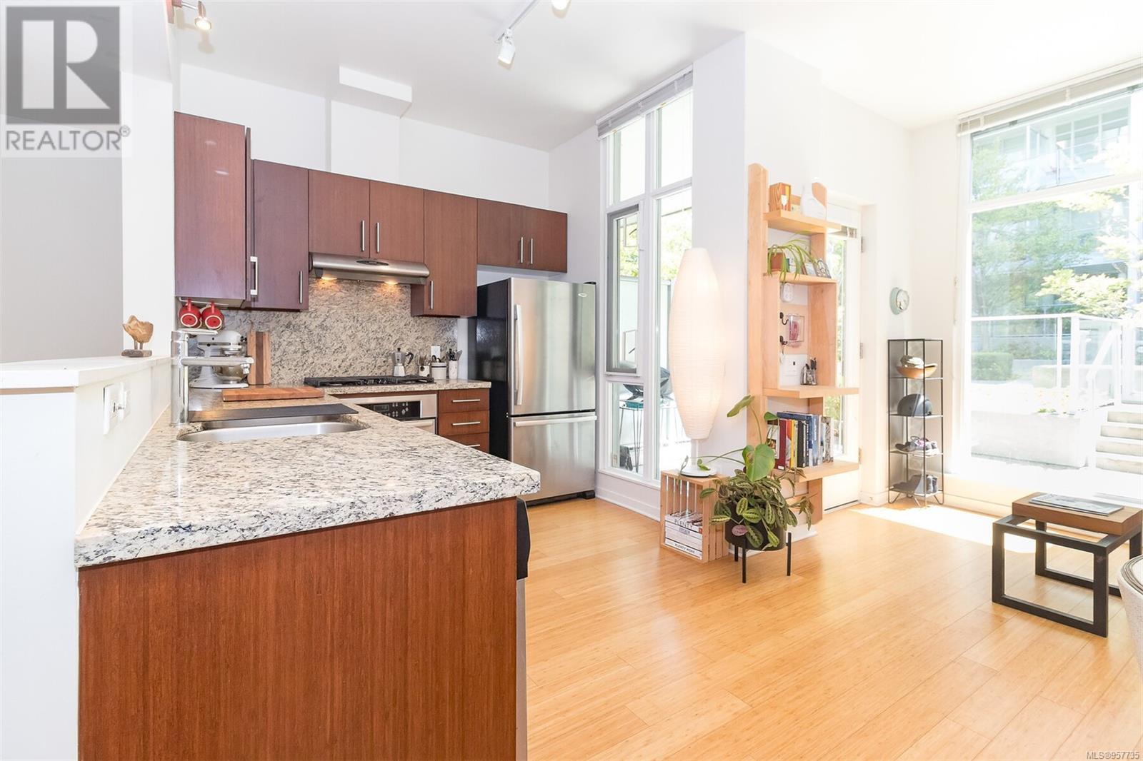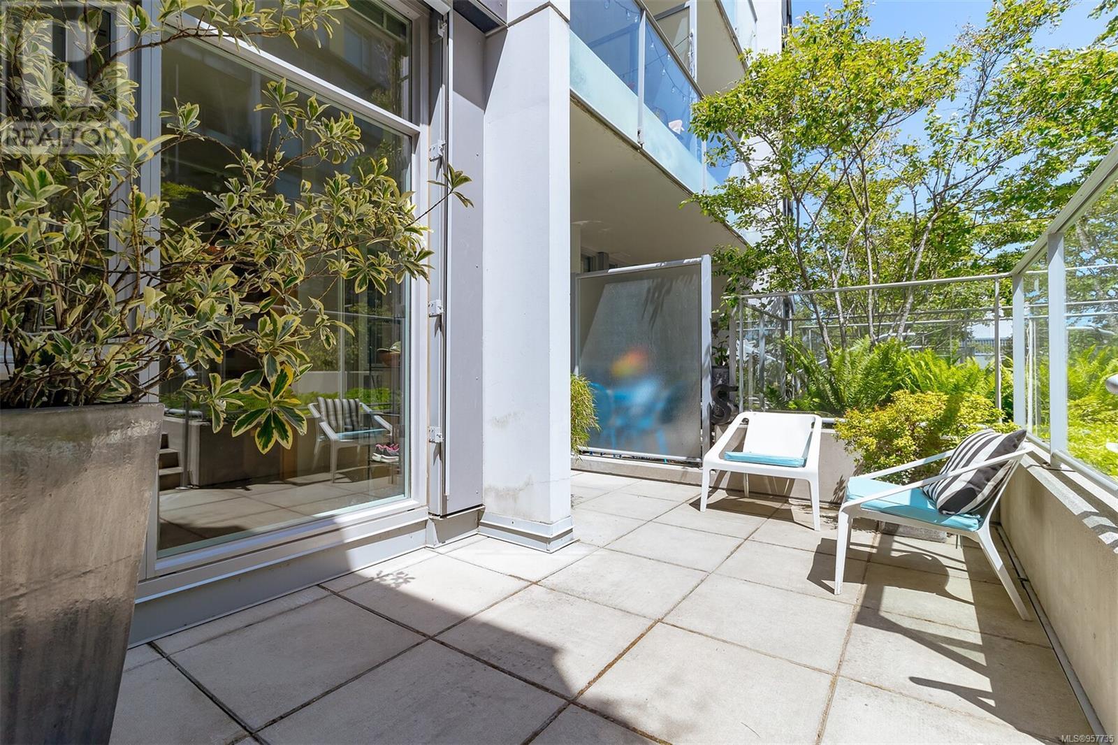 Vic West Living at is best in this bright and stylish south facing garden level suite in the popular Balance building at Dockside Green, just steps away from the Inner Harbour and everything Victoria has to offer. With its private entry from the garden terrace, this open concept suite boasts ample living space, a large kitchen with plenty of cabinets and an eating area. The 9' ceilings and soaring windows flood the space with natural light. Additional highlights include a soaker tub with modern glass shower doors, a walk-in closet, in-suite laundry, granite countertops, stainless steel appliances, and remote-controlled blinds. The LEED-certified Dockside Green incorporates innovative on-site amenities such as sewage treatment, water conservation and reclamation systems. Conveniently located along the Galloping Goose Trail for easy connectivity to bike and walking paths. Underground parking and storage are also included. (id:22211)