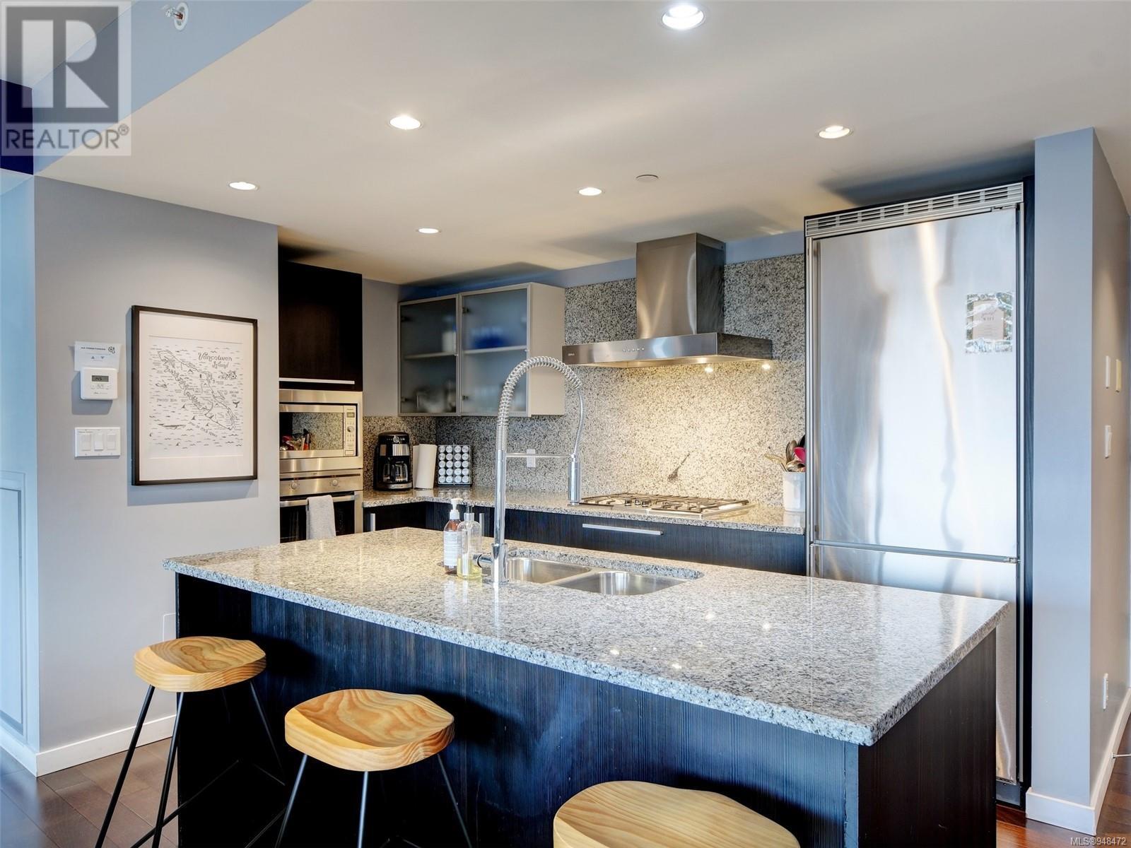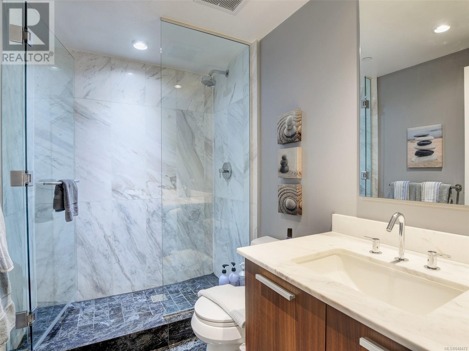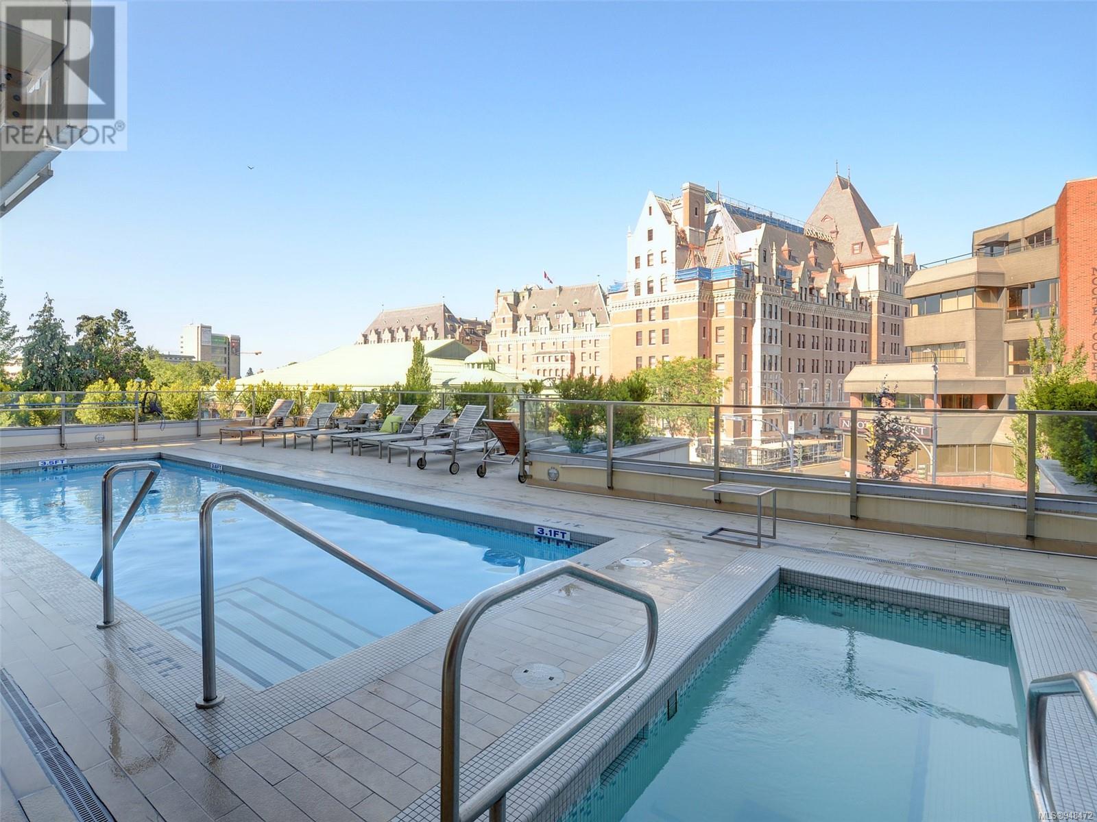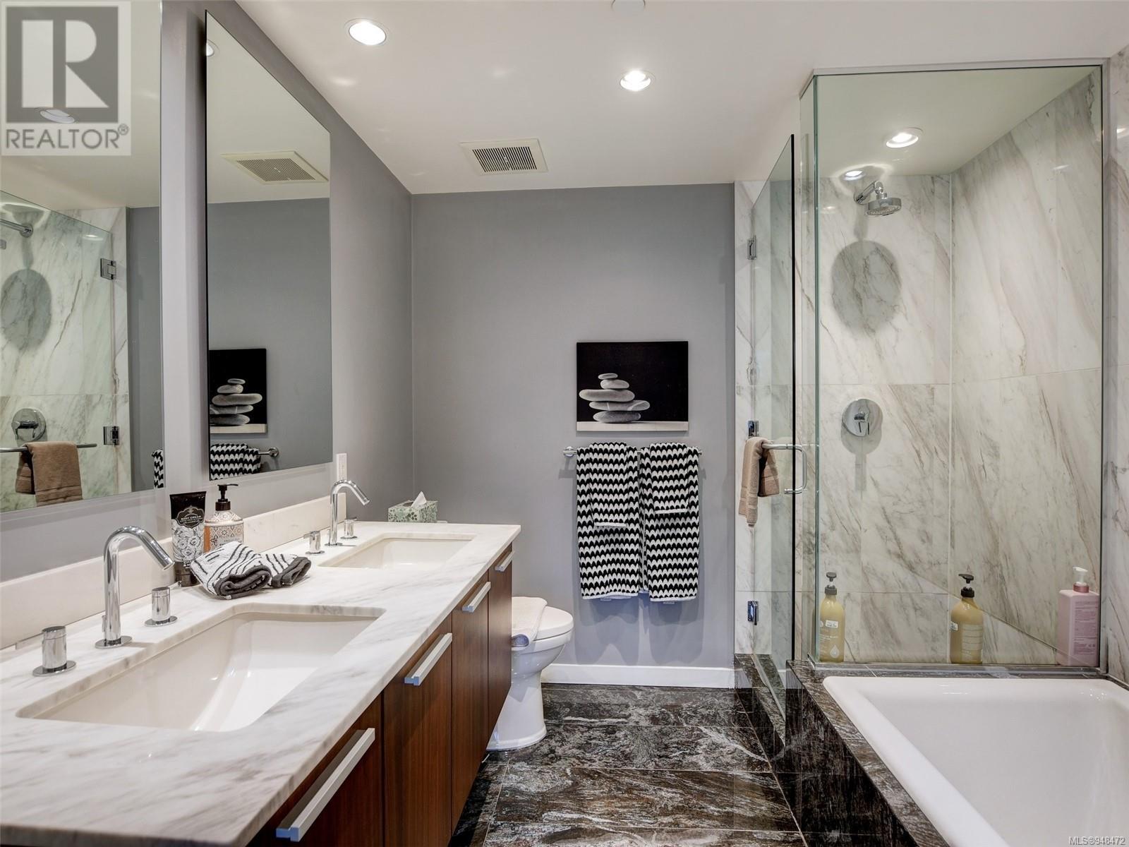 Downtown Victoria luxury condo living at its best! This spacious, 2 bedroom, 2 bath condo is located in The Falls, a steel and concrete building. West facing floor to ceiling windows stream loads of natural light into your open concept living, dining, and kitchen areas. The Italian Schiffini kitchen, with its granite counters, stainless steel appliances and gas cooktop, is a chef’s dream. Beautiful finishes include wood floors and marble bathrooms. The master bedroom has floor to ceiling windows, a walk-in closet, and a spa-like ensuite. Your own heat pump ensures efficient heating and air conditioning for year-round comfort and control. Take in the sunny west exposure and view from your own oversized deck, or enjoy the building’s outdoor heated pool, with surrounding deck, hot-tub and indoor gym for all seasons activities. With a walk score of 95, this home’s prime central location offers something for everyone. (id:22211)