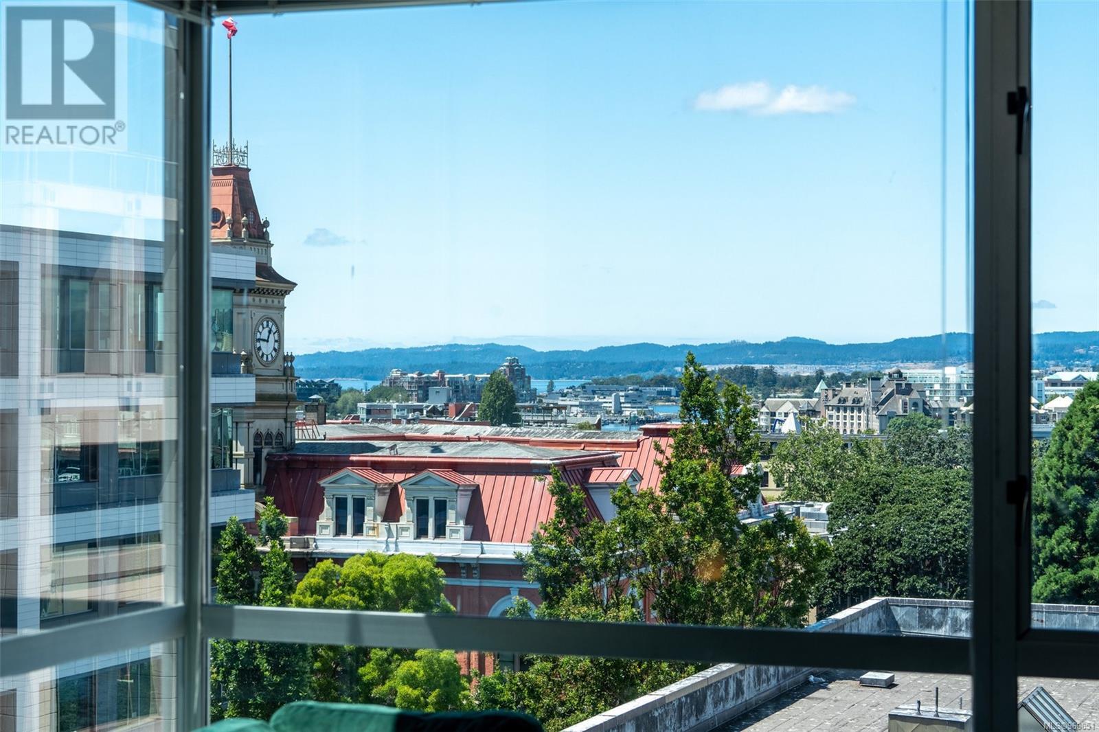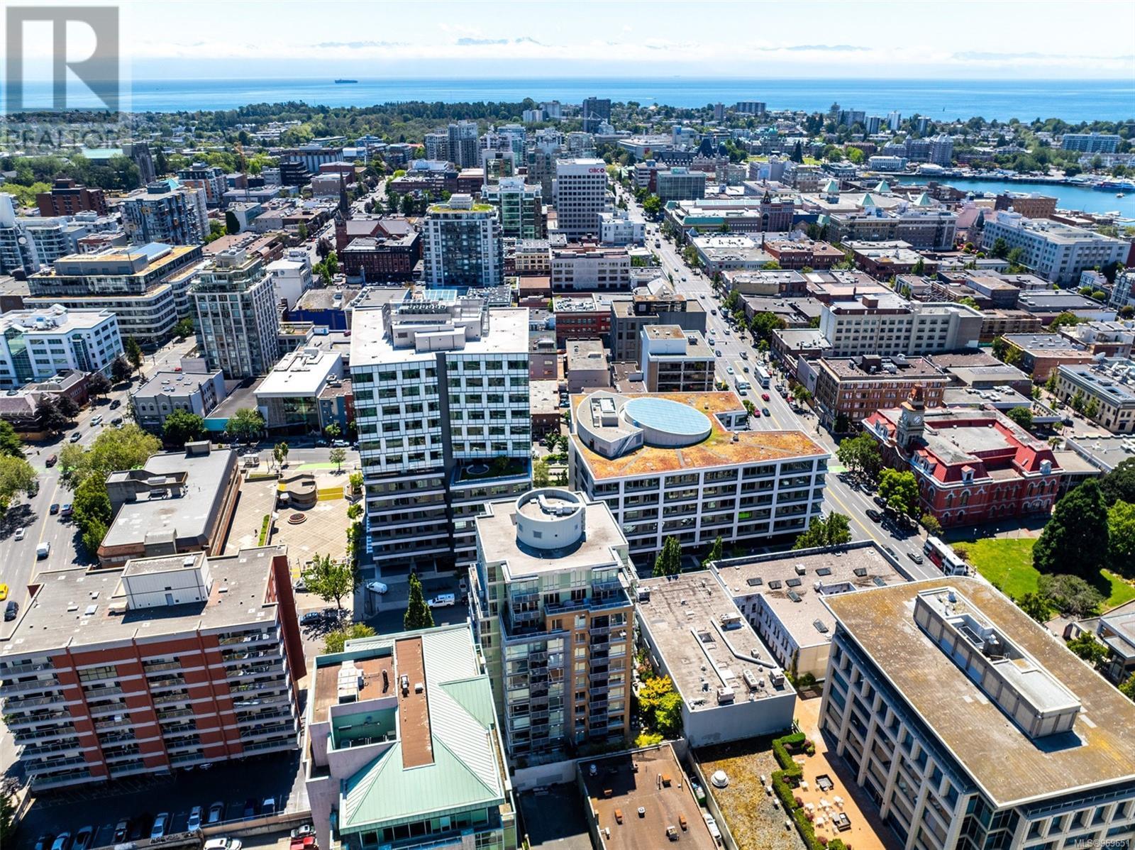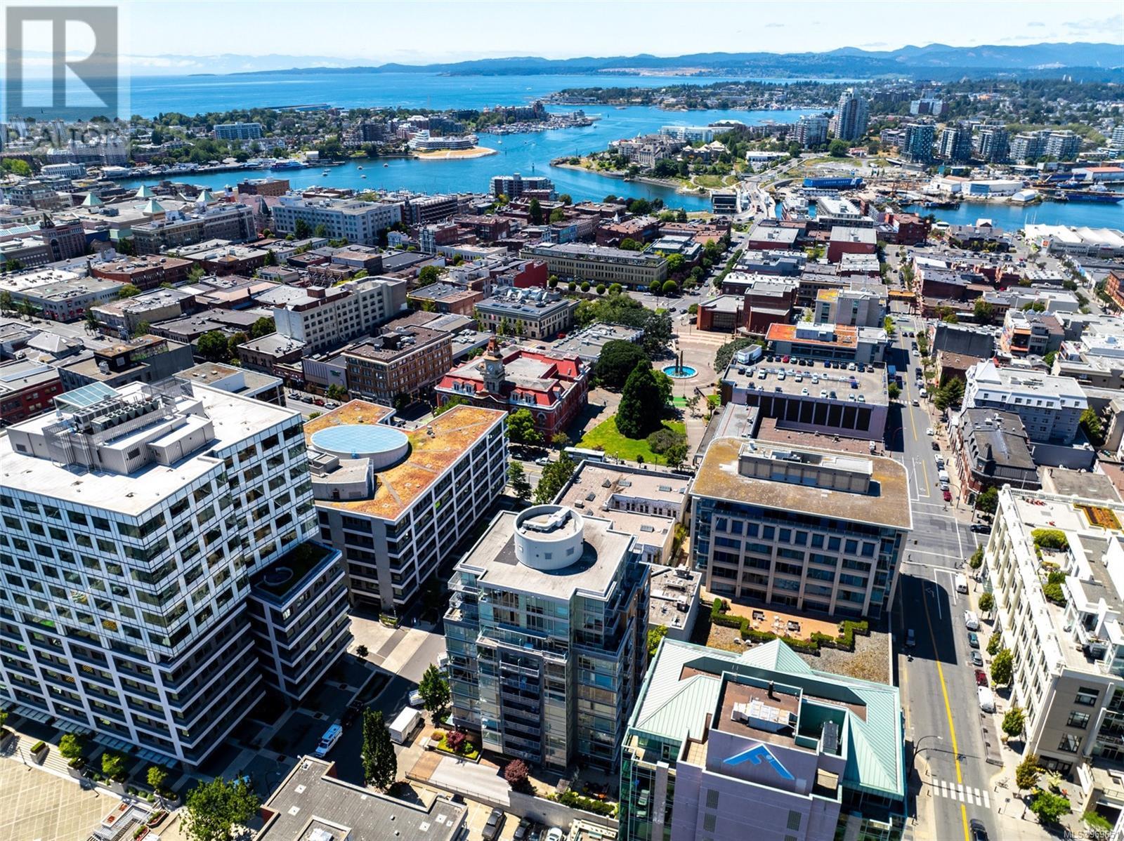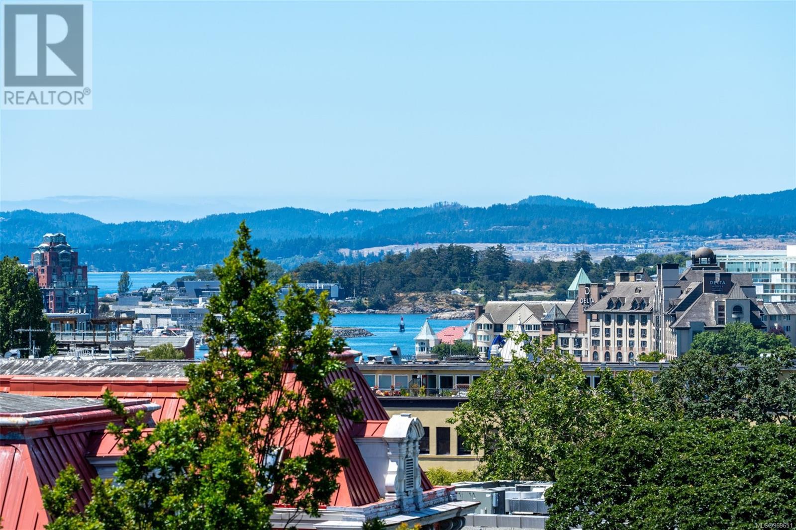 Terrific South West corner one bedroom and den condo with fantastic VIEWS of the inner harbour. The moment you enter this suite you will love the functional layout and views of the harbour from the massive floor to ceiling windows. Conveniently located on a quiet street in the heart of downtown, it's a quick walk to Chinatown, the harbour and all the shops you could ever need. This secure and solid steel & concrete building has a luxurious feel and has a resident caretaker ensuring you always feel at home. There are rich hardwood floors, stainless steel appliances, breakfast bar with in-suite laundry. It's pet friendly, allows rentals and has a secure parking space with additional storage. (id:22211)