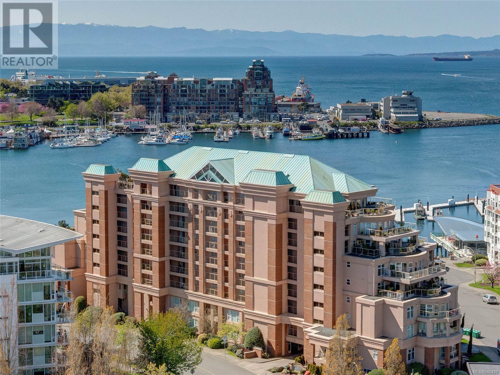 Outstanding SOUTHWEST OCEAN & OLYMPIC MOUNTAIN VIEWS, fabulous sunsets, and watch all the activity at the entrance to Victoria Harbour from this 2 bedroom PLUS den 8TH FLOOR unit at Mariners Landing - one of Victoria's premier condominium residences. Spacious living room with new cozy gas fireplace, separate dining area,breakfast nook in the kitchen, large covered balcony that can be accessed from the kitchen, living room & master bedroom. Large master bedroom with lots of closets, well appointed ensuite with a separate shower and soaker tub - good separation of space from the master to the guest bedroom and den. Lots of possibilities to update to create your own home - Strata is very amenable to renovations. Mariners Landing has a strong financial history, well managed & great community spirit within the building. Small pets, bbq's permitted, large workshop, library, beautiful inner courtyard, secured underground parking, substantial contingency fund. (id:22211)