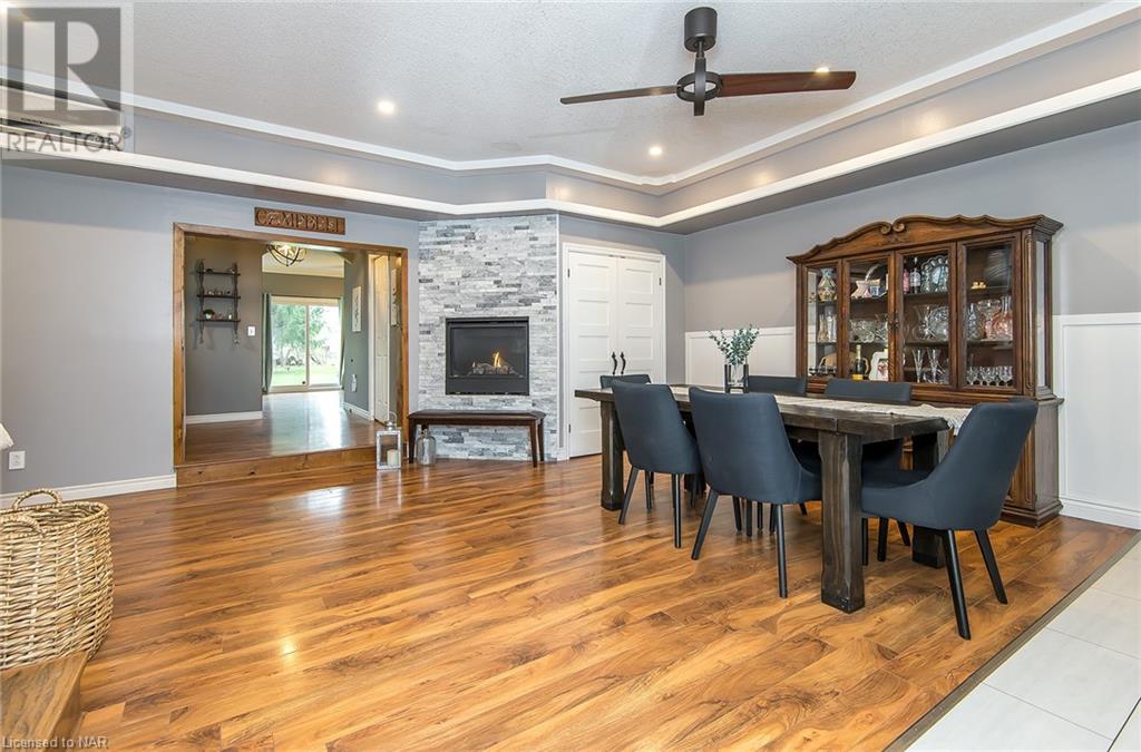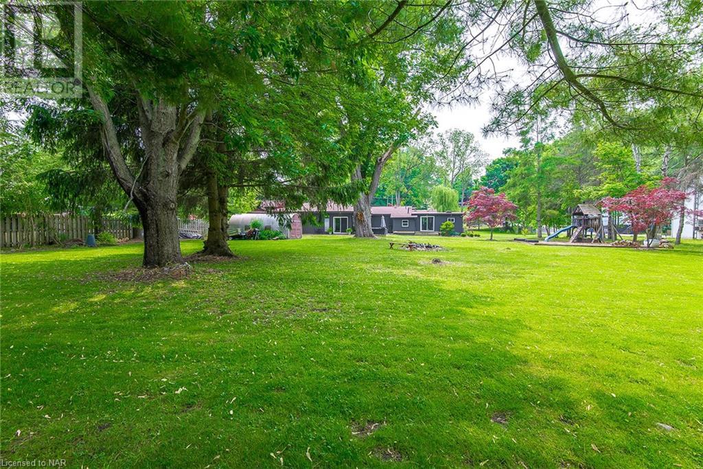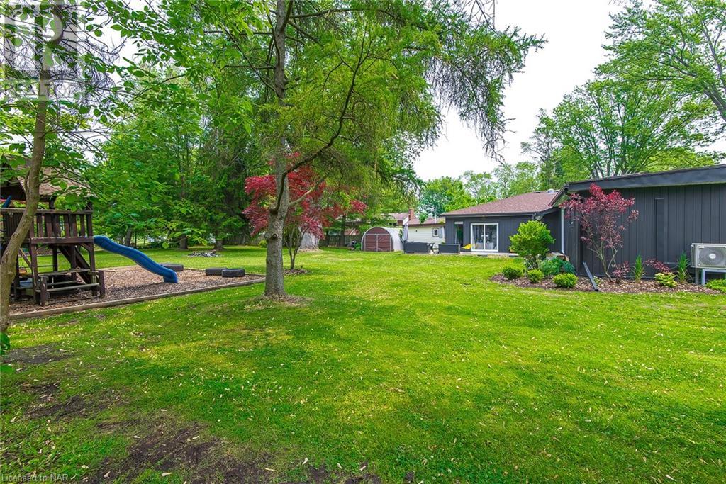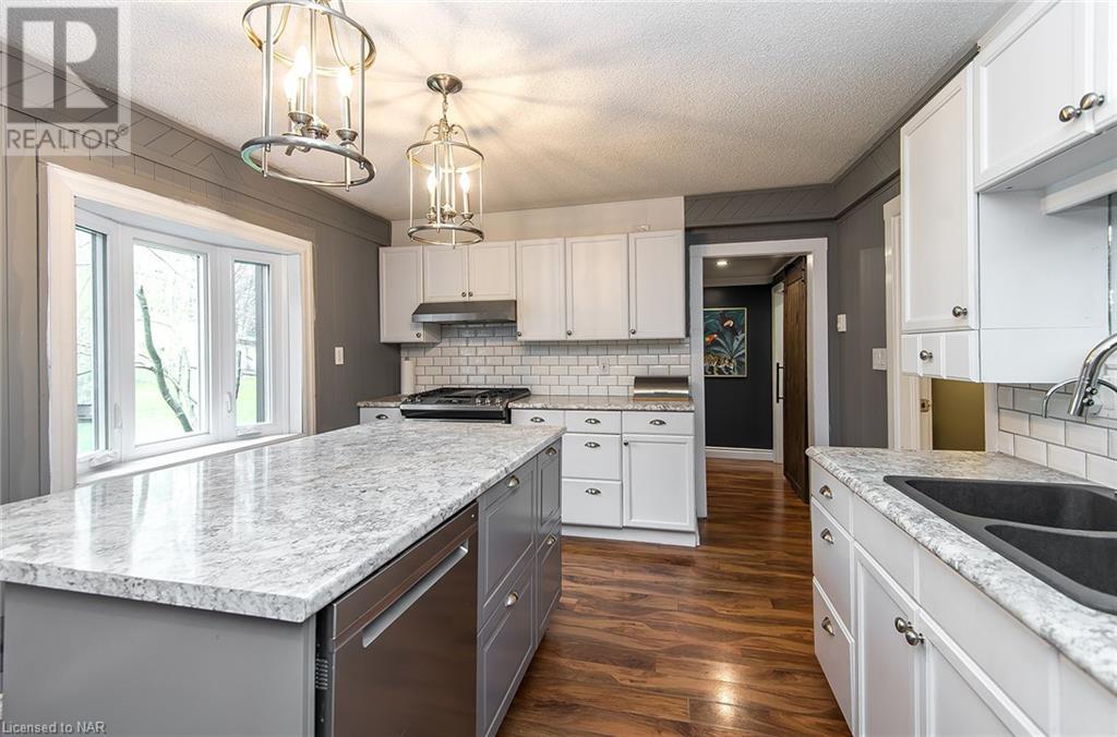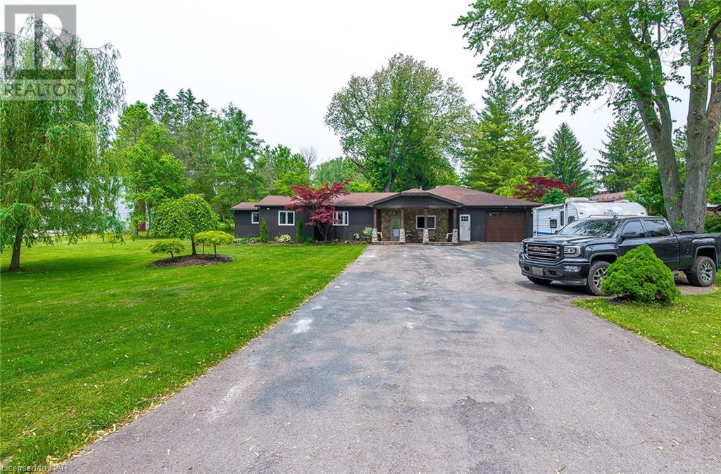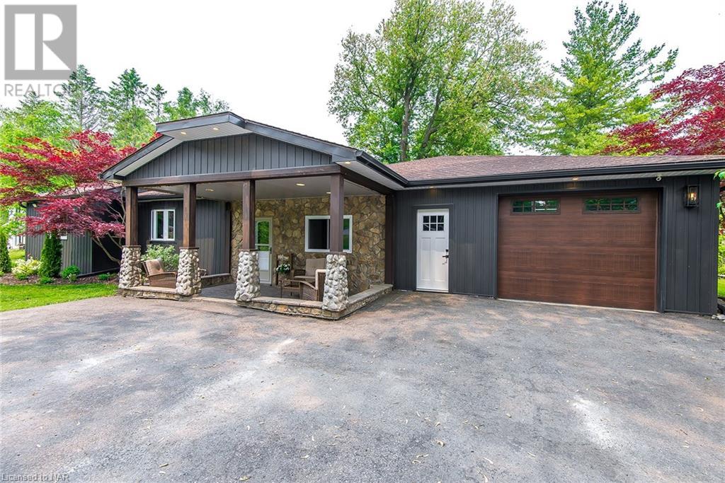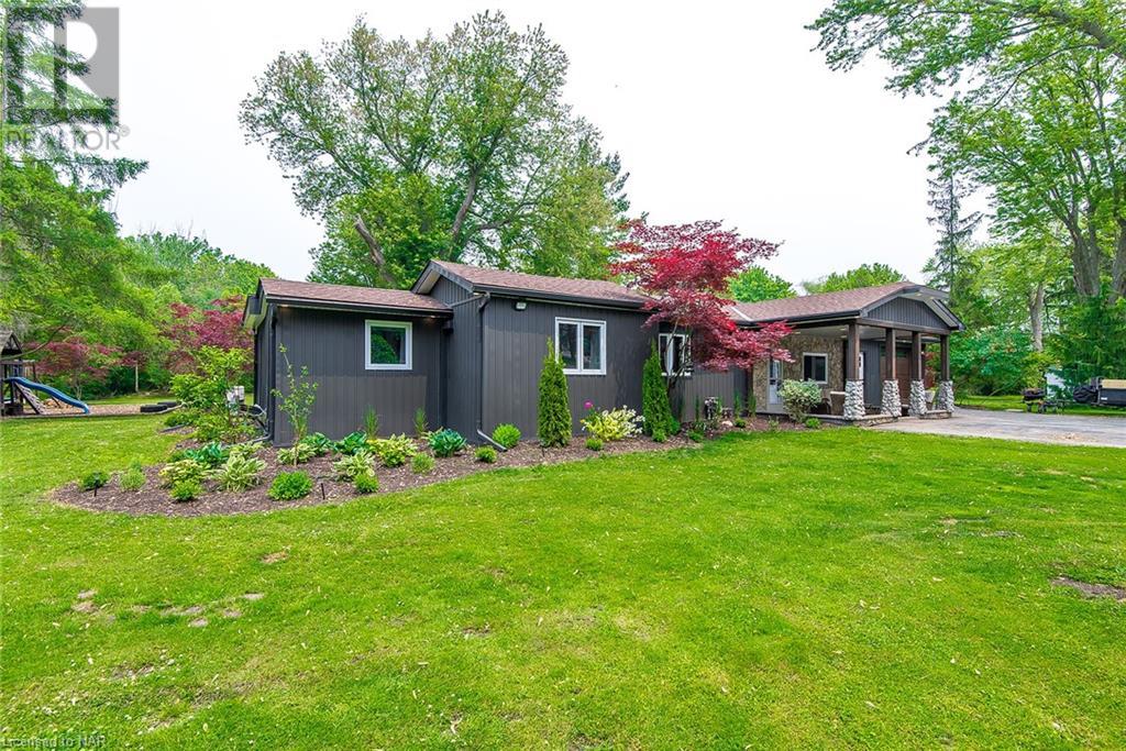 Stunning treed setting across the street from the lake! Beautifully updated 4 bedroom, 1.5 bathroom bungalow situated on a .86 acre lot, just minutes outside of Port Colborne. Large kitchen with island. Separate spacious dining room with office space. Living room features in-floor heating with patio doors to the rear yard. Four generous sized bedrooms, with sliding doors of the primary bedroom. One car attached garage with an insulated, in-floor heated shop with hydro. Park-like rear yard with tons of space for entertaining. Many updates include siding 2022, garage door with opener 2022, most windows 2022, AC units in bedrooms 2021, gas fireplace 2019. (id:22211)