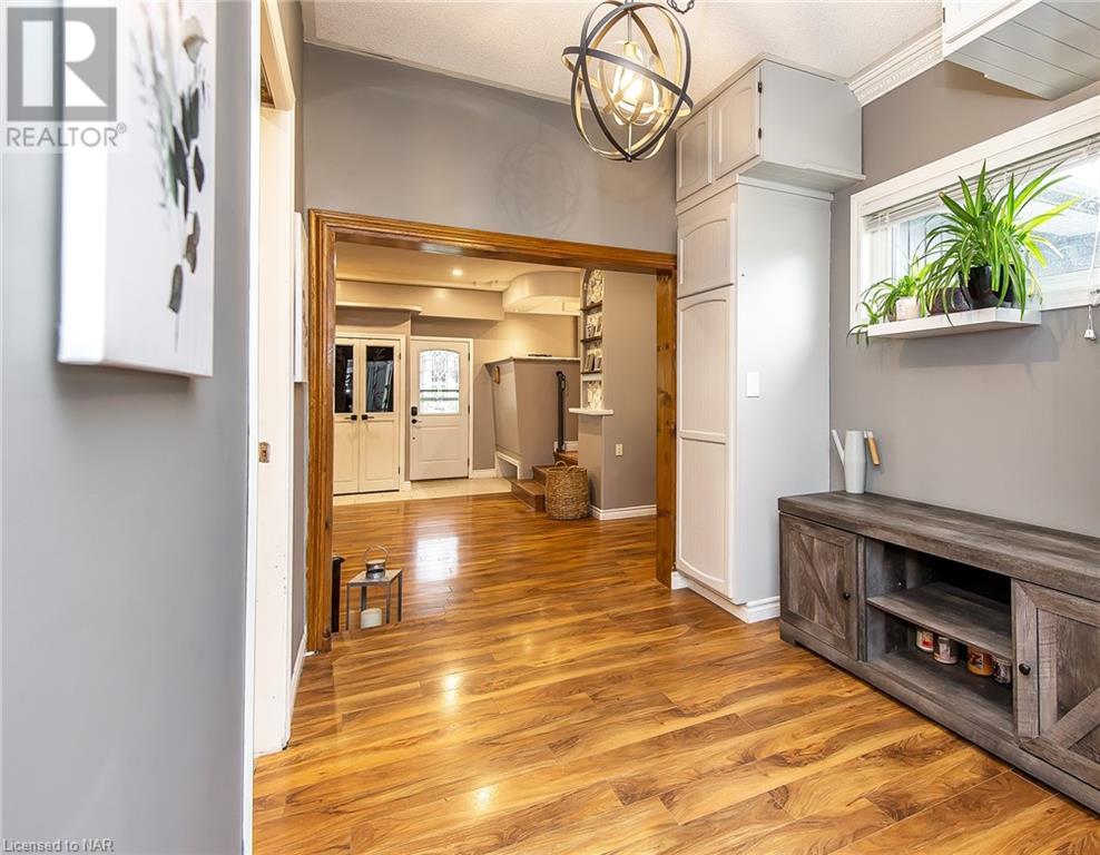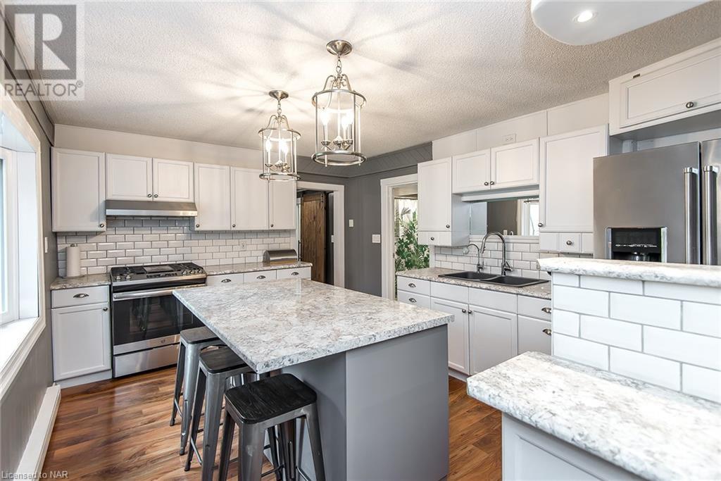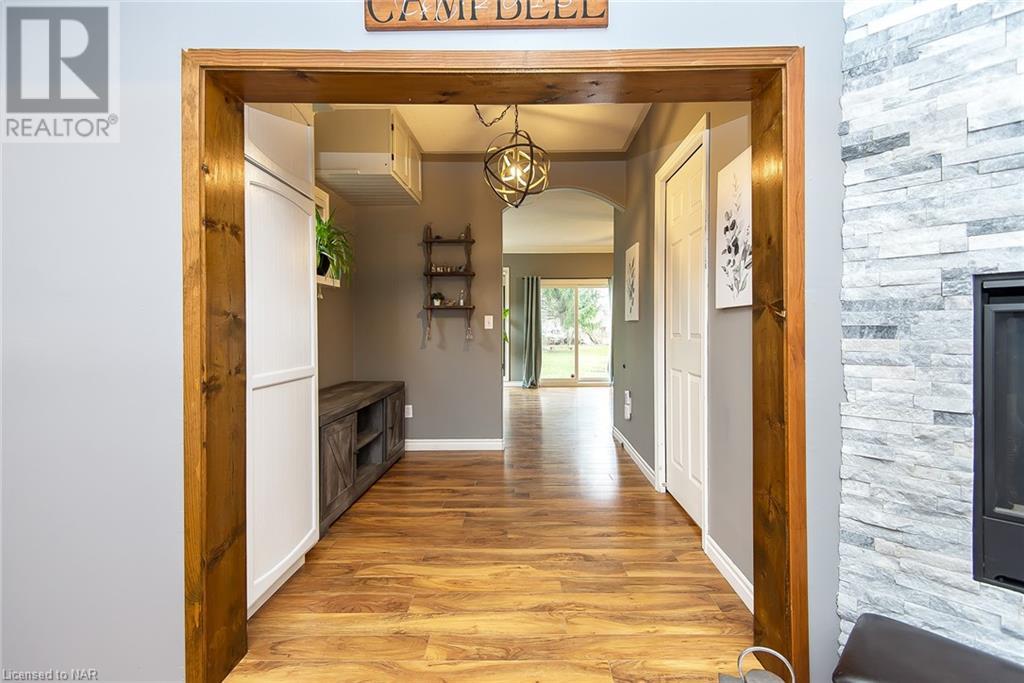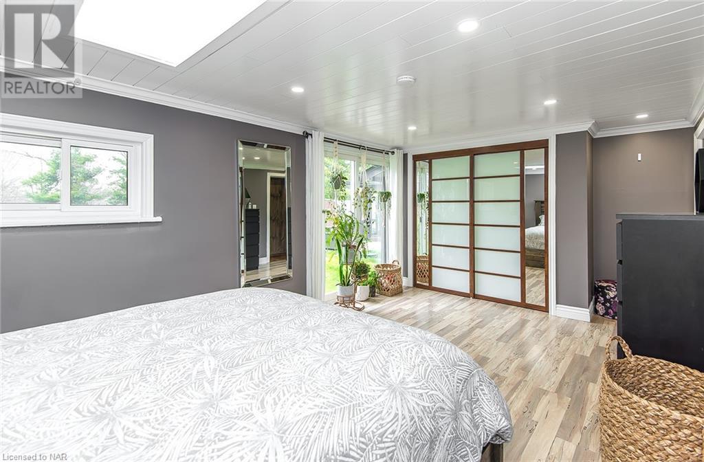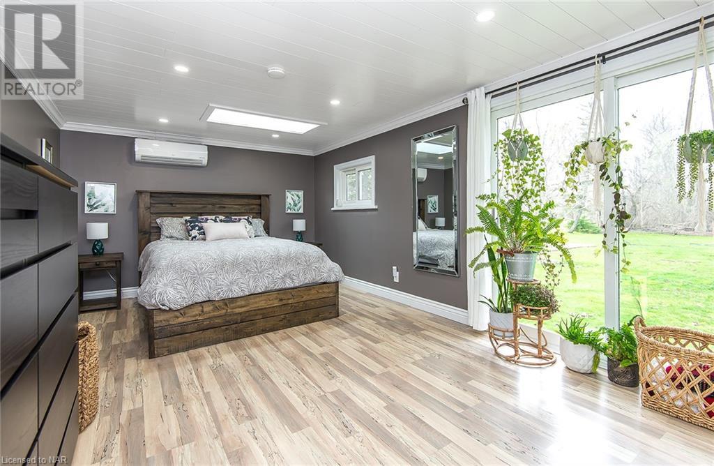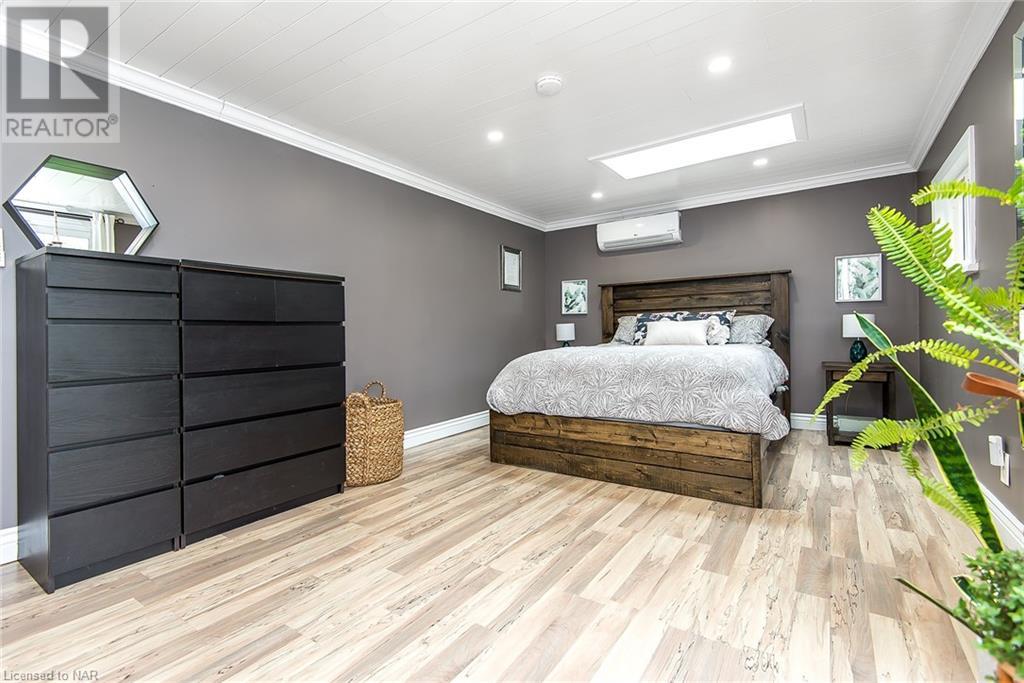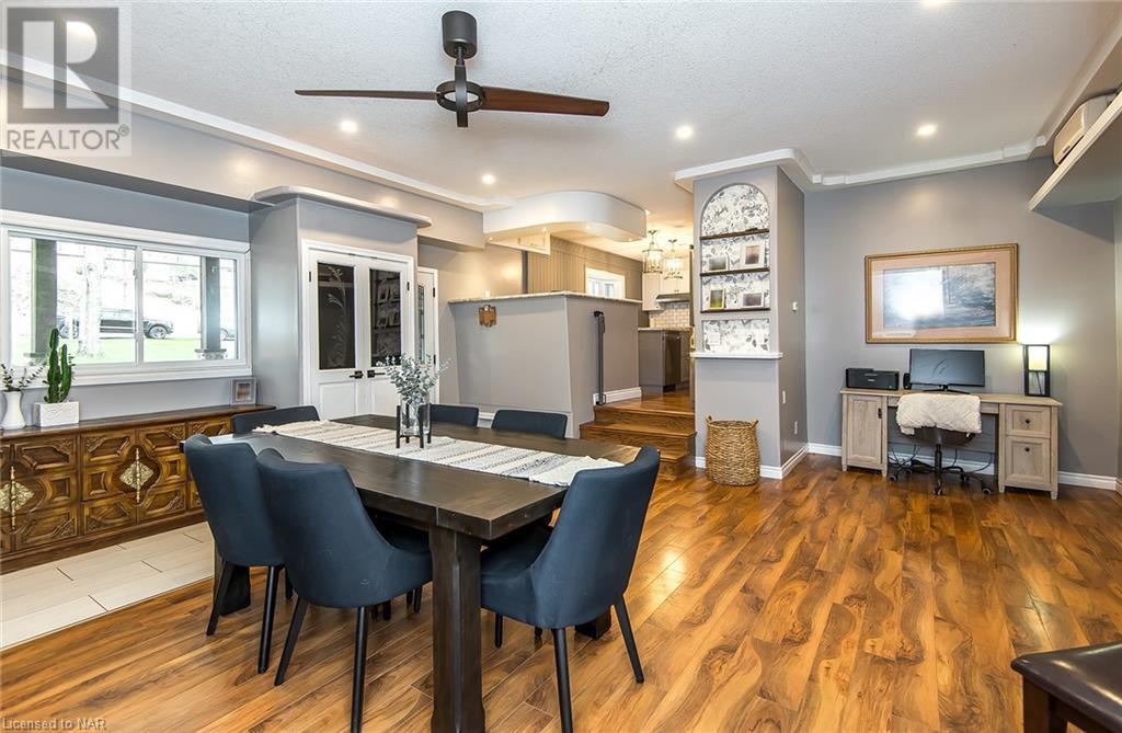 Stunning treed setting across the street from the lake! Beautifully updated 4 bedroom, 1.5 bathroom bungalow situated on a .86 acre lot, just minutes outside of Port Colborne. Large kitchen with island. Separate spacious dining room with office space. Living room features in-floor heating with patio doors to the rear yard. Four generous sized bedrooms, with sliding doors of the primary bedroom. One car attached garage with an insulated, in-floor heated shop with hydro. Park-like rear yard with tons of space for entertaining. Many updates include siding 2022, garage door with opener 2022, most windows 2022, AC units in bedrooms 2021, gas fireplace 2019. (id:22211)