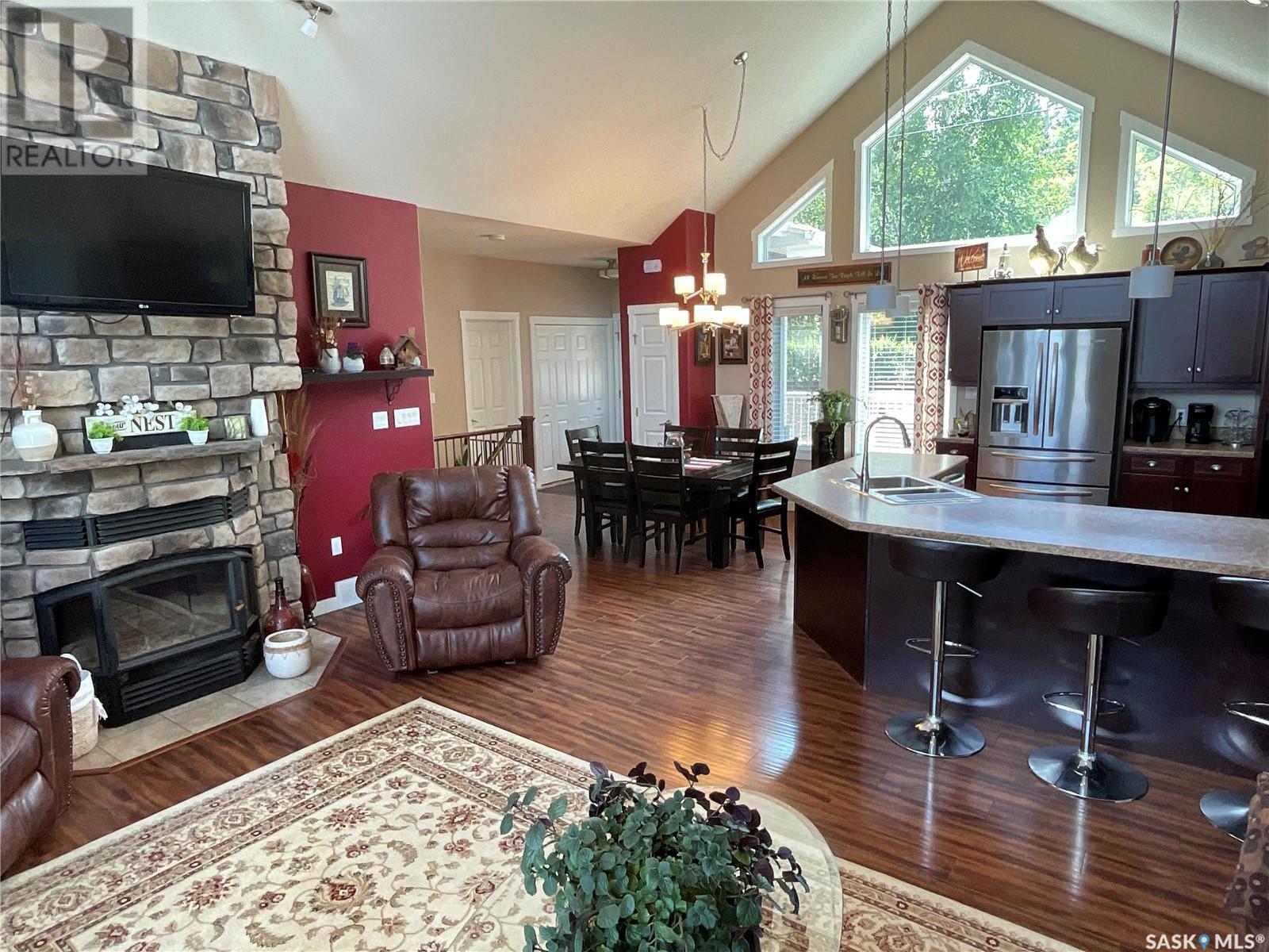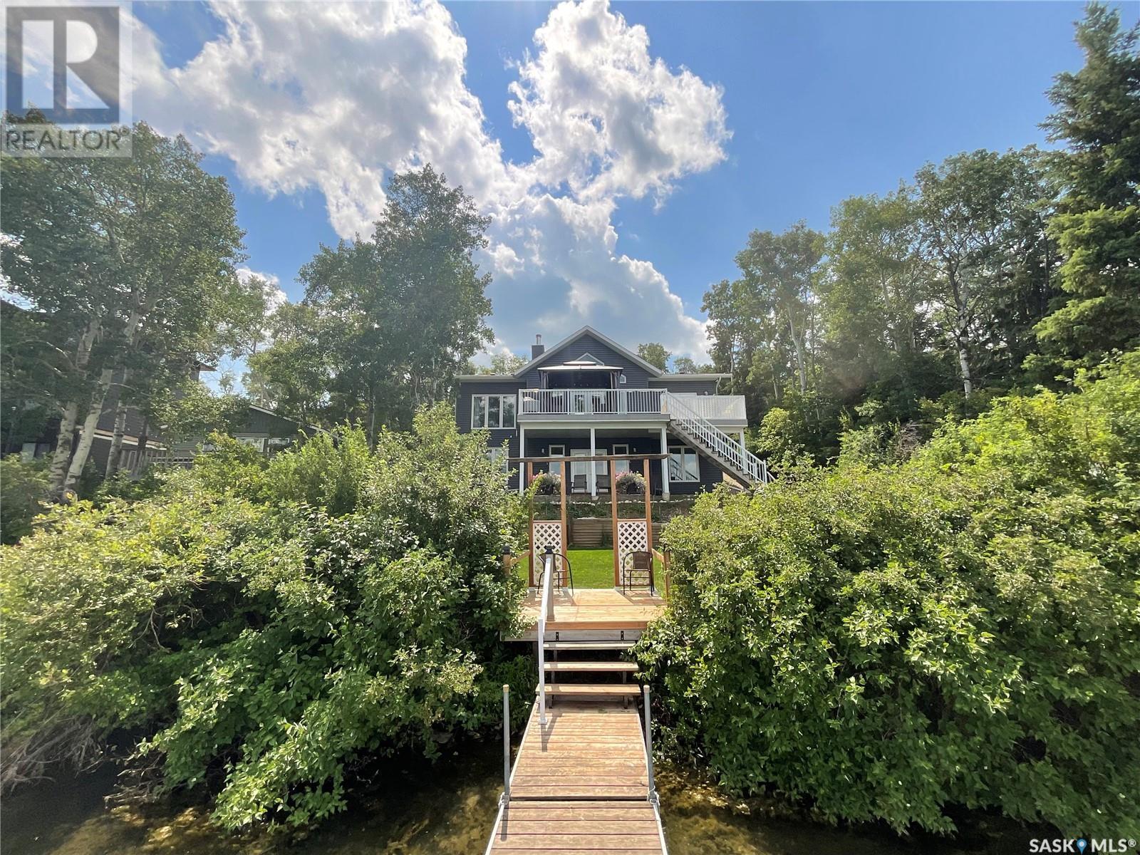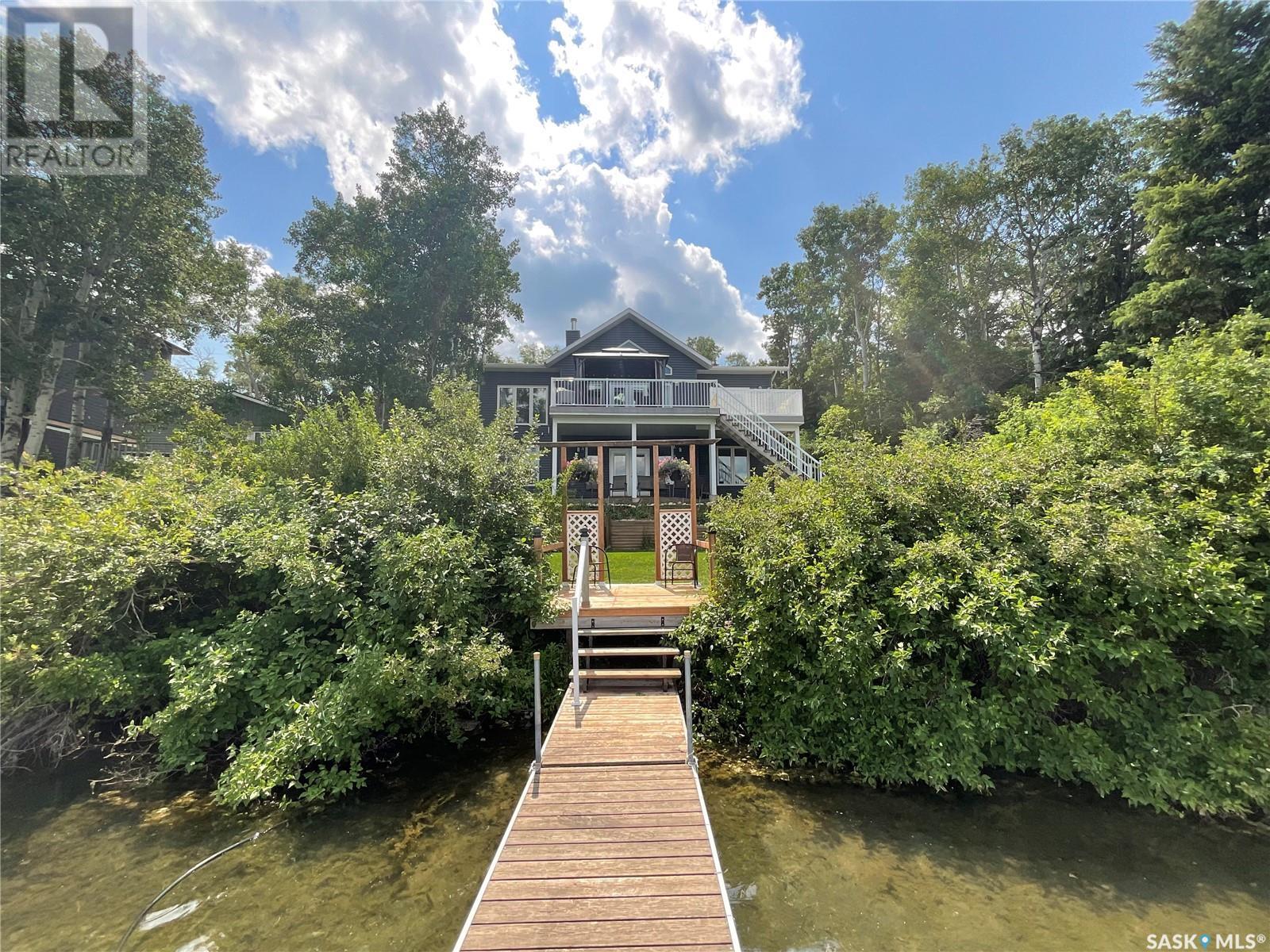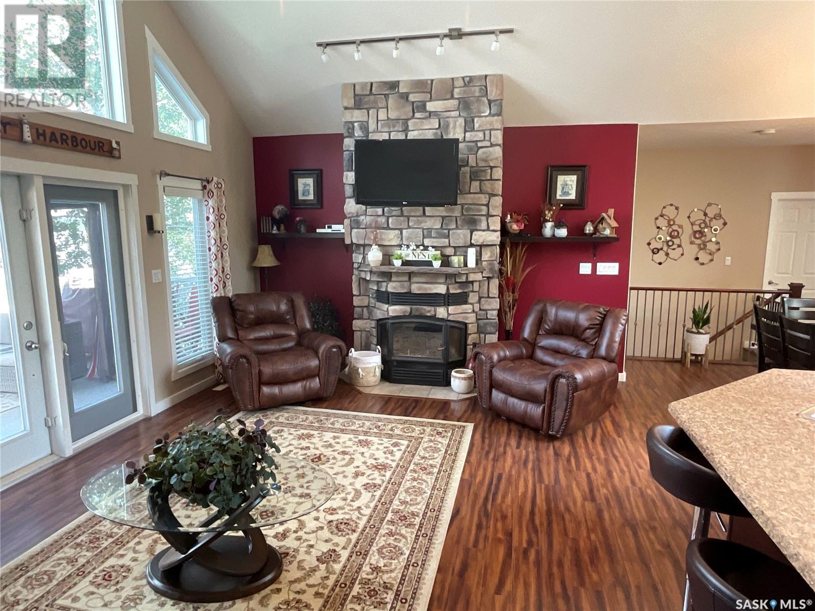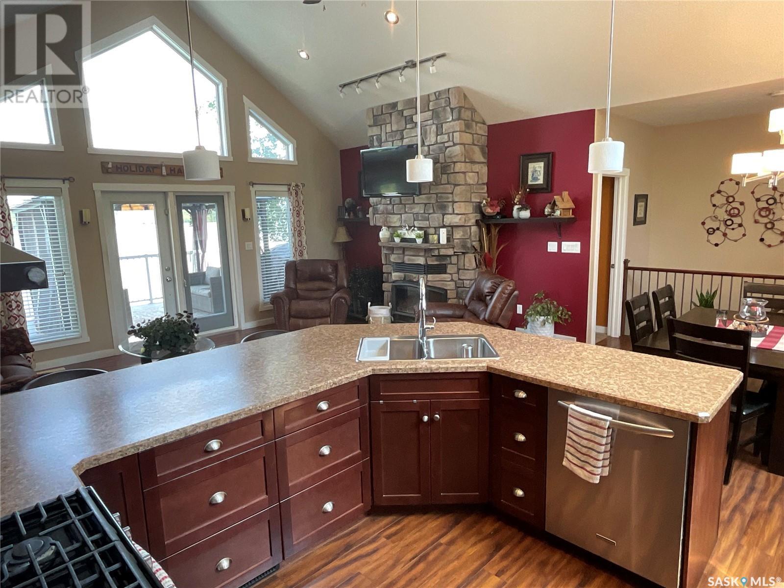 Enjoy the quiet serenity of Wakaw Lake from your beautiful four-season walkout overlooking the lake, only 3 km from the Wakaw town site. At the front you'll find a lovely garden and a covered veranda. Inside the main living area is bright and inviting with huge vaulted ceilings, floor to ceiling windows and laminate flooring throughout. Enjoy the warmth and comfort of the wood burning fireplace, in the spacious living room, overlooking the lake. The kitchen is a dream, offering plenty of cupboard and counter space with a massive built in island with breakfast bar seating, and a walk-in pantry. There's a built in oven, gas range and dishwasher, and the stainless steel fridge is also included. Off the main living area is the primary bedroom suite which has a walk-in closet, a three-piece bathroom and a garden door to the upper deck. Also on the main level are another bedroom, a full four-piece bathroom and the laundry room. The fully developed lower level has a huge family/games room with direct access to the lower deck, an additional two bedrooms and another full four-piece bathroom. Coming out the back, there's a spacious lawn area and a dock onto the lake which is included as well. (id:22211)