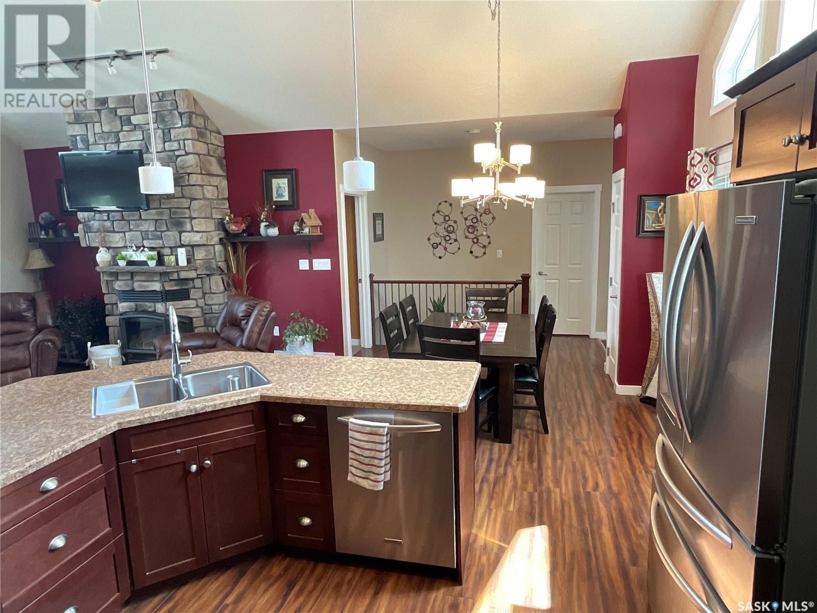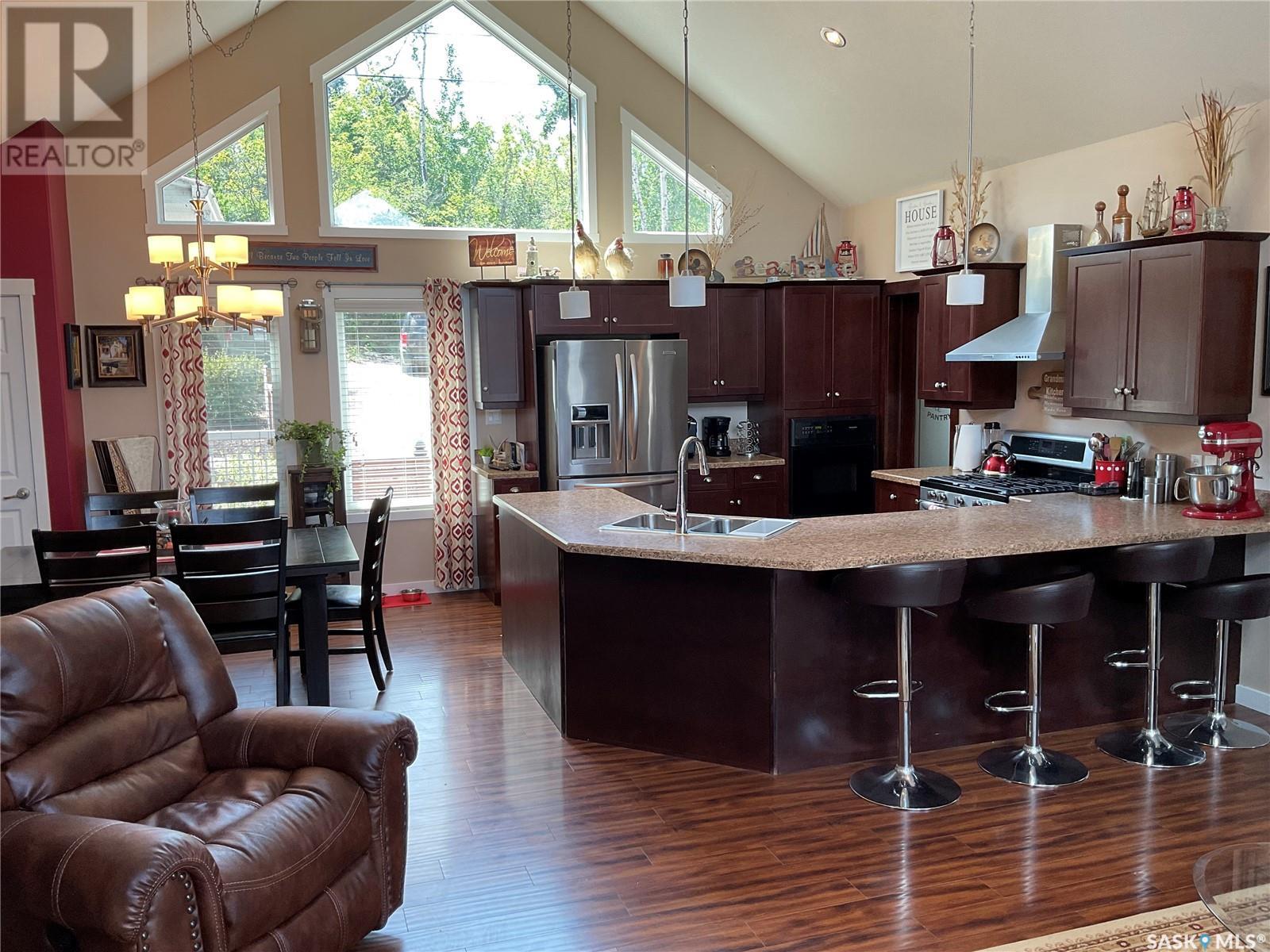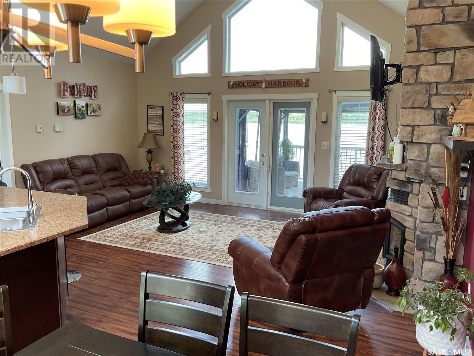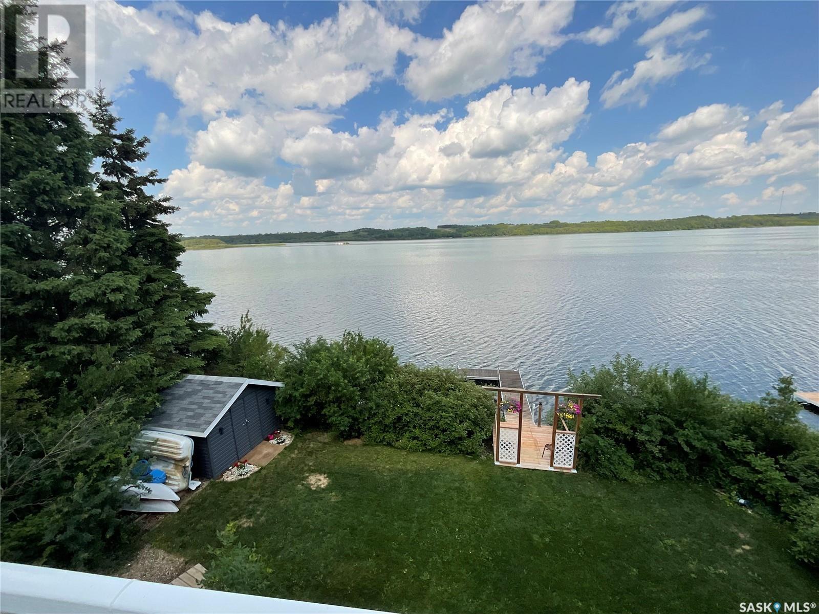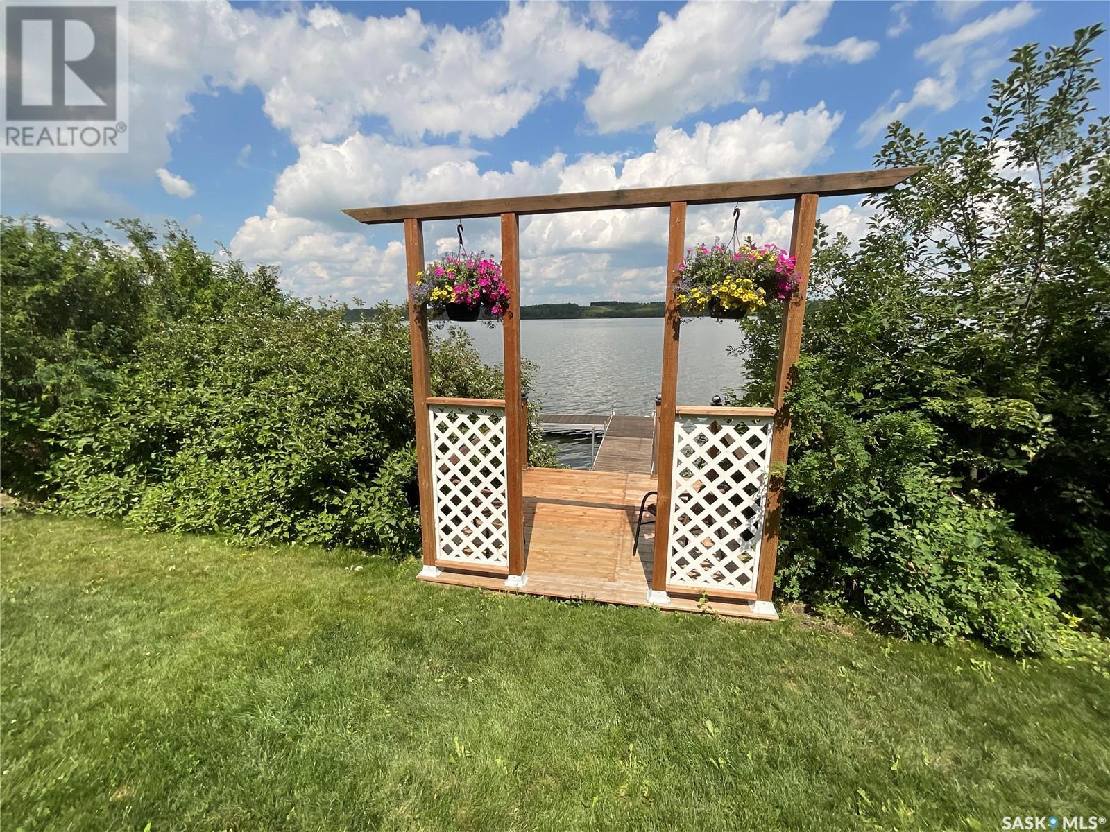 Enjoy the quiet serenity of Wakaw Lake from your beautiful four-season walkout overlooking the lake, only 3 km from the Wakaw town site. At the front you'll find a lovely garden and a covered veranda. Inside the main living area is bright and inviting with huge vaulted ceilings, floor to ceiling windows and laminate flooring throughout. Enjoy the warmth and comfort of the wood burning fireplace, in the spacious living room, overlooking the lake. The kitchen is a dream, offering plenty of cupboard and counter space with a massive built in island with breakfast bar seating, and a walk-in pantry. There's a built in oven, gas range and dishwasher, and the stainless steel fridge is also included. Off the main living area is the primary bedroom suite which has a walk-in closet, a three-piece bathroom and a garden door to the upper deck. Also on the main level are another bedroom, a full four-piece bathroom and the laundry room. The fully developed lower level has a huge family/games room with direct access to the lower deck, an additional two bedrooms and another full four-piece bathroom. Coming out the back, there's a spacious lawn area and a dock onto the lake which is included as well. (id:22211)