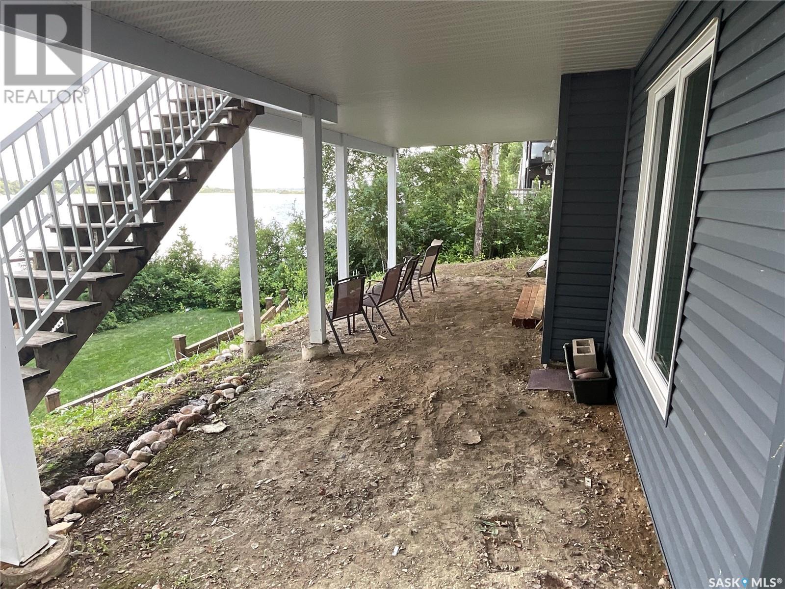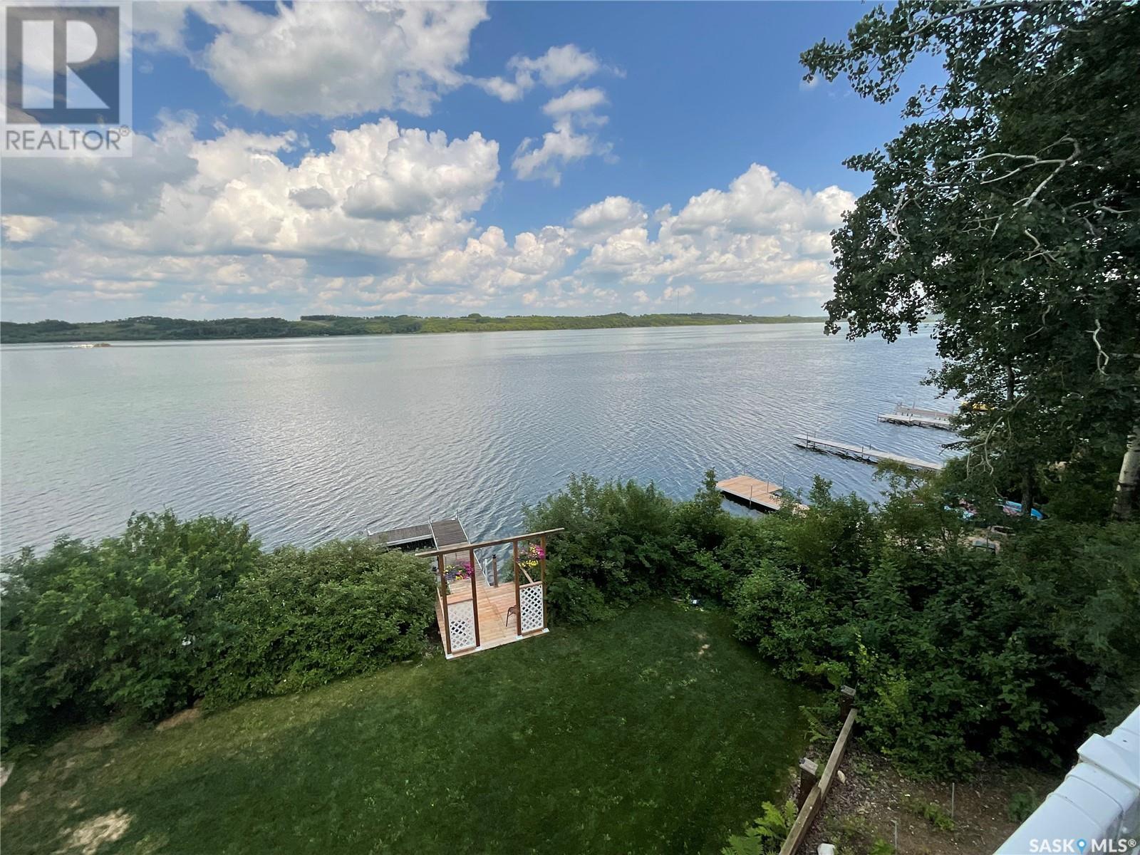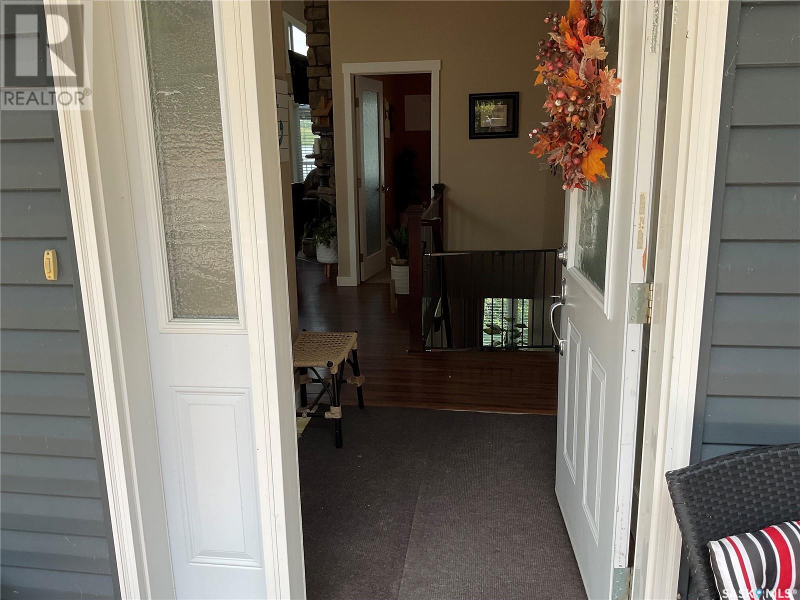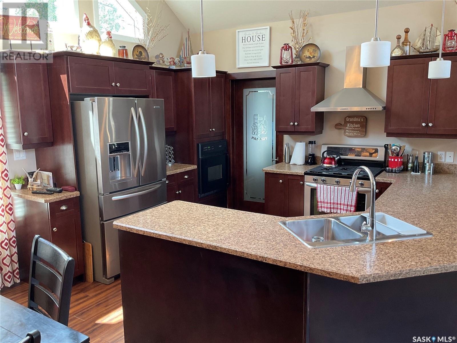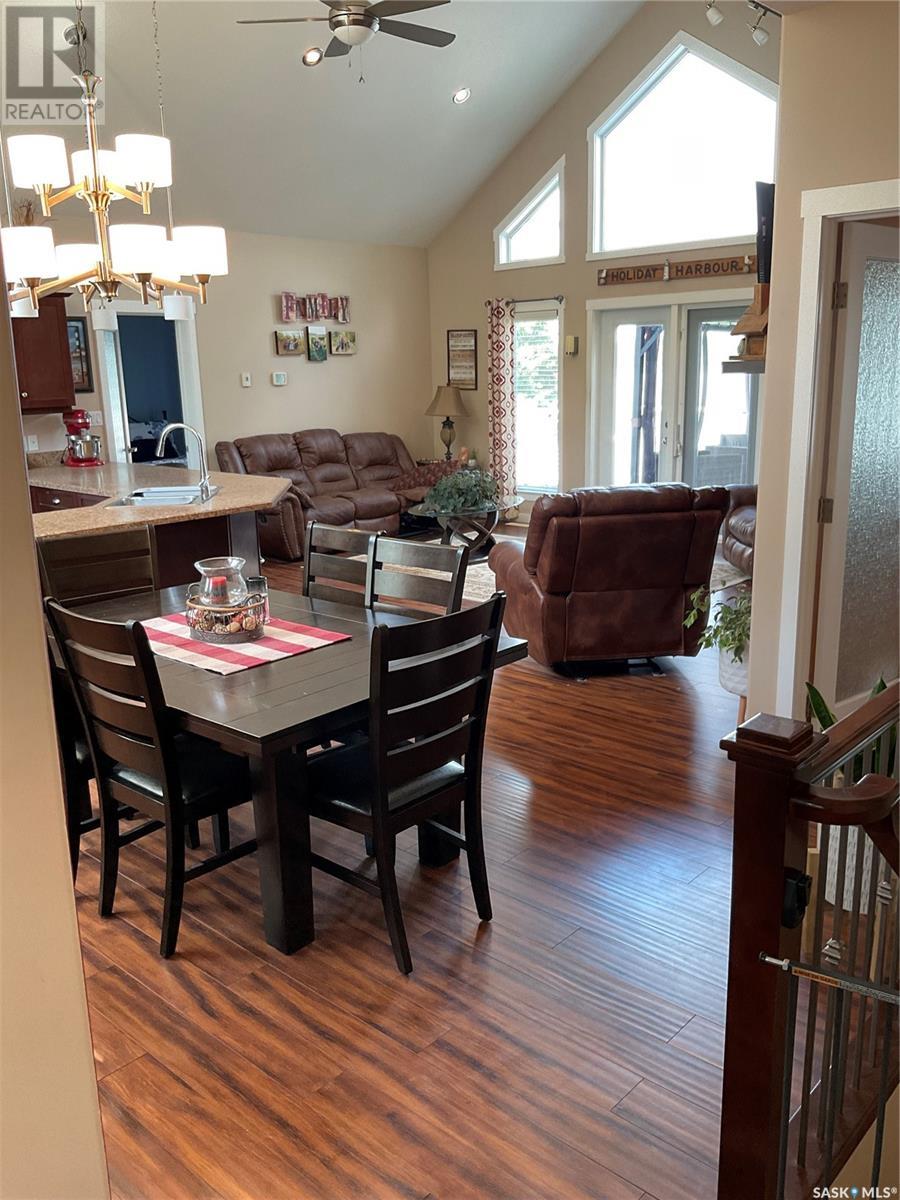 Enjoy the quiet serenity of Wakaw Lake from your beautiful four-season walkout overlooking the lake, only 3 km from the Wakaw town site. At the front you'll find a lovely garden and a covered veranda. Inside the main living area is bright and inviting with huge vaulted ceilings, floor to ceiling windows and laminate flooring throughout. Enjoy the warmth and comfort of the wood burning fireplace, in the spacious living room, overlooking the lake. The kitchen is a dream, offering plenty of cupboard and counter space with a massive built in island with breakfast bar seating, and a walk-in pantry. There's a built in oven, gas range and dishwasher, and the stainless steel fridge is also included. Off the main living area is the primary bedroom suite which has a walk-in closet, a three-piece bathroom and a garden door to the upper deck. Also on the main level are another bedroom, a full four-piece bathroom and the laundry room. The fully developed lower level has a huge family/games room with direct access to the lower deck, an additional two bedrooms and another full four-piece bathroom. Coming out the back, there's a spacious lawn area and a dock onto the lake which is included as well. (id:22211)