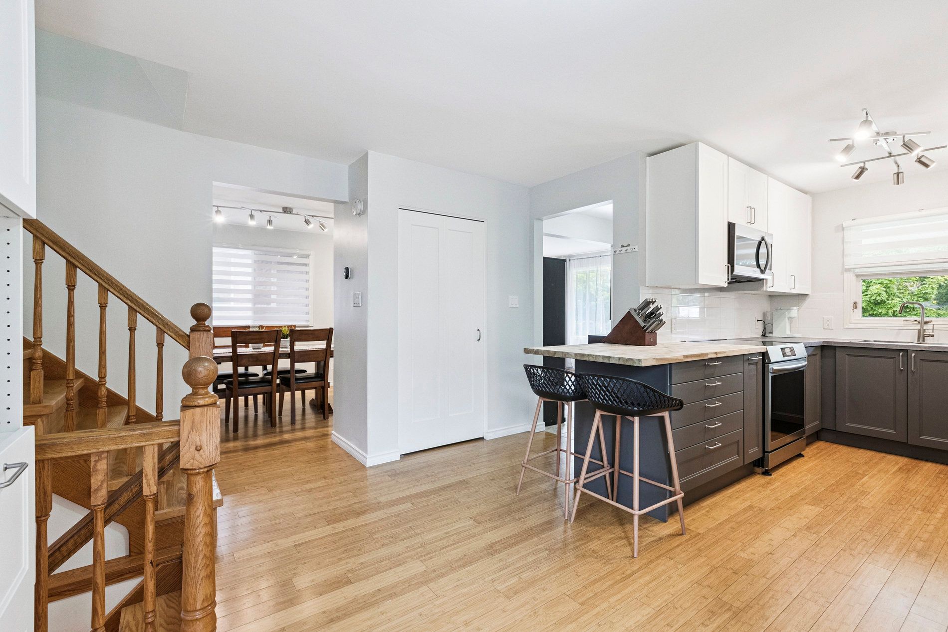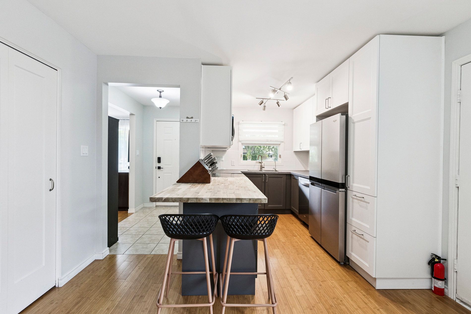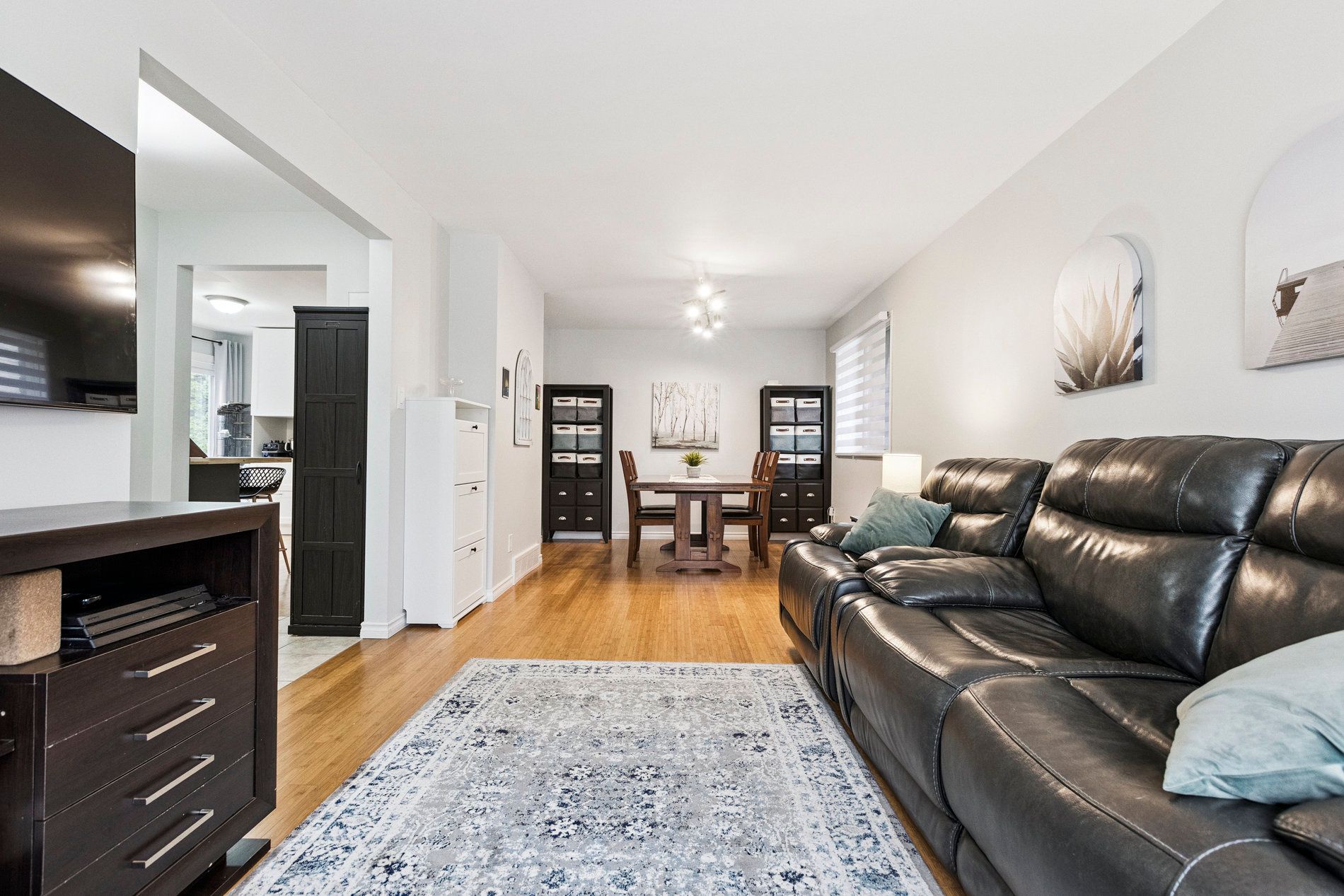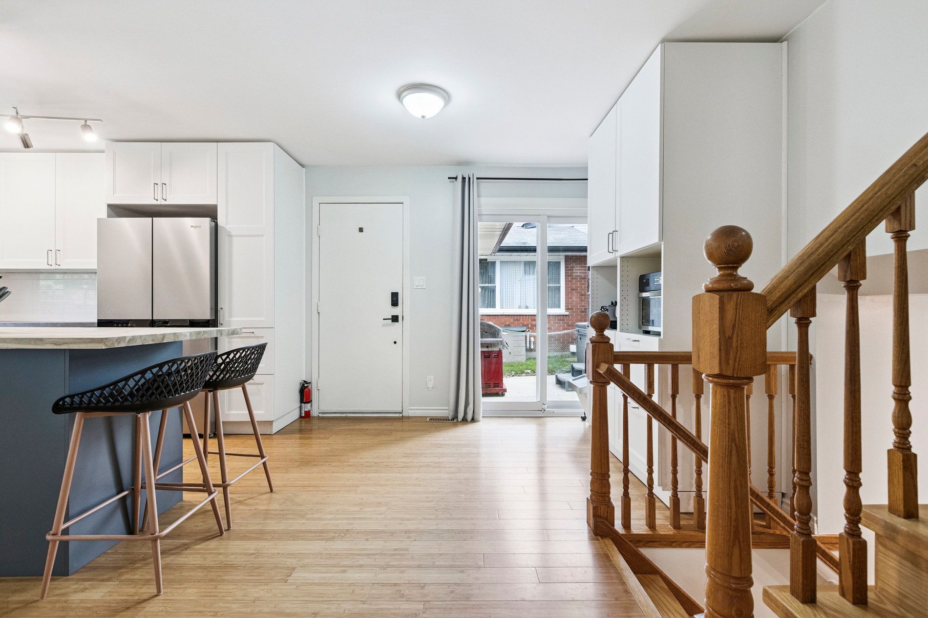 主楼层采用开放式客厅与餐厅一体化设计。2023年全新改造的现代厨房令人惊艳,配备双色定制橱柜与全新不锈钢电器,提供充足操作台面,并设有通往后院和车库的出口。上层包含三间宽敞卧室及2023年翻新的四件套浴室。