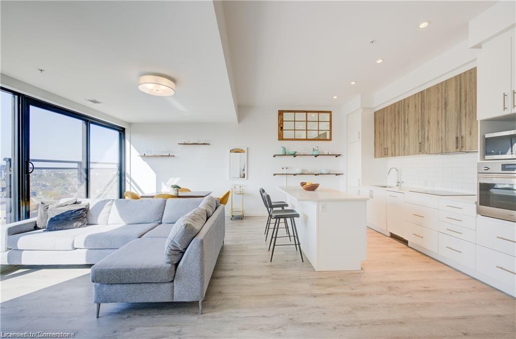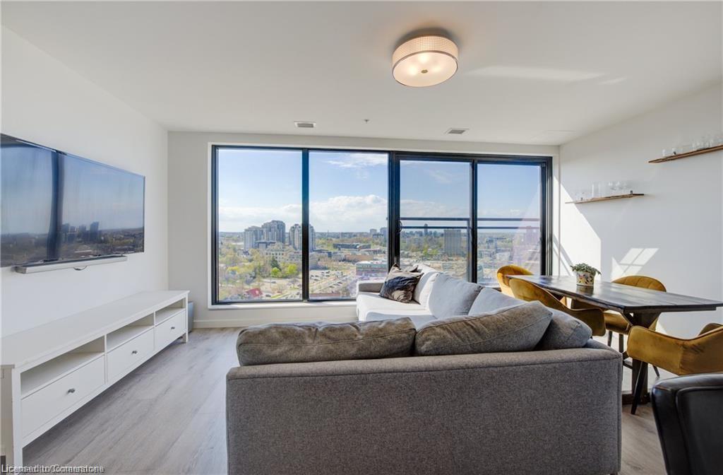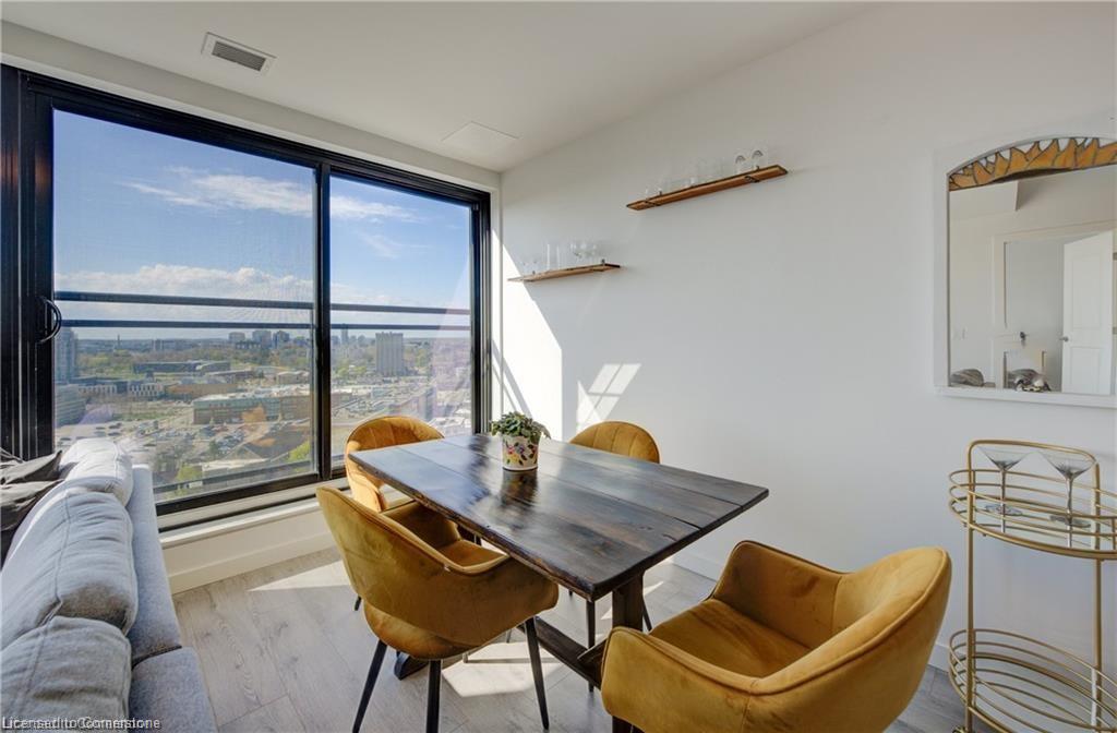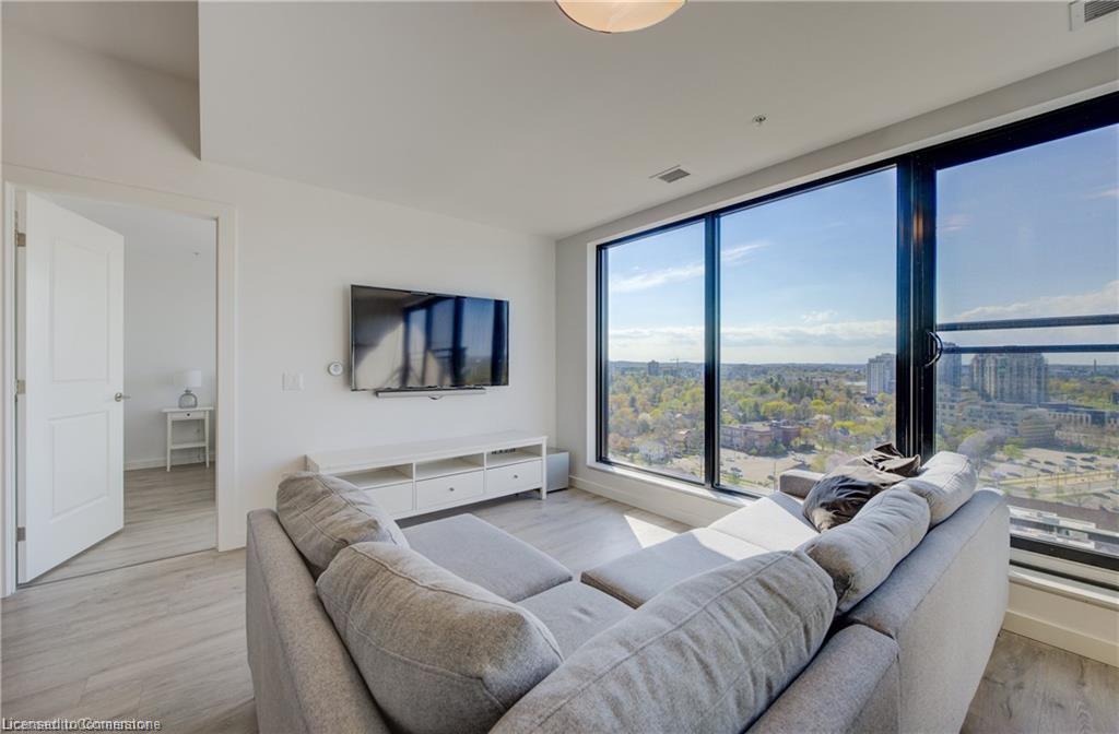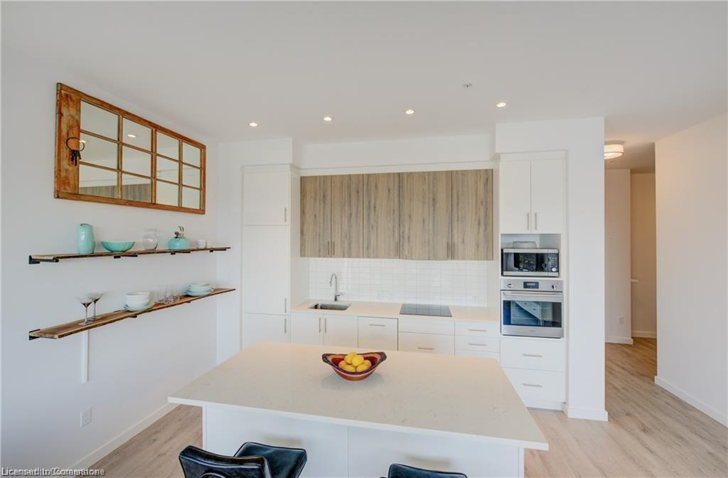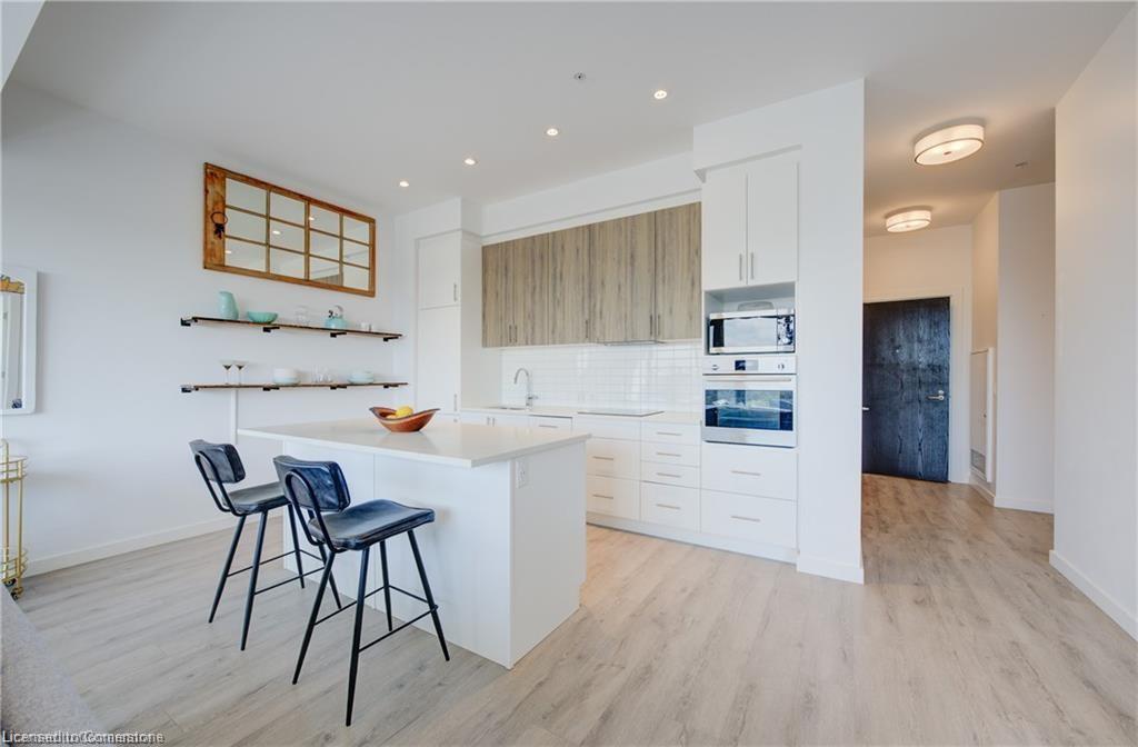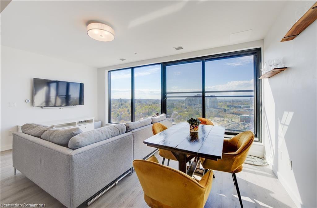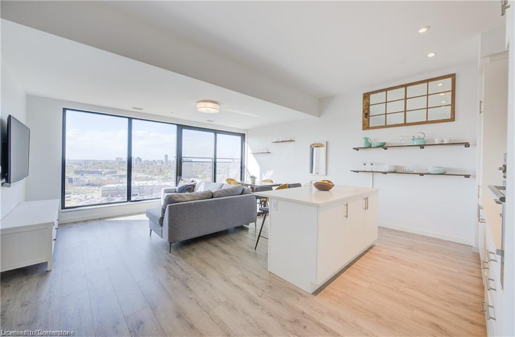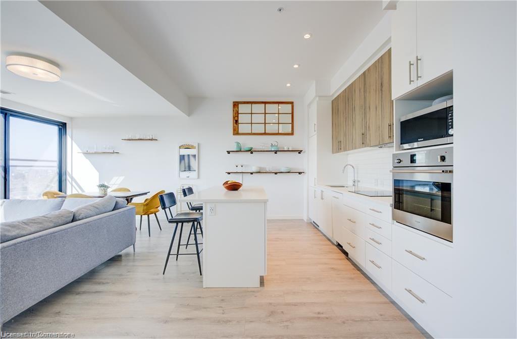 Investors, Parents of University Kids, Recently Separated/Divorced, as well as New Canadians, Company Employees or Executives will love this FULLY FURNISHED 836 Square Foot Suite at CIRCA 1877. Yes, the right offer gets you most furniture, dishes, cookware, housewares…just move in! Suite can be purchased unfurnished, too! Expect to be impressed by the high ceilings, upscale finishes, amenities and details in this tastefully appointed 1 bath, 1 bedroom + den suite. Luxury vinyl plank throughout. Open concept kitchen features elegant dual-tone cabinetry, subway tile backsplash, panel fridge-freezer, wall oven, cooktop set in quartz counters, plus matching island top with eat-at breakfast bar. One-foot+ (16 inch) taller ceiling height in the kitchen and den areas adds to the bright, airy feeling. Oversized floor-to-ceiling windows and Juliette balcony afford amazing views of the skyline, treetops, and Uptown Waterloo—sunsets included. Custom built-in cabinetry and desktop in den area create an ideal work-from-home space. Walk-in closet serves the bedroom. Luxurious 3-piece bath with tasteful tile and glass shower. Just off the hallway are stacked laundry units. Owned garage parking space, plus owned storage locker. Short walk to boutique shops, vibrant restaurants, Vincenzo’s, and ION LRT stops. Iron Horse Trail nearby for biking. Unrivaled amenities include: rooftop Terrace; sky view Pool; outdoor BBQ area and Fire Tables; Co-Working Space; Indoor Entertainment Lounge with reading area, bar, seating of all types; Practitioner’s Room; Fitness Studio; Indoor/Outdoor Yoga Studio; WiFi building-wide; Bike Room. The hospital is nearby. Short term rentals like Airbnb are permitted at this unit as per condo declaration, and building does not require city rental license! Suite 1505 at 181 King South truly promotes a lifestyle or investor profile without compromise! Why not purchase with a friend or parent with adult child to share the cost and the value? Photos from May 2024.