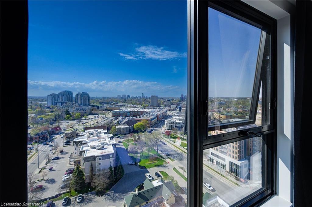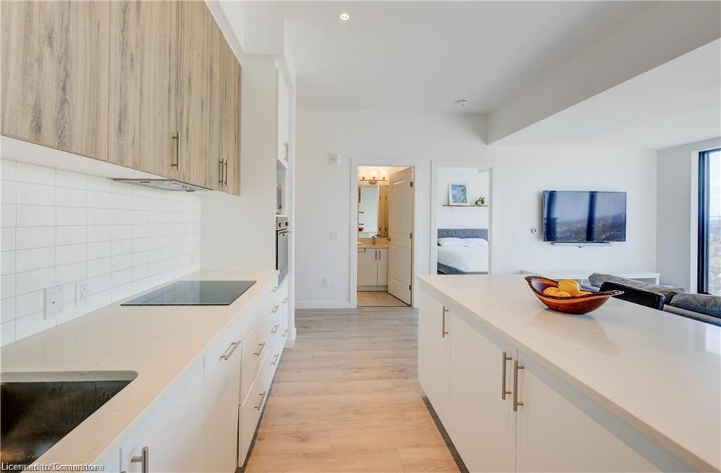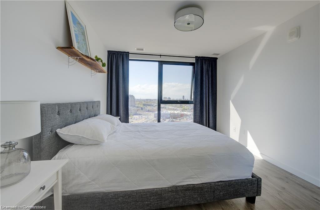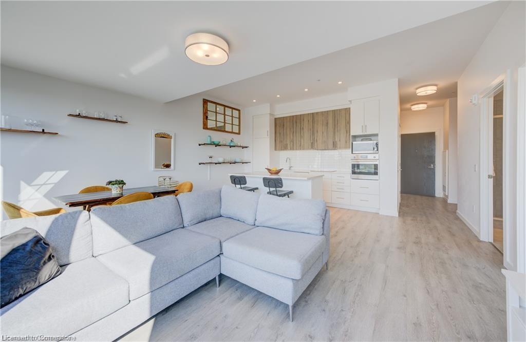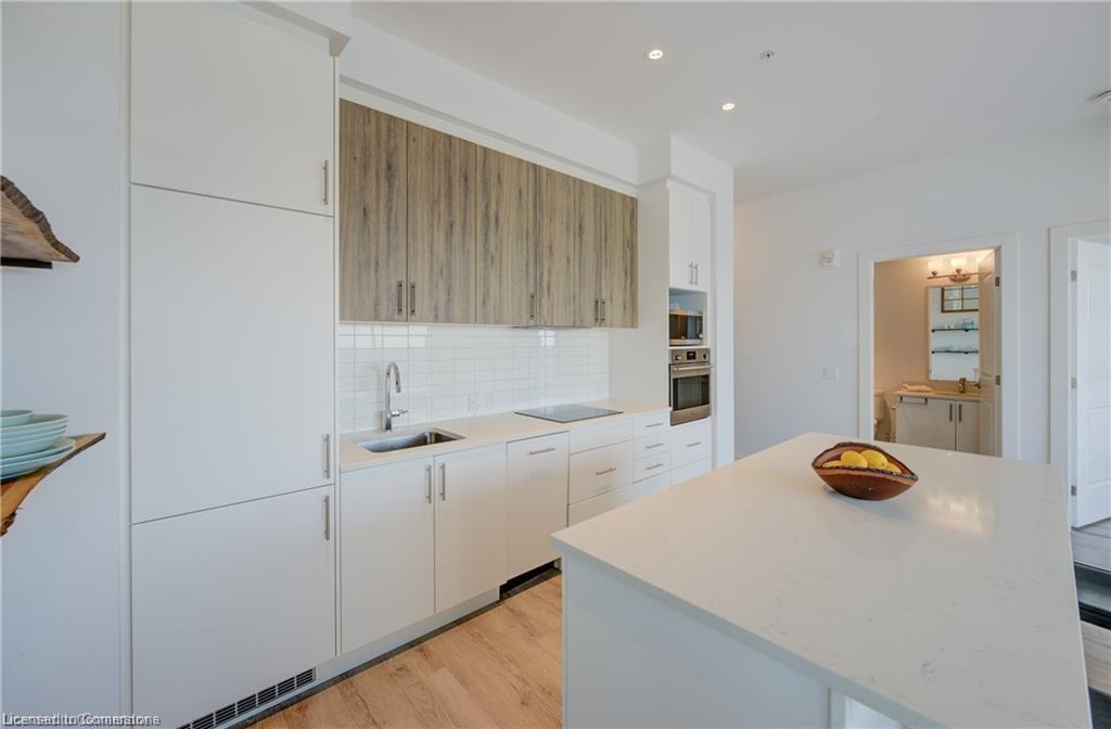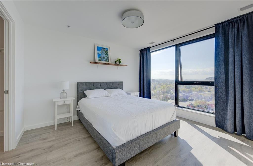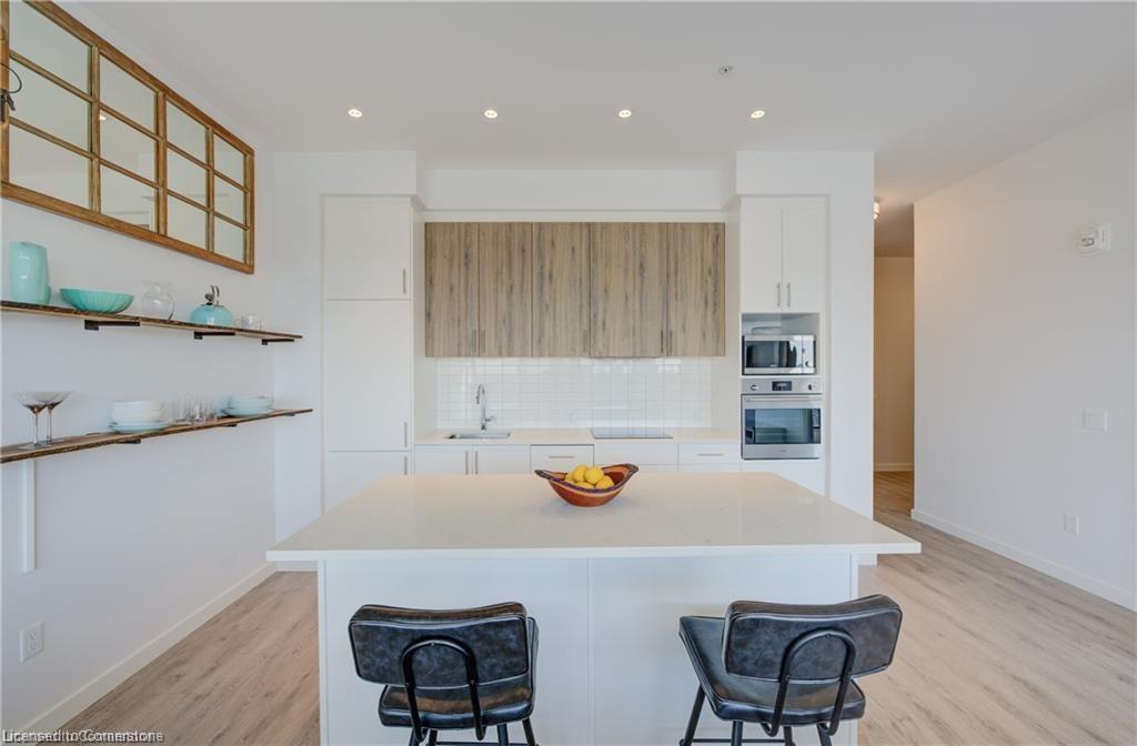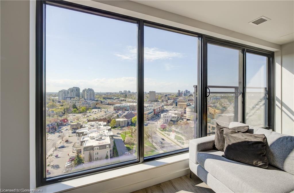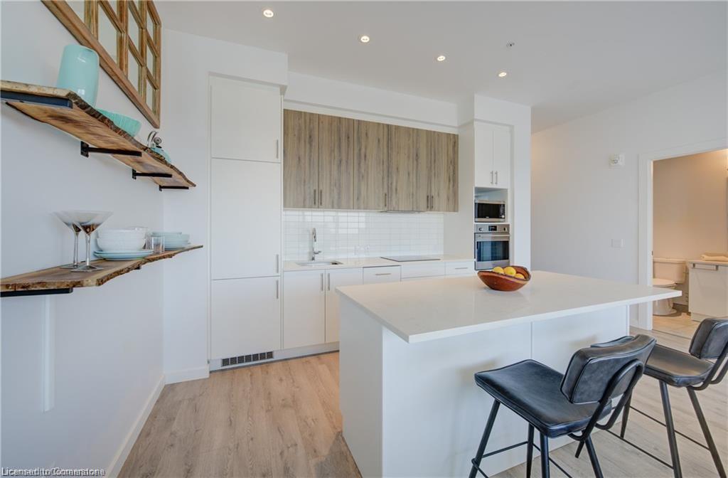 Investors, Parents of University Kids, Recently Separated/Divorced, as well as New Canadians, Company Employees or Executives will love this FULLY FURNISHED 836 Square Foot Suite at CIRCA 1877. Yes, the right offer gets you most furniture, dishes, cookware, housewares…just move in! Suite can be purchased unfurnished, too! Expect to be impressed by the high ceilings, upscale finishes, amenities and details in this tastefully appointed 1 bath, 1 bedroom + den suite. Luxury vinyl plank throughout. Open concept kitchen features elegant dual-tone cabinetry, subway tile backsplash, panel fridge-freezer, wall oven, cooktop set in quartz counters, plus matching island top with eat-at breakfast bar. One-foot+ (16 inch) taller ceiling height in the kitchen and den areas adds to the bright, airy feeling. Oversized floor-to-ceiling windows and Juliette balcony afford amazing views of the skyline, treetops, and Uptown Waterloo—sunsets included. Custom built-in cabinetry and desktop in den area create an ideal work-from-home space. Walk-in closet serves the bedroom. Luxurious 3-piece bath with tasteful tile and glass shower. Just off the hallway are stacked laundry units. Owned garage parking space, plus owned storage locker. Short walk to boutique shops, vibrant restaurants, Vincenzo’s, and ION LRT stops. Iron Horse Trail nearby for biking. Unrivaled amenities include: rooftop Terrace; sky view Pool; outdoor BBQ area and Fire Tables; Co-Working Space; Indoor Entertainment Lounge with reading area, bar, seating of all types; Practitioner’s Room; Fitness Studio; Indoor/Outdoor Yoga Studio; WiFi building-wide; Bike Room. The hospital is nearby. Short term rentals like Airbnb are permitted at this unit as per condo declaration, and building does not require city rental license! Suite 1505 at 181 King South truly promotes a lifestyle or investor profile without compromise! Why not purchase with a friend or parent with adult child to share the cost and the value? Photos from May 2024.