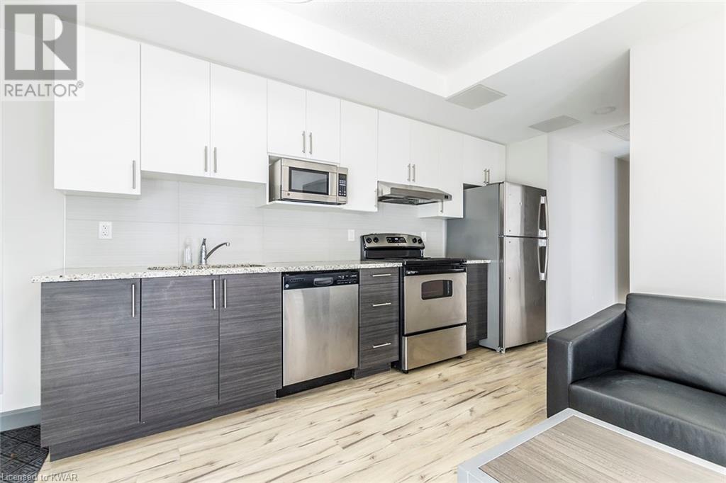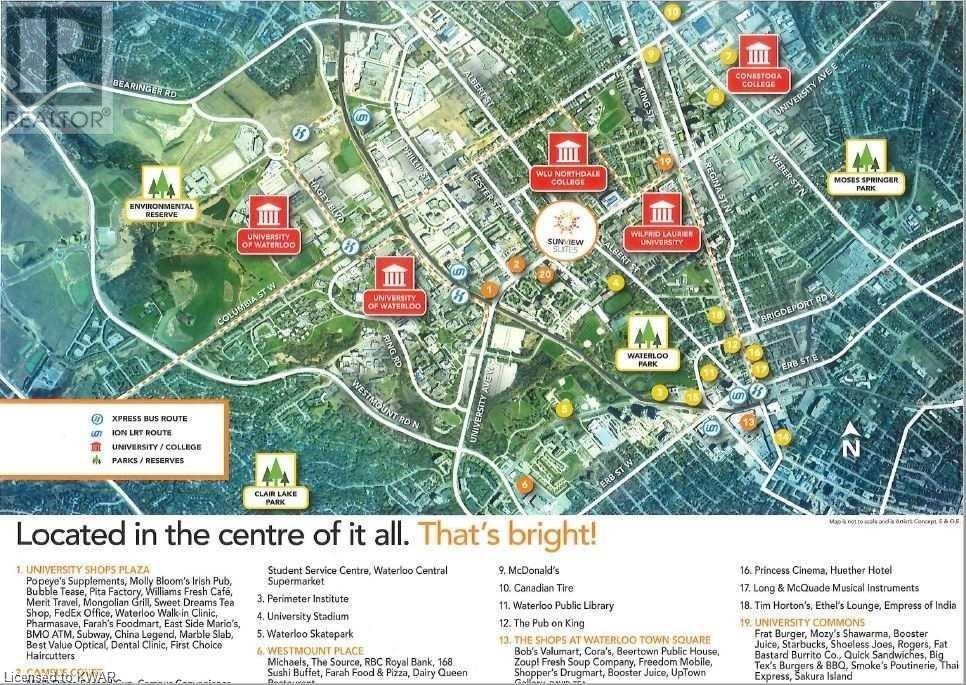 Location! Location! Location! Amazing investment opportunity, Sunview suites in the heart of Waterloo. This 1057 sqft modern luxury condo is 3 bedroom (Den is converted to third bed) with 2 full baths. Open concept unit with stainless steel appliances, modern kitchen cabinets, laminate floors throughout and large windows letting in a ton of natural light. Access to outside by patio door. Just minutes from both Waterloo and Wilfred Laurier universities. Steps to ION LRT station. Easy to rent to students and employees from both universities. Close to all amenities and less than a 10 minute drive to Conestoga Mall. Building features include study spaces, rooftop terrace, indoor lounge/dining area, bike storage and visitor parking. (id:22211)