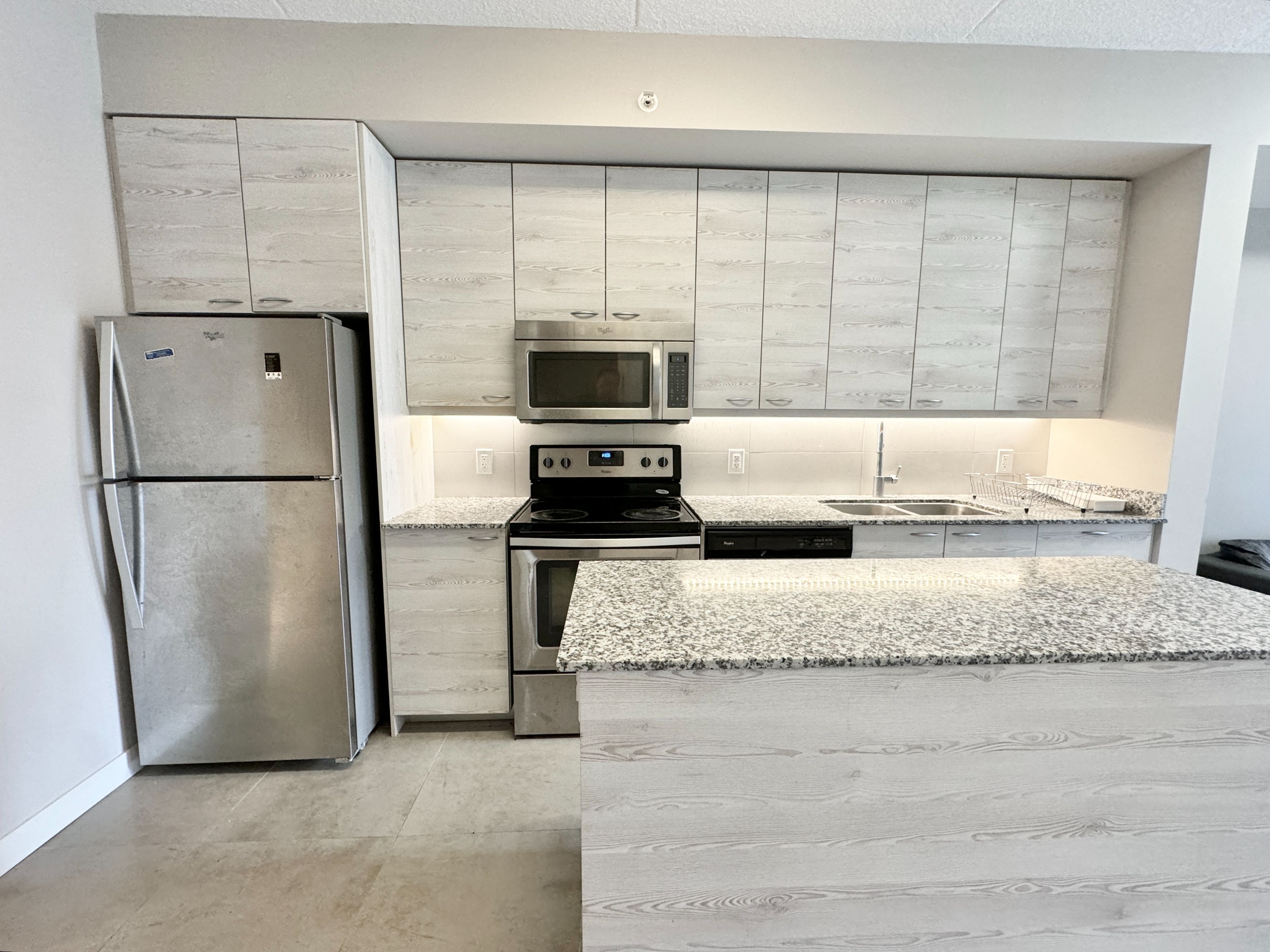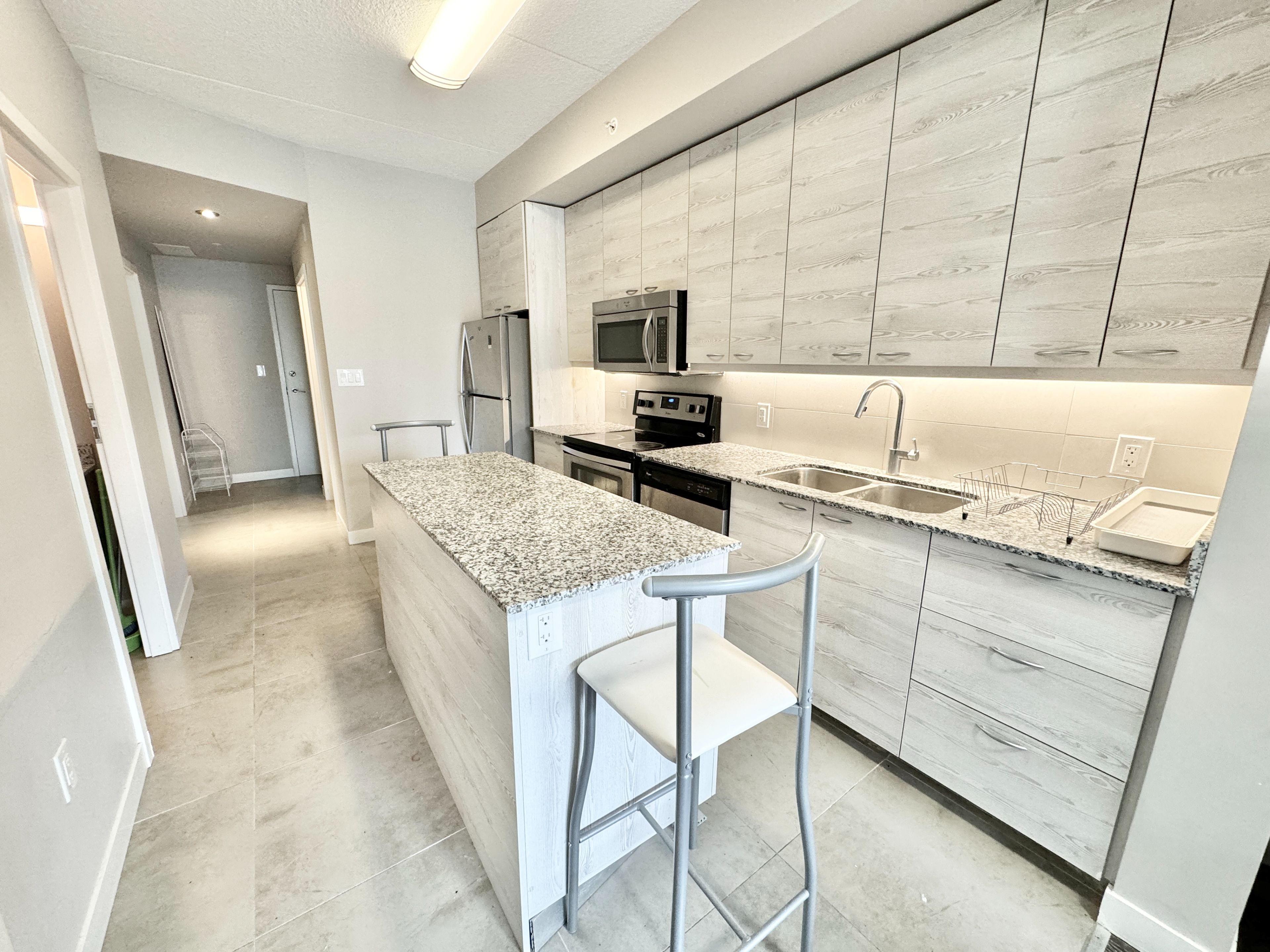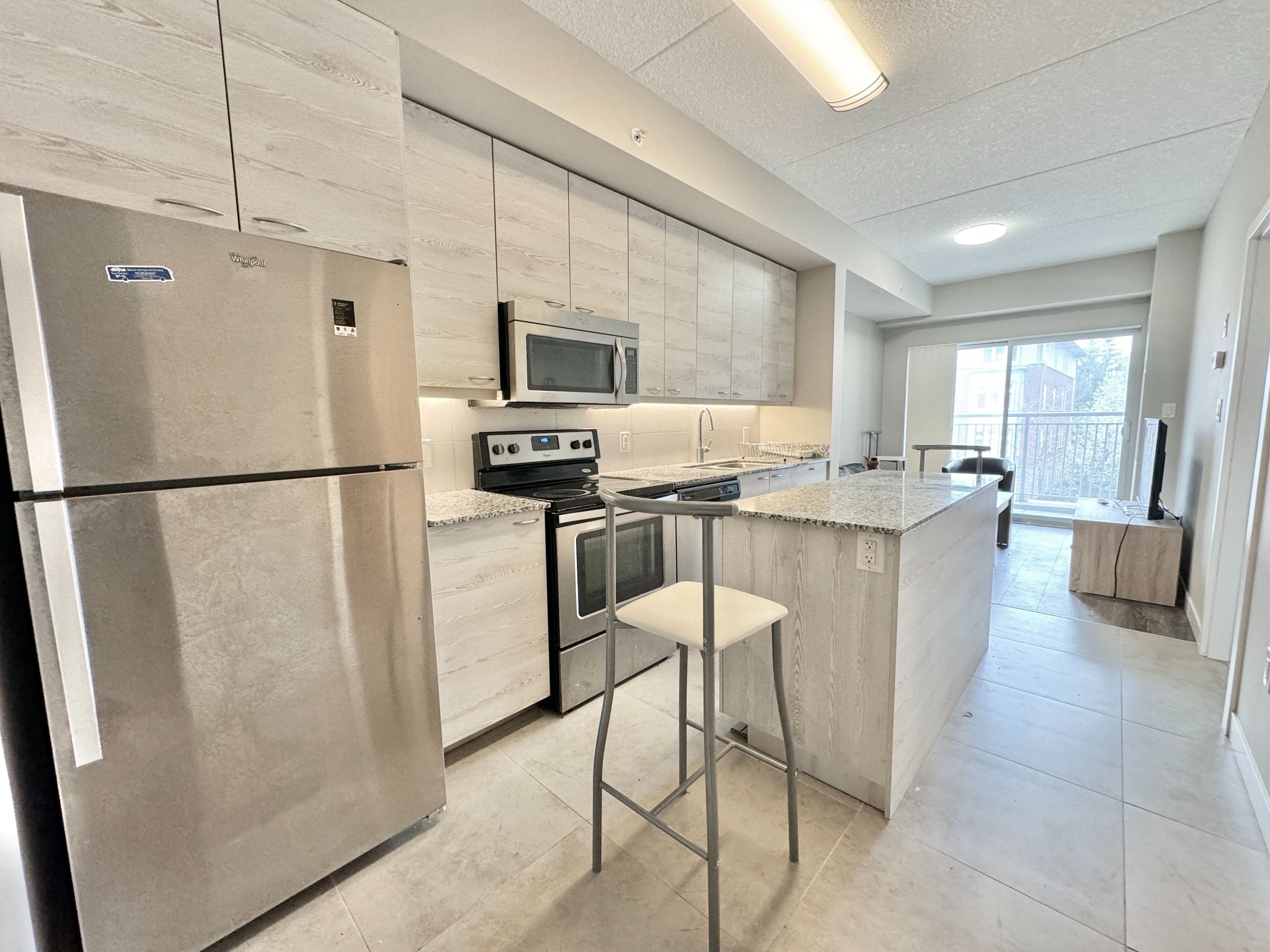 **ALL FURNITURE INCLUDED (EXCLUDING SOFA)**Ideal Student living Steps from Waterloo @ Sage condos! Bright and Spacious 1 + den w/door can be used as second bedroom. High 9' Ceilings. Tile & Laminate flooring throughout. Open concept kitchen w/quartz countertop, backsplash, stainless steel appliances & center island. Large sized bedrooms combined w/office. Large w/o Terrace w/South west exposure. onsite fitness facility & social lounge with smart TV + couches + meeting tables. Steps to Waterloo, public transit, parks, restaurants, supermarket. Close to hwys.