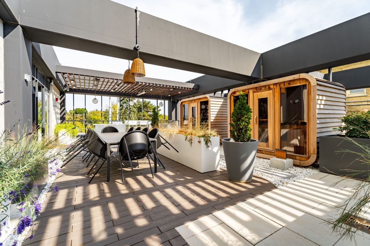 ***额外配套***充足访客停车位、自行车存放处及带双桑拿房的户外露台,配备大型公共餐桌、休闲区与户外厨房/酒吧。"Hygge"风格休闲厅包含图书馆、咖啡区及带舒适休息座的壁炉区。
