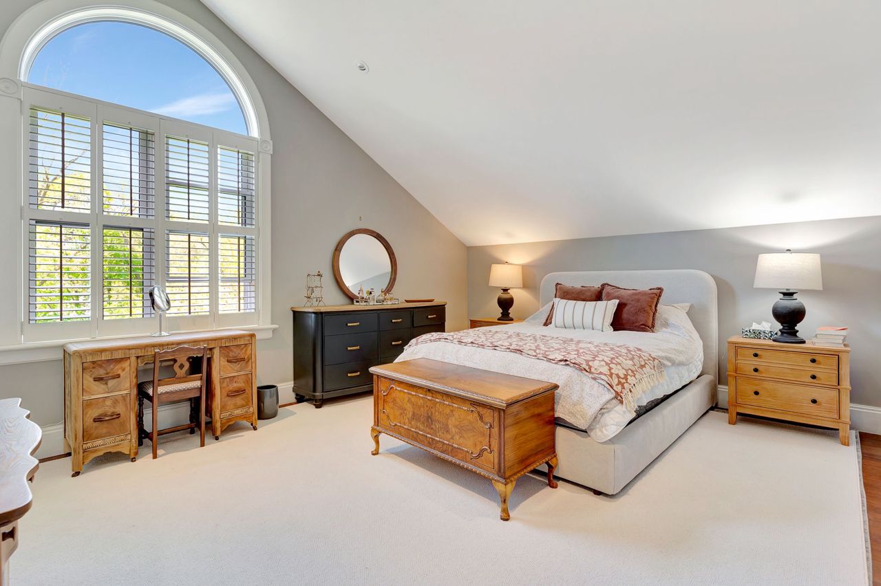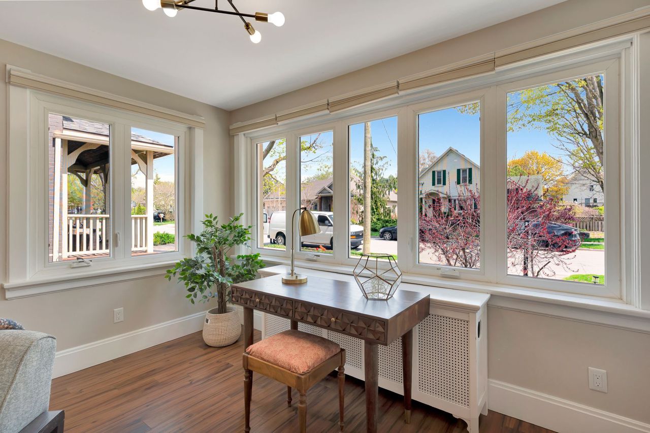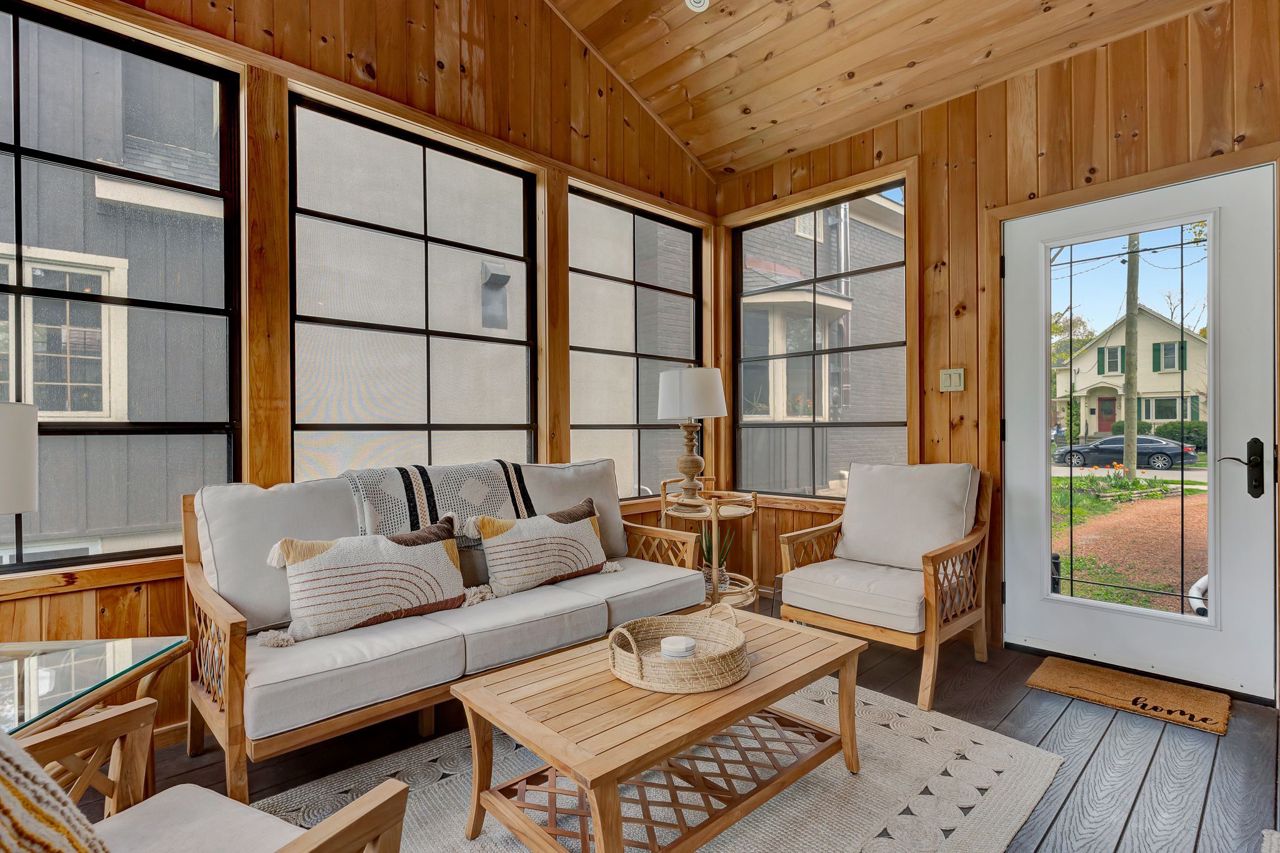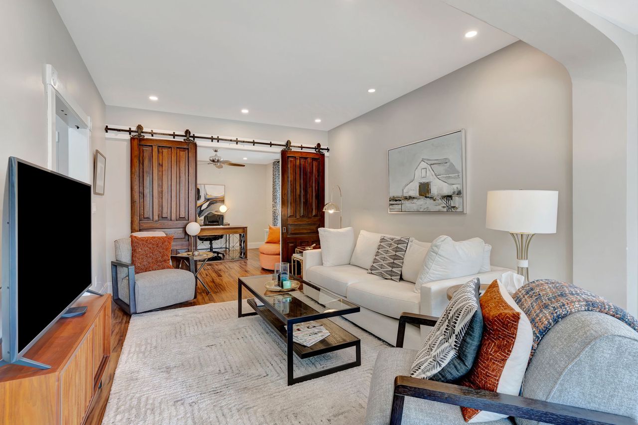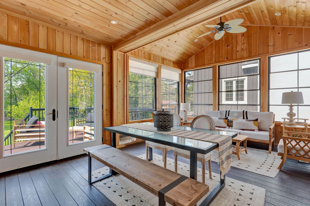 主层采用明亮通透的布局,设有温馨的前厅书房和洒满阳光的宽敞客厅。典雅的实木双扇滑门通向独立书房,与餐厅和厨房相连,在开放性与私密性间取得完美平衡。厨房堪称亮点,花岗岩台面、不锈钢电器与时髦的定制橱柜,让烹饪与待客都成为一种享受。紧邻厨房的阳光房更是一处惊艳空间,木质拱顶天花板与醒目的黑框观景窗将户外景致引入室内。玻璃双开门通向复合材质露台和开阔的后院,在这片城区实属难得的休闲娱乐胜地。