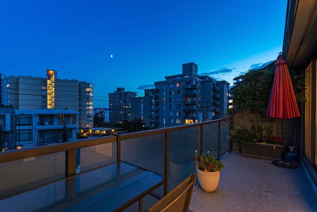 Beautiful top floor south facing 1 bedroom at Bellevue Gardens. Terrific open layout with a spacious balcony connecting the ideal floor plan with 2 big sliding glass doors. Plenty of room for a home office or house sized furniture. Location, location, location! Steps from the iconic West Van Sea wall, Rec Center, Library, and Dundarave Village. Excellent condition with complete privacy and ocean views! Rentals permitted. Lovely boutique building with elevator, inviting lobby, and well maintained gardens. Superb value for a penthouse on one of West Van's most prestigious streets and an ultra convenient, walkable location. Includes a storage locker and underground parking stall. A pleasure to show!
